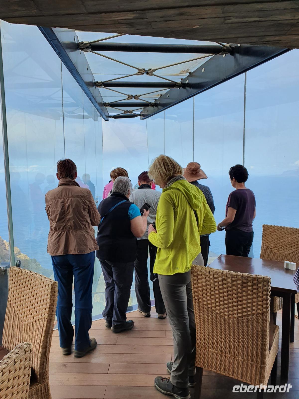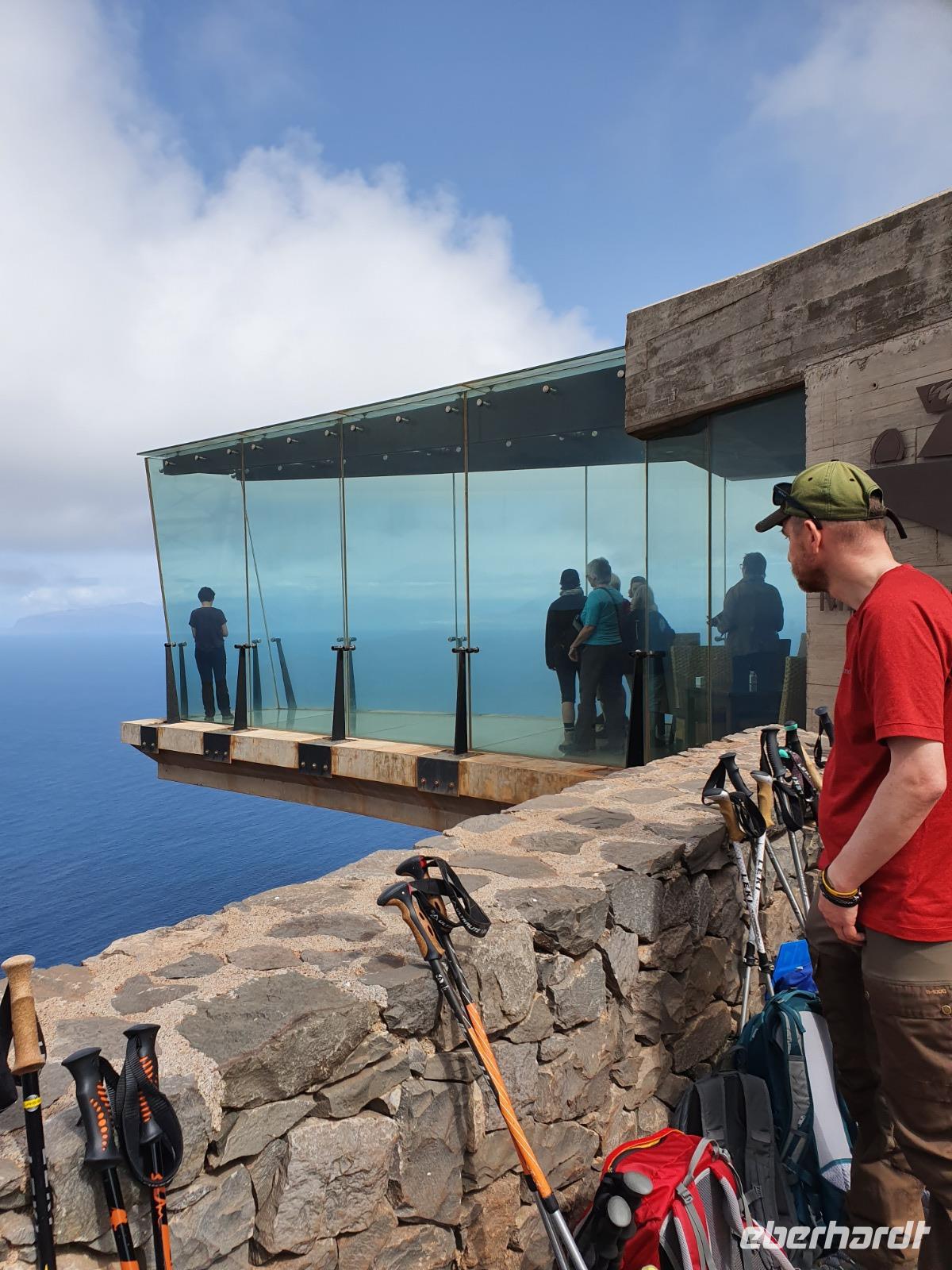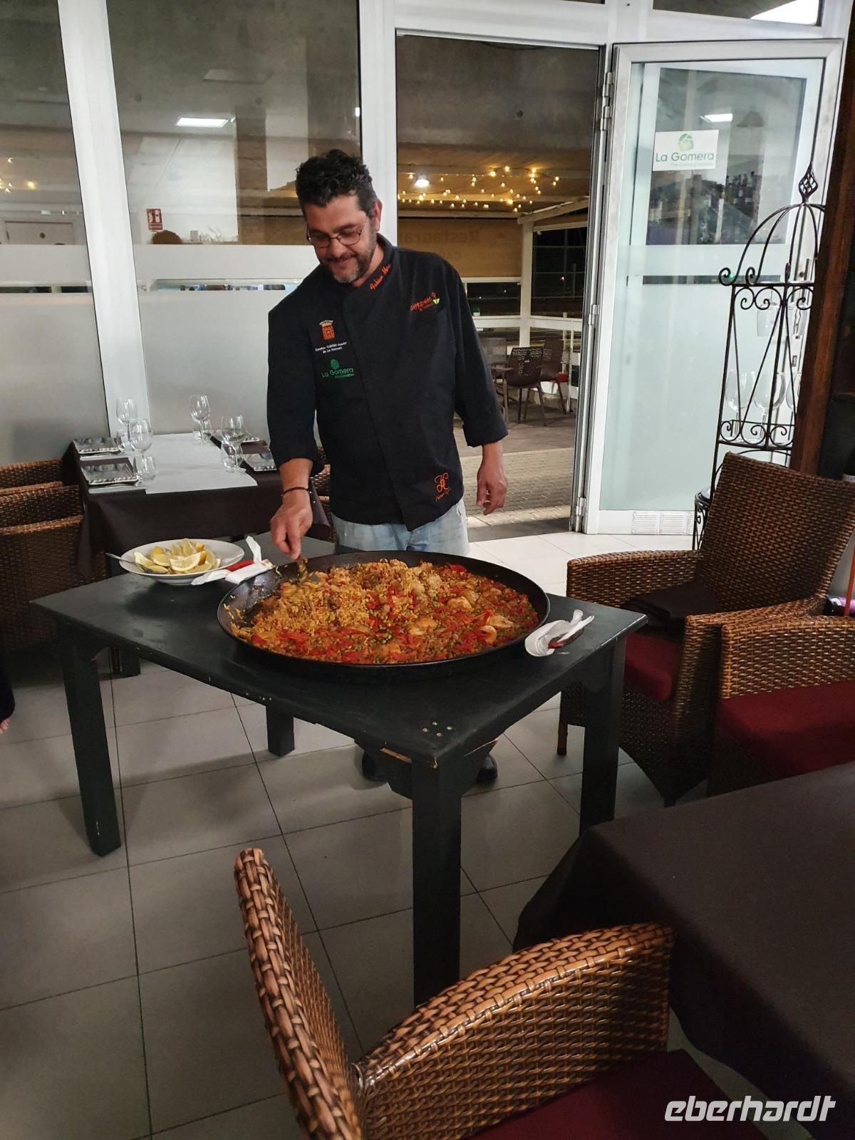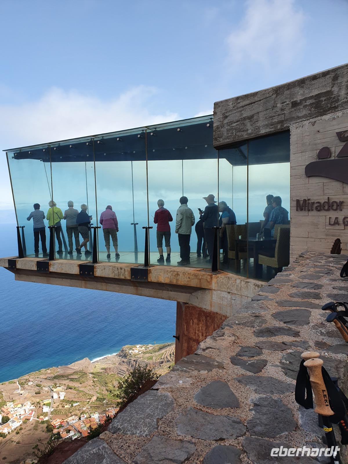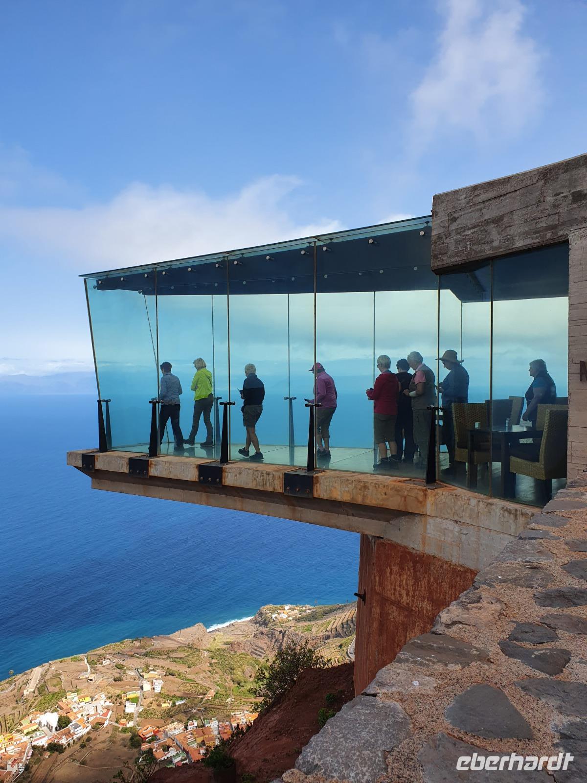 Für heute hat Ulrike wieder eine ganz tolle Wanderung geplant. In der üppig bewachsenen Schlucht von Hermigua geht es zunächst auf einem breiten Höhenweg mit malerischen Ausblicken bis hinunter zu einem kleinen Stausee, der vom längsten Wasserfall der Insel - El Cedro - gespeist wird. Der Wasserfall erinnert zwar eher an ein Rinnsal, doch die Vegetation im Tal ist üppig und Bananenplanta-gen, Papaya- und Mispelbäume sind überall zu sehen. Wir dürfen zum ersten Mal einen kleinen Bachlauf überqueren (!) und fahren kurze Zeit später weiter Richtung Norden nach Agulo. Das kleine Dorf mit hübschen weißen Häusern und kleinen Gärten wirkt wie verlassen - wir sind die einzigen Touristen und lassen uns Tapas und Getränke auf einer sonnigen Terrasse der Bar Alameda schmecken. An-schließend fährt uns Ernesto zum Mirador de Abrante. Etwa 600m über dem Meeresspiegel ragt eine sieben Meter lange Glasplattform über die rote Steilwand hinaus und bietet ein atemberaubendes Gefühl, als würde man frei schweben. Nach unzähligen Fotos erfreuen uns zwei Gomeros noch mit einer Kostprobe der kanarischen Pfeifsprache „El Silbo", die tatsächlich den Kindern im Unterricht beige-bracht wird. Noch eine kurze Wanderung durch die „rote Wüste" - und ein Einkaufsstopp in einer Bäckerei-Konditorei - wir verabschieden uns von La Gomera denn Ernesto lässt bereits durchblicken, dass eine strikte Ausgangssperre zu erwarten sei. Im Caprichos gibt es heute eine riesige und sehr leckere Paella mit Hühnchen und Kaninchen - nun ja, und viel Suppe natürlich.