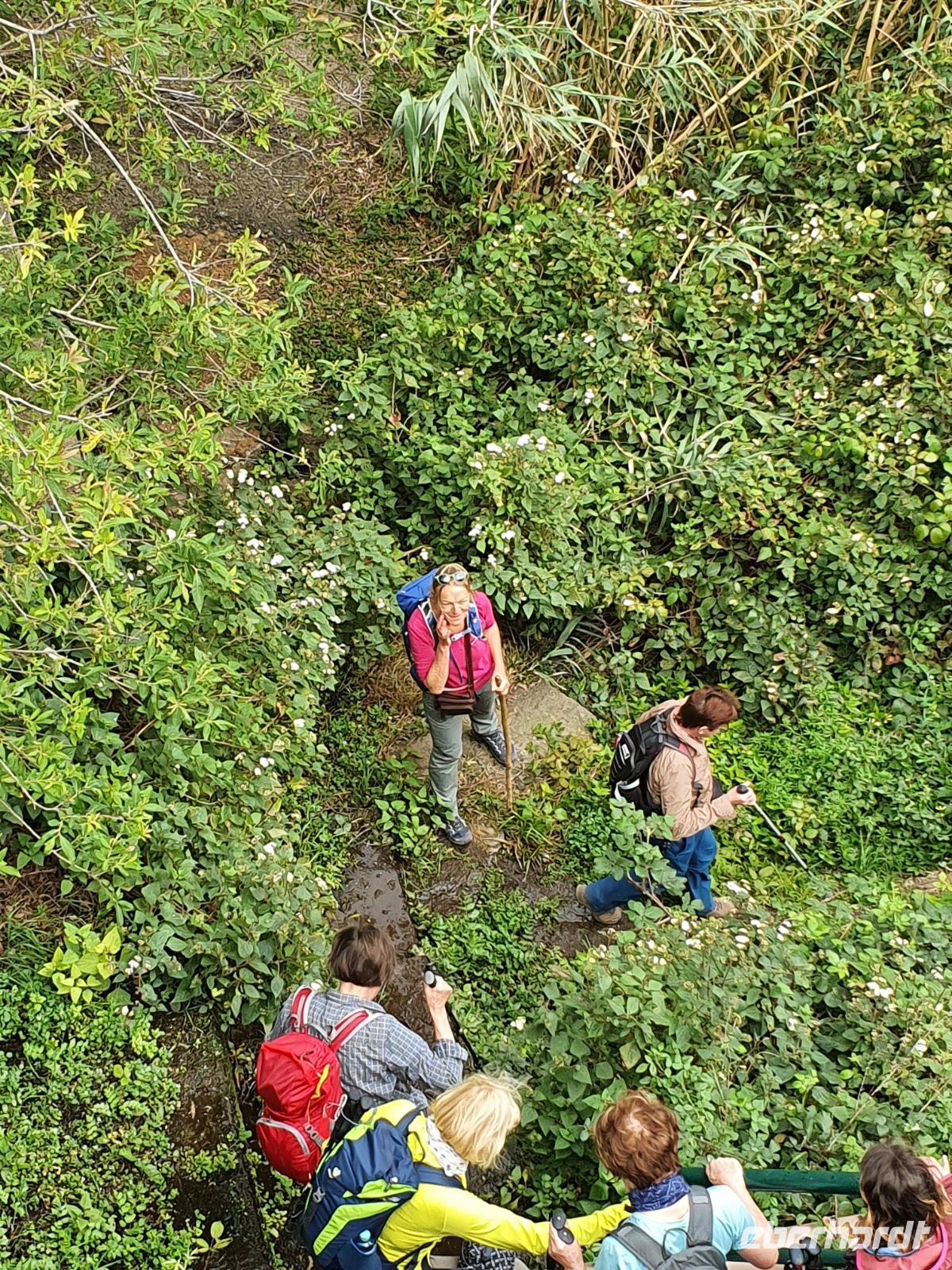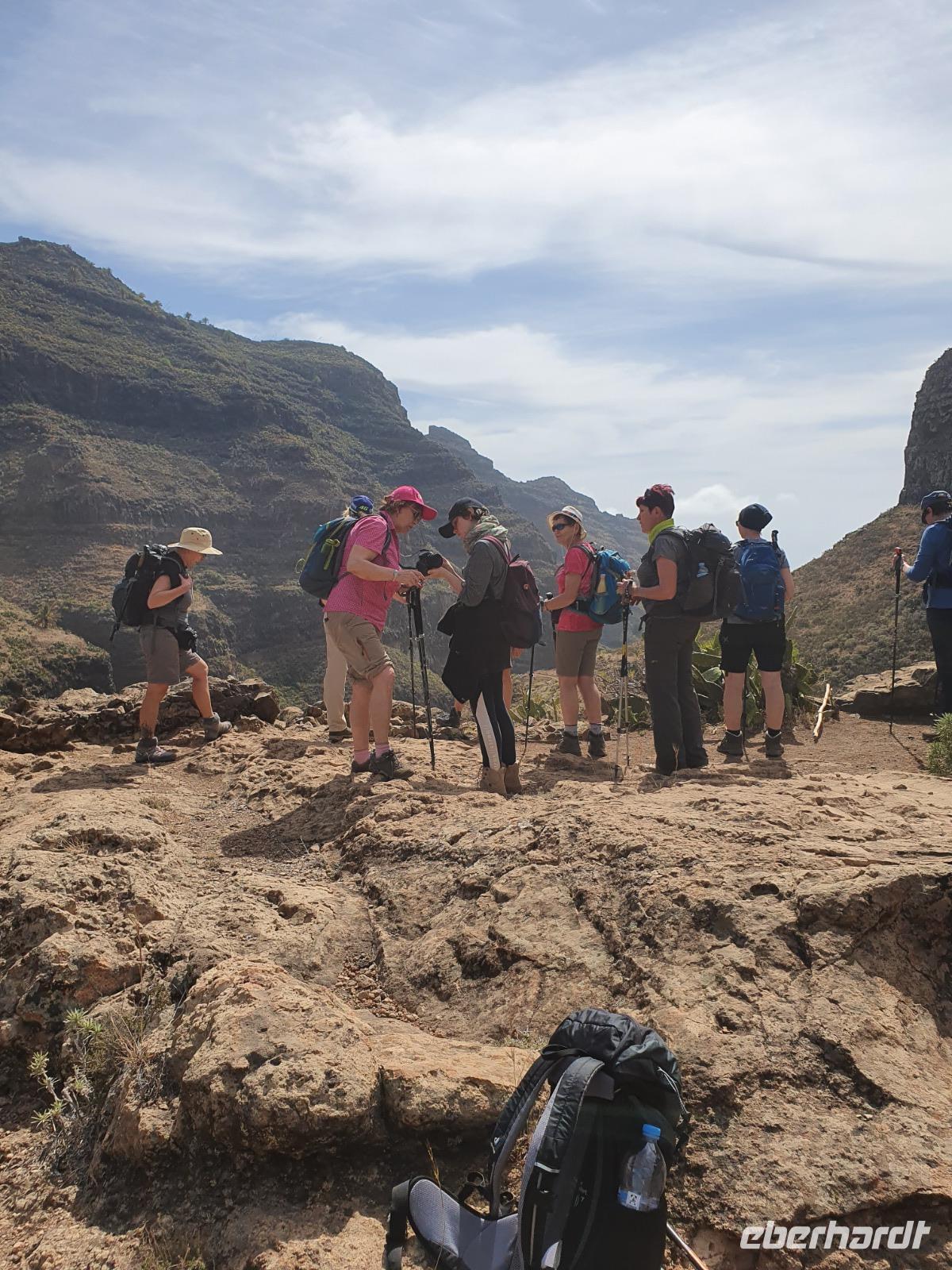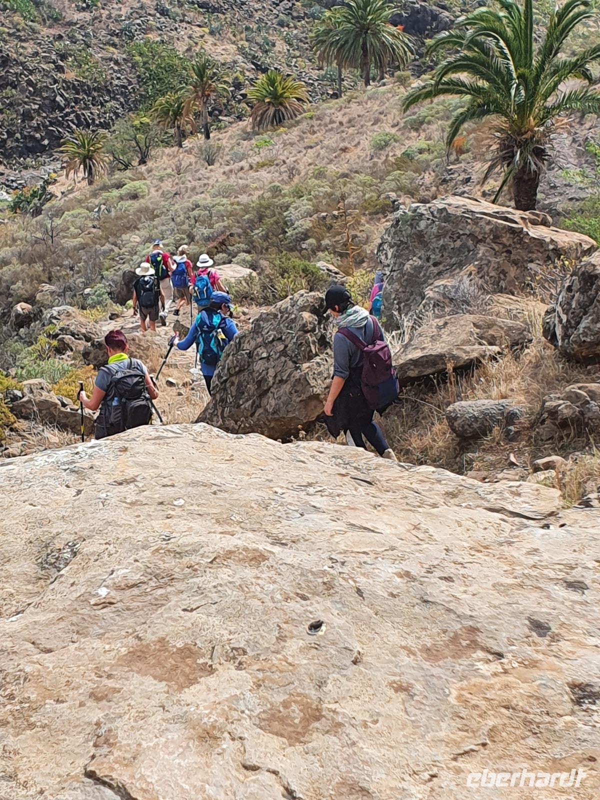 Die heutige Wanderung wurde von Ulrike (zu Recht) als etwas anspruchsvollere Tour angekündigt - steile Ab- und Aufstiege auf gerölligem Untergrund seien zu meistern, Tritt- und Schwindelfreiheit wären gute Voraussetzungen dafür. Ein Teil der Gruppe entschließt sich, den heutigen Tag in Eigenregie zu verbringen, mit Mietwagen und zu Fuß wird die Insel erobert und man hatte jede Menge Spaß da-bei. Die Wanderer steigen bei kurz hinter Imada in ihr Abenteuer ein - die gewaltige Felsenschlucht lässt einen Blick in die Erdgeschichte zu - die gesamte Insel ist ja vulkanischen Ursprungs. Von Erosion geprägte Felsformationen, bizarre Höhlen und satt-grüne Felswände prägen die Schlucht, der Wanderweg wird nach Anfangs steilem Abstieg dann komfortabel, gesichert mit Handlauf gegen ungewolltes Verlassen des Weges - es ist so beeindruckend, dass wir Mühe haben, wegen andauernder Fotostopps unsere Etappe zu schaffen. Vor dem letzten Aufstieg nach Alajero teilt sich unsere Gruppe noch einmal - fünf Power-Wanderinnen folgen Ulrike, andere folgen mir noch für gute 1 ½ gemütliche Wanderstunden bis zu einem Parkplatz. Zum Abendessen - pünktlich um 18.52 Uhr - kehren wir heute im Restaurant Brenusca ein. Besitzer und Familie freuen sich schon auf unsere Gruppe und lassen sich auch bei der Arbeit in der Küche zusehen. Gewaltige Portionen Fisch und Fleisch nebst Beilagen stehen bald auf unserem Tisch, einfach lecker. Aus der eigenen Landwirtschaft stammt u.a. auch eines junges Zicklein, dass für uns und andere Gäste zubereitet wurde - wahrhaft ein Genuss.