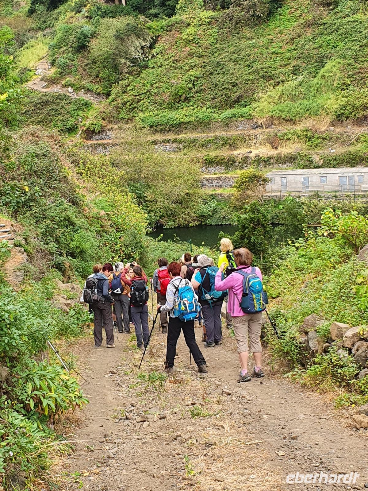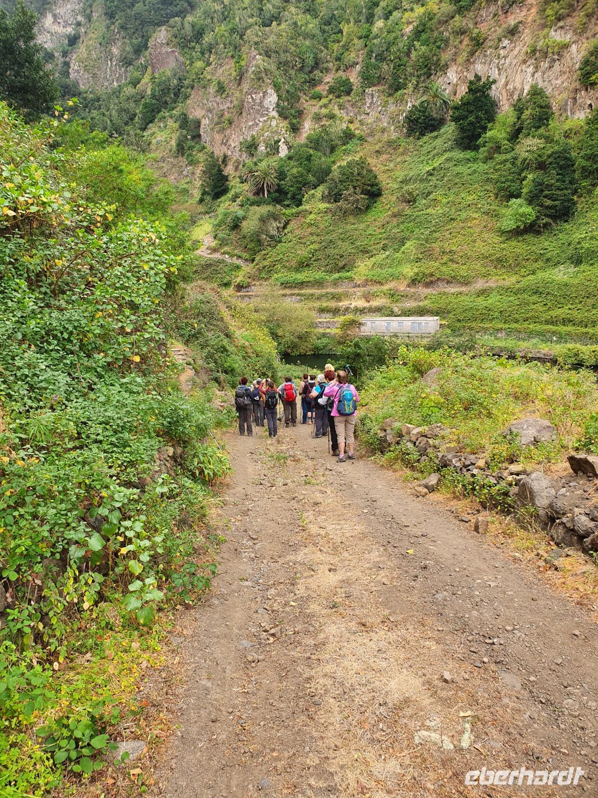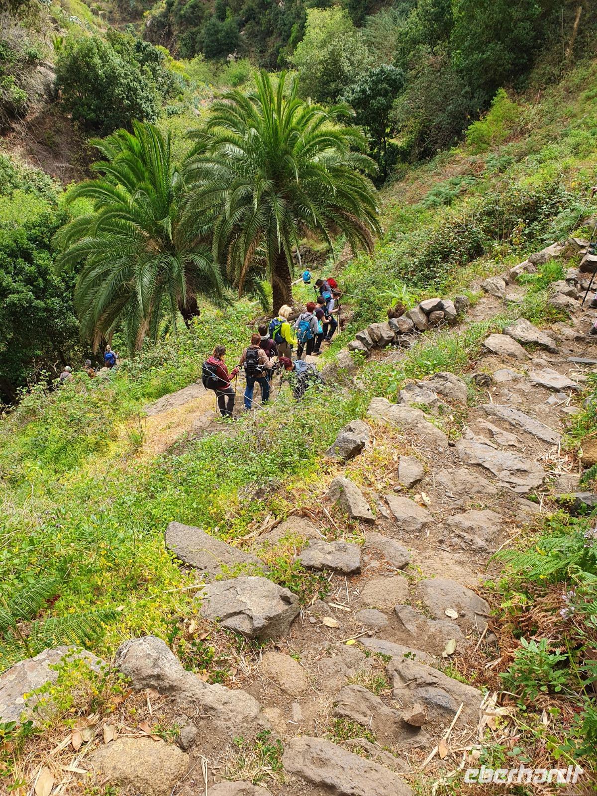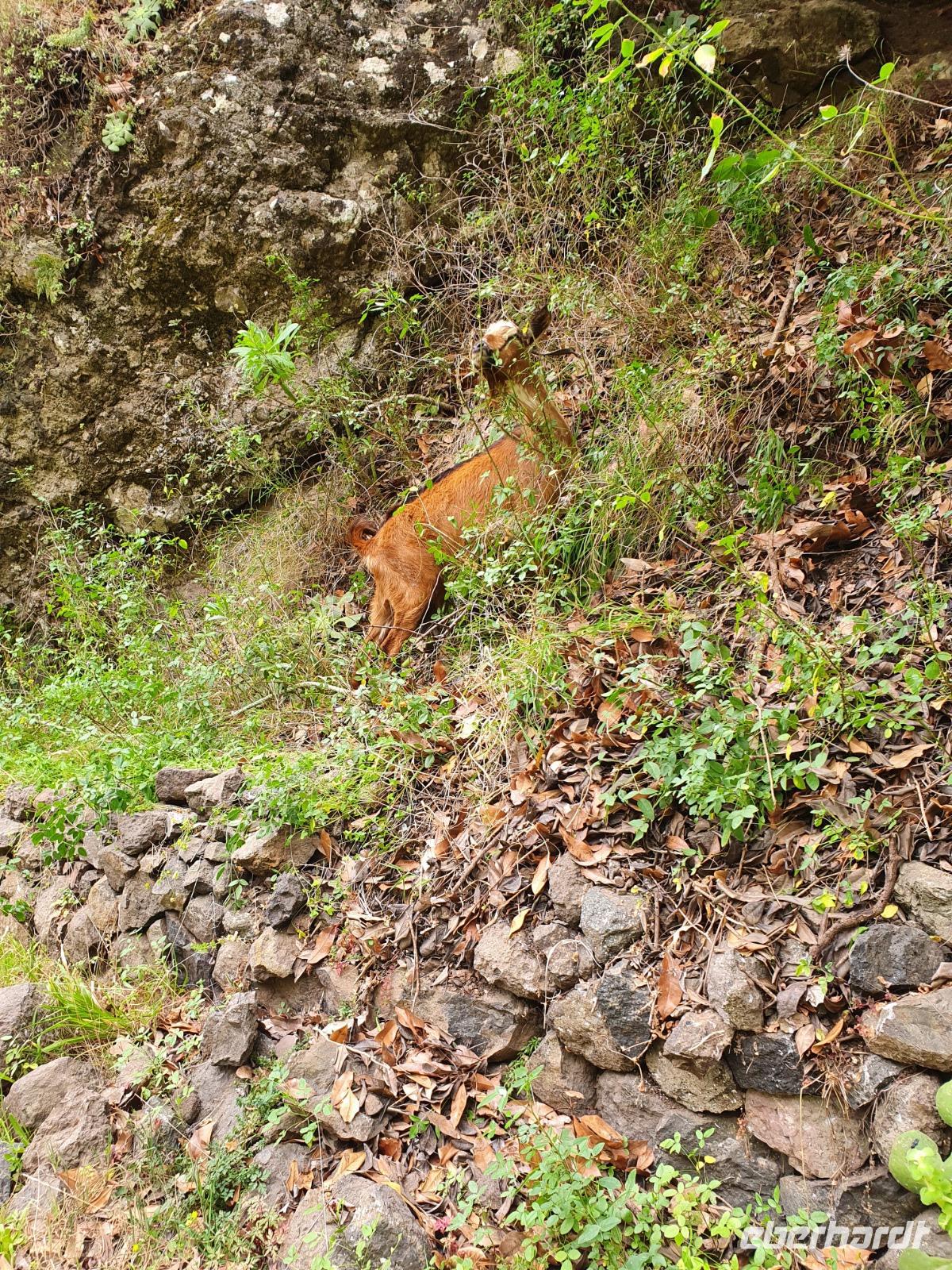 Die heutige Wanderung wurde von Ulrike (zu Recht) als etwas anspruchsvollere Tour angekündigt - steile Ab- und Aufstiege auf gerölligem Untergrund seien zu meistern, Tritt- und Schwindelfreiheit wären gute Voraussetzungen dafür. Ein Teil der Gruppe entschließt sich, den heutigen Tag in Eigenregie zu verbringen, mit Mietwagen und zu Fuß wird die Insel erobert und man hatte jede Menge Spaß da-bei. Die Wanderer steigen bei kurz hinter Imada in ihr Abenteuer ein - die gewaltige Felsenschlucht lässt einen Blick in die Erdgeschichte zu - die gesamte Insel ist ja vulkanischen Ursprungs. Von Erosion geprägte Felsformationen, bizarre Höhlen und satt-grüne Felswände prägen die Schlucht, der Wanderweg wird nach Anfangs steilem Abstieg dann komfortabel, gesichert mit Handlauf gegen ungewolltes Verlassen des Weges - es ist so beeindruckend, dass wir Mühe haben, wegen andauernder Fotostopps unsere Etappe zu schaffen. Vor dem letzten Aufstieg nach Alajero teilt sich unsere Gruppe noch einmal - fünf Power-Wanderinnen folgen Ulrike, andere folgen mir noch für gute 1 ½ gemütliche Wanderstunden bis zu einem Parkplatz. Zum Abendessen - pünktlich um 18.52 Uhr - kehren wir heute im Restaurant Brenusca ein. Besitzer und Familie freuen sich schon auf unsere Gruppe und lassen sich auch bei der Arbeit in der Küche zusehen. Gewaltige Portionen Fisch und Fleisch nebst Beilagen stehen bald auf unserem Tisch, einfach lecker. Aus der eigenen Landwirtschaft stammt u.a. auch eines junges Zicklein, dass für uns und andere Gäste zubereitet wurde - wahrhaft ein Genuss.