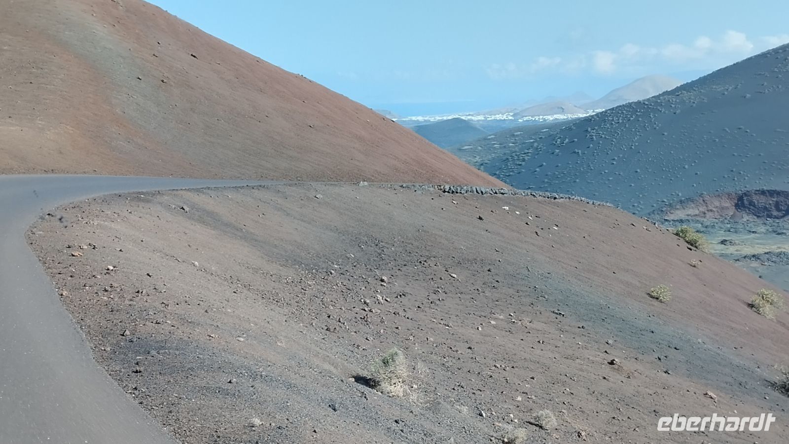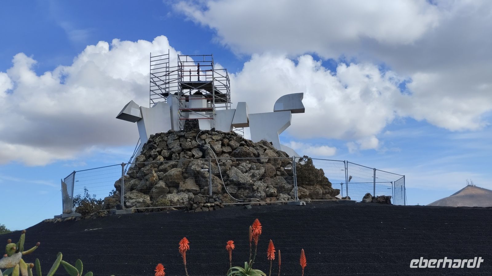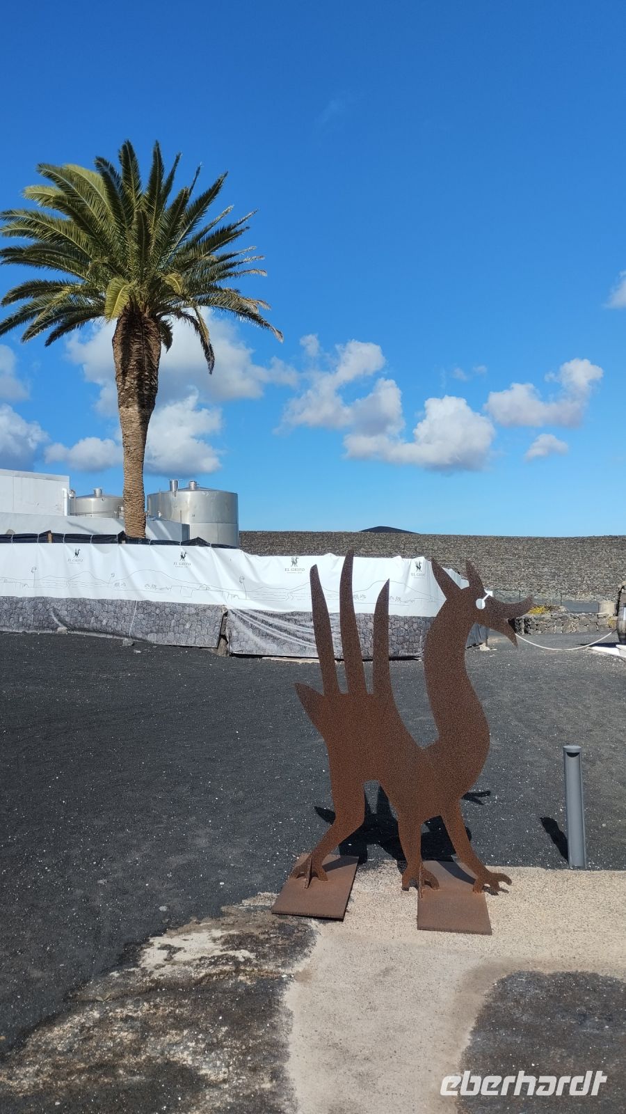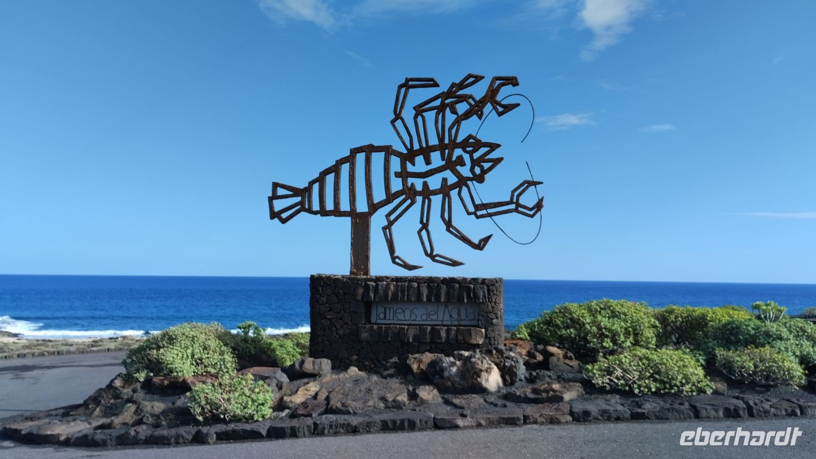 Danach fahren wir zum Nationalpark Timanfaya und stellen überraschend fest, dass es dort außergewöhnlich leer ist, wie sonst an keinen Tagen. Ein Teufelchen von Cesar Manrique markiert den Eingang.