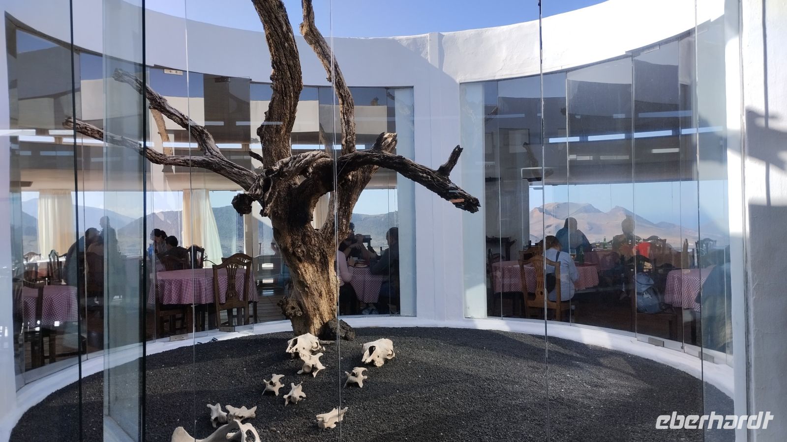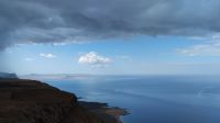 Als nächstes fahren wir zum Aussichtspunkt Miradoro del Rio, von wo man die Inseln La Graciosa, Montana Clara und Alegranza sehen kann. Schon auf dem Weg zum Aussichtspunkt fängt es an, stark zu regnen. Es wird kühl. Wir flüchten in das Innere des von Cesar Manrique gestalteten Baus mit abgerundeten weißen Wänden und genießen den schönen Blick bei einer Tasse Kaffee oder Tee.