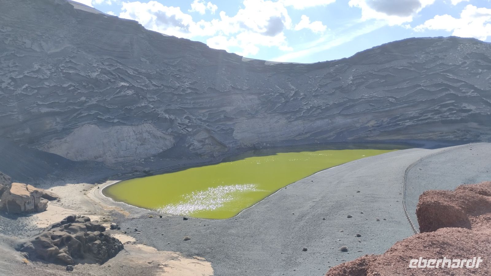 Doch zuerst fahren wir zu dem schönen Krater El Golfo, wo uns nach einem kurzen Spaziergang eine Überraschung in Form von einer grünen Lagune erwartet. Dabei handelt es sich um eines der einmaligen Naturphänomene auf Lanzarote. Die intensive grüne Farbe des Sees rührt von einer Algenart her. Die wunderschöne Sicht aufs Meer genießen wir natürlich auch.