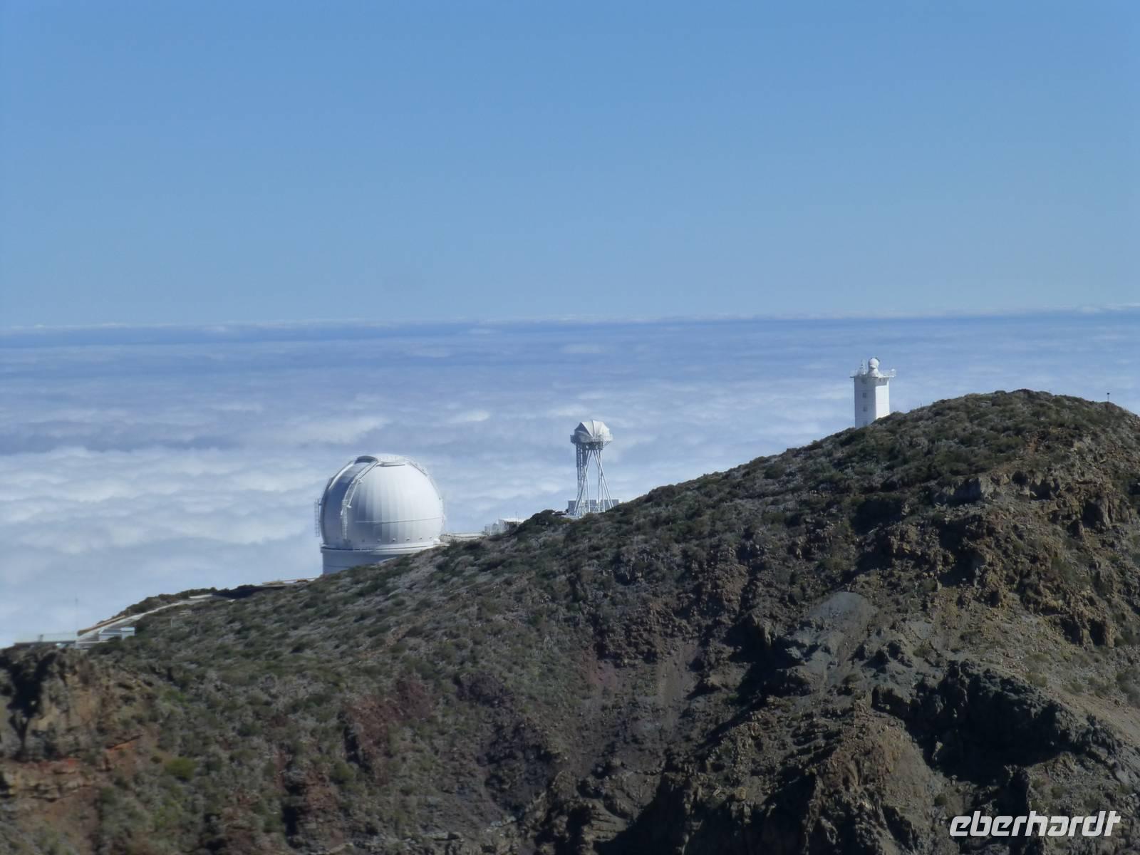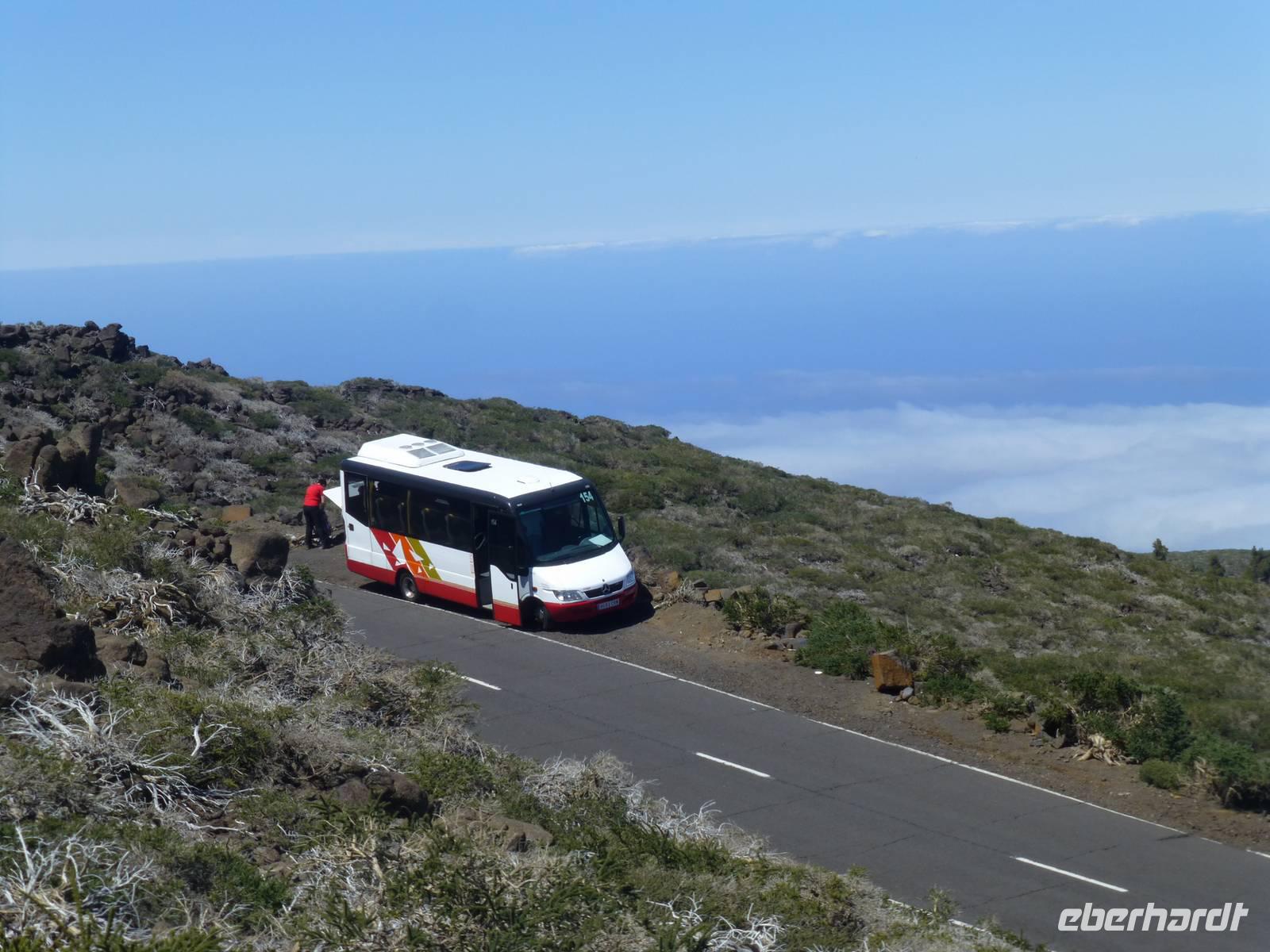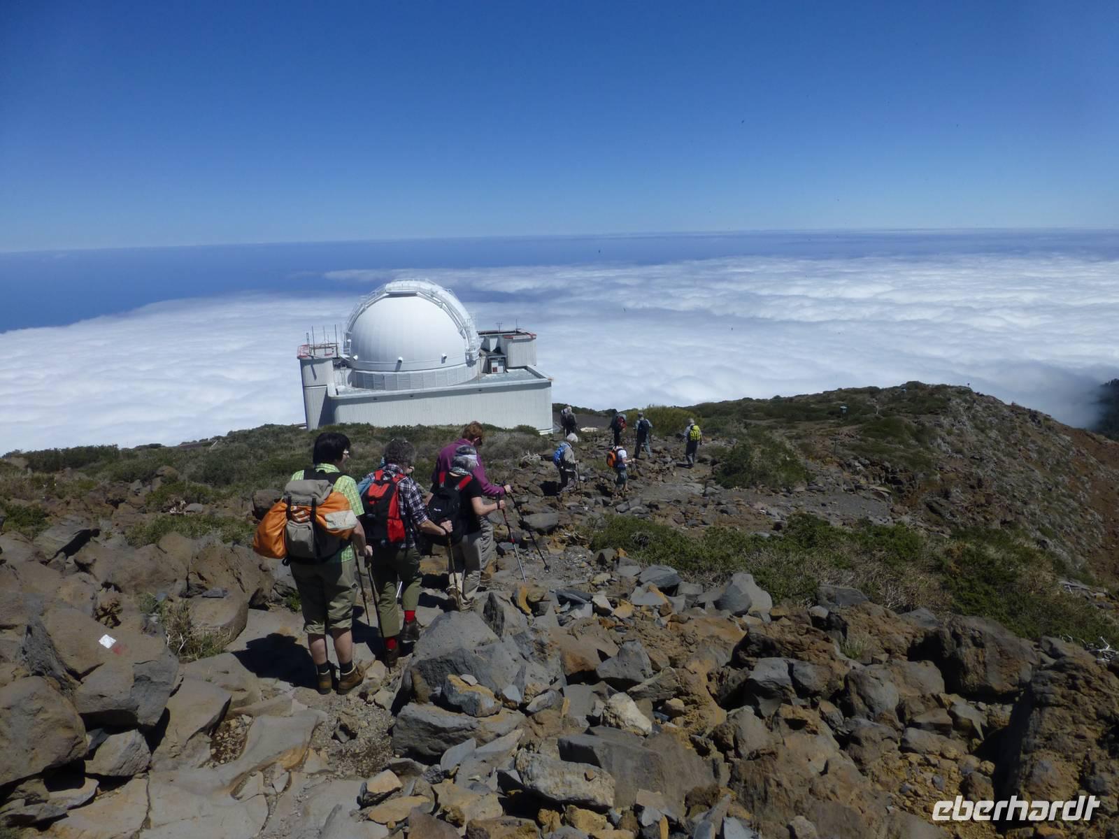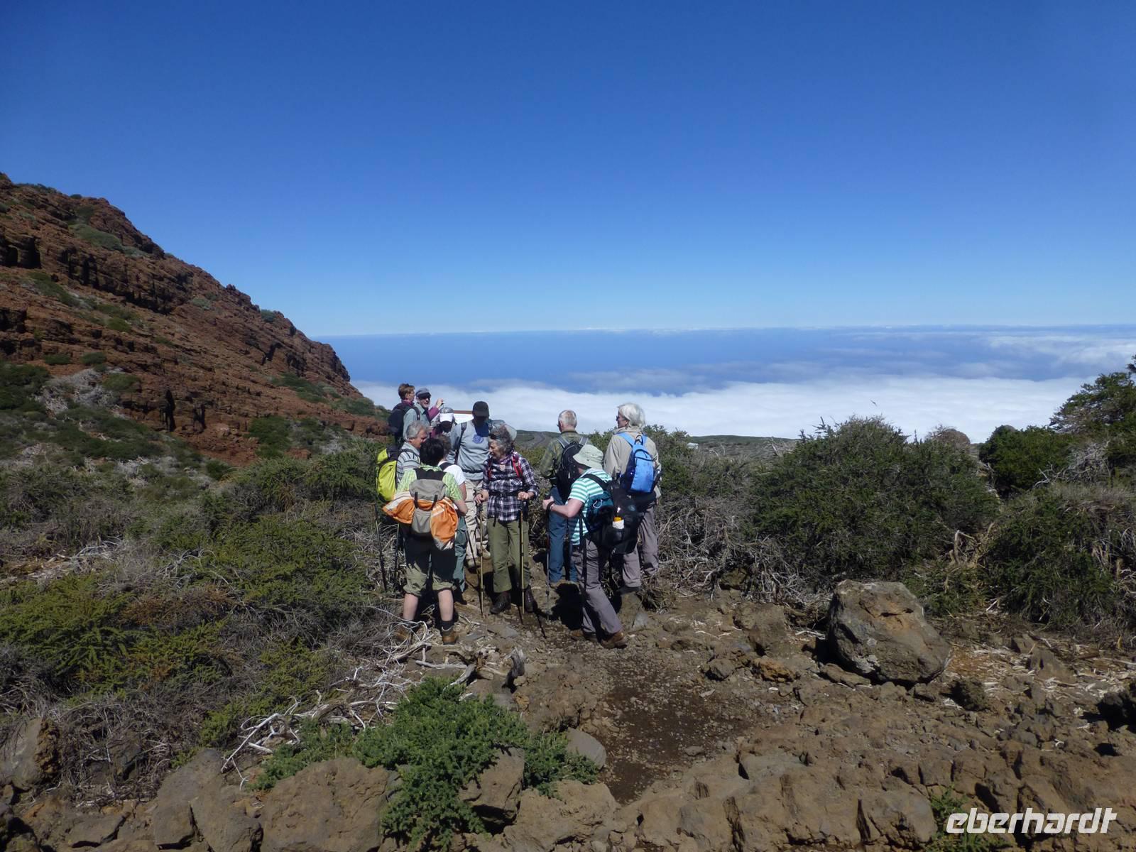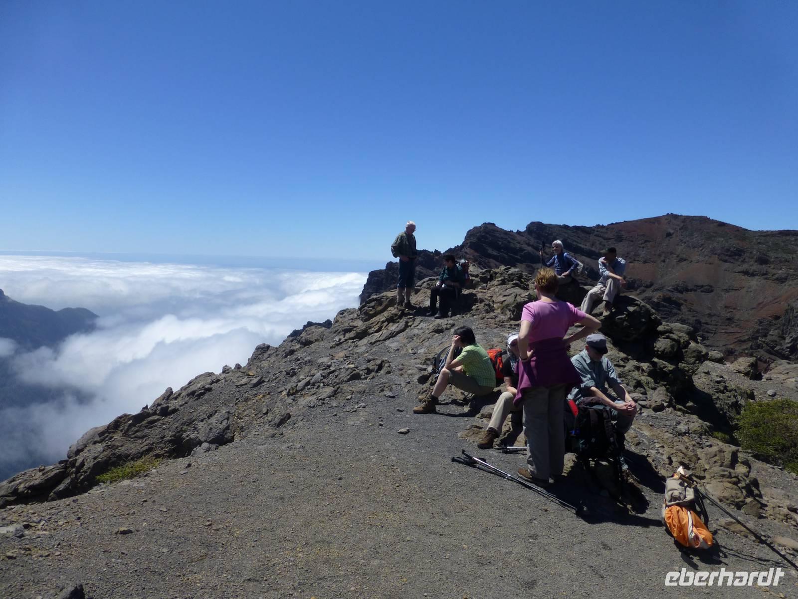 Endlich werden die Wanderschuhe geschnürt und wir starten gemeinsam mit unserem örtlichen Wanderführer Andreas zu unserem ersten Abenteuer. Mit dem Bus fahren wir die Serpentinenstraße hinauf zu den „Roque de Los Muchachos" auf eine Höhe von 2.426 Metern. Als wir zunächst durch die Wolkendecke fahren, ist kaum an eine gute Sicht zu denken. Doch plötzlich befinden wir uns über den Wolken bei strahlend blauem Himmel. Besser könnte es wohl kaum sein - die Aussicht ist einfach atemberaubend! Unsere Wanderung führt entlang des Kraterrandes, wobei wir hinab in tiefe Schluchten blicken. Nur wenige Pflanzen zieren die schroffe Landschaft aus rotbraunem Lava-Gestein - eine Ausnahme ist die blättchenreiche Drüsenfrucht (ach, wie lange haben wir das geübt ). Wegen der idealen Bedingungen befinden sich hier oben die wichtigsten Sternwarten Europas. Unser Ziel ist der „Pico de la Cruz" von wo wir noch einmal einen fantastischen Panoramablick auf den Einsturz- und Erosionskrater haben. Am späten Nachmittag kehren wir zum Hotel zurück. Vor dem Abendessen ist somit noch Zeit für ein erfrischendes Bad im Meerwasser-Pool.