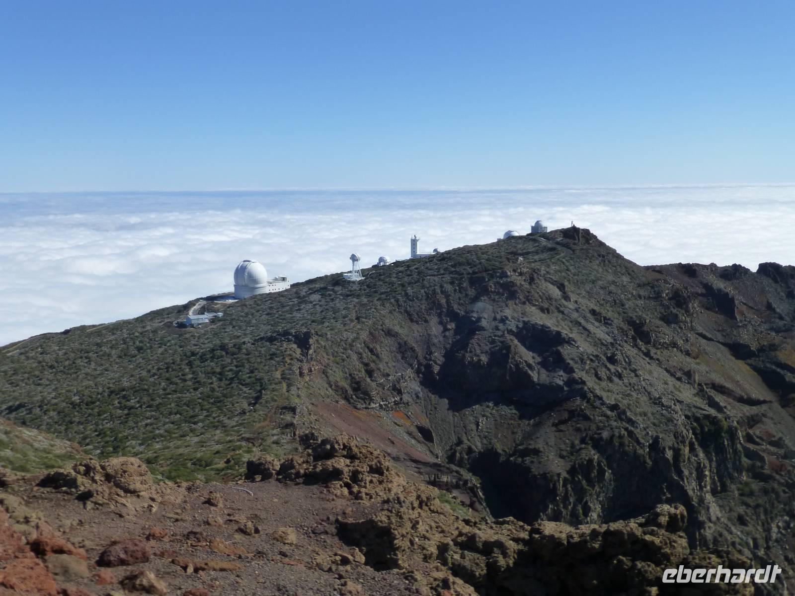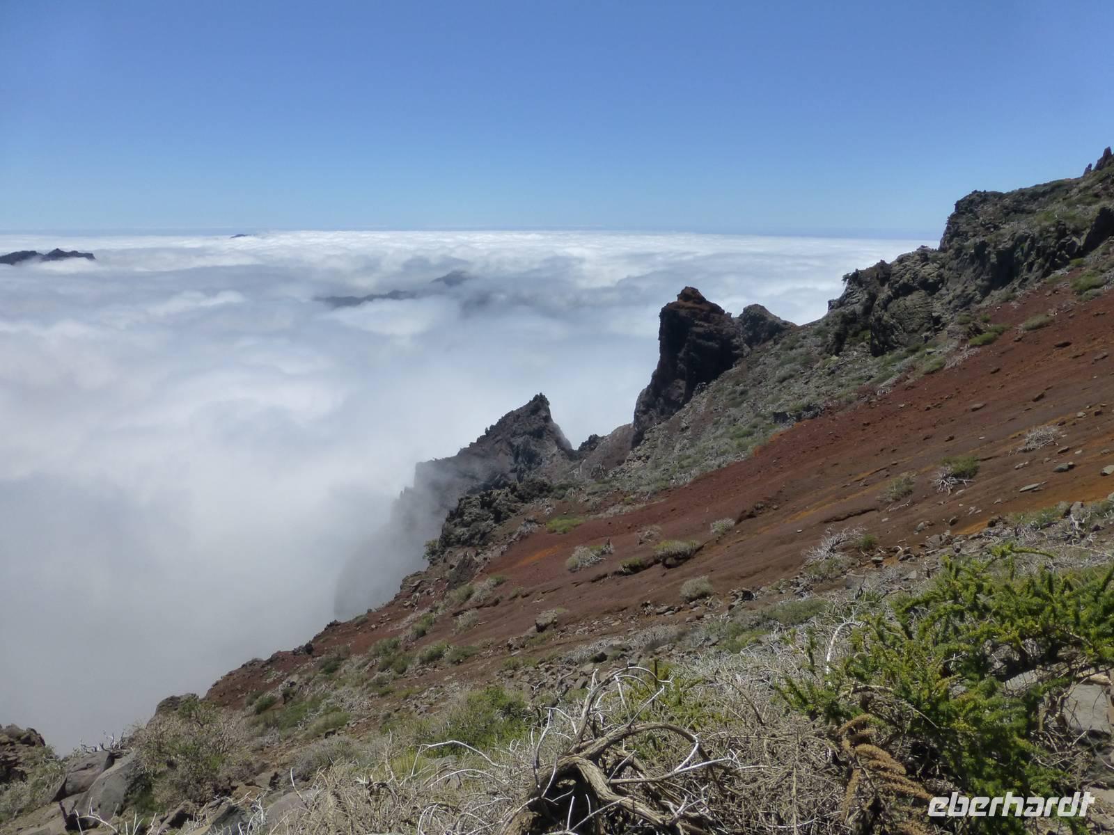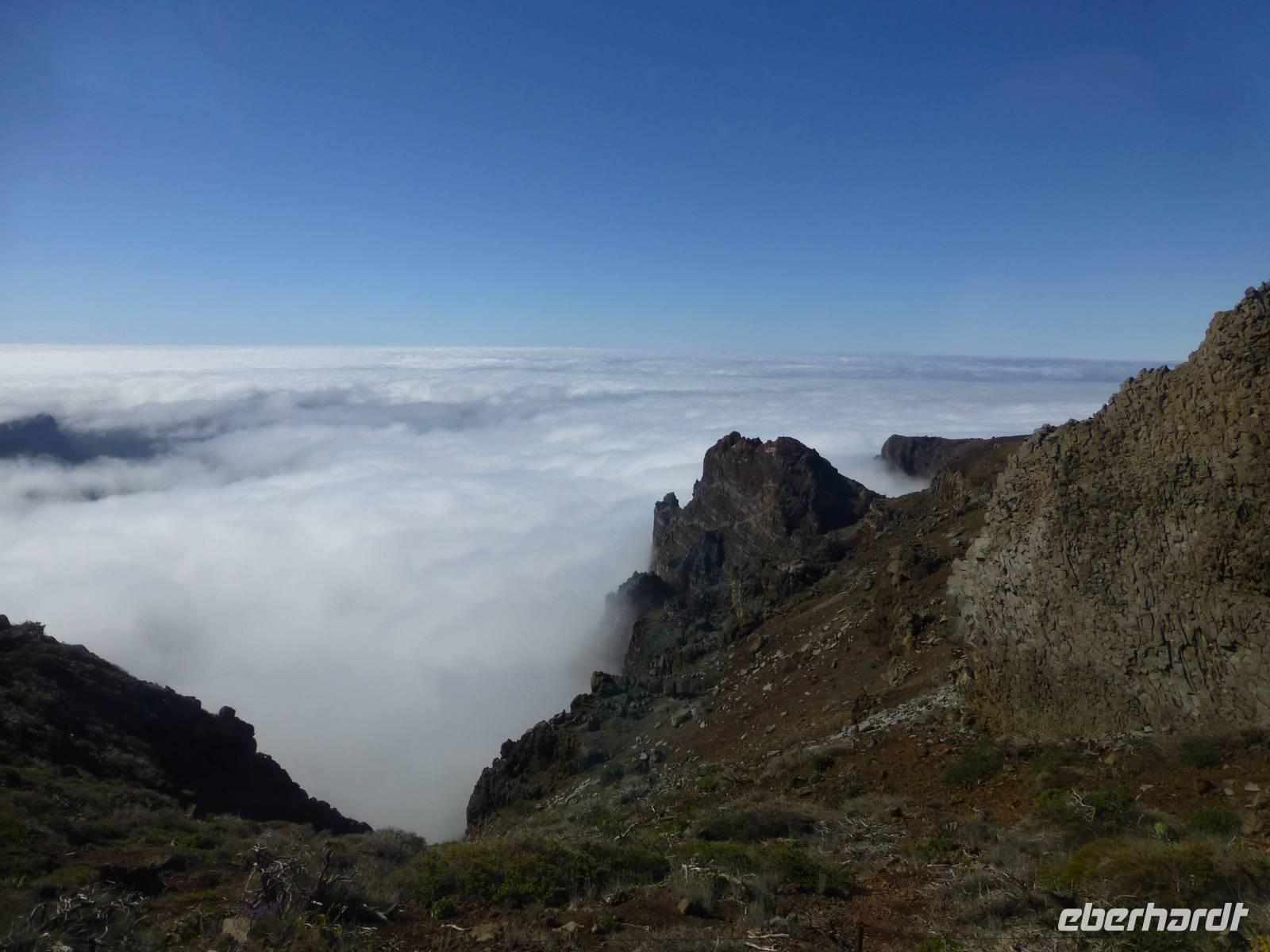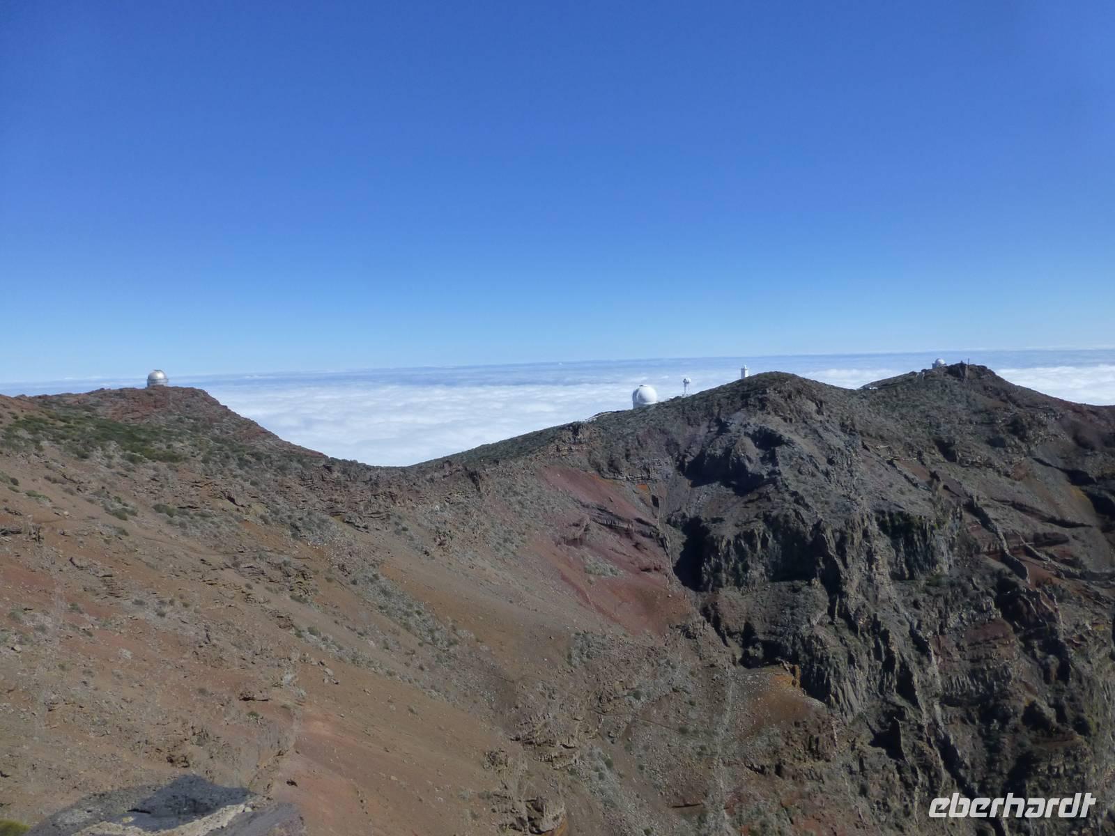 Endlich werden die Wanderschuhe geschnürt und wir starten gemeinsam mit unserem örtlichen Wanderführer Andreas zu unserem ersten Abenteuer. Mit dem Bus fahren wir die Serpentinenstraße hinauf zu den „Roque de Los Muchachos" auf eine Höhe von 2.426 Metern. Als wir zunächst durch die Wolkendecke fahren, ist kaum an eine gute Sicht zu denken. Doch plötzlich befinden wir uns über den Wolken bei strahlend blauem Himmel. Besser könnte es wohl kaum sein - die Aussicht ist einfach atemberaubend! Unsere Wanderung führt entlang des Kraterrandes, wobei wir hinab in tiefe Schluchten blicken. Nur wenige Pflanzen zieren die schroffe Landschaft aus rotbraunem Lava-Gestein - eine Ausnahme ist die blättchenreiche Drüsenfrucht (ach, wie lange haben wir das geübt ). Wegen der idealen Bedingungen befinden sich hier oben die wichtigsten Sternwarten Europas. Unser Ziel ist der „Pico de la Cruz" von wo wir noch einmal einen fantastischen Panoramablick auf den Einsturz- und Erosionskrater haben. Am späten Nachmittag kehren wir zum Hotel zurück. Vor dem Abendessen ist somit noch Zeit für ein erfrischendes Bad im Meerwasser-Pool.