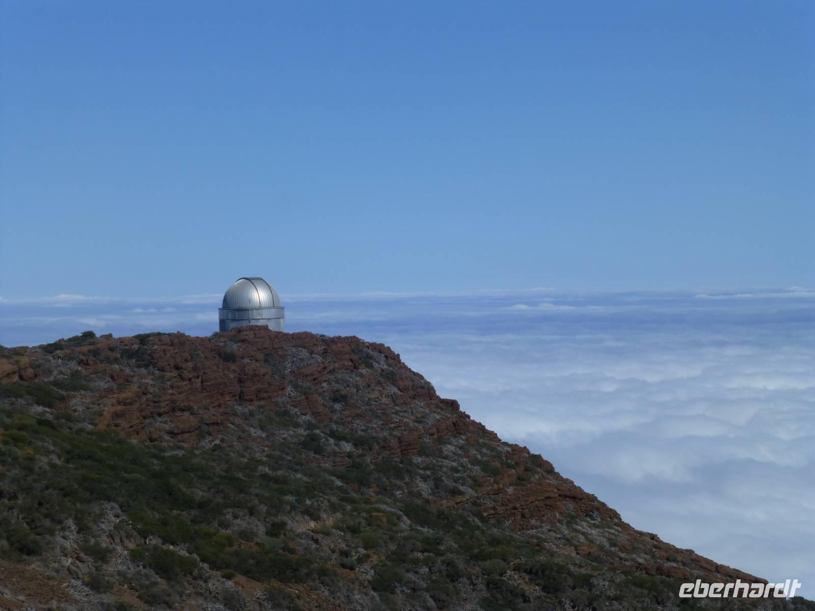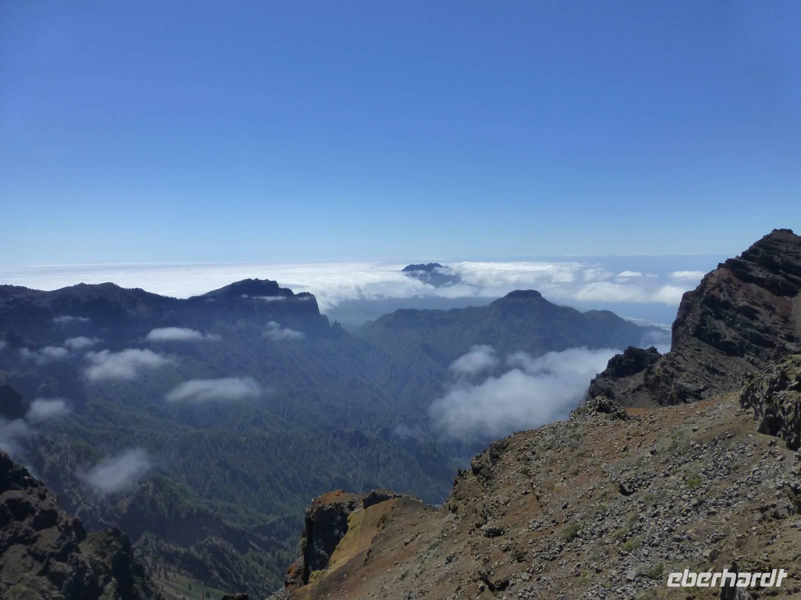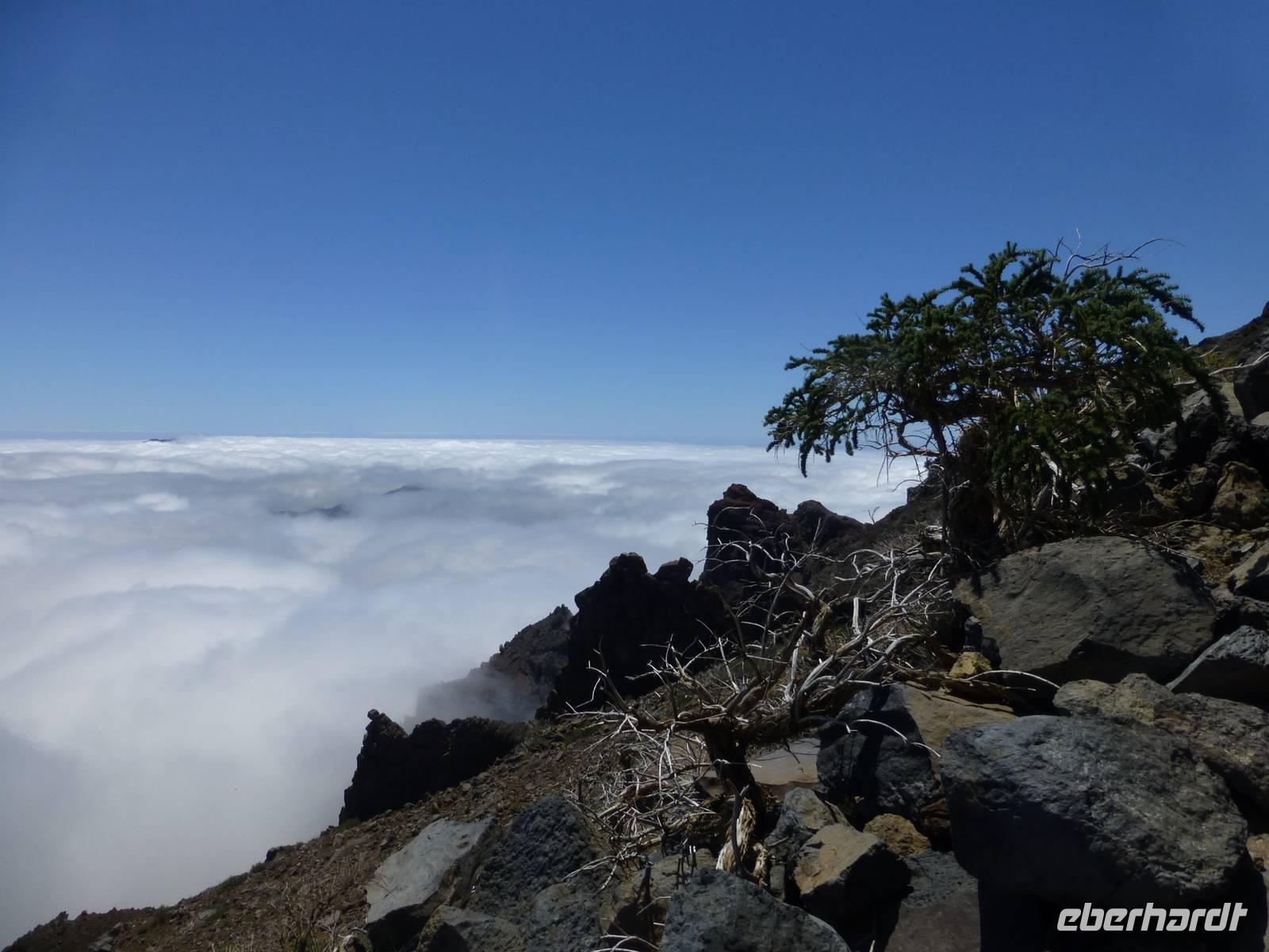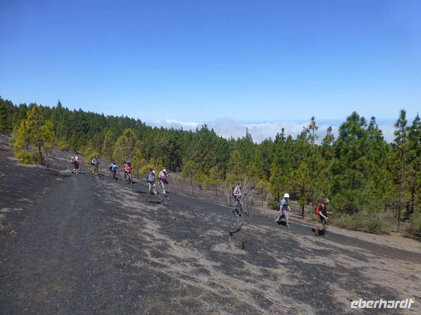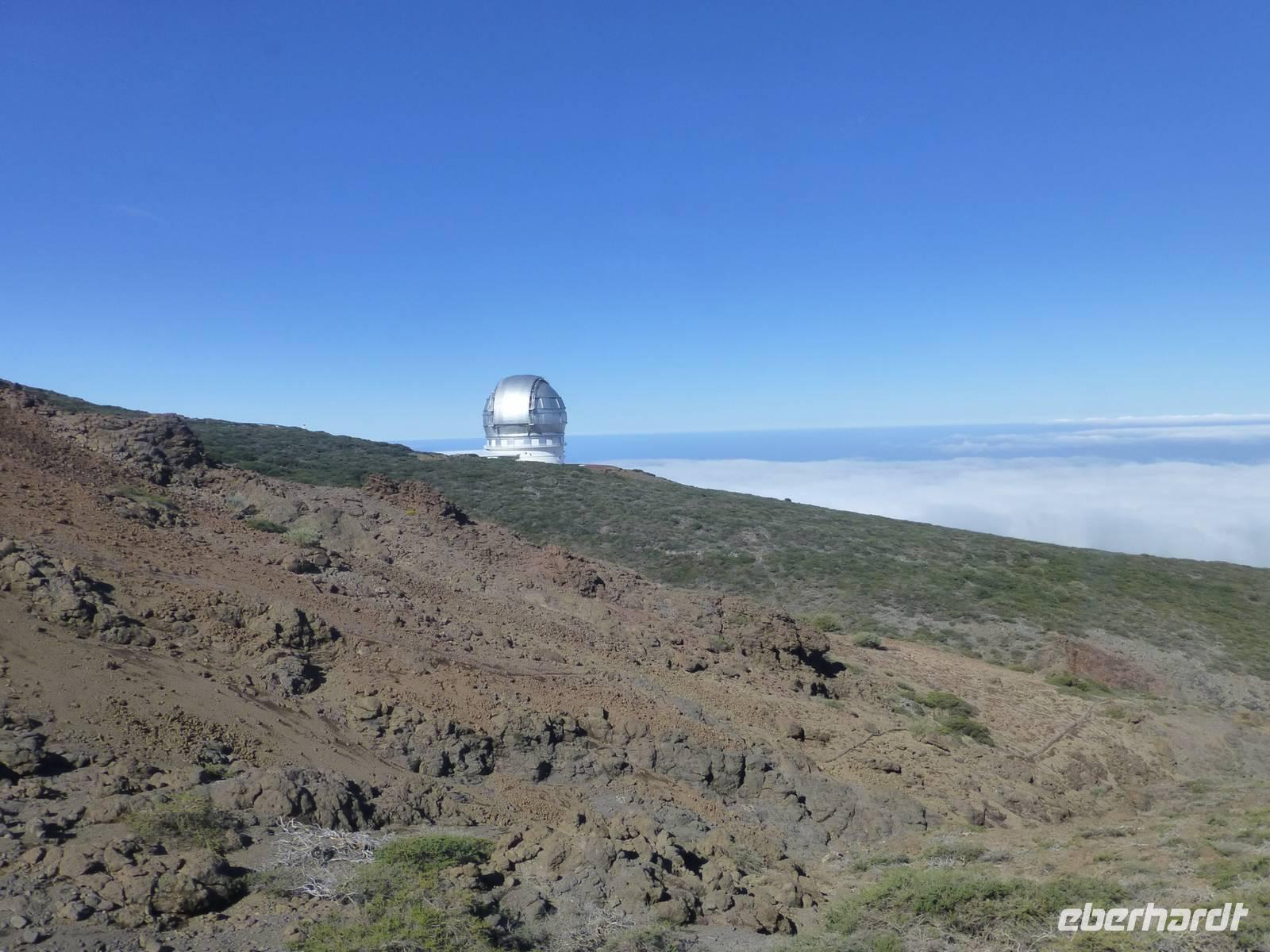 Endlich werden die Wanderschuhe geschnürt und wir starten gemeinsam mit unserem örtlichen Wanderführer Andreas zu unserem ersten Abenteuer. Mit dem Bus fahren wir die Serpentinenstraße hinauf zu den „Roque de Los Muchachos" auf eine Höhe von 2.426 Metern. Als wir zunächst durch die Wolkendecke fahren, ist kaum an eine gute Sicht zu denken. Doch plötzlich befinden wir uns über den Wolken bei strahlend blauem Himmel. Besser könnte es wohl kaum sein - die Aussicht ist einfach atemberaubend! Unsere Wanderung führt entlang des Kraterrandes, wobei wir hinab in tiefe Schluchten blicken. Nur wenige Pflanzen zieren die schroffe Landschaft aus rotbraunem Lava-Gestein - eine Ausnahme ist die blättchenreiche Drüsenfrucht (ach, wie lange haben wir das geübt ). Wegen der idealen Bedingungen befinden sich hier oben die wichtigsten Sternwarten Europas. Unser Ziel ist der „Pico de la Cruz" von wo wir noch einmal einen fantastischen Panoramablick auf den Einsturz- und Erosionskrater haben. Am späten Nachmittag kehren wir zum Hotel zurück. Vor dem Abendessen ist somit noch Zeit für ein erfrischendes Bad im Meerwasser-Pool.