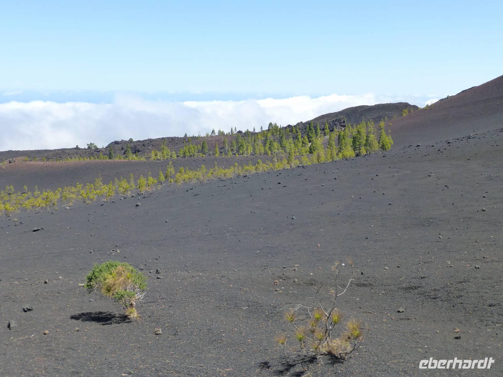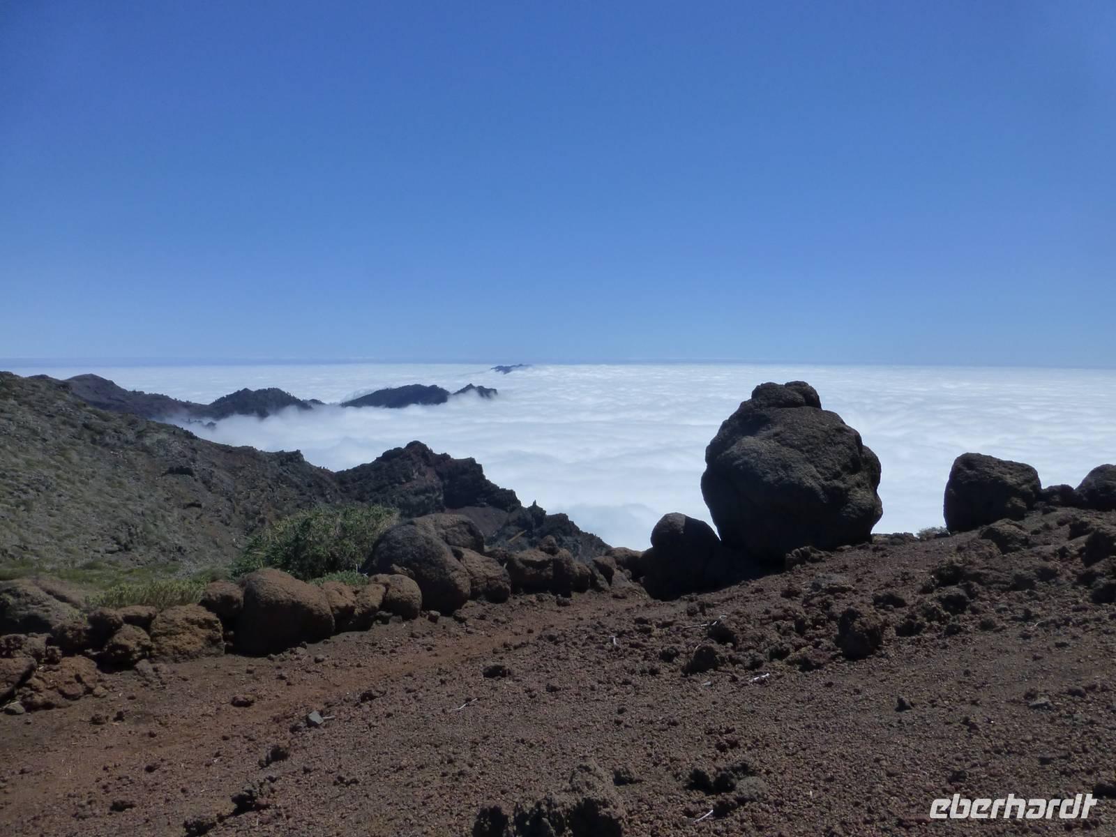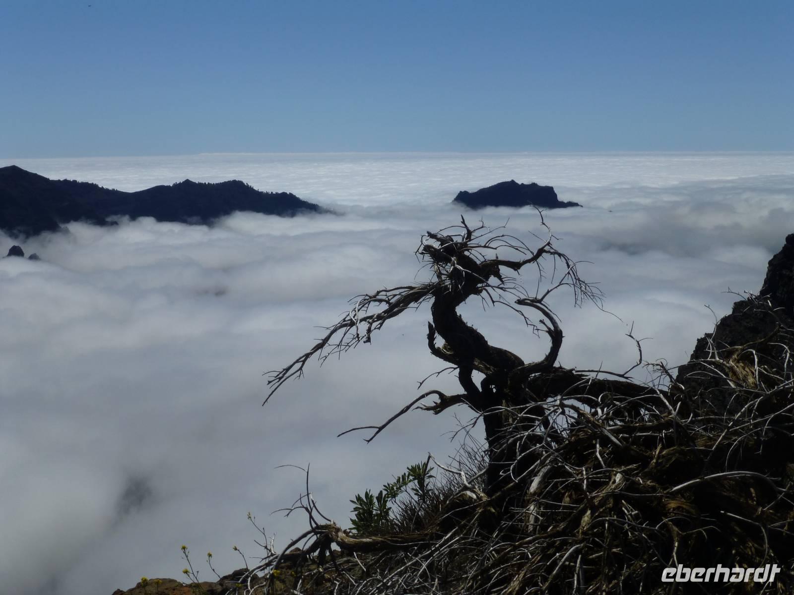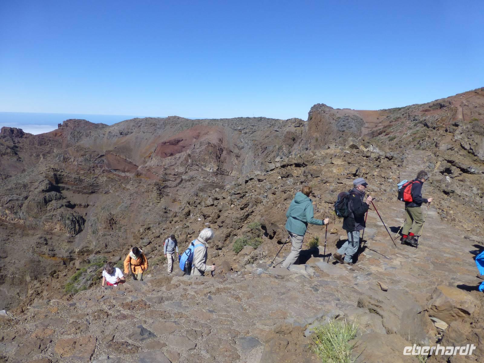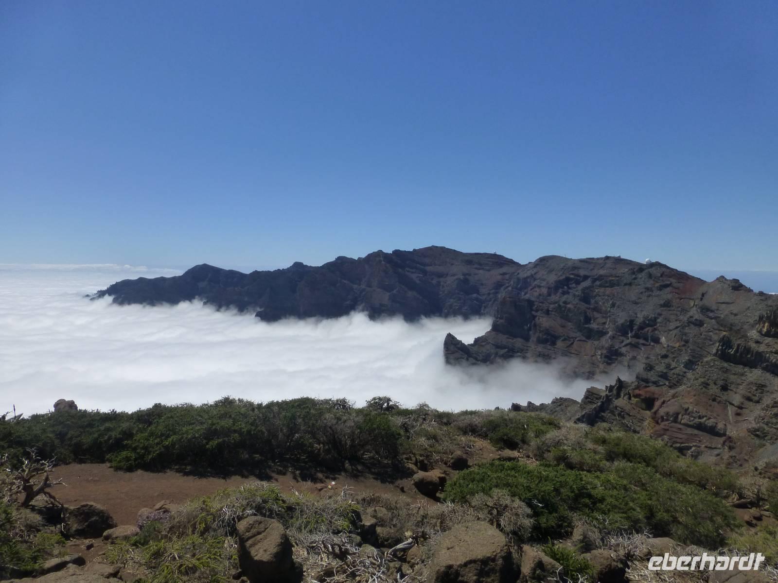 Endlich werden die Wanderschuhe geschnürt und wir starten gemeinsam mit unserem örtlichen Wanderführer Andreas zu unserem ersten Abenteuer. Mit dem Bus fahren wir die Serpentinenstraße hinauf zu den „Roque de Los Muchachos" auf eine Höhe von 2.426 Metern. Als wir zunächst durch die Wolkendecke fahren, ist kaum an eine gute Sicht zu denken. Doch plötzlich befinden wir uns über den Wolken bei strahlend blauem Himmel. Besser könnte es wohl kaum sein - die Aussicht ist einfach atemberaubend! Unsere Wanderung führt entlang des Kraterrandes, wobei wir hinab in tiefe Schluchten blicken. Nur wenige Pflanzen zieren die schroffe Landschaft aus rotbraunem Lava-Gestein - eine Ausnahme ist die blättchenreiche Drüsenfrucht (ach, wie lange haben wir das geübt ). Wegen der idealen Bedingungen befinden sich hier oben die wichtigsten Sternwarten Europas. Unser Ziel ist der „Pico de la Cruz" von wo wir noch einmal einen fantastischen Panoramablick auf den Einsturz- und Erosionskrater haben. Am späten Nachmittag kehren wir zum Hotel zurück. Vor dem Abendessen ist somit noch Zeit für ein erfrischendes Bad im Meerwasser-Pool.