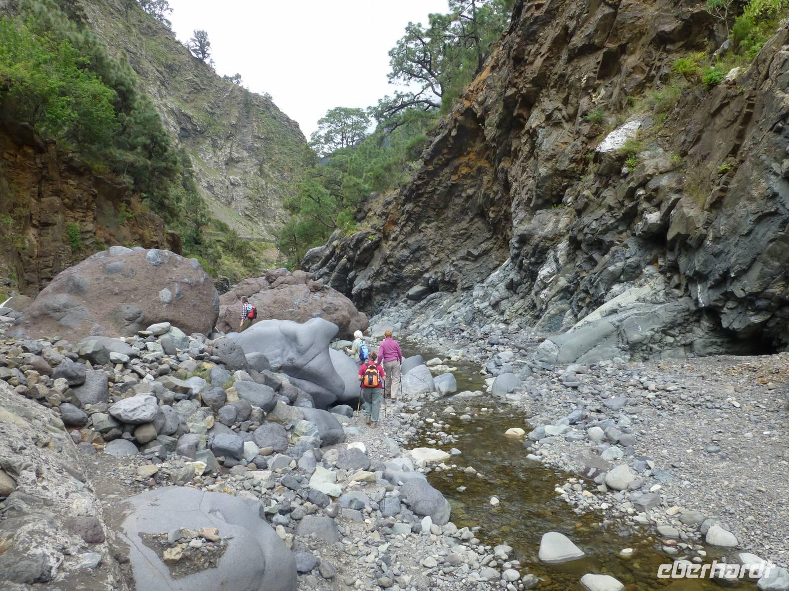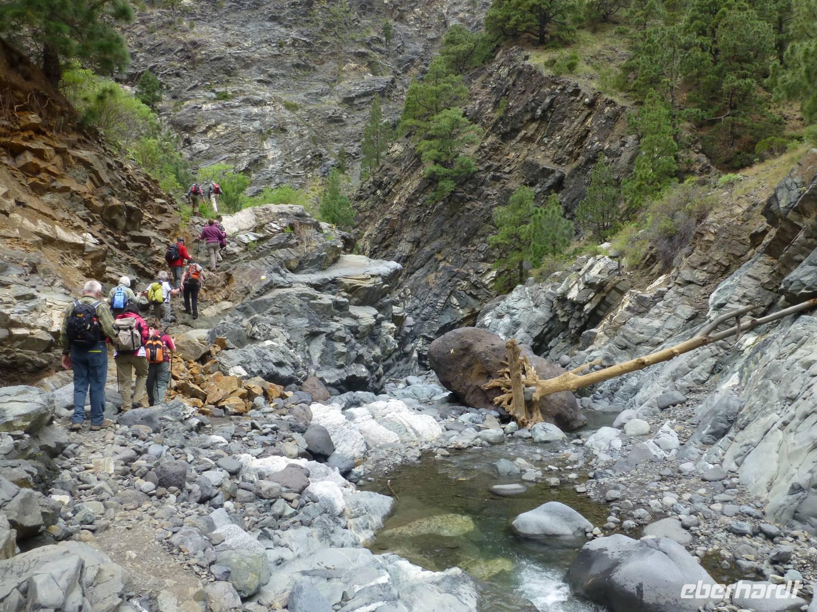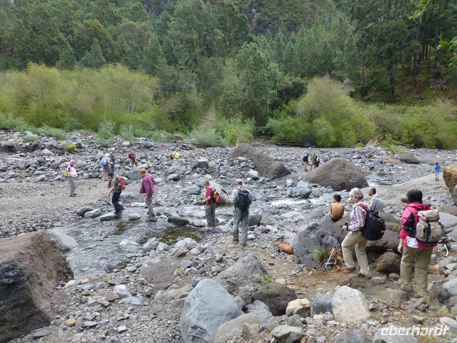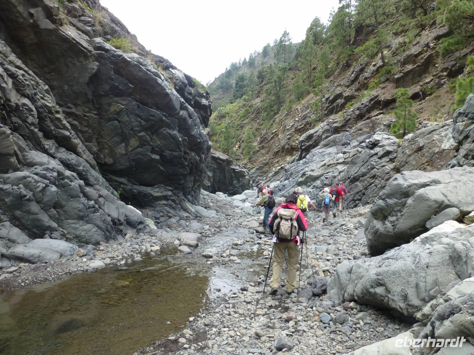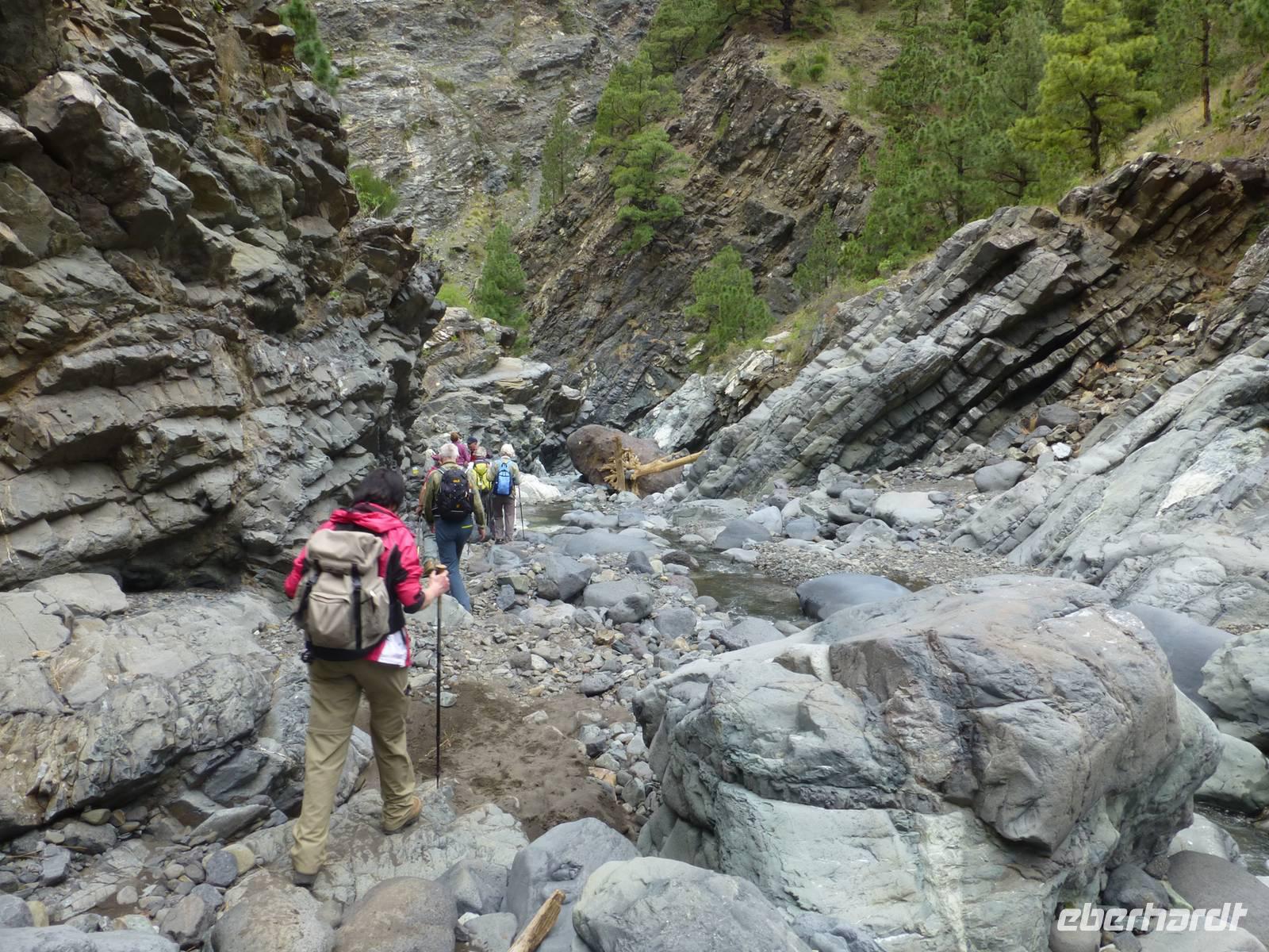 Nachdem wir gestern am Kraterrand entlang gewandert sind, erkunden wir heute das Innere des Kessels. Schon die Fahrt zum Ausgangspunkt unserer Wanderung ist abenteuerlich - in Spitzkehren windet sich die schmale Straße hinauf nach Los Brecitos. Von hier geht es zu Fuß zunächst gemütlich durch den kanarischen Kiefernwald hinein in den Nationalpark. Nach dem Picknick führt der Pfad steil bergab über Eselswege bis wir den Taburiente-Fluss erreichen. Ab hier wird es tatsächlich etwas abenteuerlich... wir wandern durch die enge Schlucht und müssen dabei mehrfach den Fluss überqueren, dabei ist ein bisschen Geschick und eine gute Balance gefragt. Zum Glück hat sich niemand nasse Füße geholt! Auf und ab geht es immer wieder auch über große Felsblöcke bis wir schließlich nach insgesamt 16 Kilometern den Parkplatz erreichen. Liebe Reisegruppe: heute habt ihr nicht nur das Eberhardt-Wanderdiplom, sondern auch das „Bergziegen-Diplom" verdient!