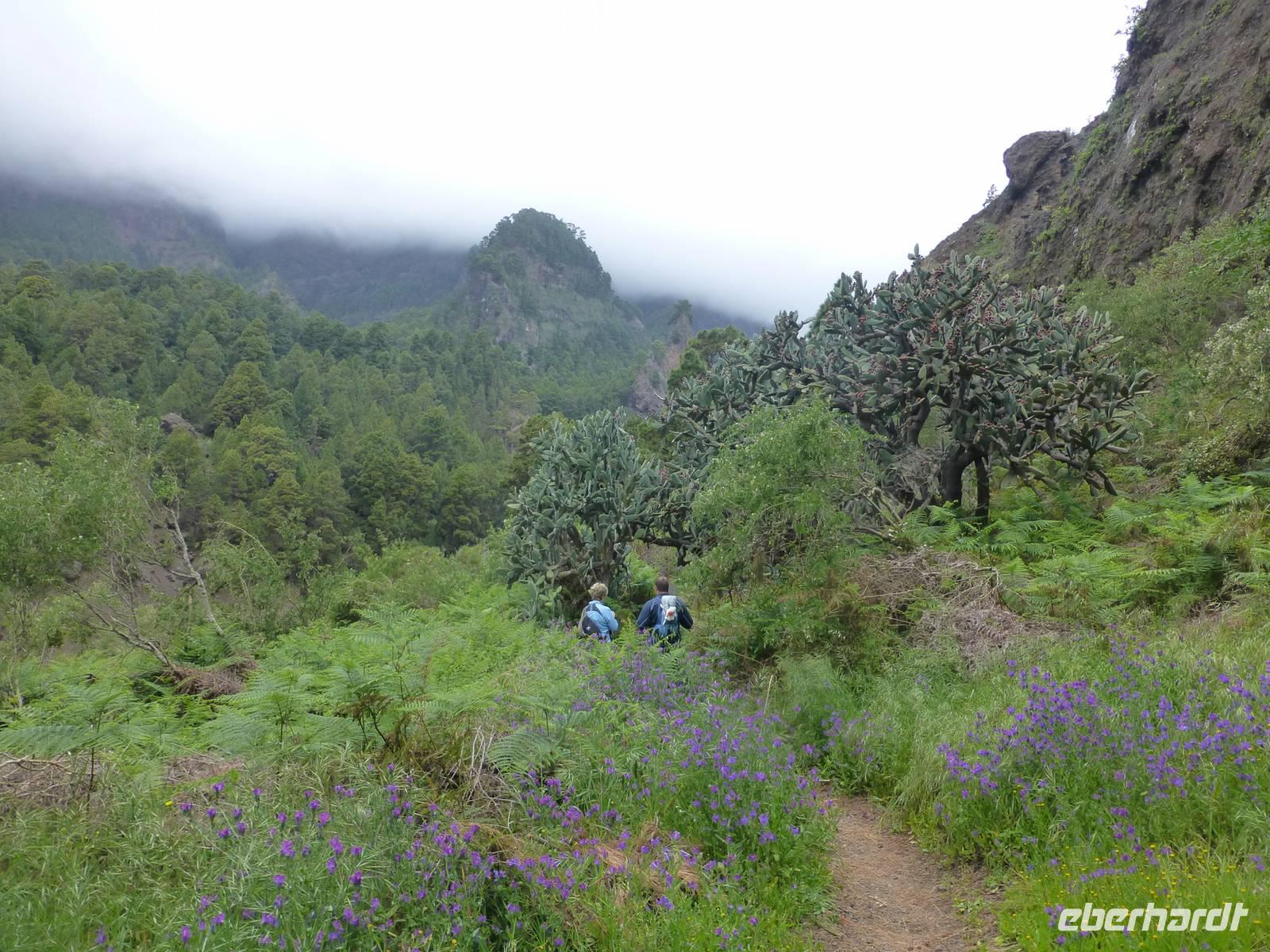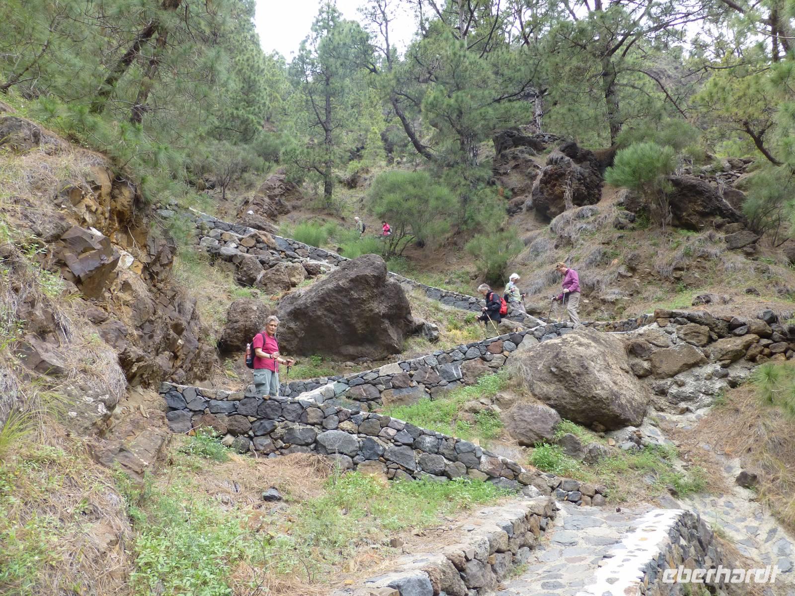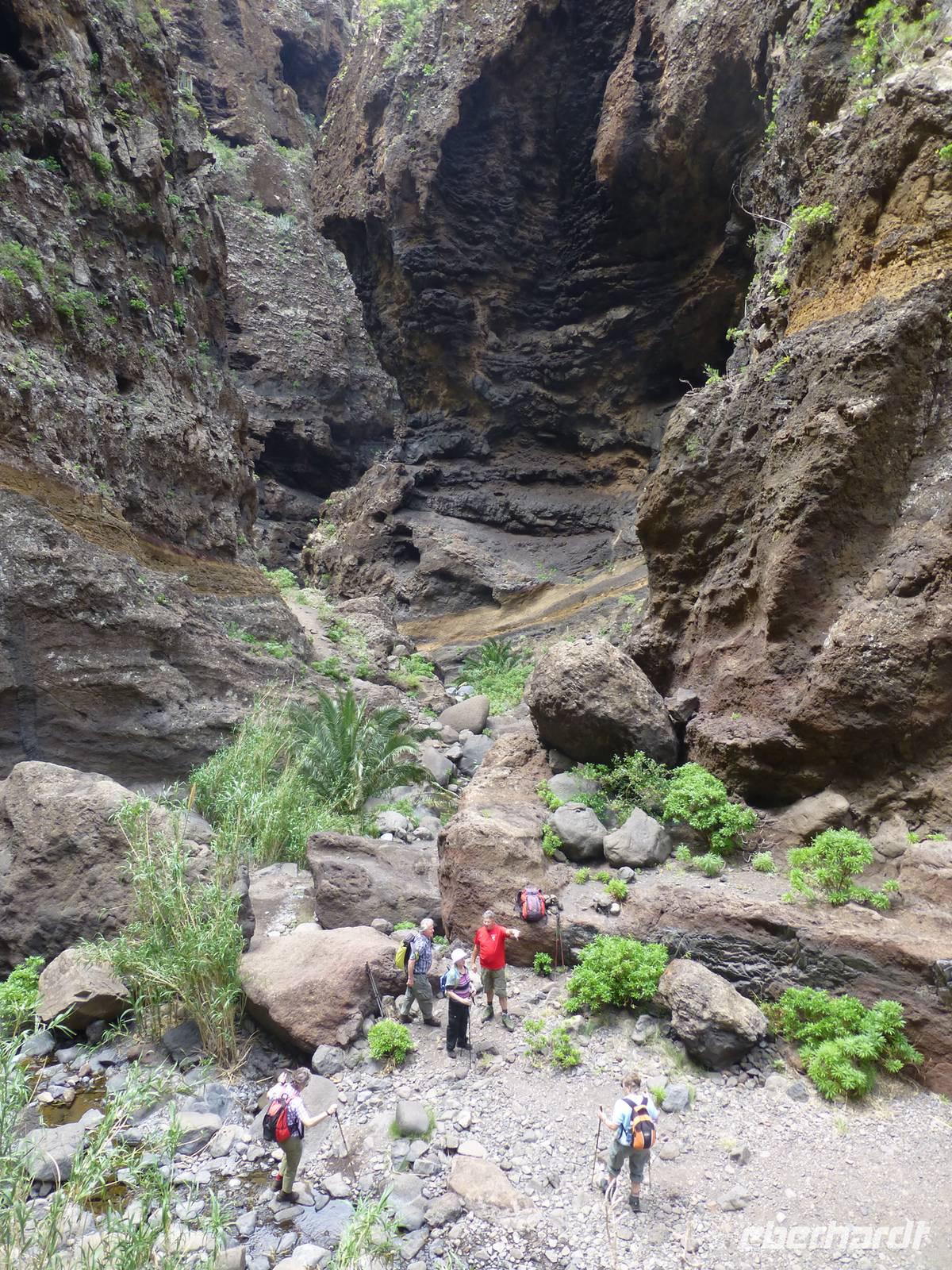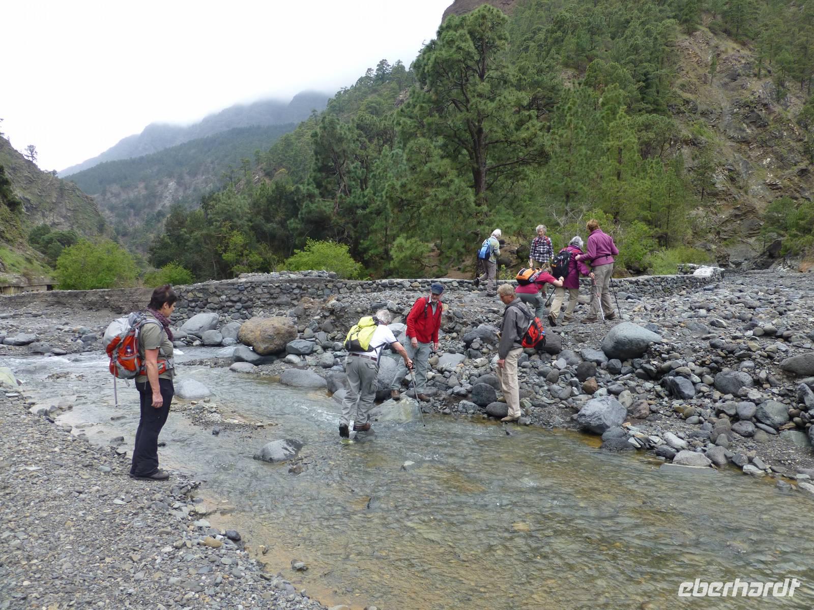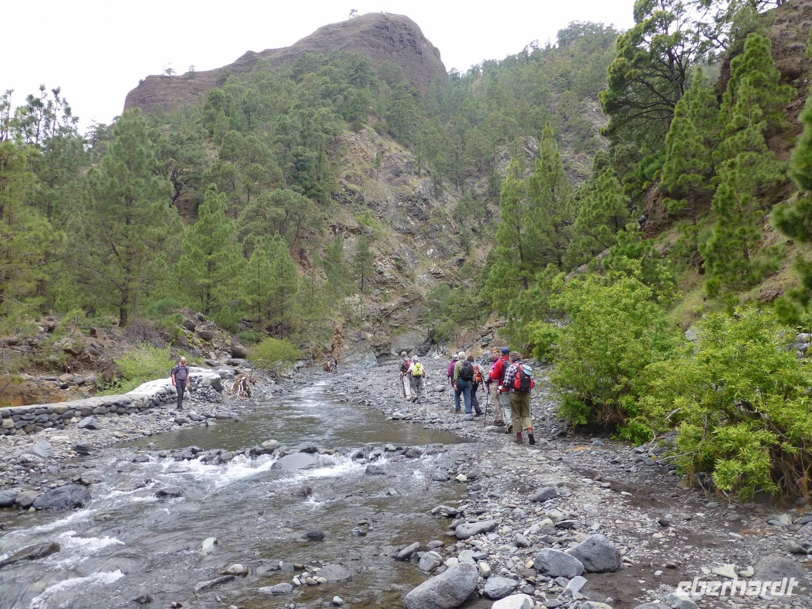 Nachdem wir gestern am Kraterrand entlang gewandert sind, erkunden wir heute das Innere des Kessels. Schon die Fahrt zum Ausgangspunkt unserer Wanderung ist abenteuerlich - in Spitzkehren windet sich die schmale Straße hinauf nach Los Brecitos. Von hier geht es zu Fuß zunächst gemütlich durch den kanarischen Kiefernwald hinein in den Nationalpark. Nach dem Picknick führt der Pfad steil bergab über Eselswege bis wir den Taburiente-Fluss erreichen. Ab hier wird es tatsächlich etwas abenteuerlich... wir wandern durch die enge Schlucht und müssen dabei mehrfach den Fluss überqueren, dabei ist ein bisschen Geschick und eine gute Balance gefragt. Zum Glück hat sich niemand nasse Füße geholt! Auf und ab geht es immer wieder auch über große Felsblöcke bis wir schließlich nach insgesamt 16 Kilometern den Parkplatz erreichen. Liebe Reisegruppe: heute habt ihr nicht nur das Eberhardt-Wanderdiplom, sondern auch das „Bergziegen-Diplom" verdient!
