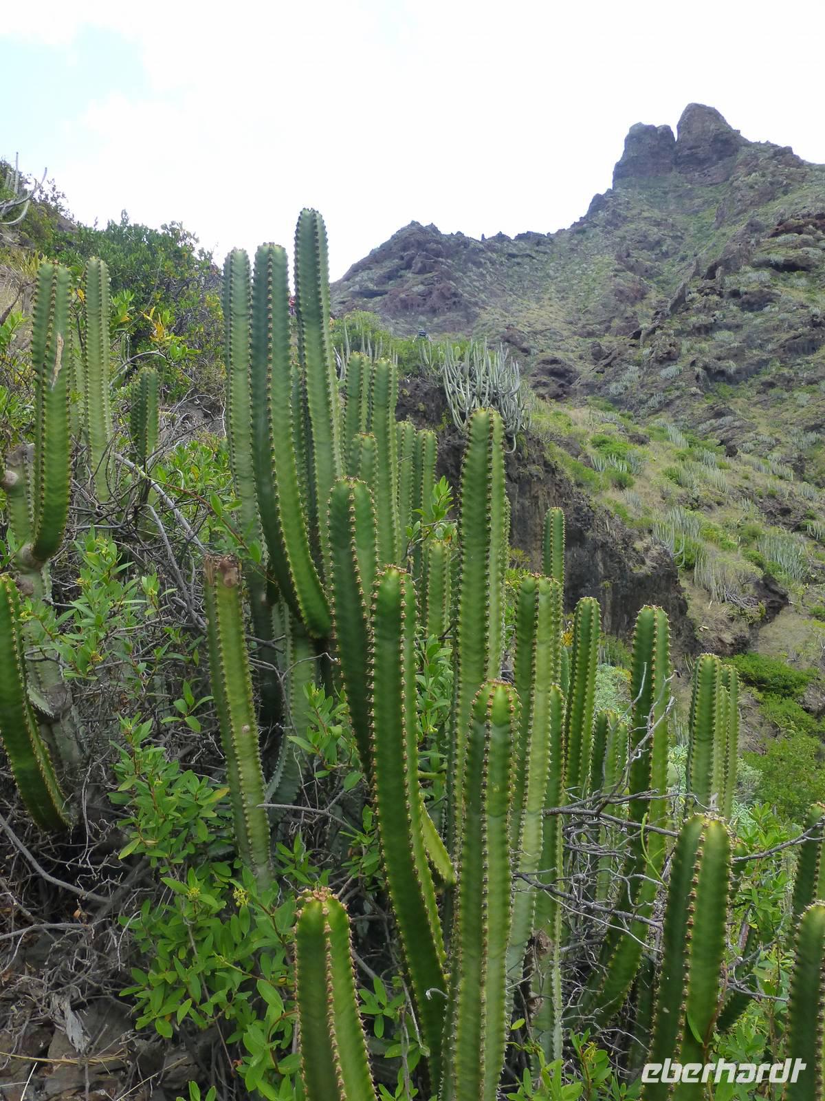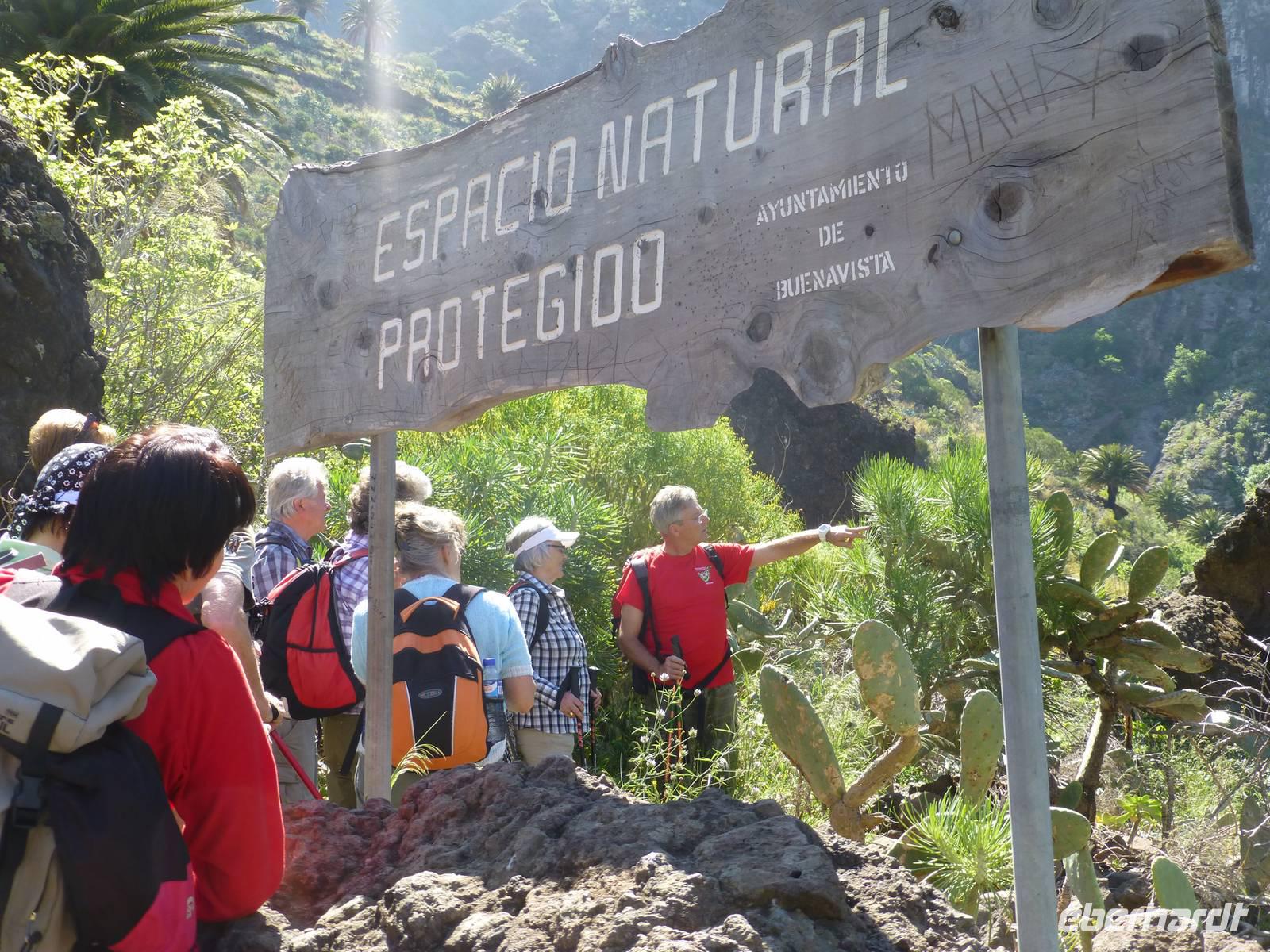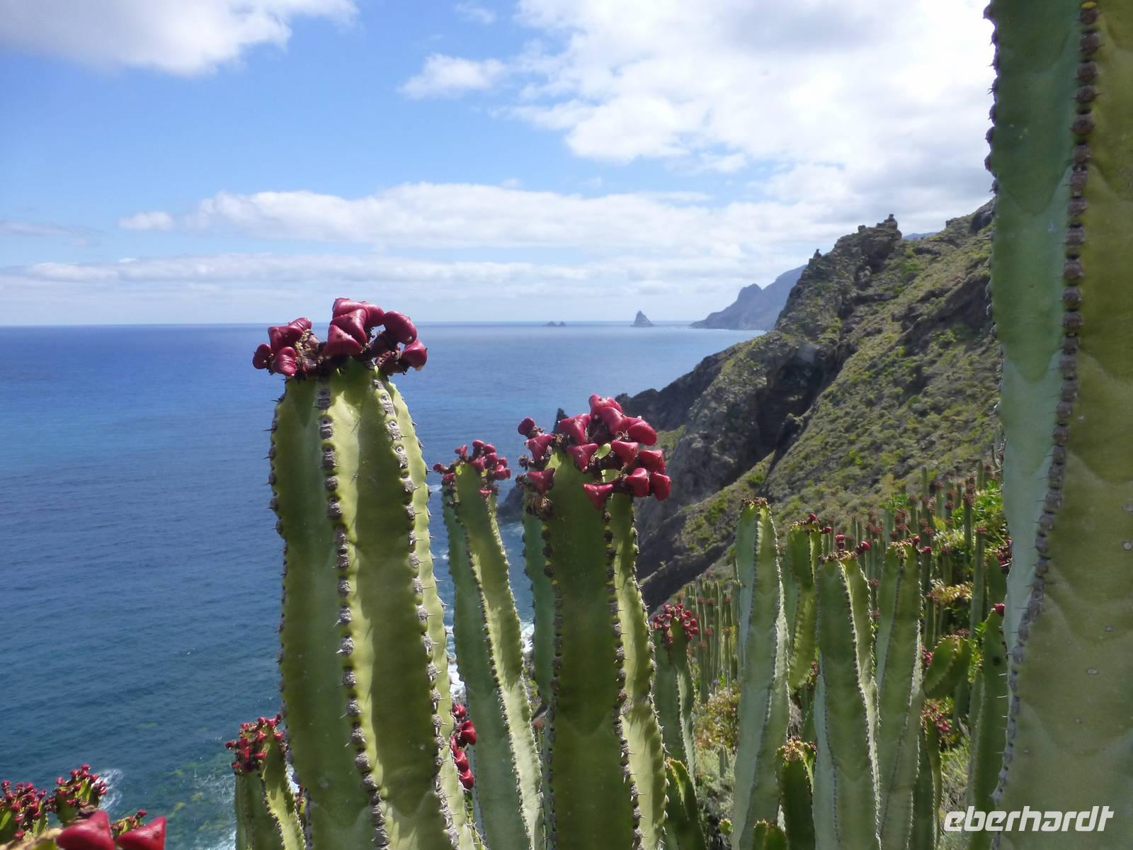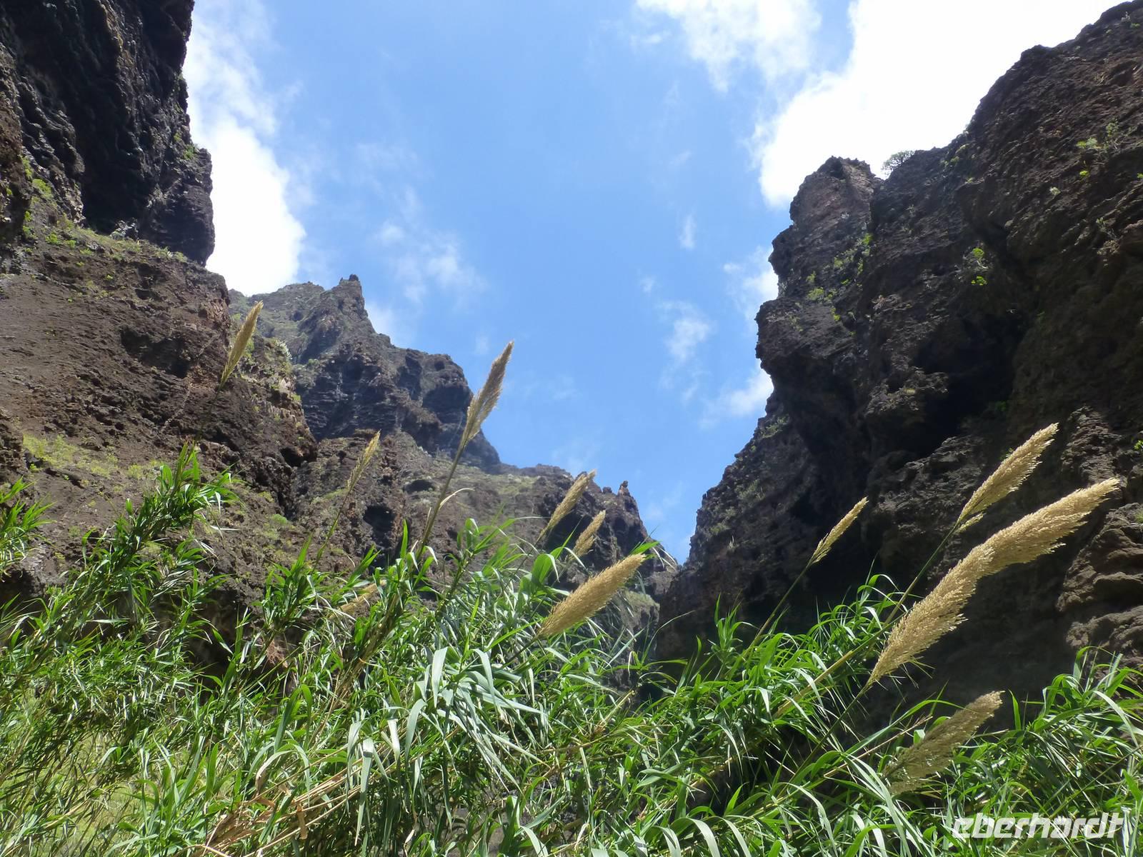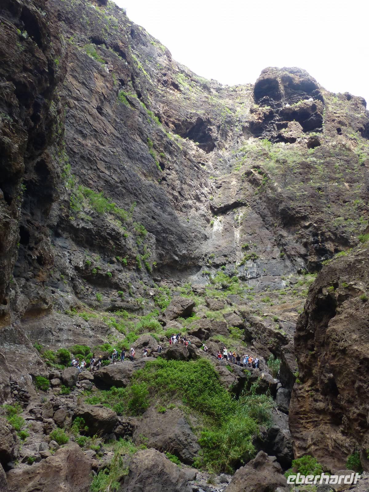 Heute wollen wir nun die landschaftlichen Reize der größten Kanaren-Insel kennenlernen. Mit dem Bus fahren wir zunächst die Küstenstraße entlang, um dann in das „versteckte" Bergdorf Masca zu gelangen. Hier beginnt unsere Wanderung hinab durch die berühmte Schlucht. Zugegeben, ganz so „versteckt" ist das Dörfchen heutzutage nicht mehr, denn neben uns sind noch einige Wanderer unterwegs. Unser örtlicher Wanderführer Othmar zeigt uns viele Pflanzen am Wegesrand: neben der „Wunderblume" lernen wir beispielsweise auch die endemische Kanarische Winde mit ihren weißen Blüten und die purpurrote Königsjuva-Wolfsmilch kennen. Fast den ganzen Weg begleiten uns die stacheligen Kaktusfeigen sowie verschiedene Dickblattgewächse. Besonders eindrucksvoll sind die steil aufragenden Felswände in der engen Schlucht. Das bizarre Vulkangestein ist mit Adern aus erstarrter Lava durchzogen und zwischen den Gesteinslagen zeichnen sich braune Ascheschichten ab. Der Weg führt über felsigen Untergrund und zum Teil über große Felsblöcke, so dass die Wanderstöcke eine gute Hilfe sind. Am späten Nachmittag erreichen wir schließlich den Ausgang der Schlucht am Meer, wo sich ein kurzes Bad zur Erfrischung anbietet. Schon bald „entern" wir das Boot, das uns vorbei an den fast 500 Meter hohen Felswänden von „Los Gigantes" zum Hafen bringt. Dieser Küstenabschnitt beschreibt mit ca. 12 Kilometern die längste Steilküste Europas!