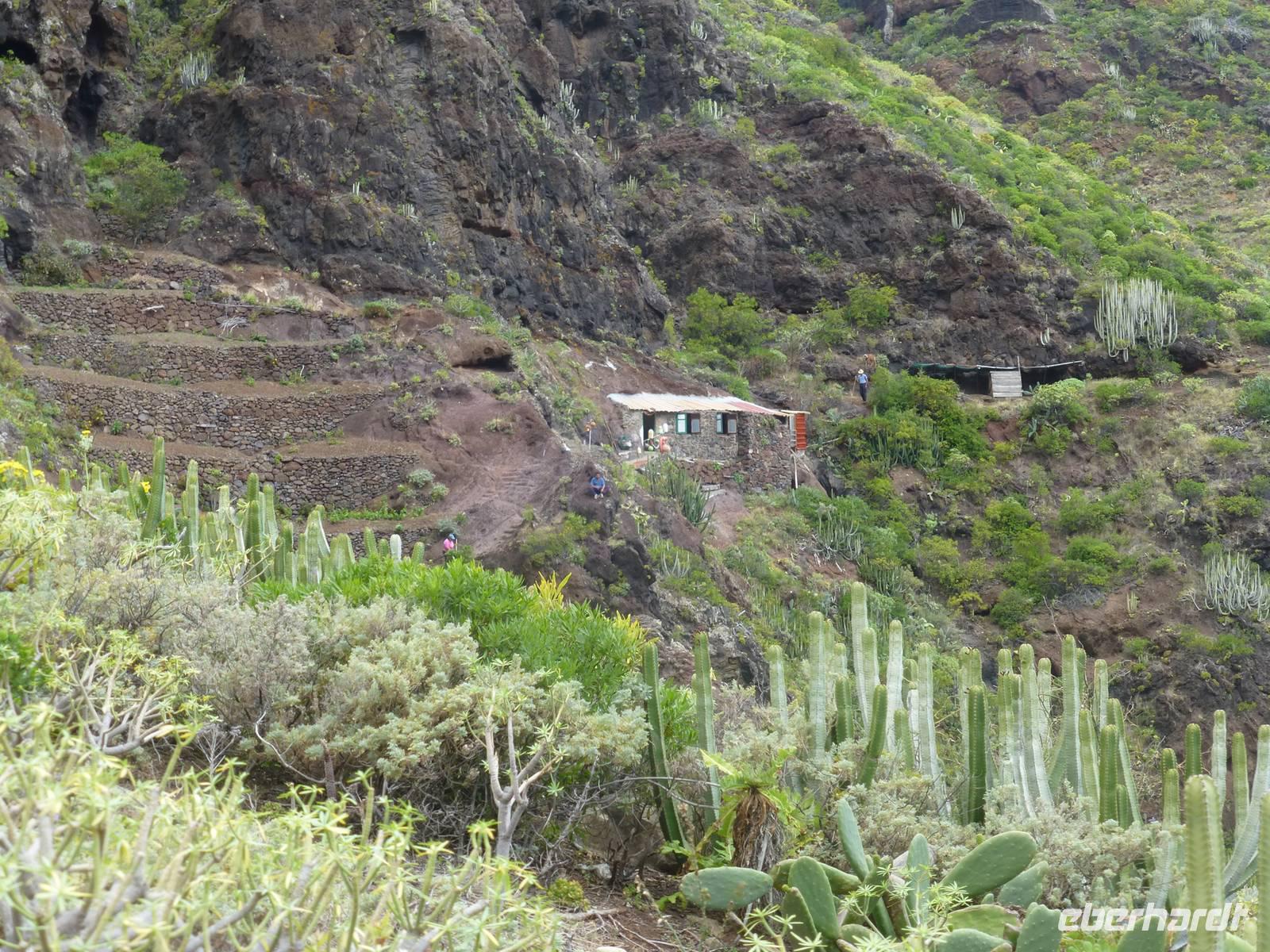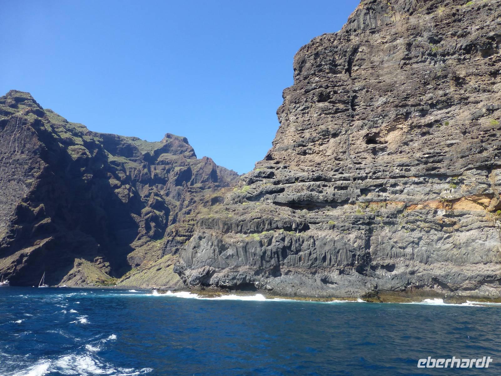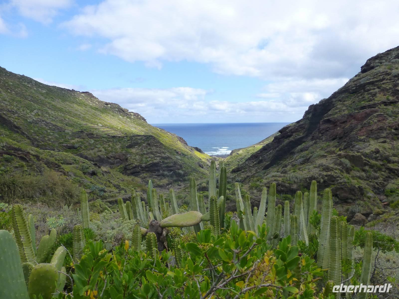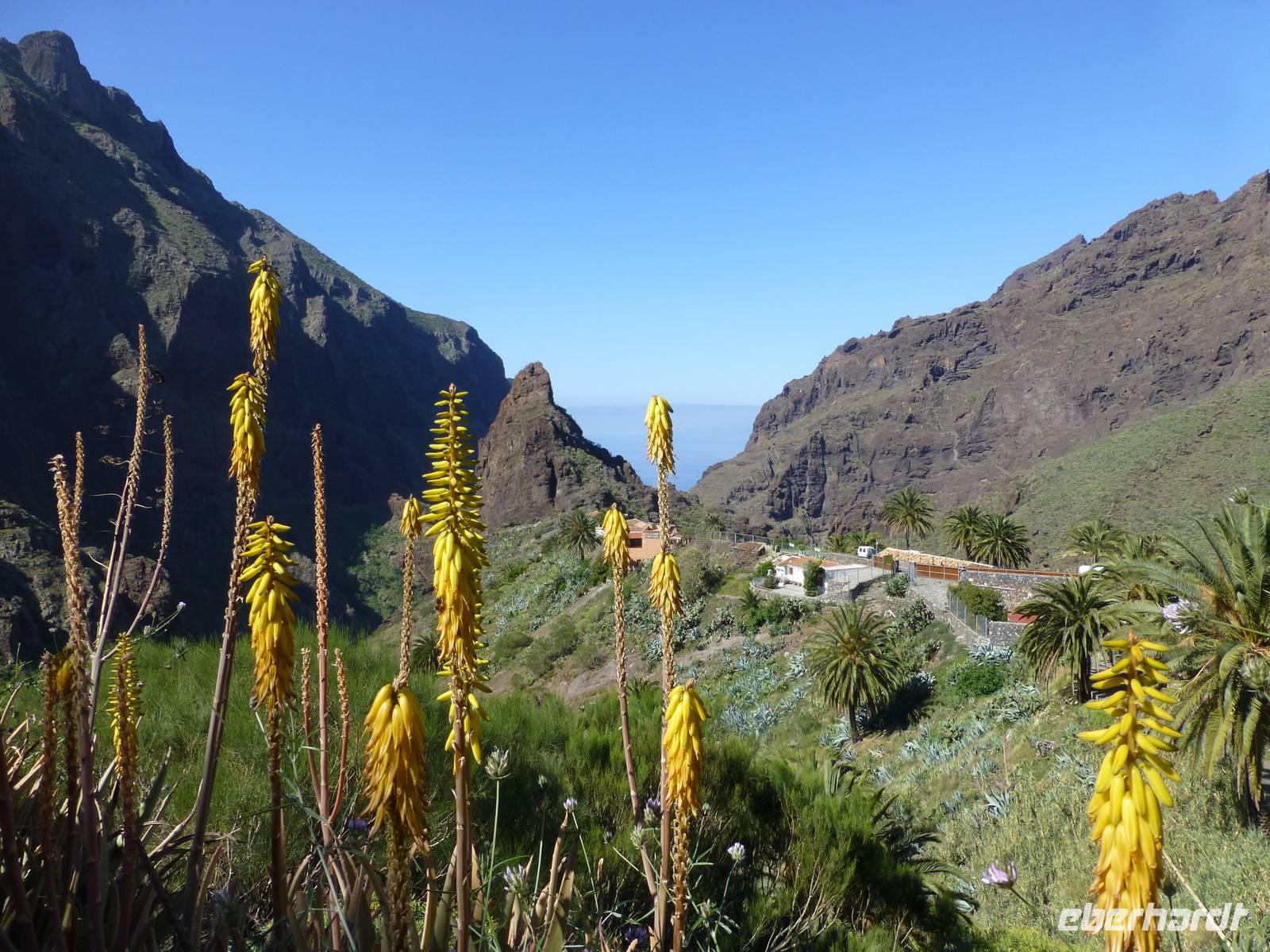 Heute wollen wir nun die landschaftlichen Reize der größten Kanaren-Insel kennenlernen. Mit dem Bus fahren wir zunächst die Küstenstraße entlang, um dann in das „versteckte" Bergdorf Masca zu gelangen. Hier beginnt unsere Wanderung hinab durch die berühmte Schlucht. Zugegeben, ganz so „versteckt" ist das Dörfchen heutzutage nicht mehr, denn neben uns sind noch einige Wanderer unterwegs. Unser örtlicher Wanderführer Othmar zeigt uns viele Pflanzen am Wegesrand: neben der „Wunderblume" lernen wir beispielsweise auch die endemische Kanarische Winde mit ihren weißen Blüten und die purpurrote Königsjuva-Wolfsmilch kennen. Fast den ganzen Weg begleiten uns die stacheligen Kaktusfeigen sowie verschiedene Dickblattgewächse. Besonders eindrucksvoll sind die steil aufragenden Felswände in der engen Schlucht. Das bizarre Vulkangestein ist mit Adern aus erstarrter Lava durchzogen und zwischen den Gesteinslagen zeichnen sich braune Ascheschichten ab. Der Weg führt über felsigen Untergrund und zum Teil über große Felsblöcke, so dass die Wanderstöcke eine gute Hilfe sind. Am späten Nachmittag erreichen wir schließlich den Ausgang der Schlucht am Meer, wo sich ein kurzes Bad zur Erfrischung anbietet. Schon bald „entern" wir das Boot, das uns vorbei an den fast 500 Meter hohen Felswänden von „Los Gigantes" zum Hafen bringt. Dieser Küstenabschnitt beschreibt mit ca. 12 Kilometern die längste Steilküste Europas!