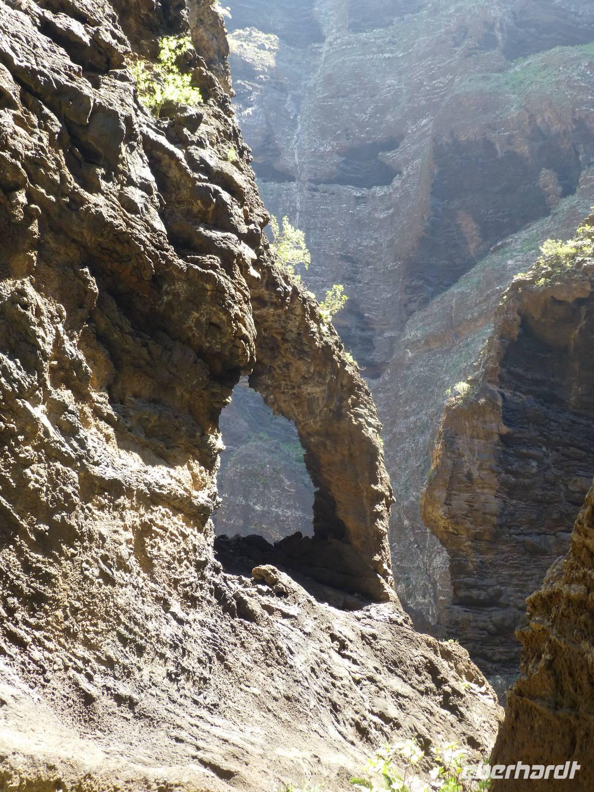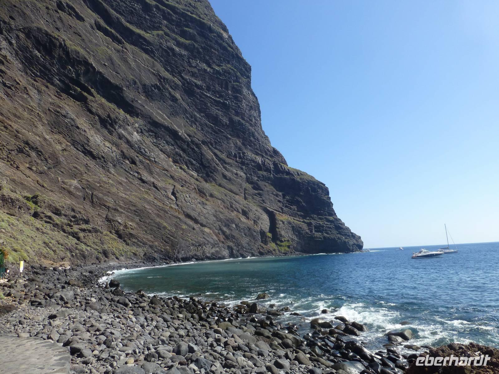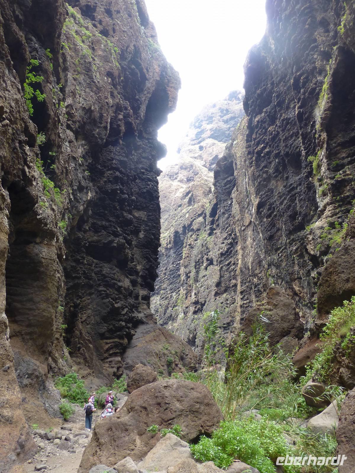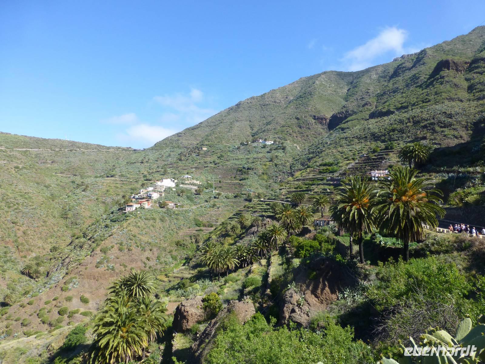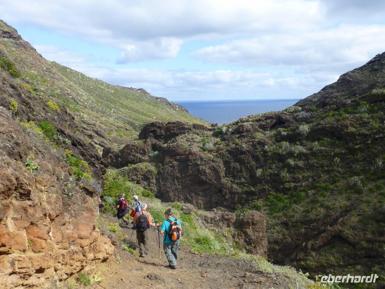 Heute wollen wir nun die landschaftlichen Reize der größten Kanaren-Insel kennenlernen. Mit dem Bus fahren wir zunächst die Küstenstraße entlang, um dann in das „versteckte" Bergdorf Masca zu gelangen. Hier beginnt unsere Wanderung hinab durch die berühmte Schlucht. Zugegeben, ganz so „versteckt" ist das Dörfchen heutzutage nicht mehr, denn neben uns sind noch einige Wanderer unterwegs. Unser örtlicher Wanderführer Othmar zeigt uns viele Pflanzen am Wegesrand: neben der „Wunderblume" lernen wir beispielsweise auch die endemische Kanarische Winde mit ihren weißen Blüten und die purpurrote Königsjuva-Wolfsmilch kennen. Fast den ganzen Weg begleiten uns die stacheligen Kaktusfeigen sowie verschiedene Dickblattgewächse. Besonders eindrucksvoll sind die steil aufragenden Felswände in der engen Schlucht. Das bizarre Vulkangestein ist mit Adern aus erstarrter Lava durchzogen und zwischen den Gesteinslagen zeichnen sich braune Ascheschichten ab. Der Weg führt über felsigen Untergrund und zum Teil über große Felsblöcke, so dass die Wanderstöcke eine gute Hilfe sind. Am späten Nachmittag erreichen wir schließlich den Ausgang der Schlucht am Meer, wo sich ein kurzes Bad zur Erfrischung anbietet. Schon bald „entern" wir das Boot, das uns vorbei an den fast 500 Meter hohen Felswänden von „Los Gigantes" zum Hafen bringt. Dieser Küstenabschnitt beschreibt mit ca. 12 Kilometern die längste Steilküste Europas!