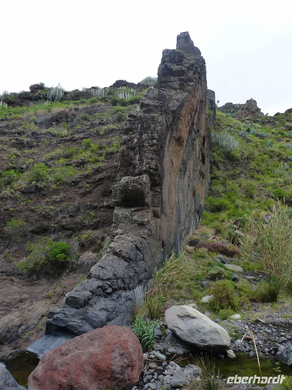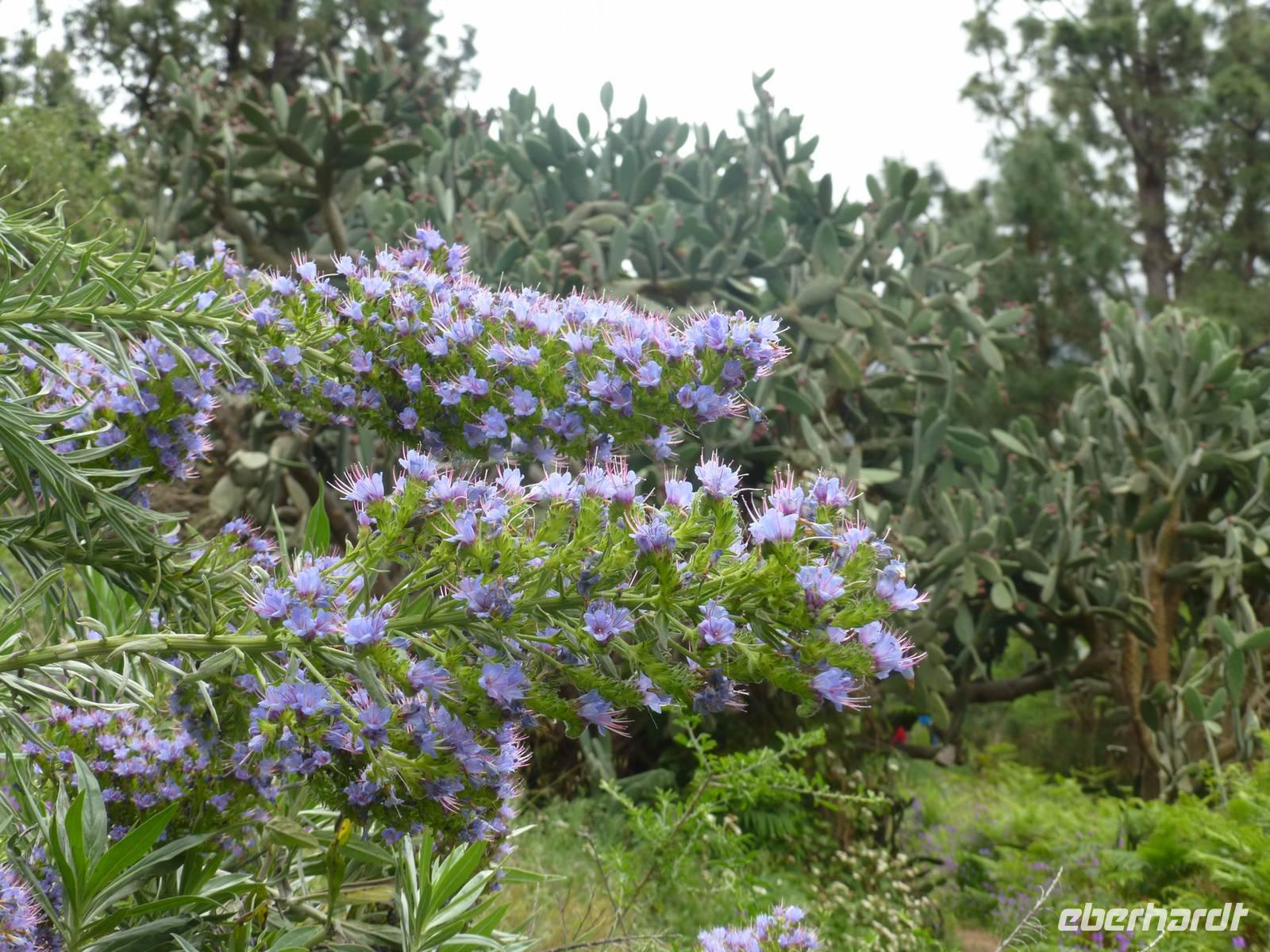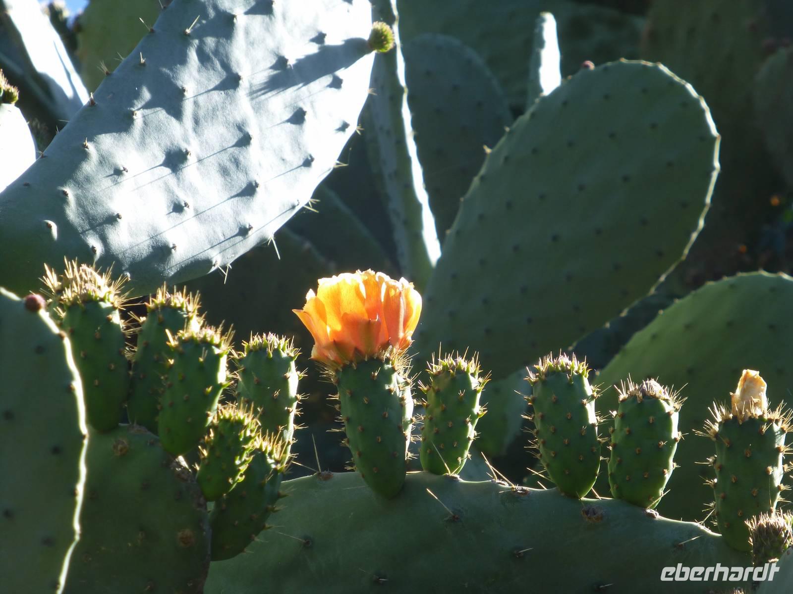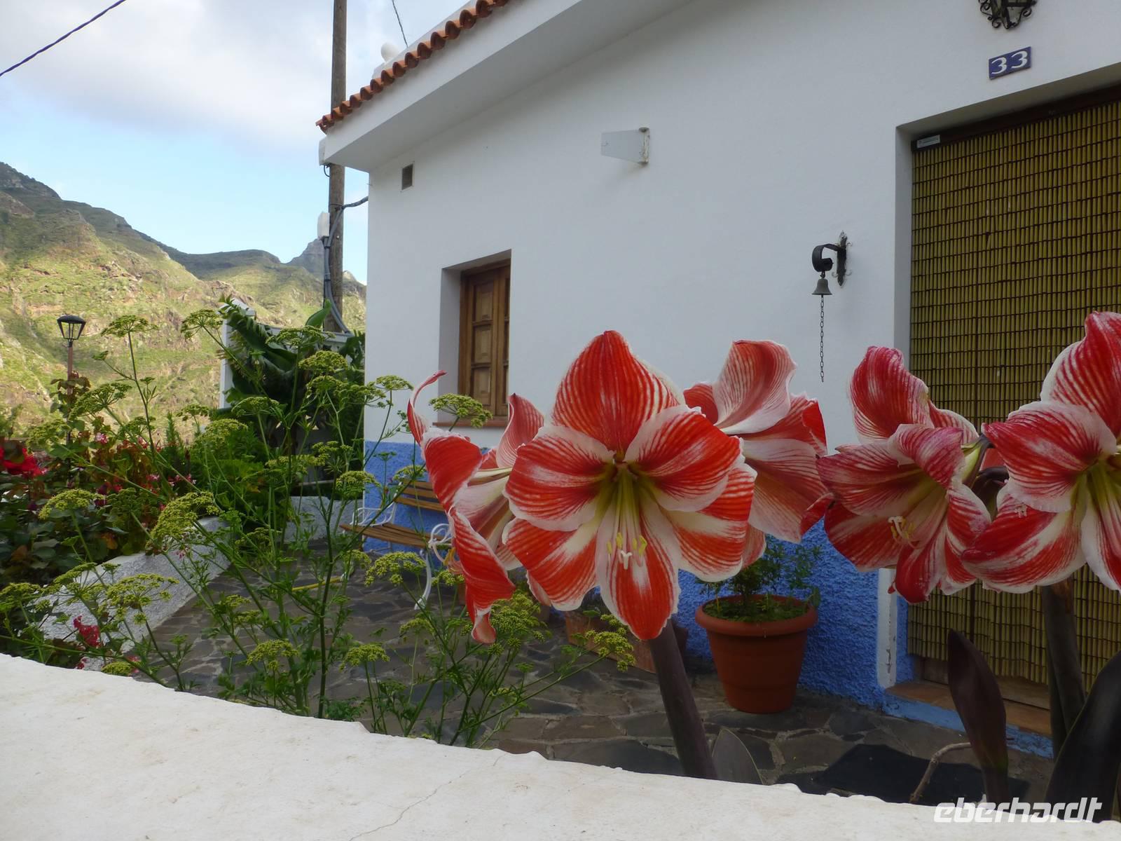 Heute wollen wir nun die landschaftlichen Reize der größten Kanaren-Insel kennenlernen. Mit dem Bus fahren wir zunächst die Küstenstraße entlang, um dann in das „versteckte" Bergdorf Masca zu gelangen. Hier beginnt unsere Wanderung hinab durch die berühmte Schlucht. Zugegeben, ganz so „versteckt" ist das Dörfchen heutzutage nicht mehr, denn neben uns sind noch einige Wanderer unterwegs. Unser örtlicher Wanderführer Othmar zeigt uns viele Pflanzen am Wegesrand: neben der „Wunderblume" lernen wir beispielsweise auch die endemische Kanarische Winde mit ihren weißen Blüten und die purpurrote Königsjuva-Wolfsmilch kennen. Fast den ganzen Weg begleiten uns die stacheligen Kaktusfeigen sowie verschiedene Dickblattgewächse. Besonders eindrucksvoll sind die steil aufragenden Felswände in der engen Schlucht. Das bizarre Vulkangestein ist mit Adern aus erstarrter Lava durchzogen und zwischen den Gesteinslagen zeichnen sich braune Ascheschichten ab. Der Weg führt über felsigen Untergrund und zum Teil über große Felsblöcke, so dass die Wanderstöcke eine gute Hilfe sind. Am späten Nachmittag erreichen wir schließlich den Ausgang der Schlucht am Meer, wo sich ein kurzes Bad zur Erfrischung anbietet. Schon bald „entern" wir das Boot, das uns vorbei an den fast 500 Meter hohen Felswänden von „Los Gigantes" zum Hafen bringt. Dieser Küstenabschnitt beschreibt mit ca. 12 Kilometern die längste Steilküste Europas!
