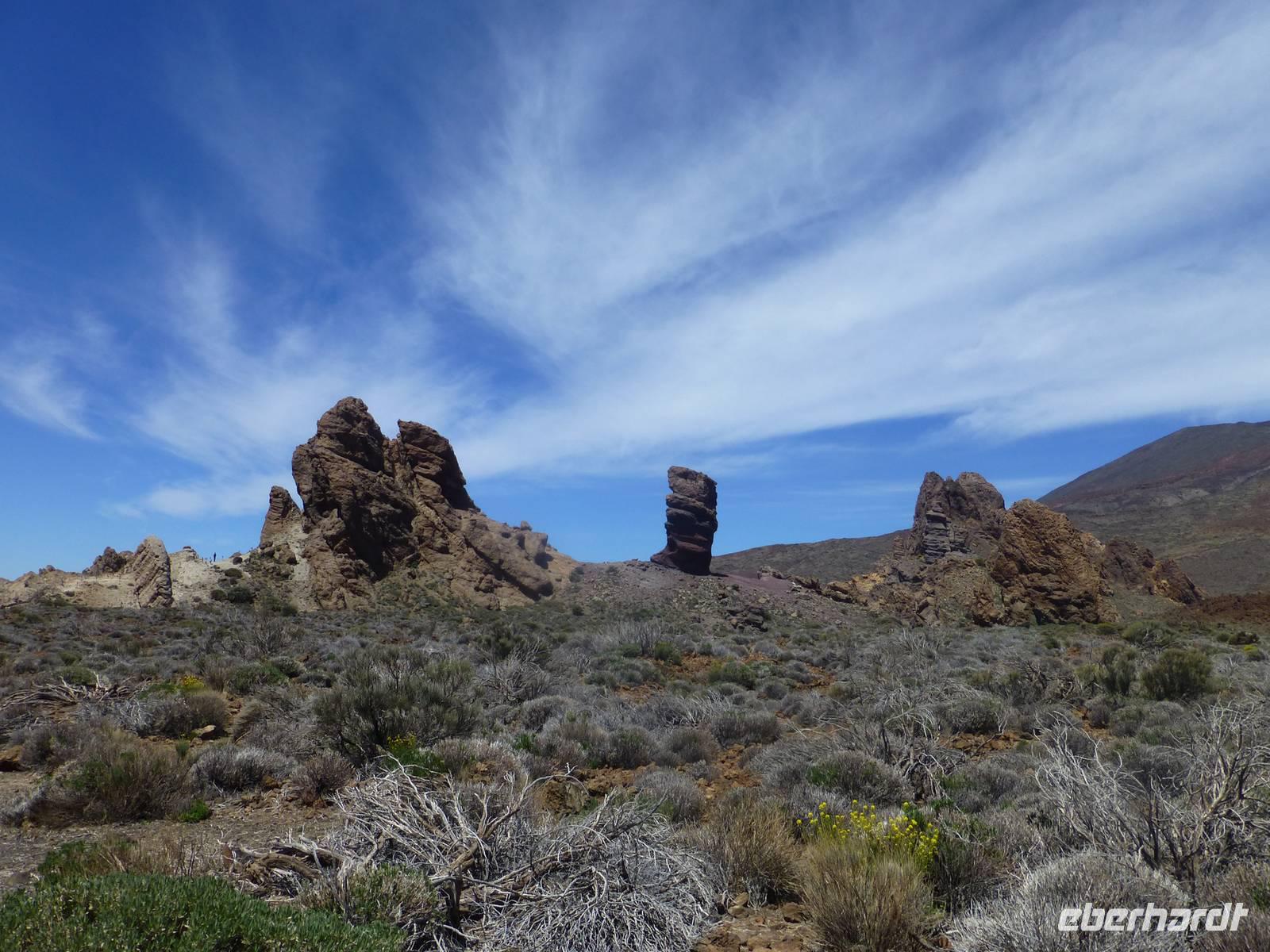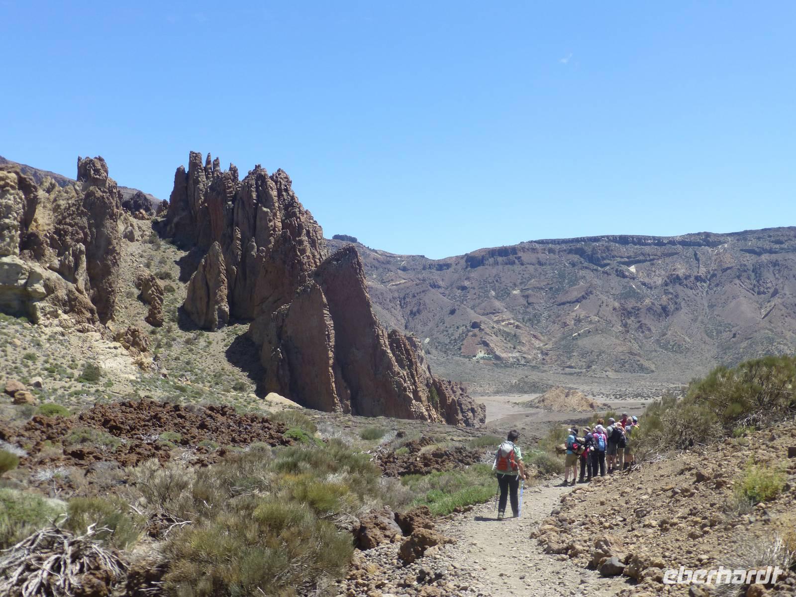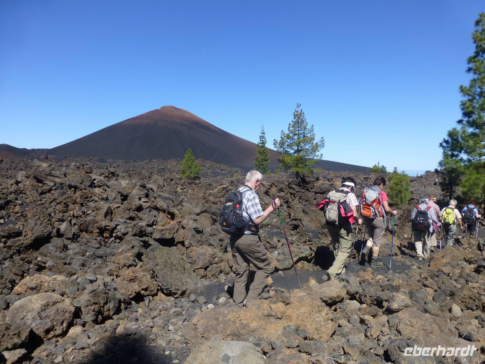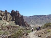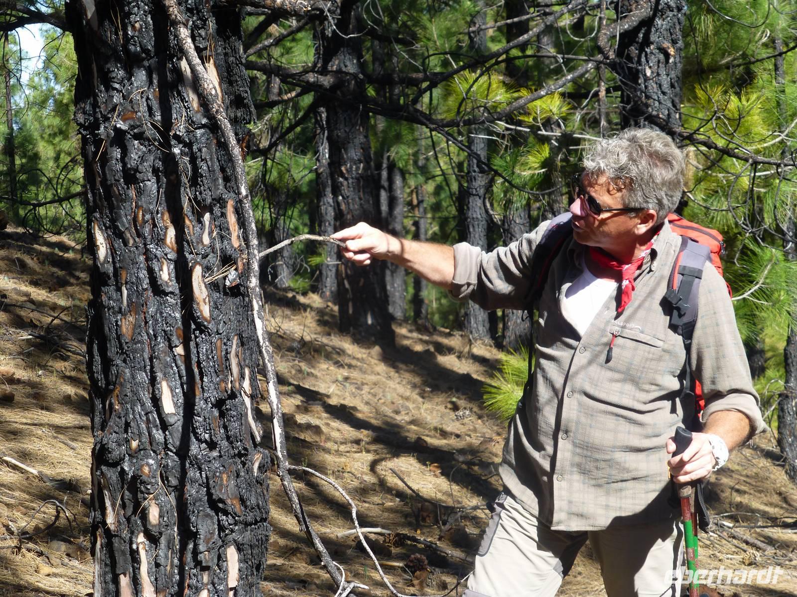 Noch einmal begeben wir uns in den Teide-Nationalpark, nur dass wir uns heute erst dem alten Teide „Pico Viejo" und dann dem jüngsten Vulkan der Insel, dem „Chinyero", widmen. Mit etwas Phantasie erkennt man in den grotesken Felsformationen Hexen, Schuhe und Bären ! Auch heute sehen wir die verschiedenen Ausprägungen der Lava: die krümelige „AA-Lava" einerseits und die Stricklava oder „Pahoehoe-Lava" andererseits. Bei der leichten Wanderung durch den schwarzen Lava-Sand können wir die Natur intensiv genießen. Zwischen den feuerresistenten Kanarenkiefern blühen Aphrodil-Lilien, Katzenminze und Braunwurz. Später gesellen sich auch Erika-Baumheide und leuchtend gelber Kanaren-Hahnenfuß hinzu.