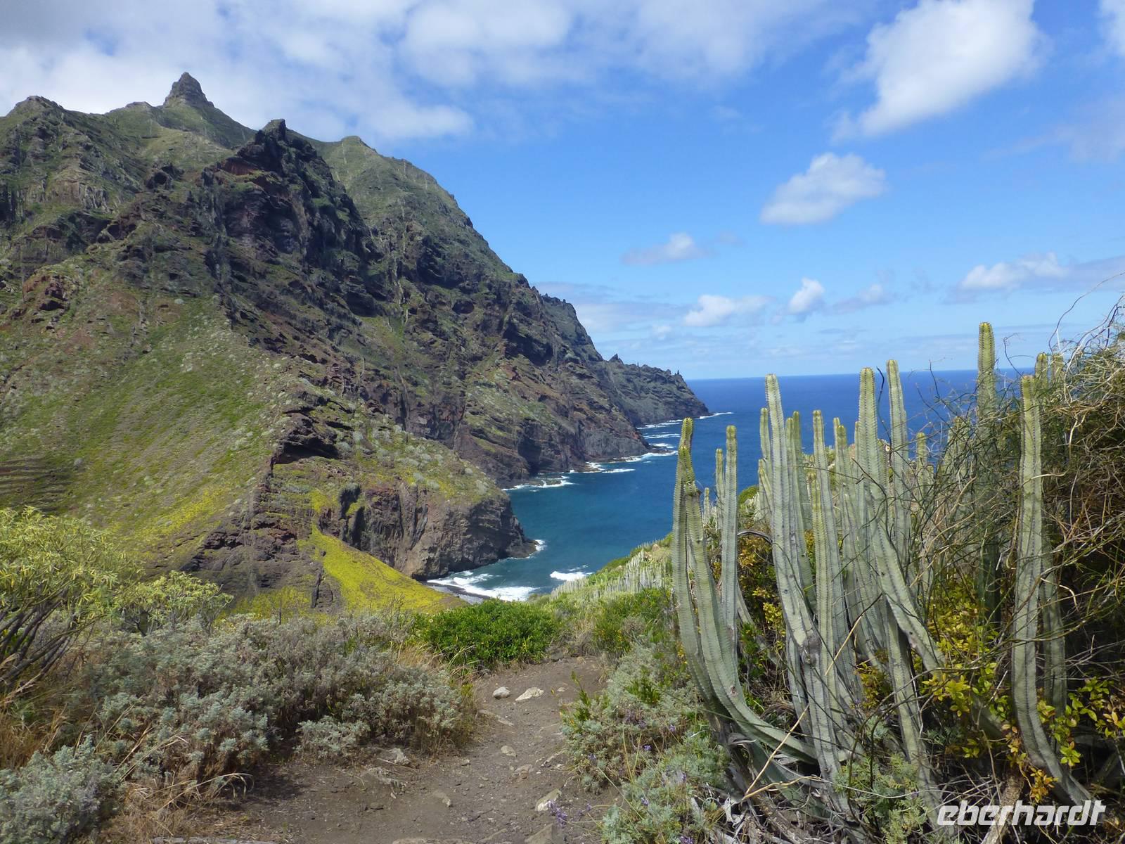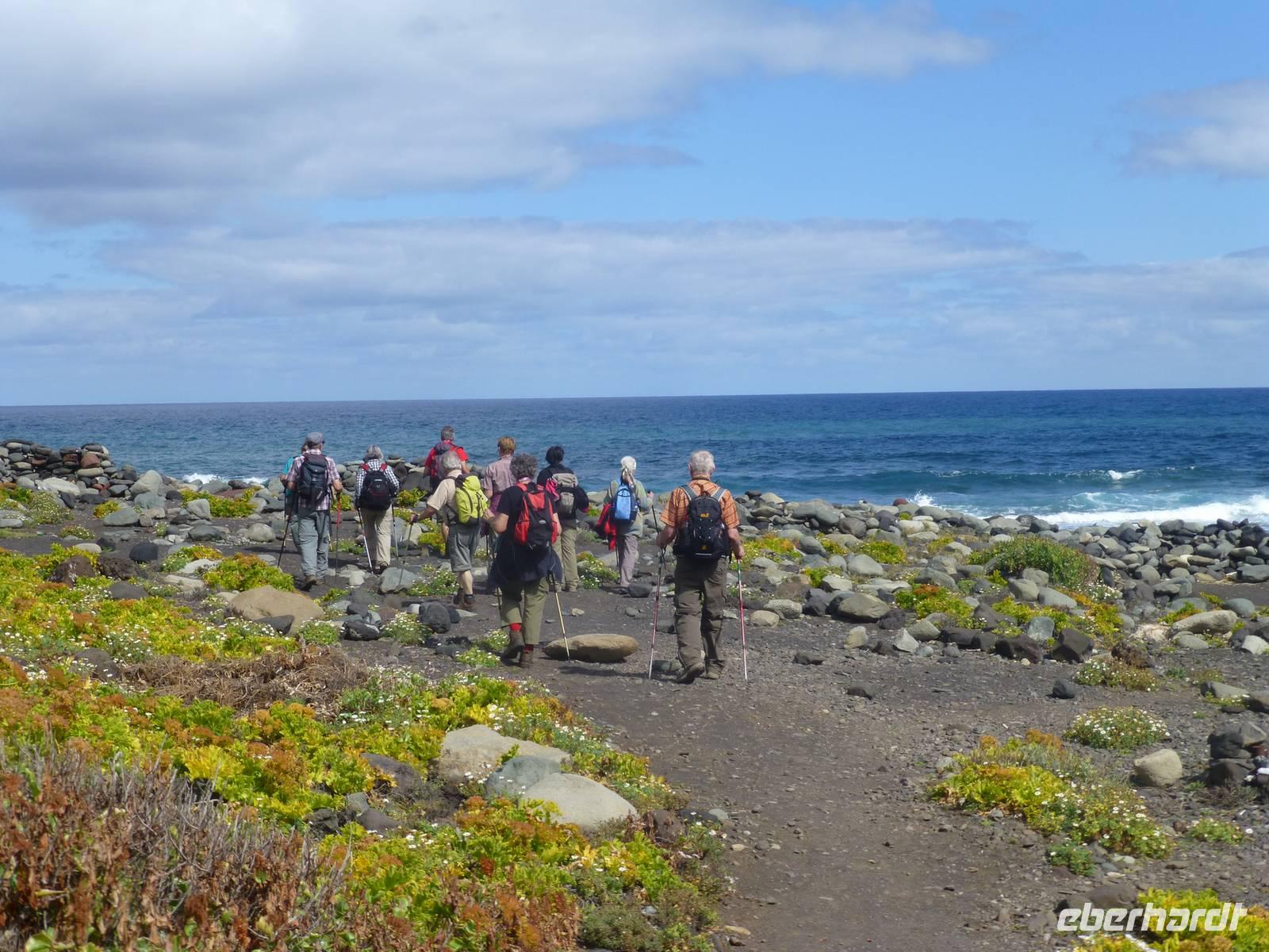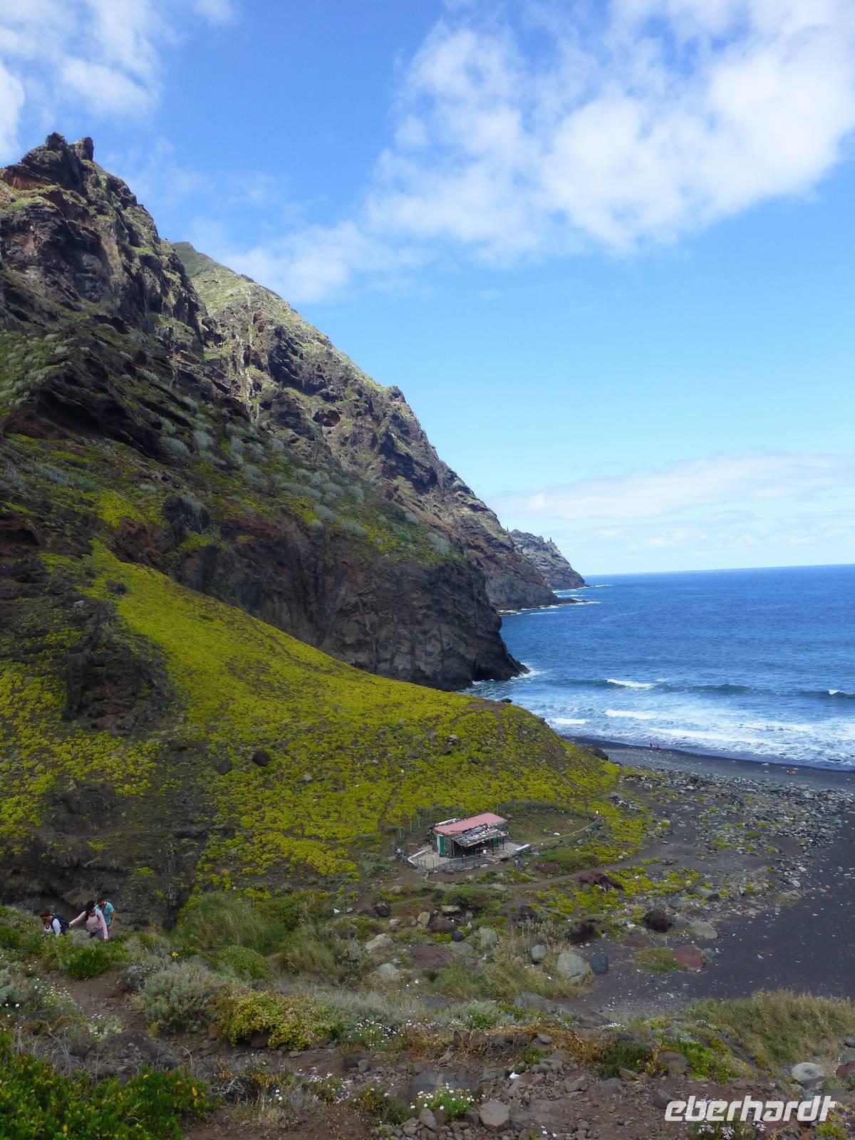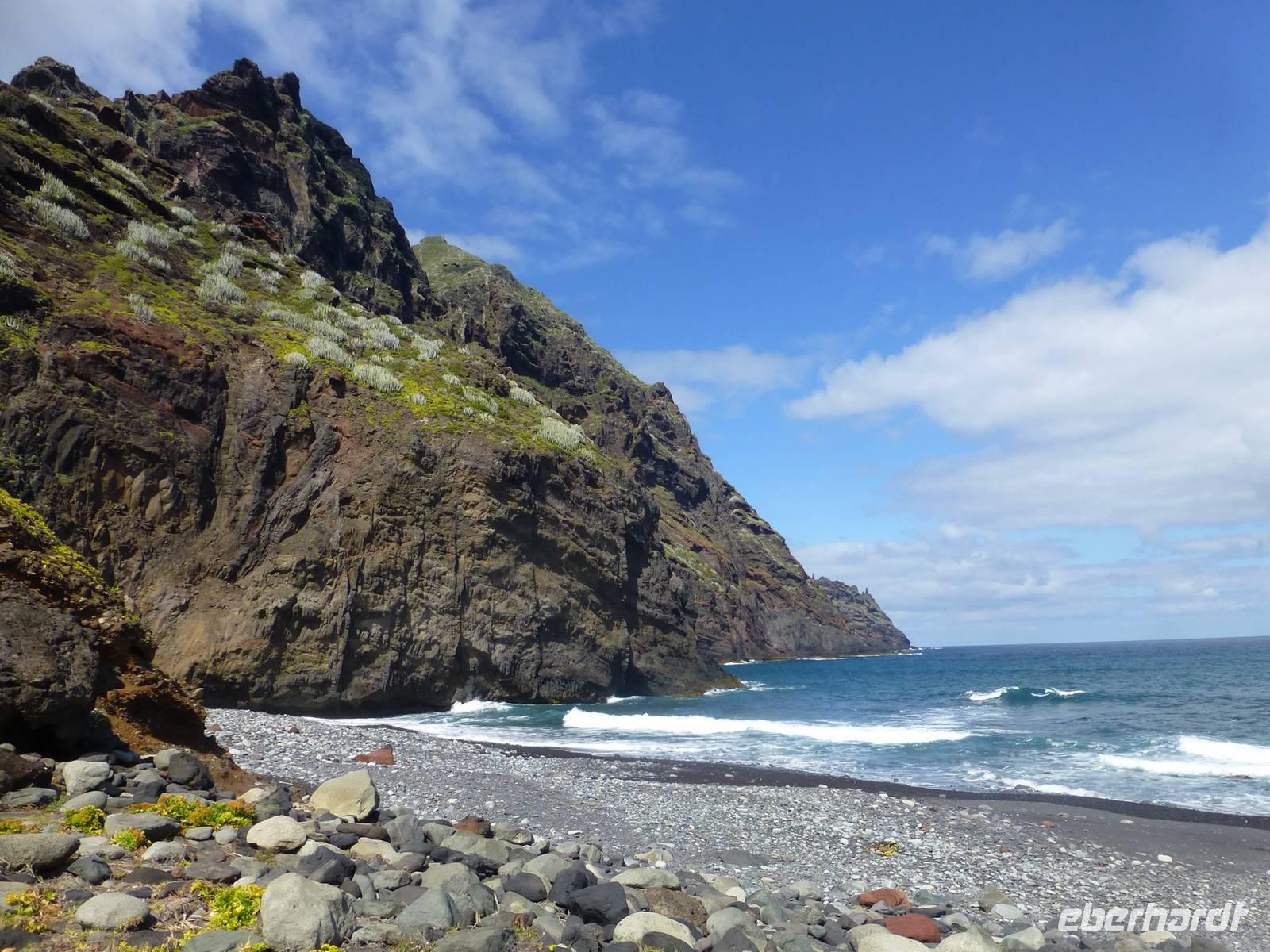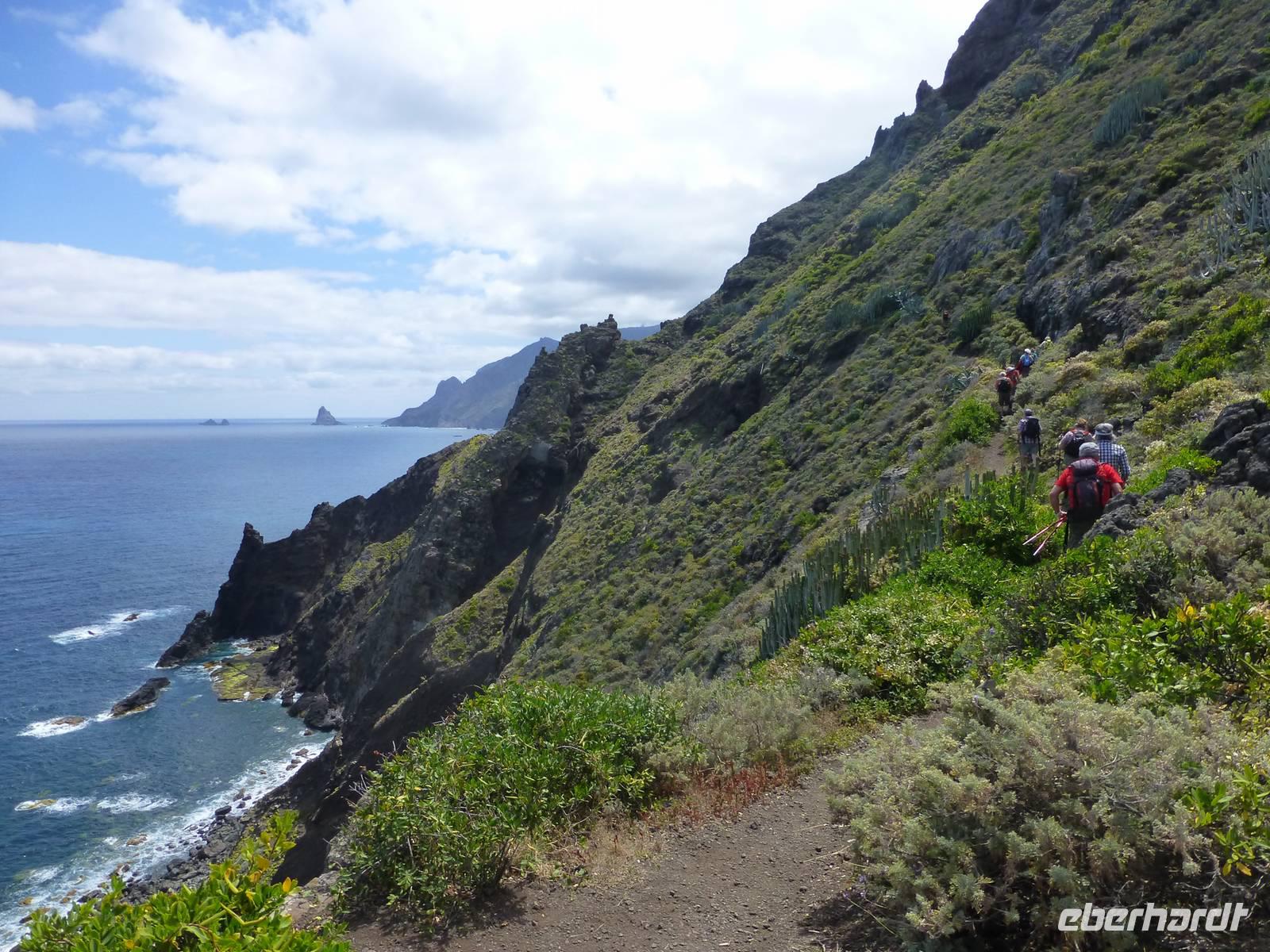 Heute werden (leider schon) zum letzten Mal die Wanderschuhe geschnürt. Mit dem Bus fahren wir über La Laguna in das Anaga-Gebirge im Osten der Insel. In dieser ländlichen Gegend scheint die Welt irgendwie stehen geblieben zu sein. Die Menschen leben hier noch unter sehr einfachen Bedingungen - die steilen Felswände werden durch Terrassen urbar gemacht und die kleinen Häuser schmiegen sich an die schroffen Berghänge. Vom Dörfchen Afur wandern wir durch die Schlucht hinab zum felsigen Strand „Playa del Tamadite". Unterwegs sehen wir die verschiedenen Gesteinsformen, die über Jahrmillionen die Landschaft geprägt haben. Verschiedene Wolfsmilch- und Dickblattgewächse finden selbst auf dem felsigen Untergrund Halt. Bei einem Picknick am Strand lauschen wir dem Meeresrauschen. Auch der letzte Wandertag unserer Reise beschert uns wieder perfektes Wetter mit Sonnenschein und blauem Himmel. Weiter führt der Weg im Auf und Ab entlang der fantastischen Küste. Der Blick aufs tiefblaue Meer, auf die abwechslungsreiche Flora und die wilde Küstenlandschaft ist ein Genuss! Unser Ziel ist das Fischerdorf Taganana, wo wir uns eine Erfrischung in einer Bar genehmigen. Als kleinen „Bonus" legen wir noch einen Stopp in San Andrés ein. Die Attraktion des Ortes ist der lang gezogene goldgelbe Sandstrand „Playa de las Teresitas", der zum Baden einlädt. Durch die Inselhauptstadt Santa Cruz fahren wir schließlich zurück zu unserem Hotel und verabschieden uns von unserem Reiseleiter Othmar, der uns mit einer guten Portion Wissen und Humor durch die herrlichen Landschaften Teneriffas geführt hat.