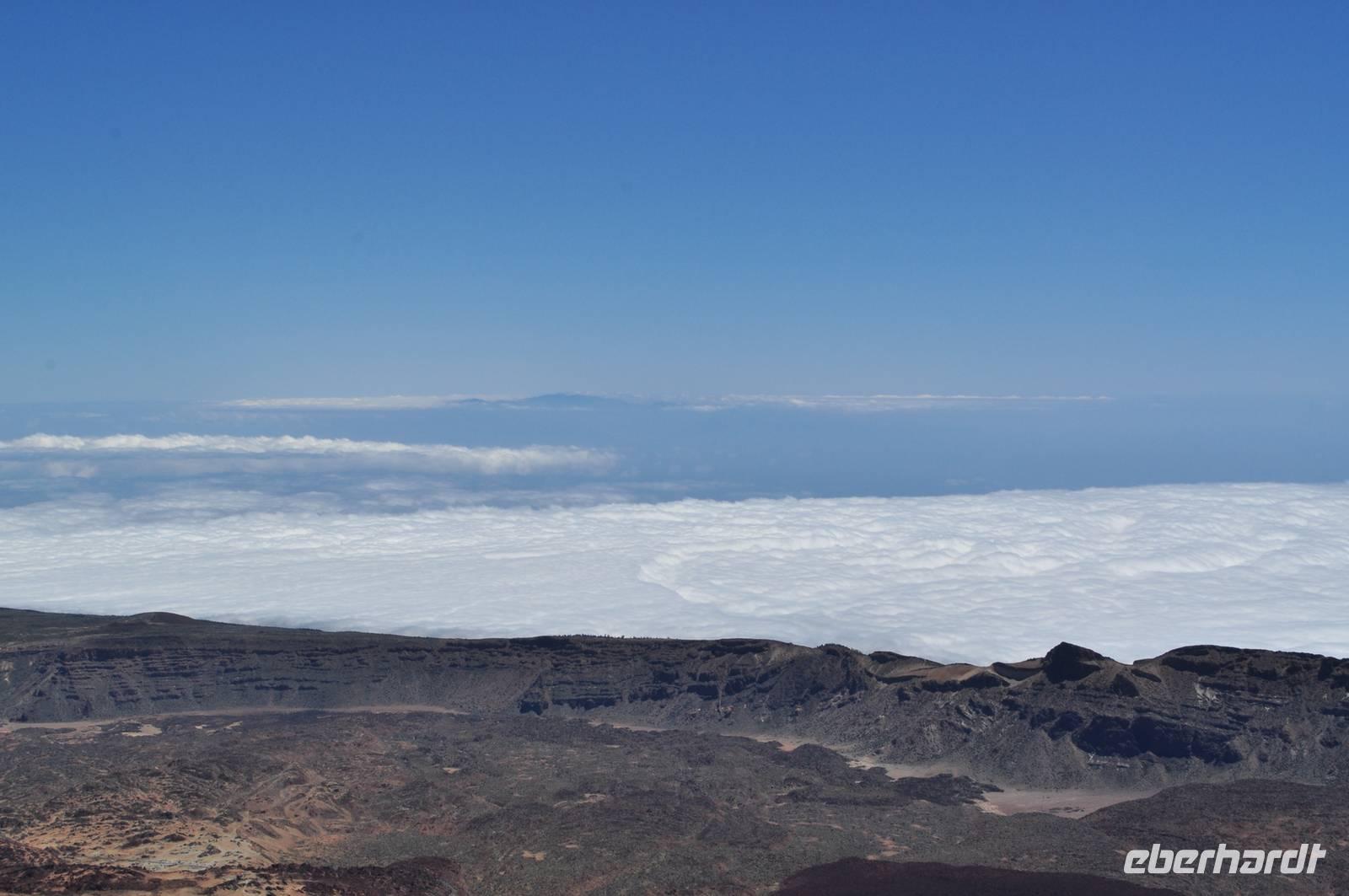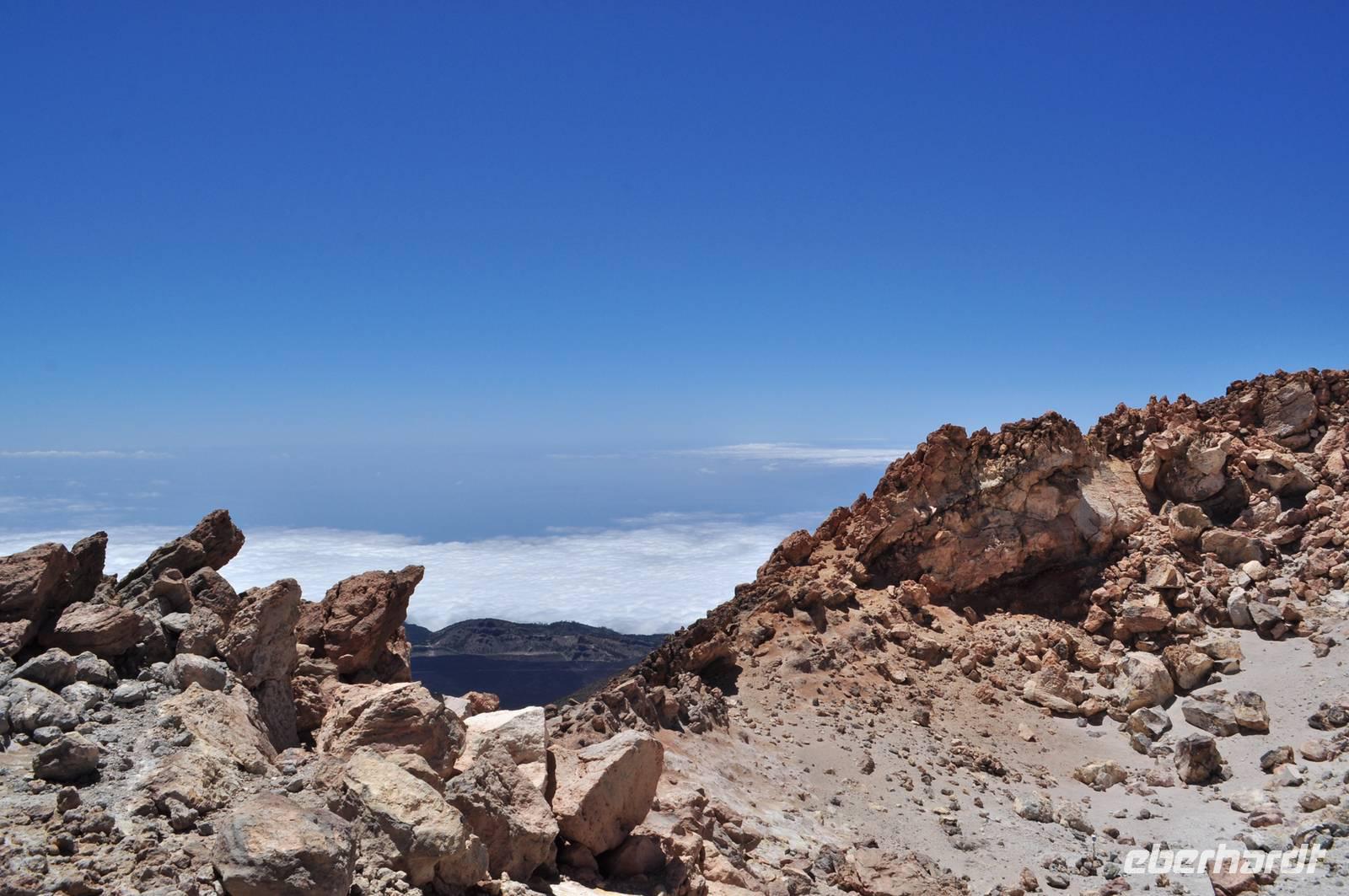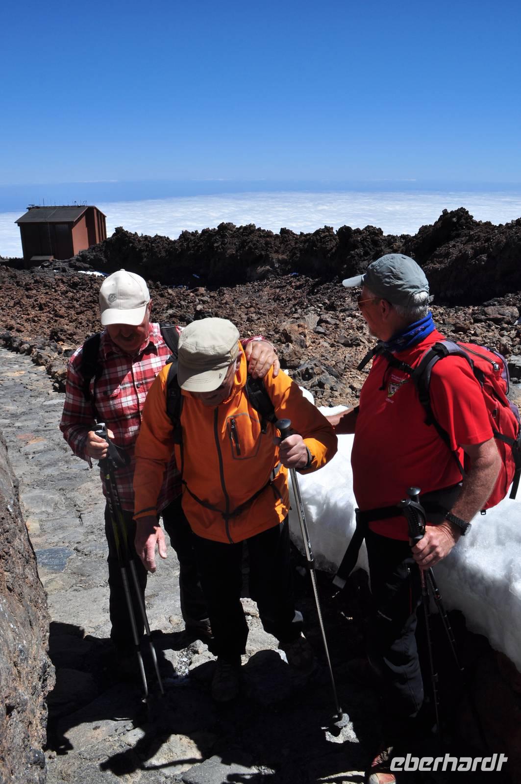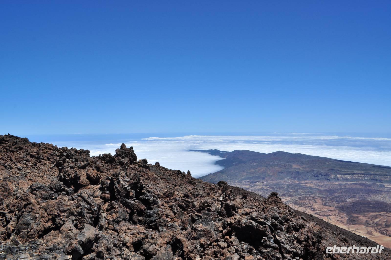 Es folgte das glückliche Gipfelfoto in 3.718 m Höhe. Über uns strahlendblauer Himmel. Das dichte Wolkenmeer des Passats lag gut 2.000 m tiefer, ein atemberaubender Blick über den Archipel der Kanaren und sicher ein unvergesslicher Augenblick für jeden von uns.