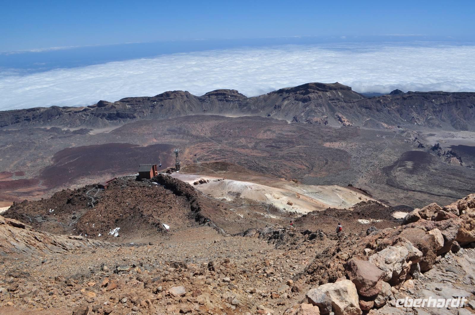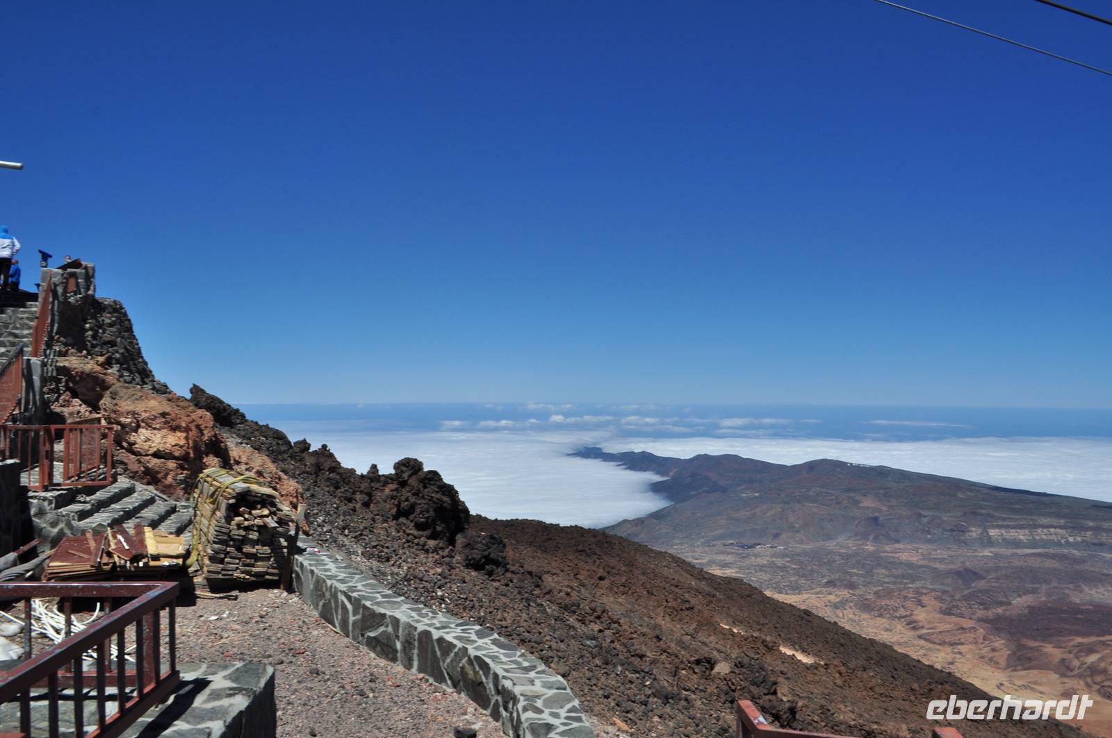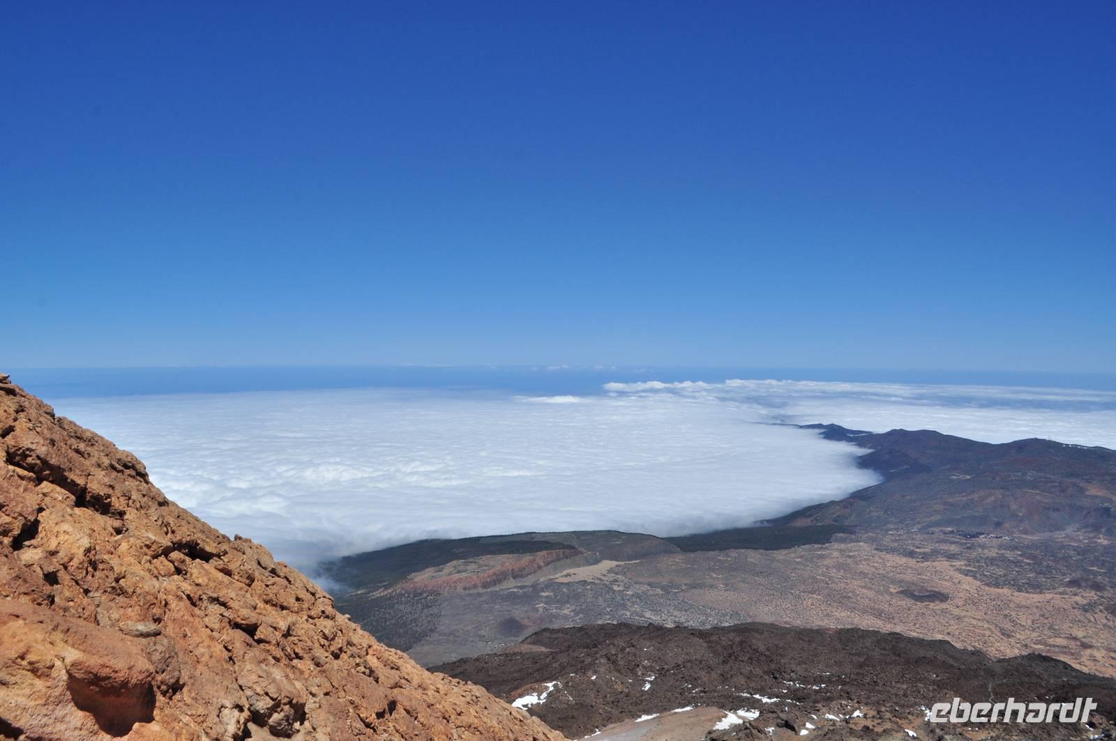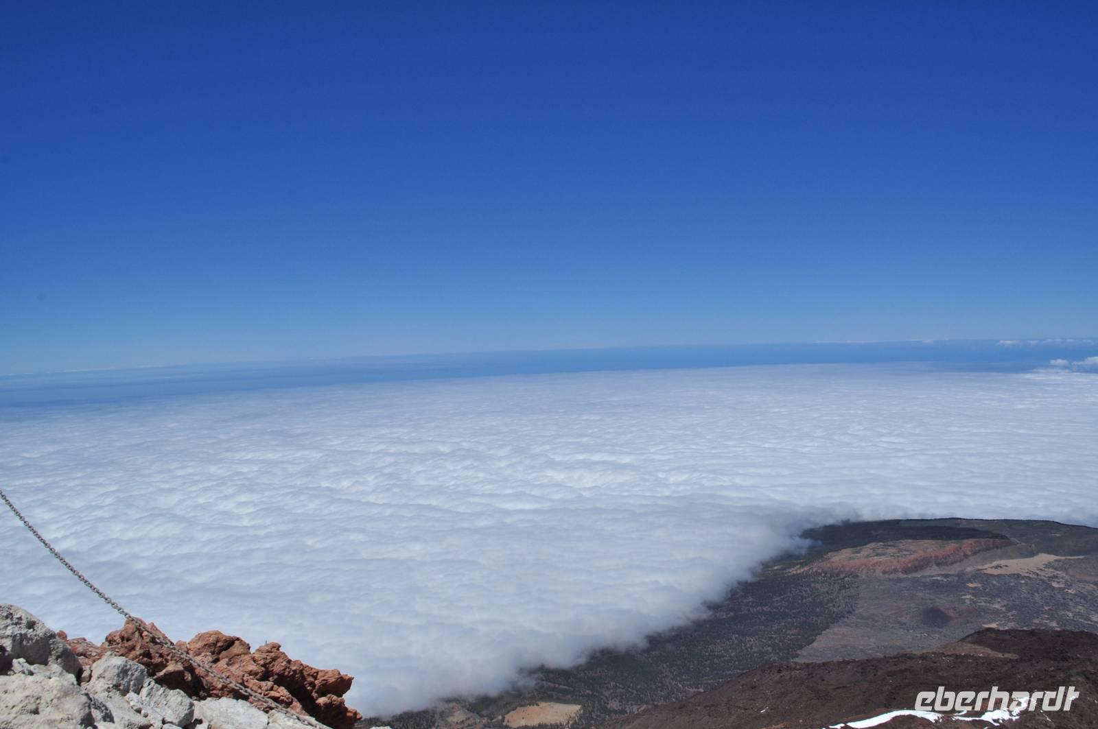 Es folgte das glückliche Gipfelfoto in 3.718 m Höhe. Über uns strahlendblauer Himmel. Das dichte Wolkenmeer des Passats lag gut 2.000 m tiefer, ein atemberaubender Blick über den Archipel der Kanaren und sicher ein unvergesslicher Augenblick für jeden von uns.