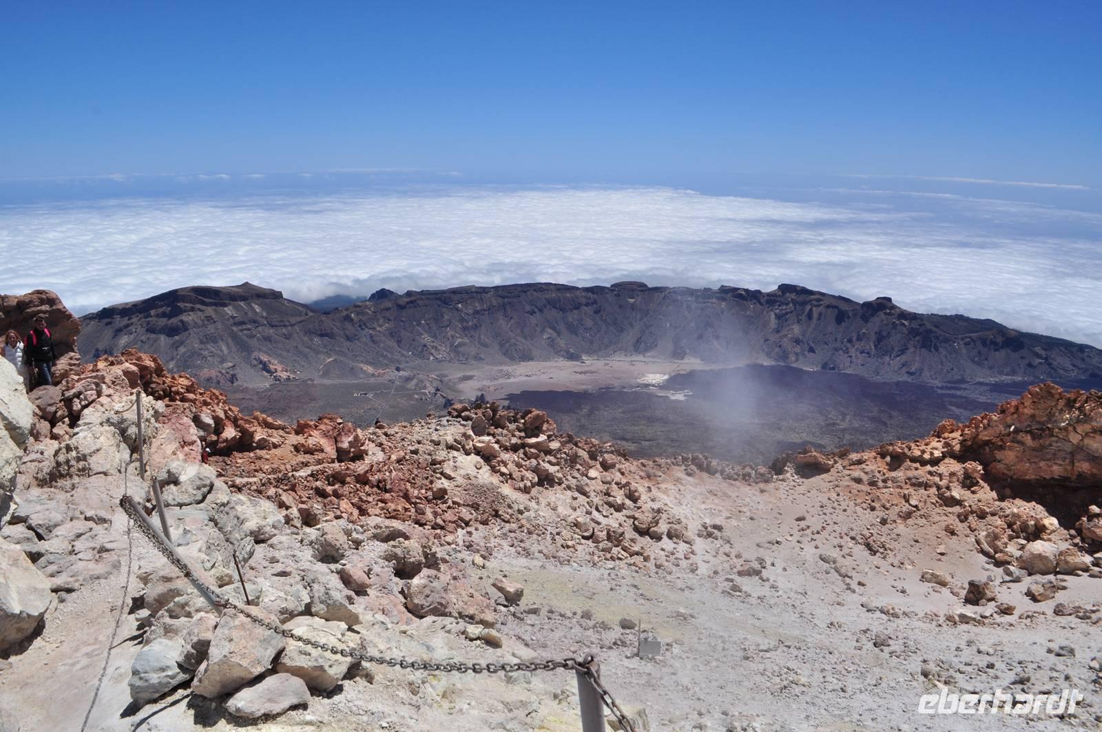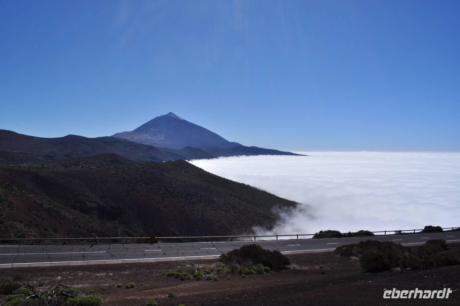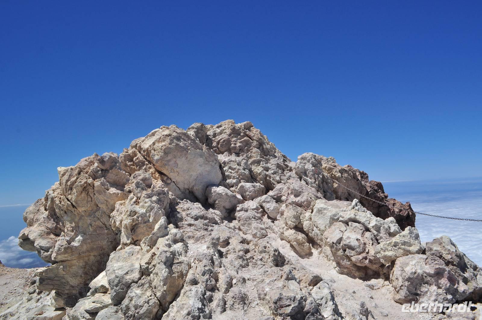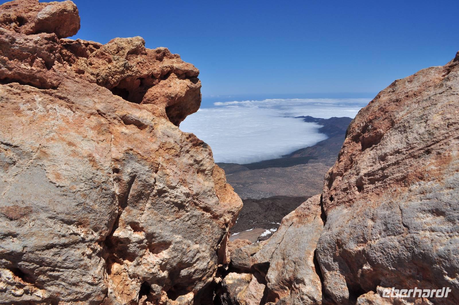 Es folgte das glückliche Gipfelfoto in 3.718 m Höhe. Über uns strahlendblauer Himmel. Das dichte Wolkenmeer des Passats lag gut 2.000 m tiefer, ein atemberaubender Blick über den Archipel der Kanaren und sicher ein unvergesslicher Augenblick für jeden von uns.