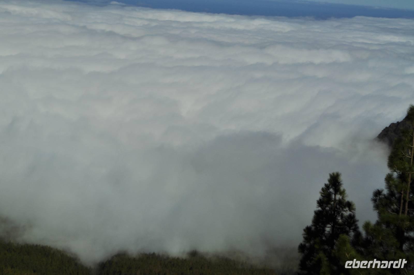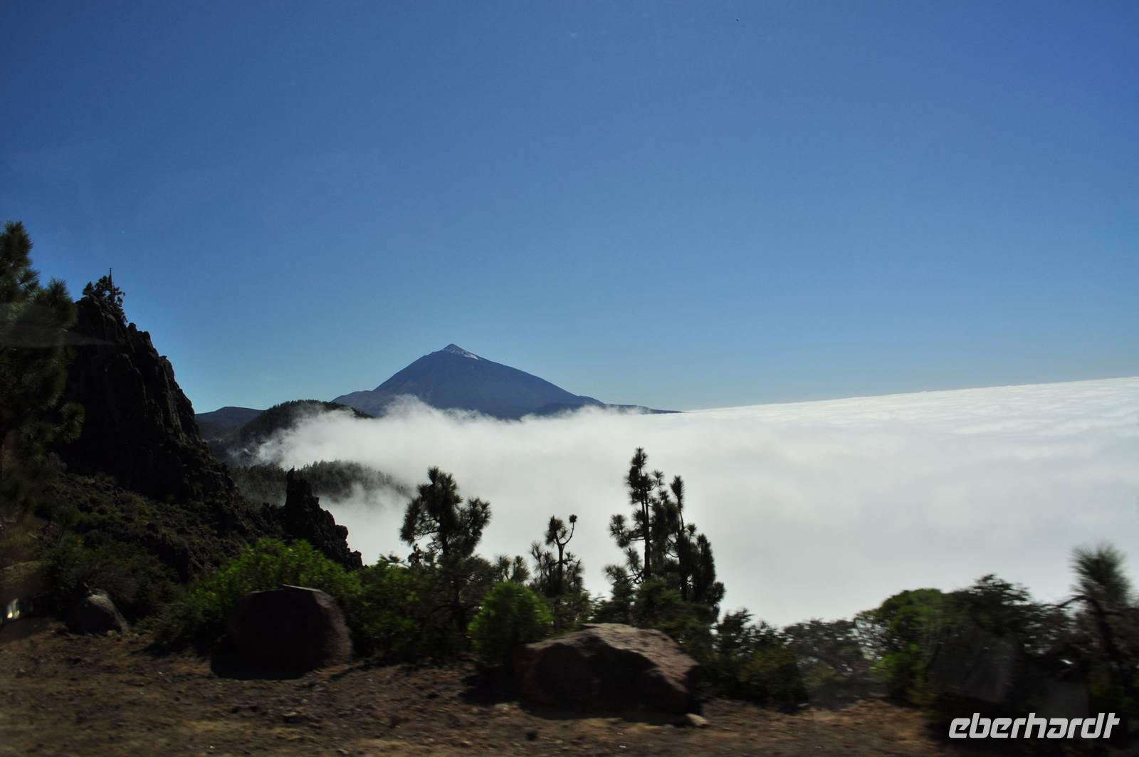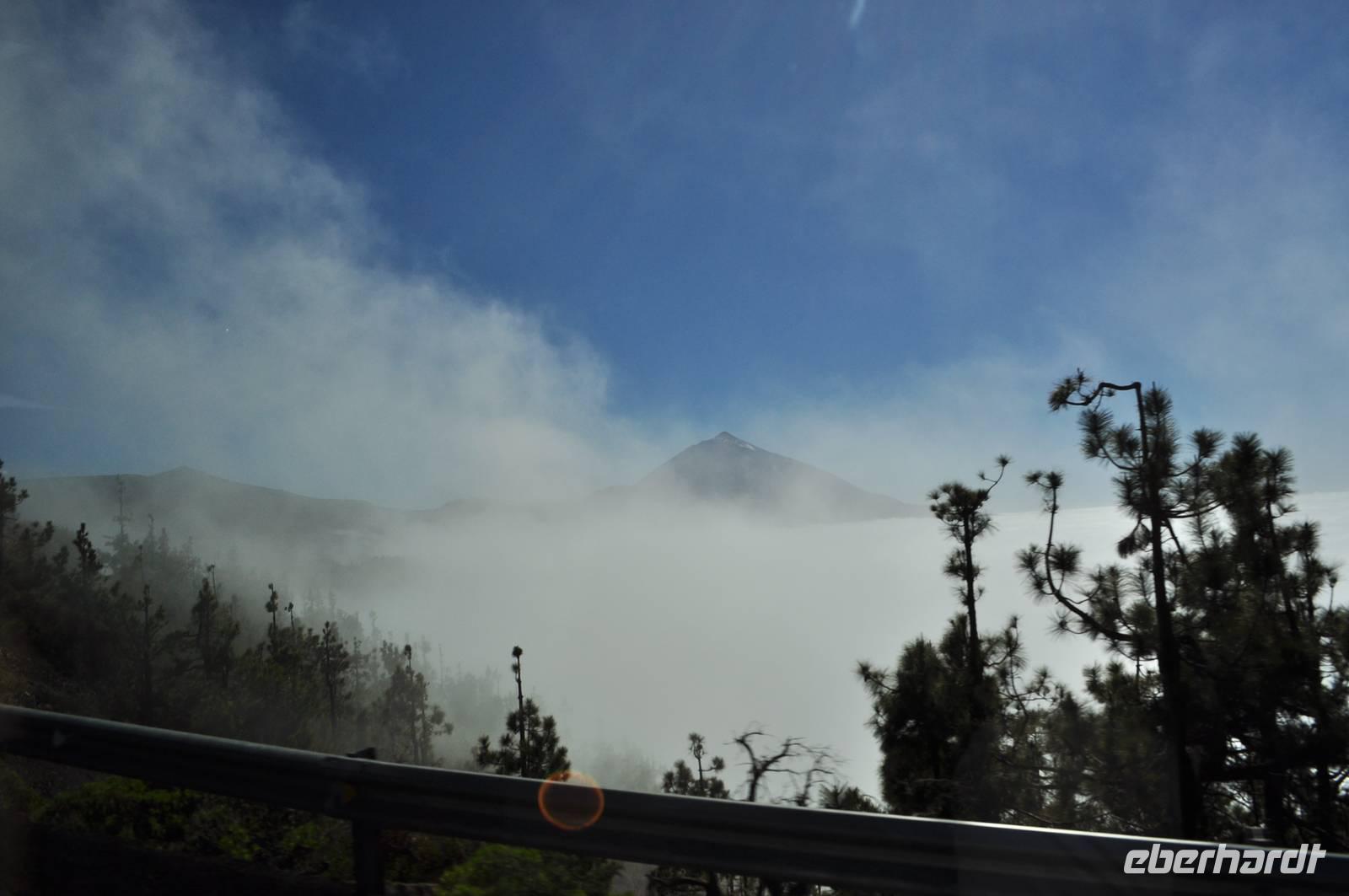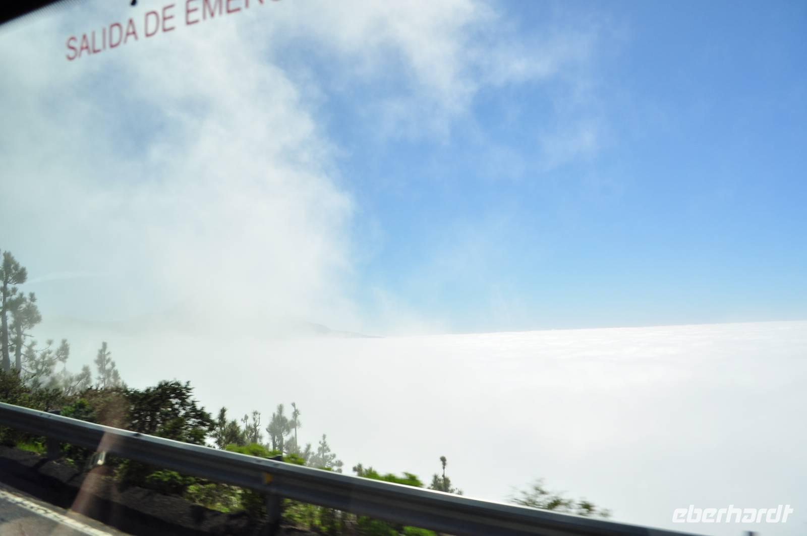 Auf der Rückfahrt verabschiedete sich der Teide nochmal von seiner schönsten Seite. Der spitze Kegel mit dem darunterliegenden Wolkenmeer. Ebenso ein atemberaubendes Bild in der Nähe der astronomischen Sonnenobservatorien am Nordrand der Caldera. Bei gut 1.700m Höhe tauchen wir im Pinienwald in das Nebelmeer aus Wolken ein. Anscheinend verließen wir wieder das Reich der Götter um auf das Irdische zurück zu kehren. Über La Laguna ging es zurück nach Puerto de la Cruz.