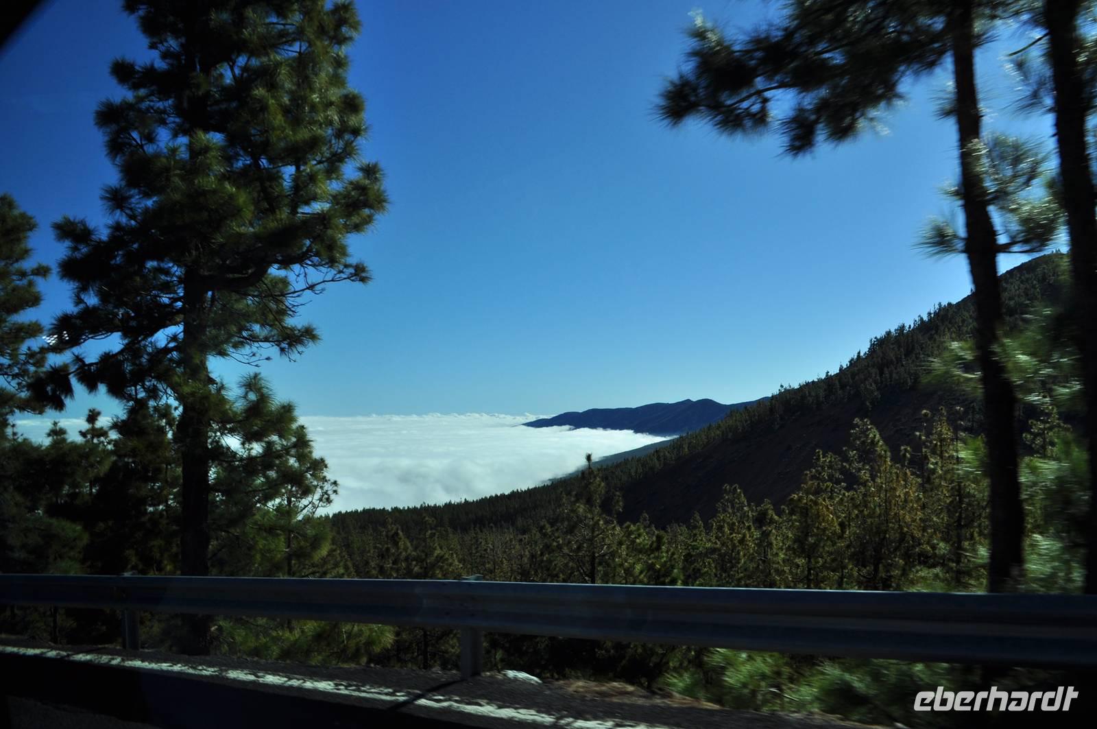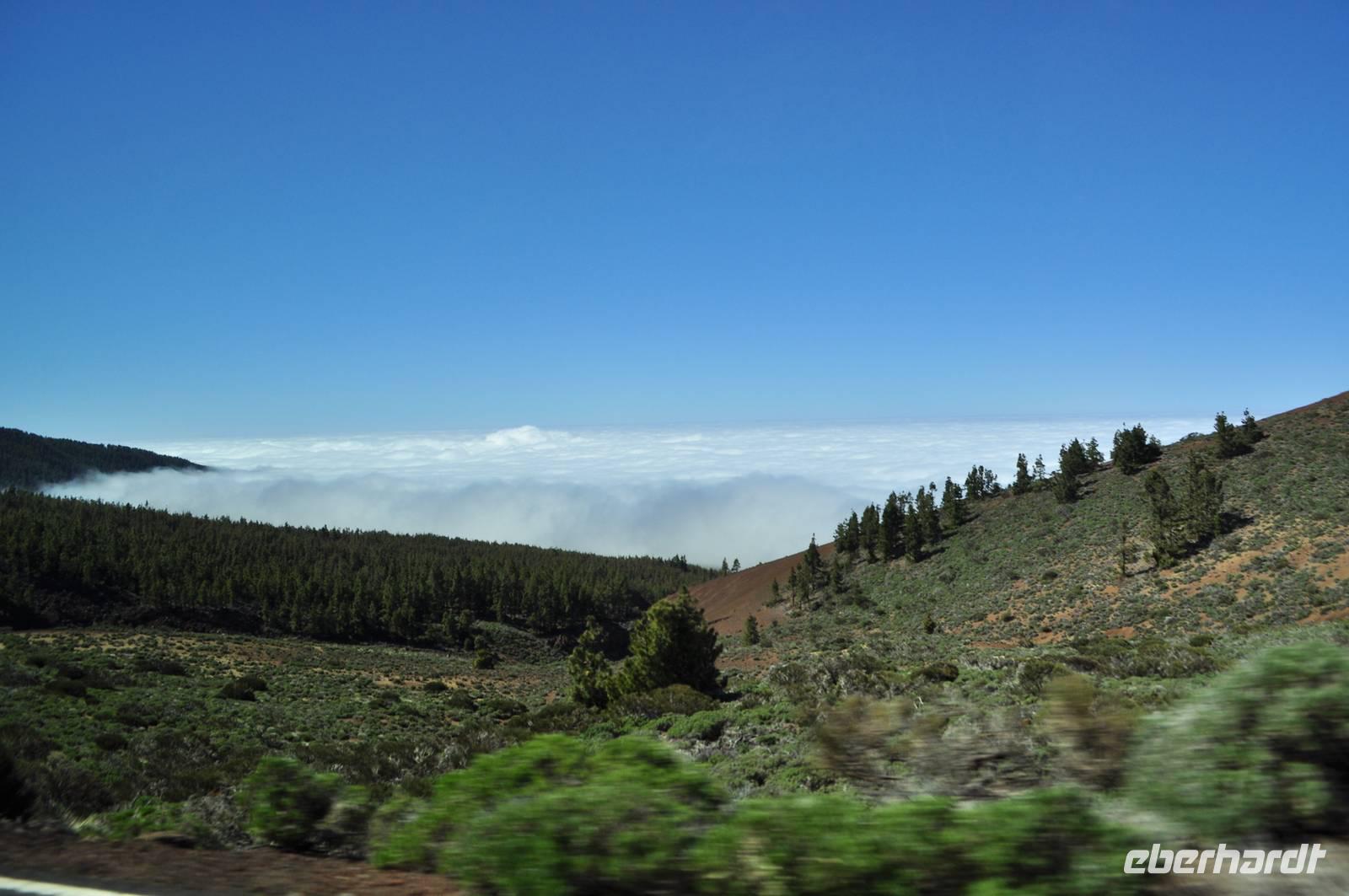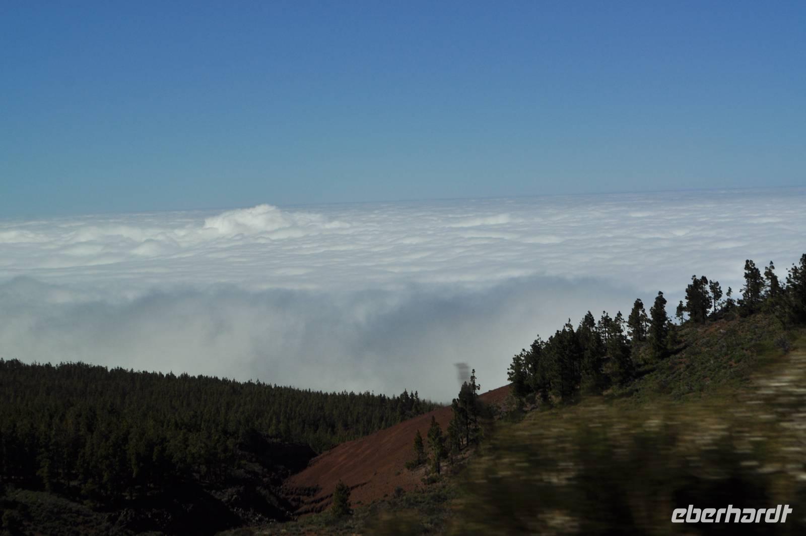 Auf der Rückfahrt verabschiedete sich der Teide nochmal von seiner schönsten Seite. Der spitze Kegel mit dem darunterliegenden Wolkenmeer. Ebenso ein atemberaubendes Bild in der Nähe der astronomischen Sonnenobservatorien am Nordrand der Caldera. Bei gut 1.700m Höhe tauchen wir im Pinienwald in das Nebelmeer aus Wolken ein. Anscheinend verließen wir wieder das Reich der Götter um auf das Irdische zurück zu kehren. Über La Laguna ging es zurück nach Puerto de la Cruz.