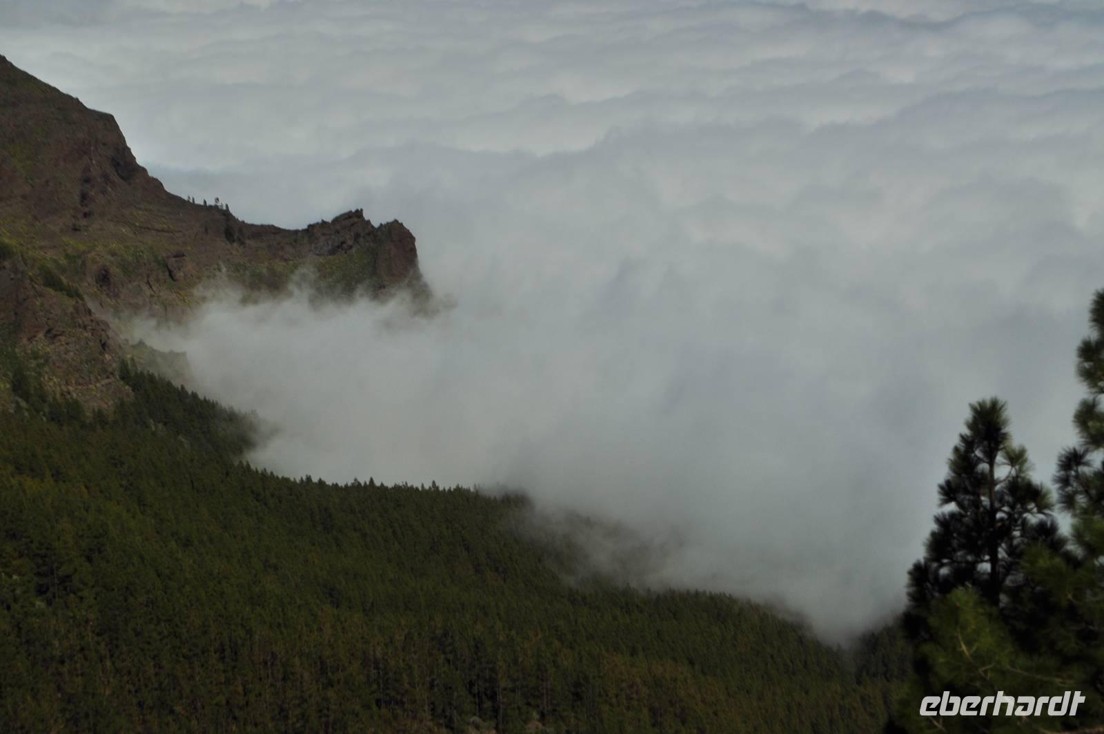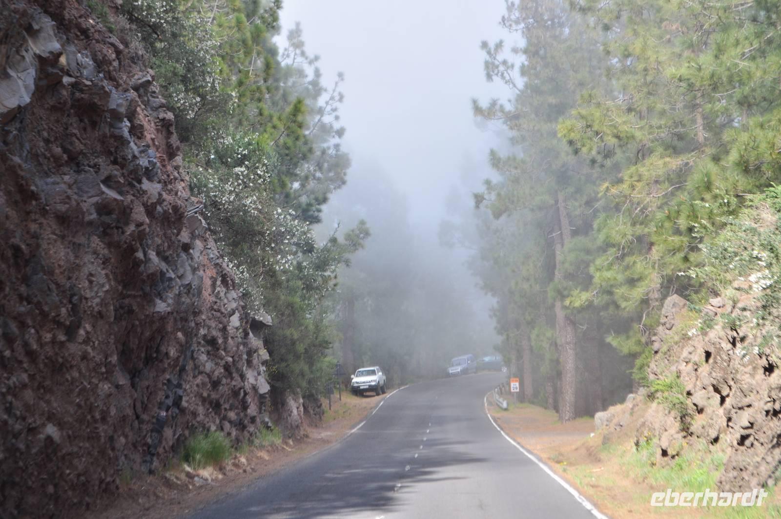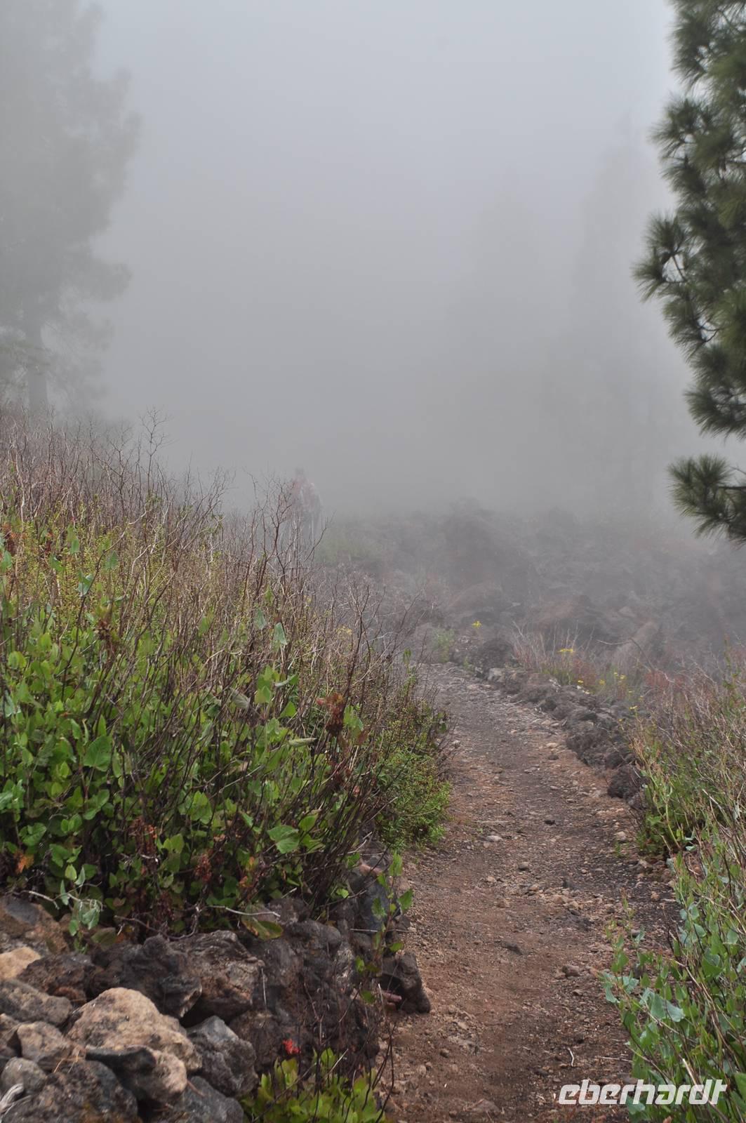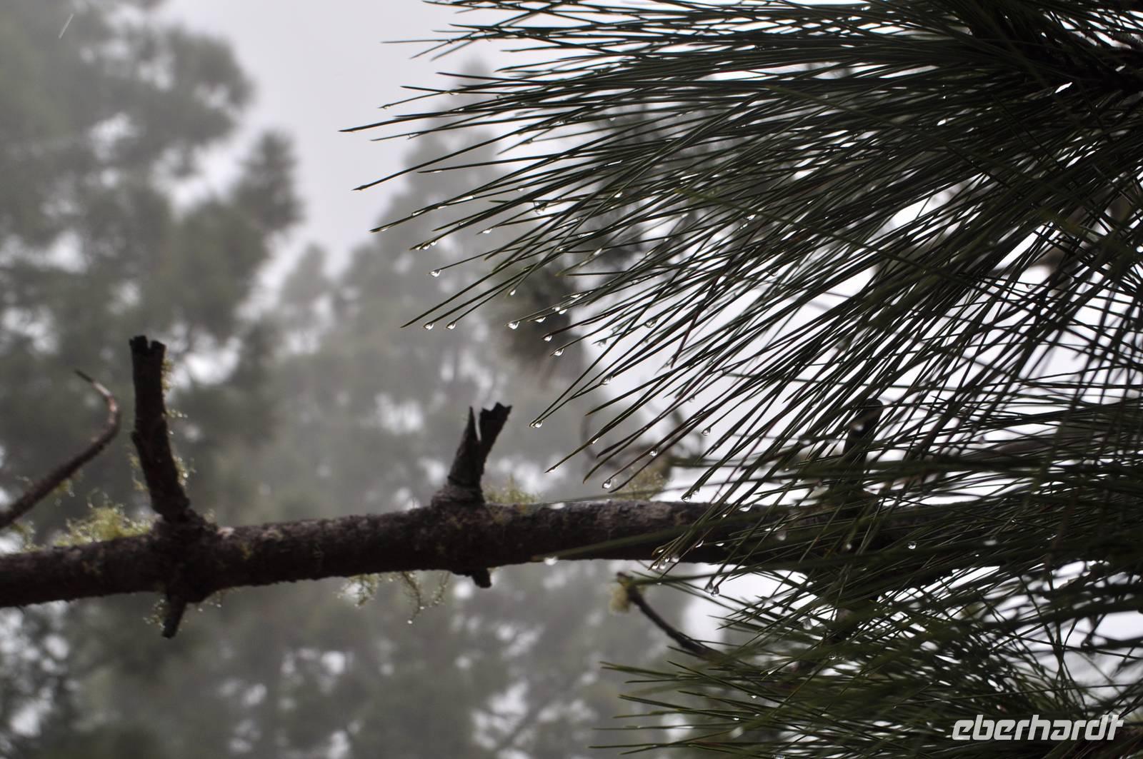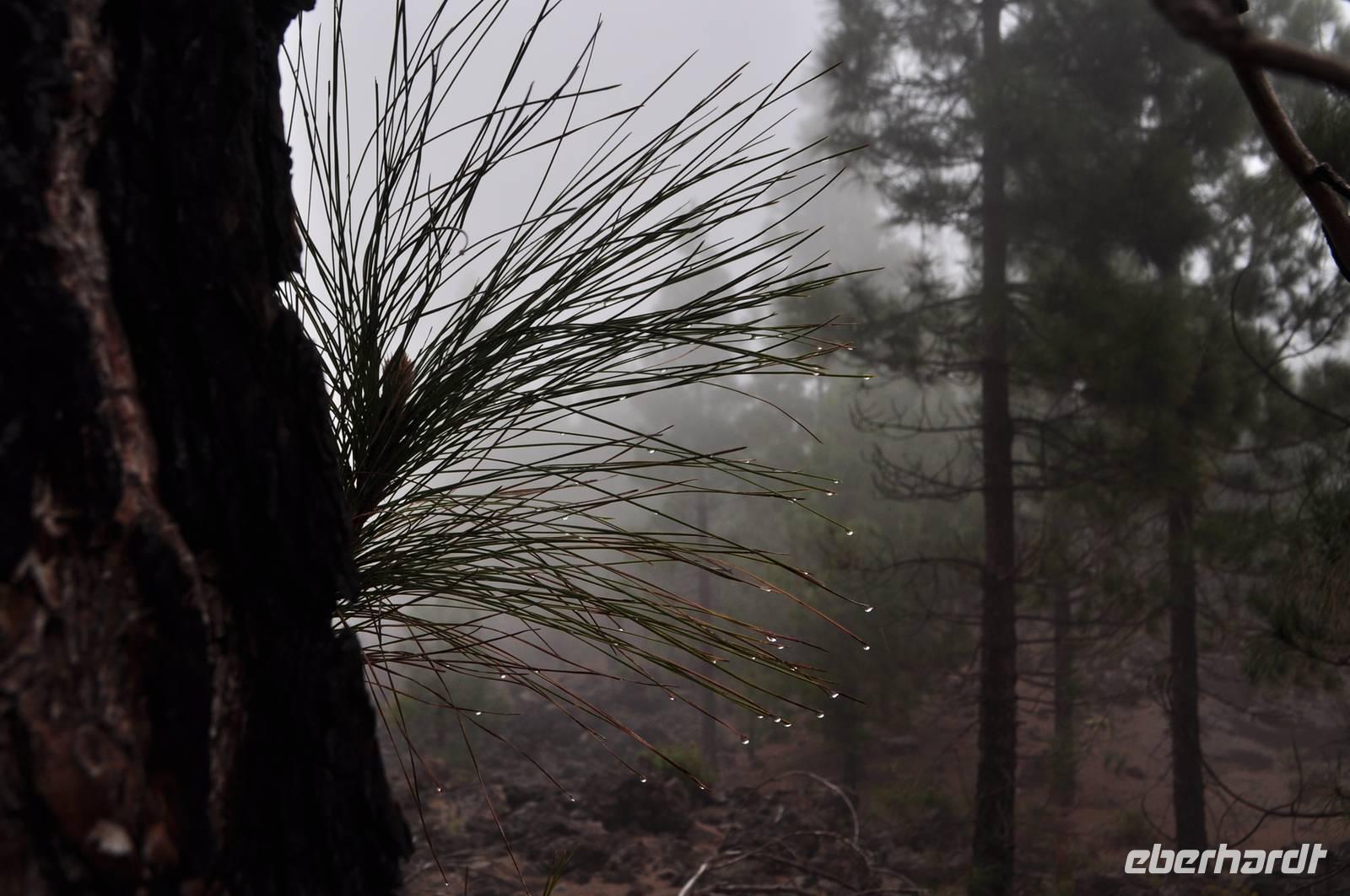 Wir steigen leicht bergab und dringen in den Wolkennebel des Passates ein. Wir können mit eigenen Augen bestaunen, was der Begriff „Horizonatalregen" bedeutet, Kondensation von Nebel an den Pinien und Flechten. Dicke Nebelschwaden ziehen durch den Wald, aber in keinster Weise unangenehm.