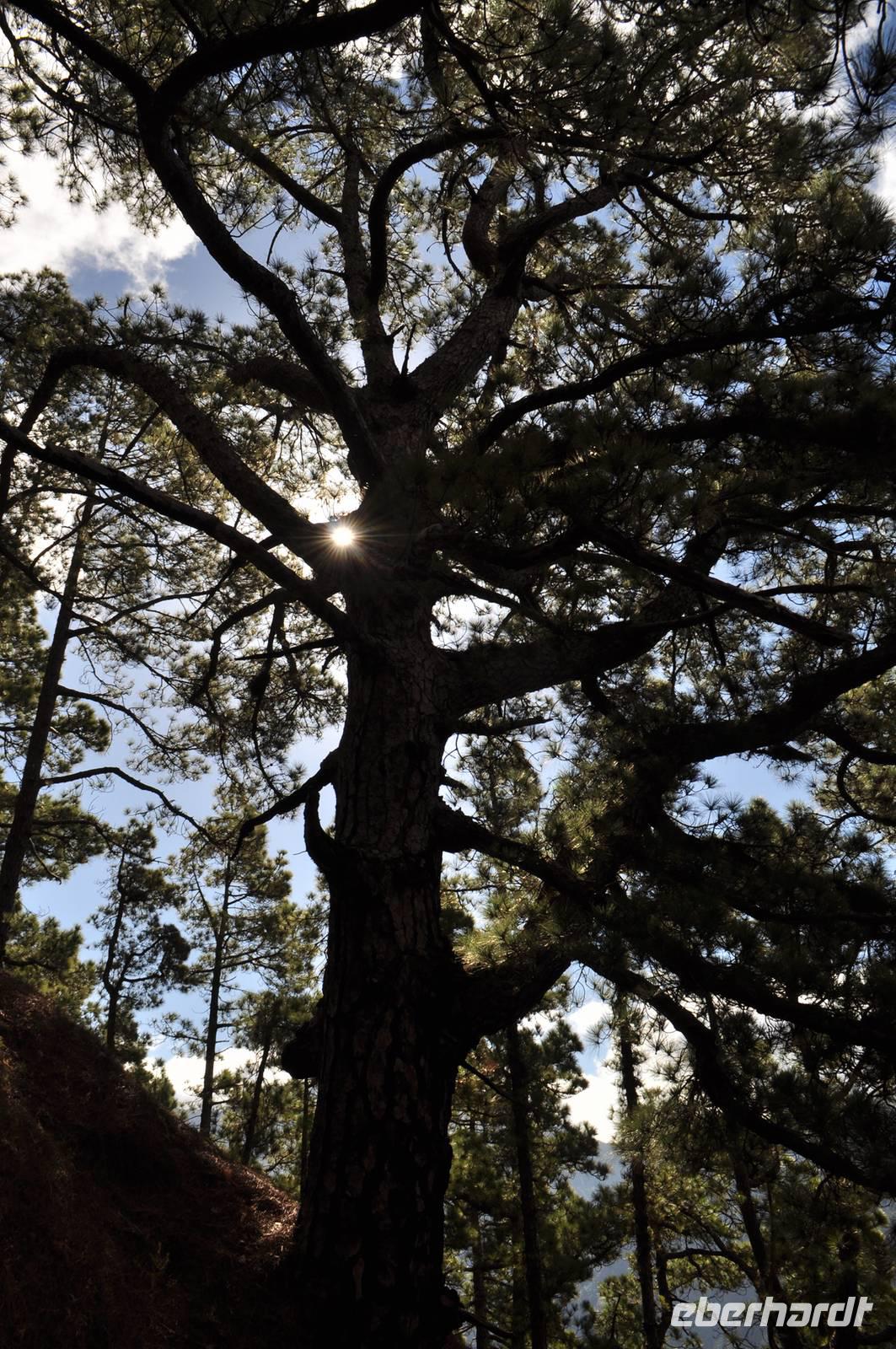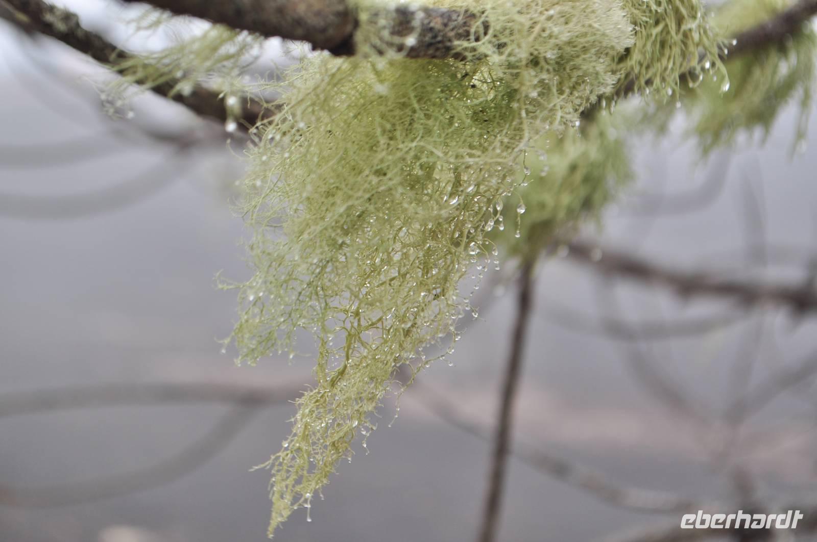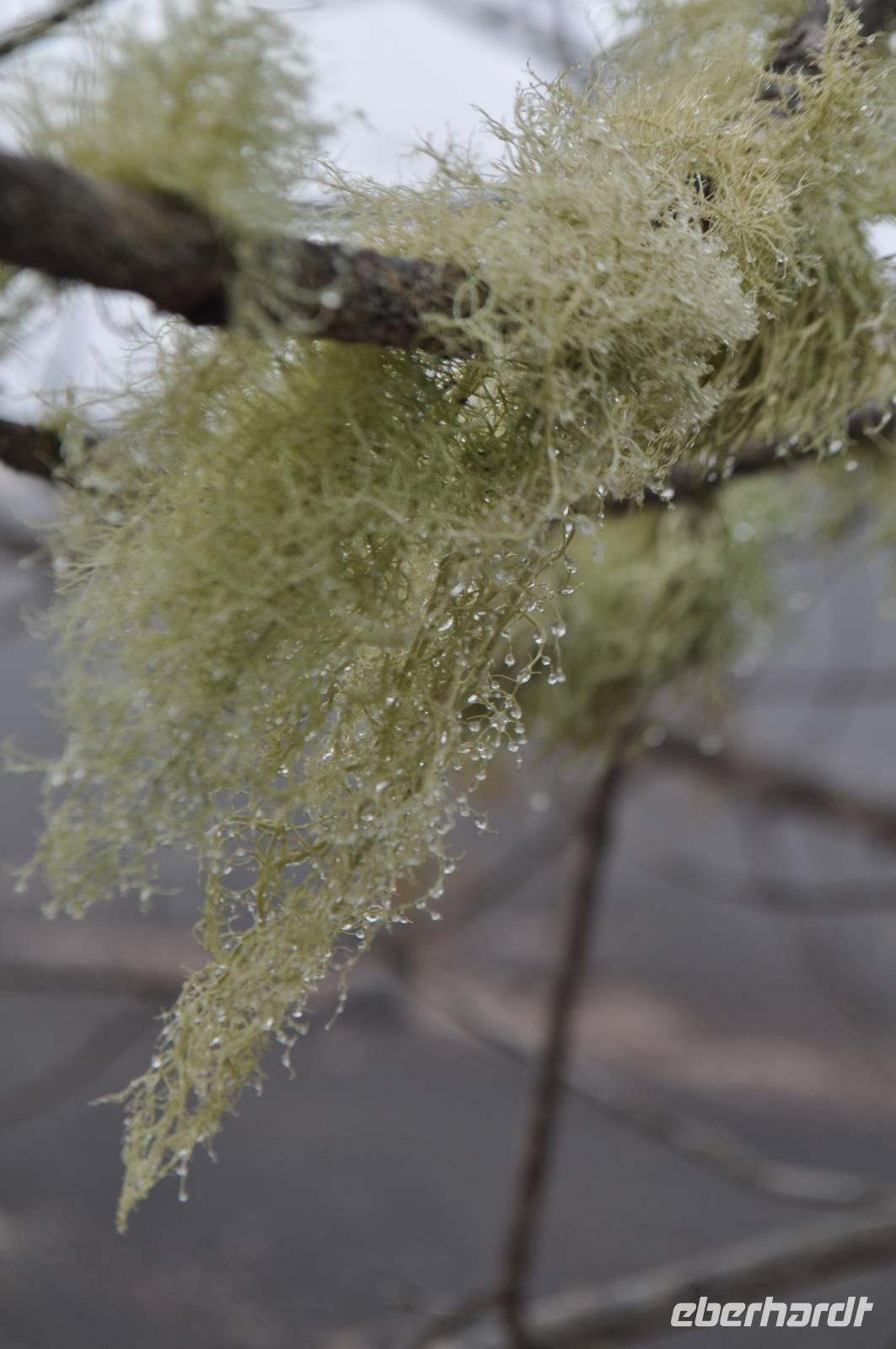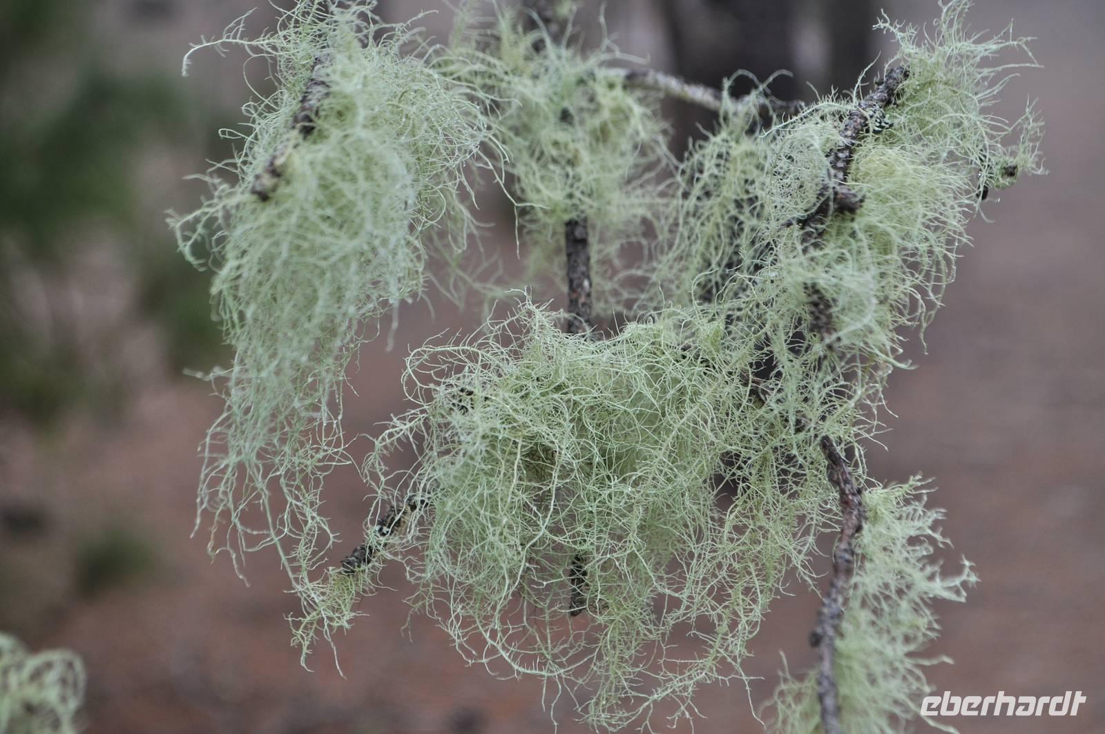 Wir steigen leicht bergab und dringen in den Wolkennebel des Passates ein. Wir können mit eigenen Augen bestaunen, was der Begriff „Horizonatalregen" bedeutet, Kondensation von Nebel an den Pinien und Flechten. Dicke Nebelschwaden ziehen durch den Wald, aber in keinster Weise unangenehm.
