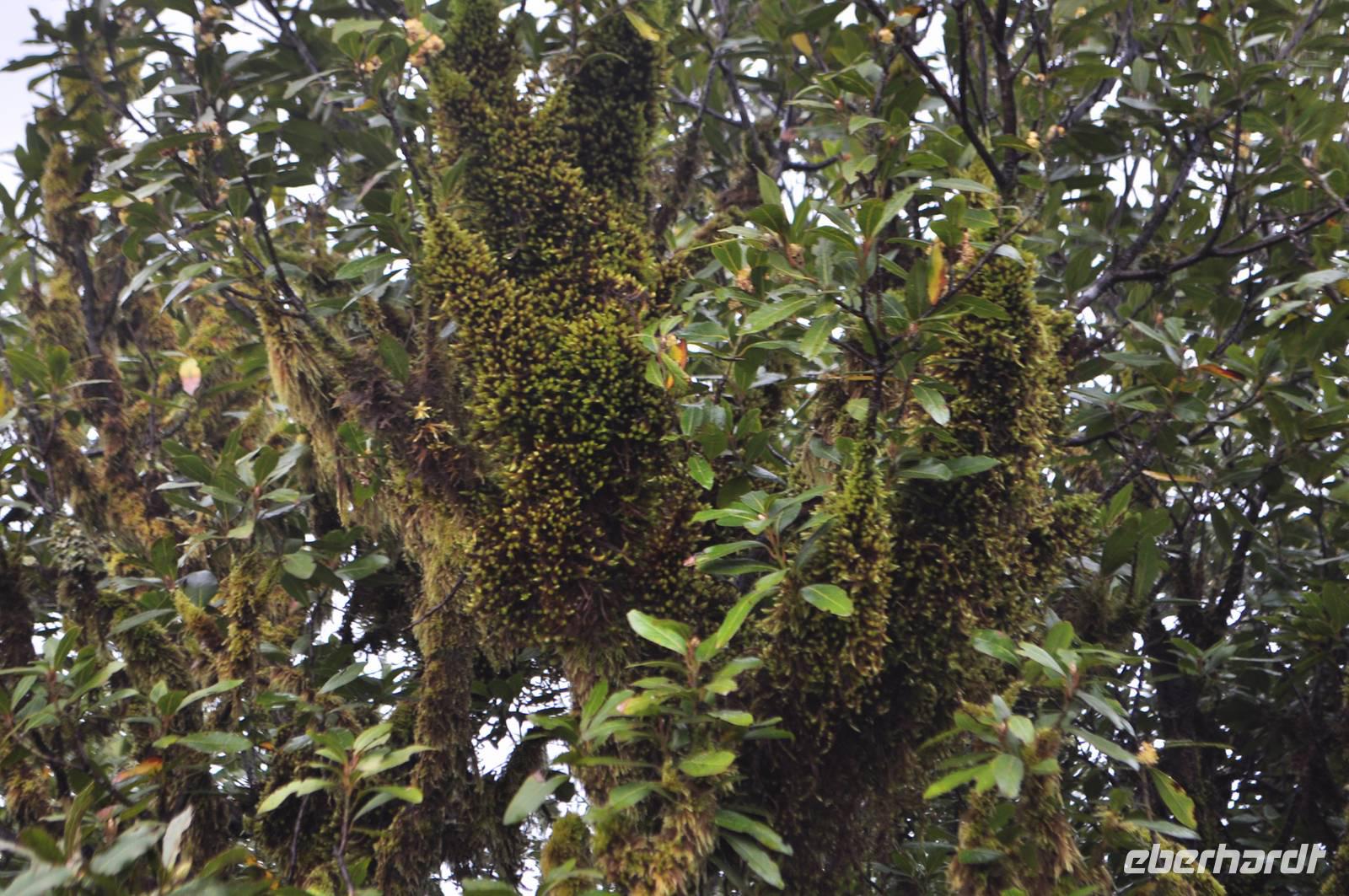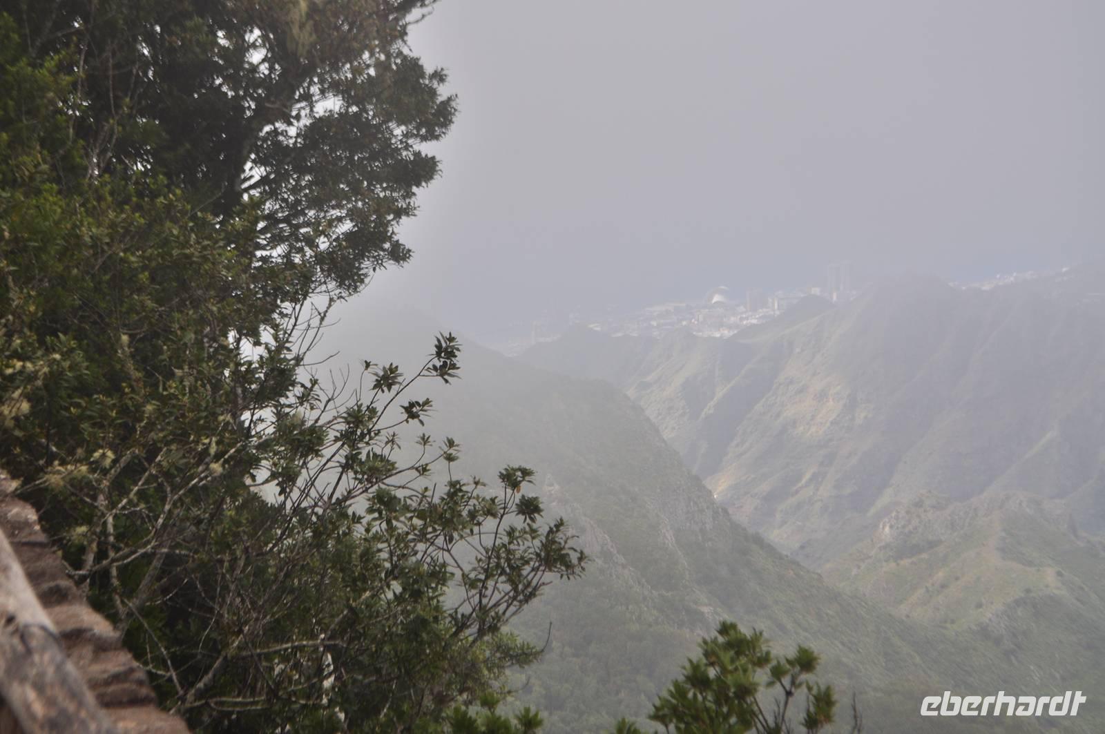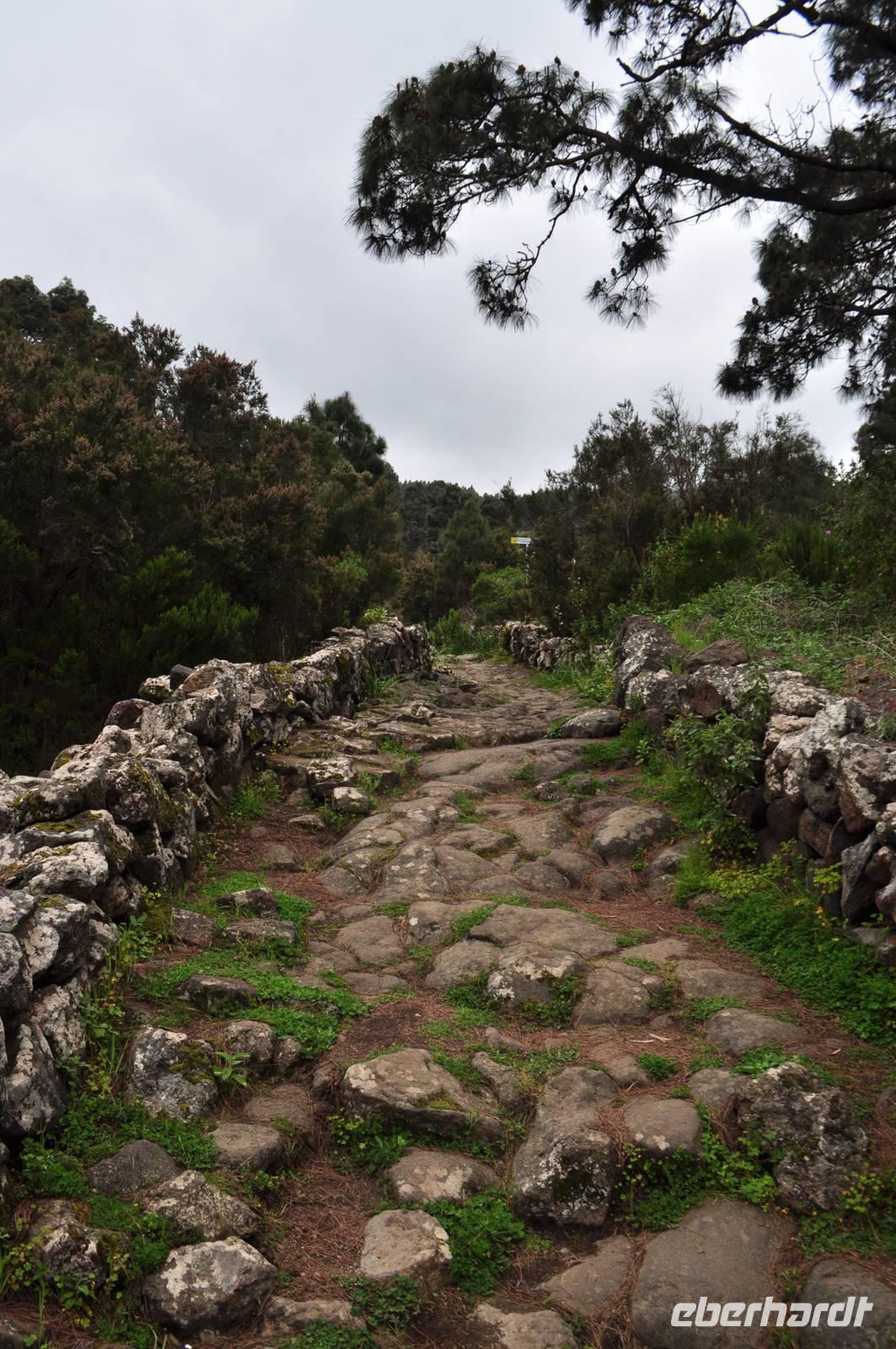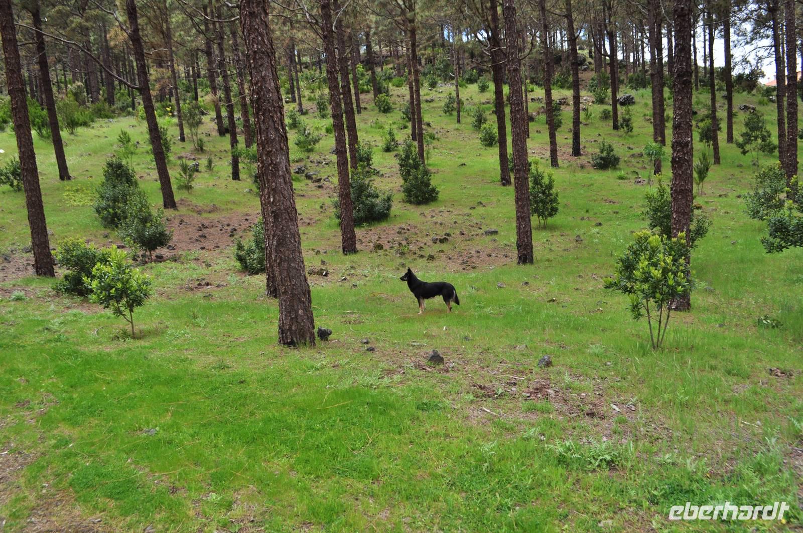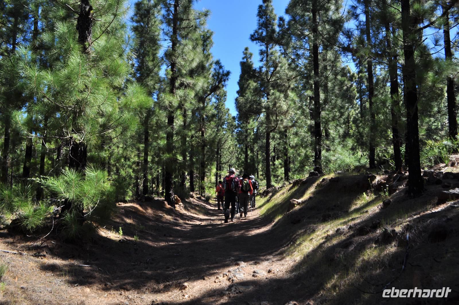 Wir steigen leicht bergab und dringen in den Wolkennebel des Passates ein. Wir können mit eigenen Augen bestaunen, was der Begriff „Horizonatalregen" bedeutet, Kondensation von Nebel an den Pinien und Flechten. Dicke Nebelschwaden ziehen durch den Wald, aber in keinster Weise unangenehm.