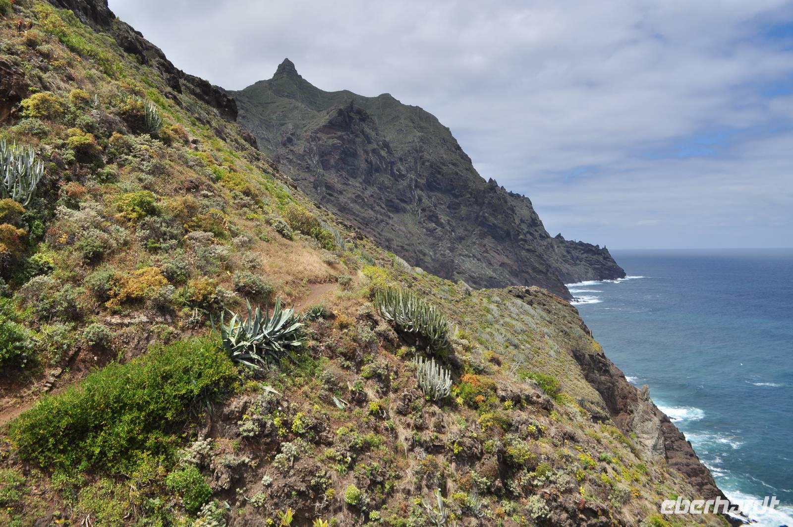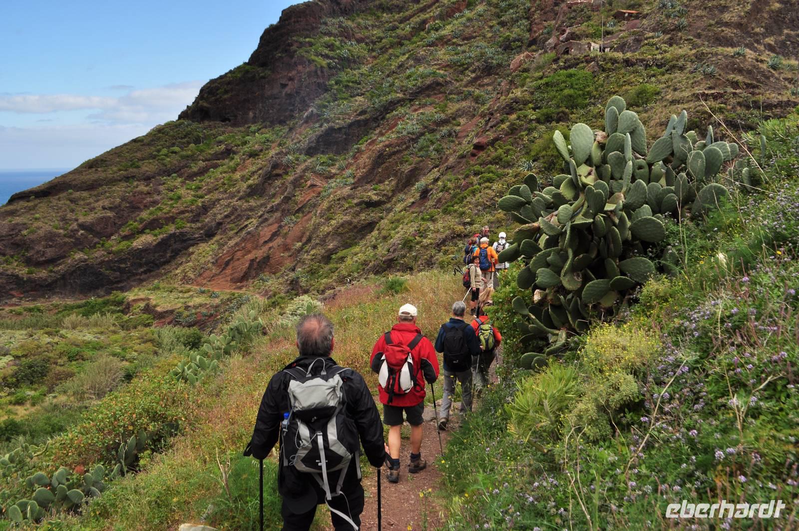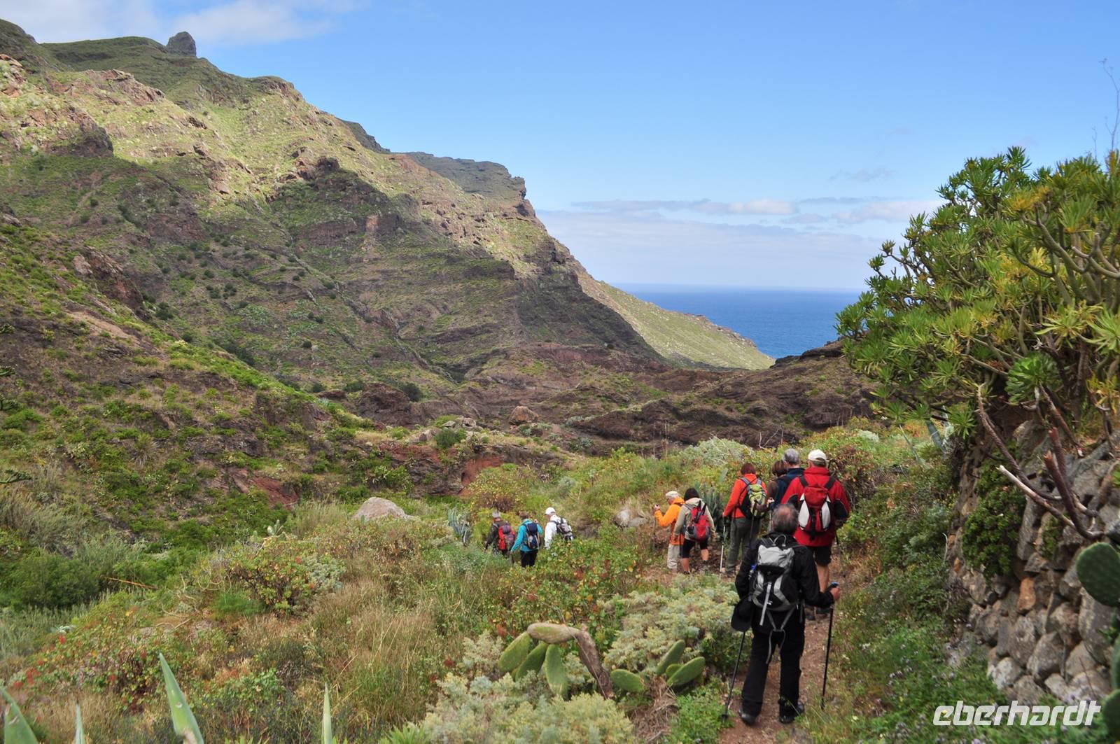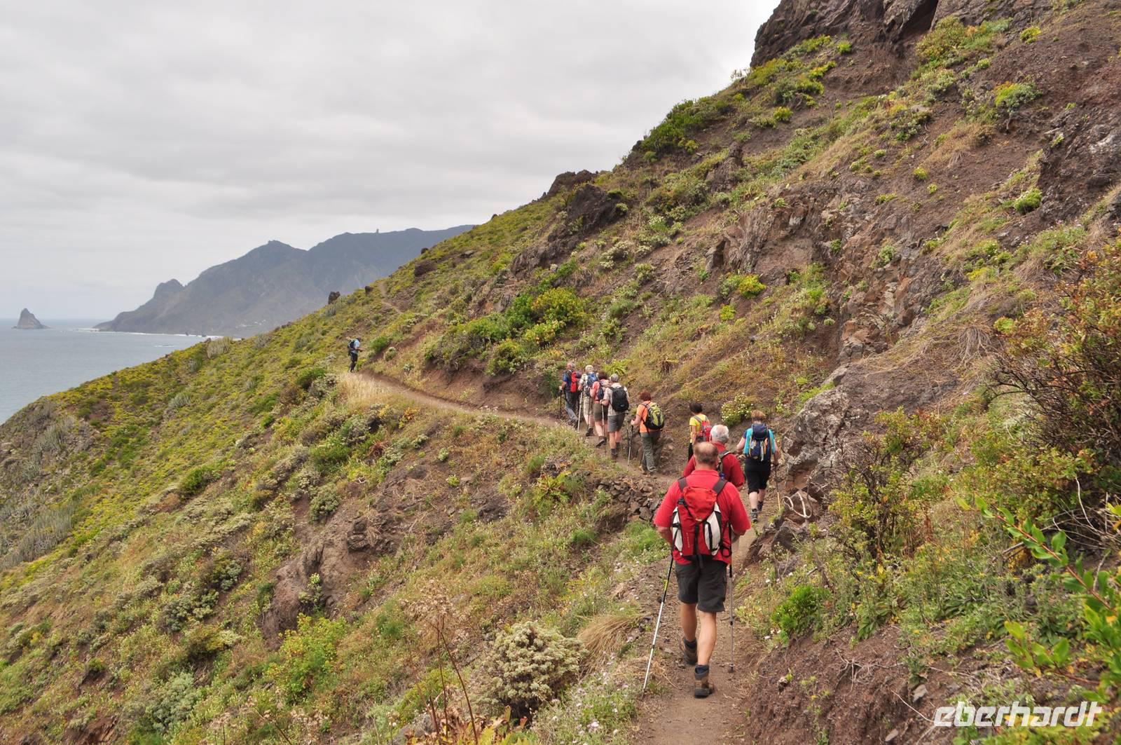 Der erste Teil des Weges endete am Atlantik. Heute gab es eine heftige Brandung mit meterhohen Wellen. Sehr spannend und respekteinflößend. Von nun wechselte die Landschaft ständig. Zunächst meinte man an den steilen Flanken Madeiras zu sein, dann an den Hängen von Lipari (Äolische Inseln) mit der typischen Macchia Vegetation, dann plötzliche bewegte man sich wieder auf einer Küstenwanderung in Cornwall. Nur bestimmte kanarische Vegetation erinnerte daran, dass man Teneriffa nie verlassen hatte. Eine wirklich wunderschöne Küstenwanderung in gut 600m Höhe.