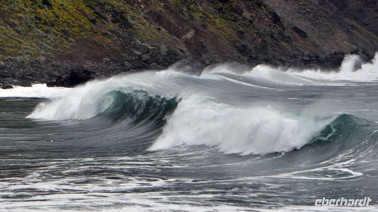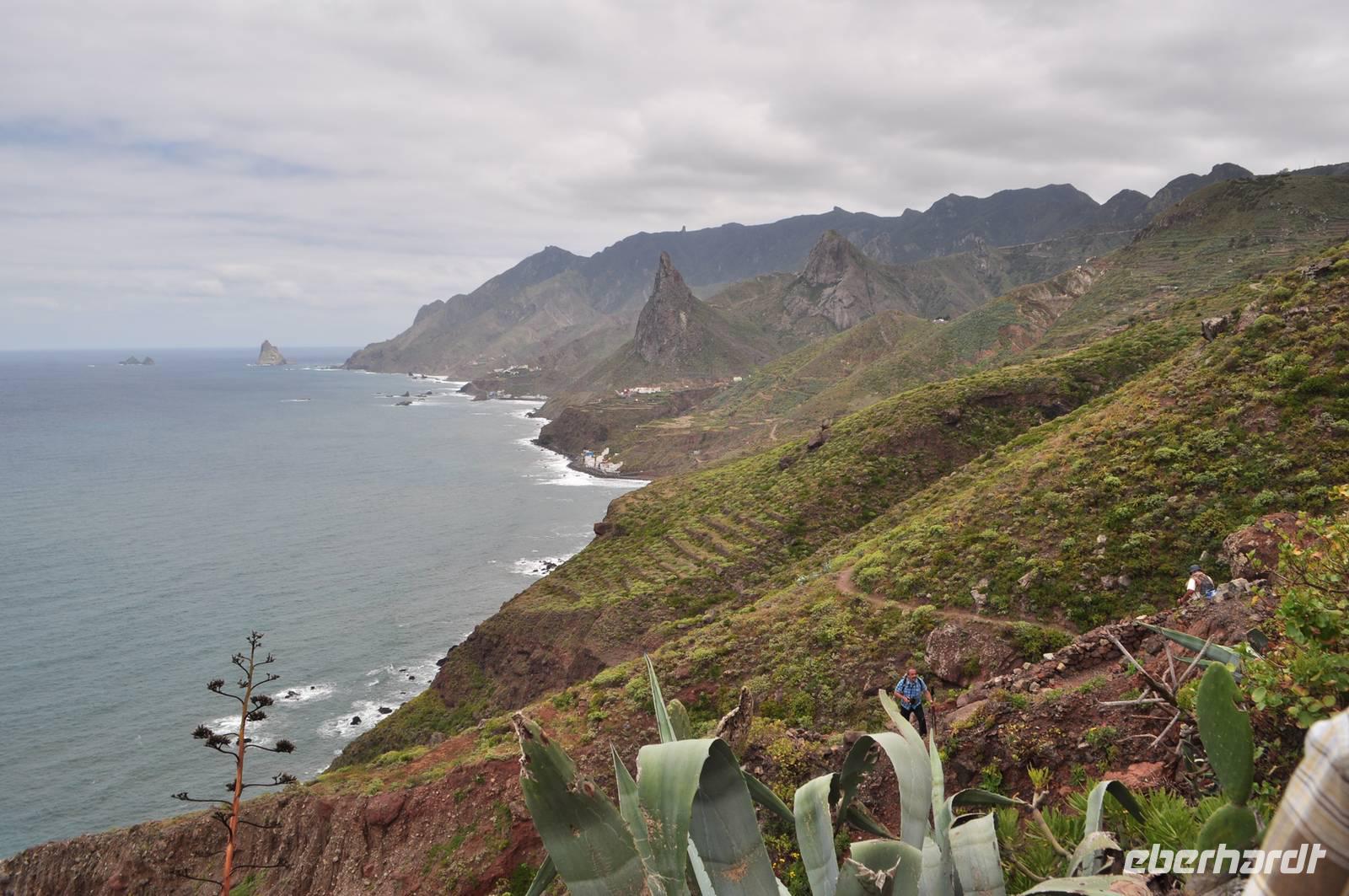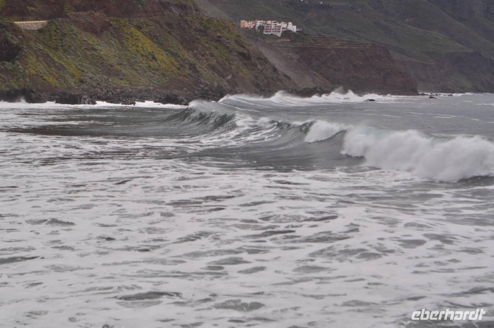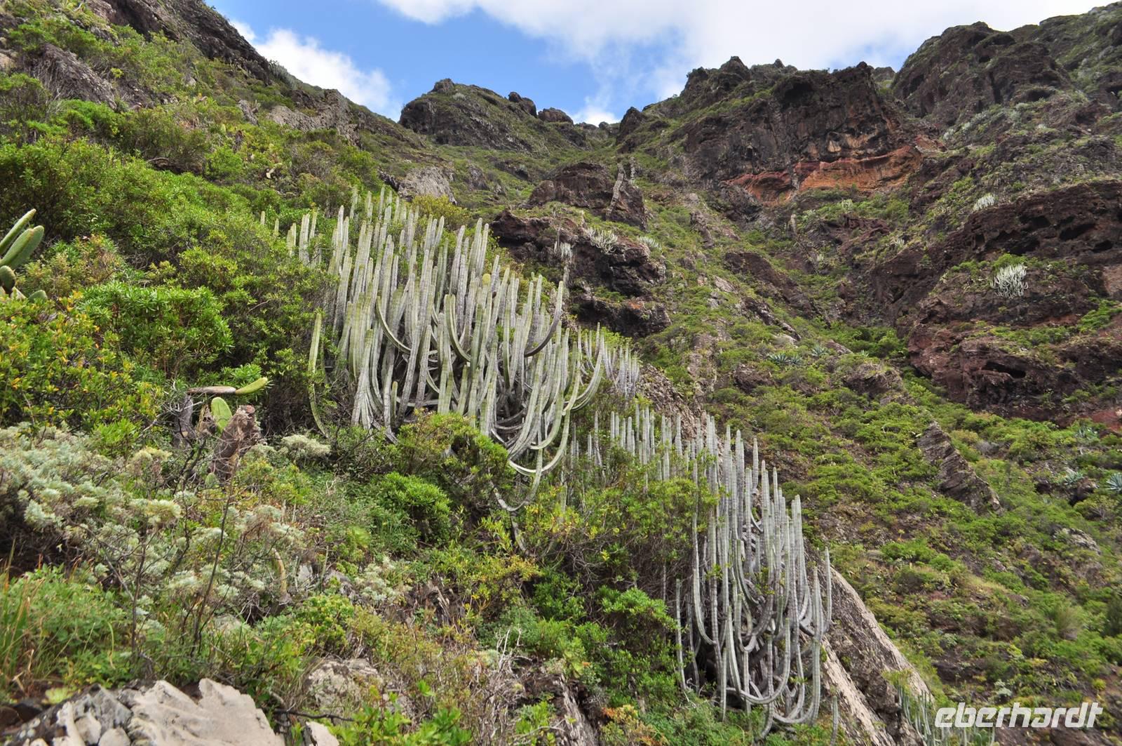 Der erste Teil des Weges endete am Atlantik. Heute gab es eine heftige Brandung mit meterhohen Wellen. Sehr spannend und respekteinflößend. Von nun wechselte die Landschaft ständig. Zunächst meinte man an den steilen Flanken Madeiras zu sein, dann an den Hängen von Lipari (Äolische Inseln) mit der typischen Macchia Vegetation, dann plötzliche bewegte man sich wieder auf einer Küstenwanderung in Cornwall. Nur bestimmte kanarische Vegetation erinnerte daran, dass man Teneriffa nie verlassen hatte. Eine wirklich wunderschöne Küstenwanderung in gut 600m Höhe.