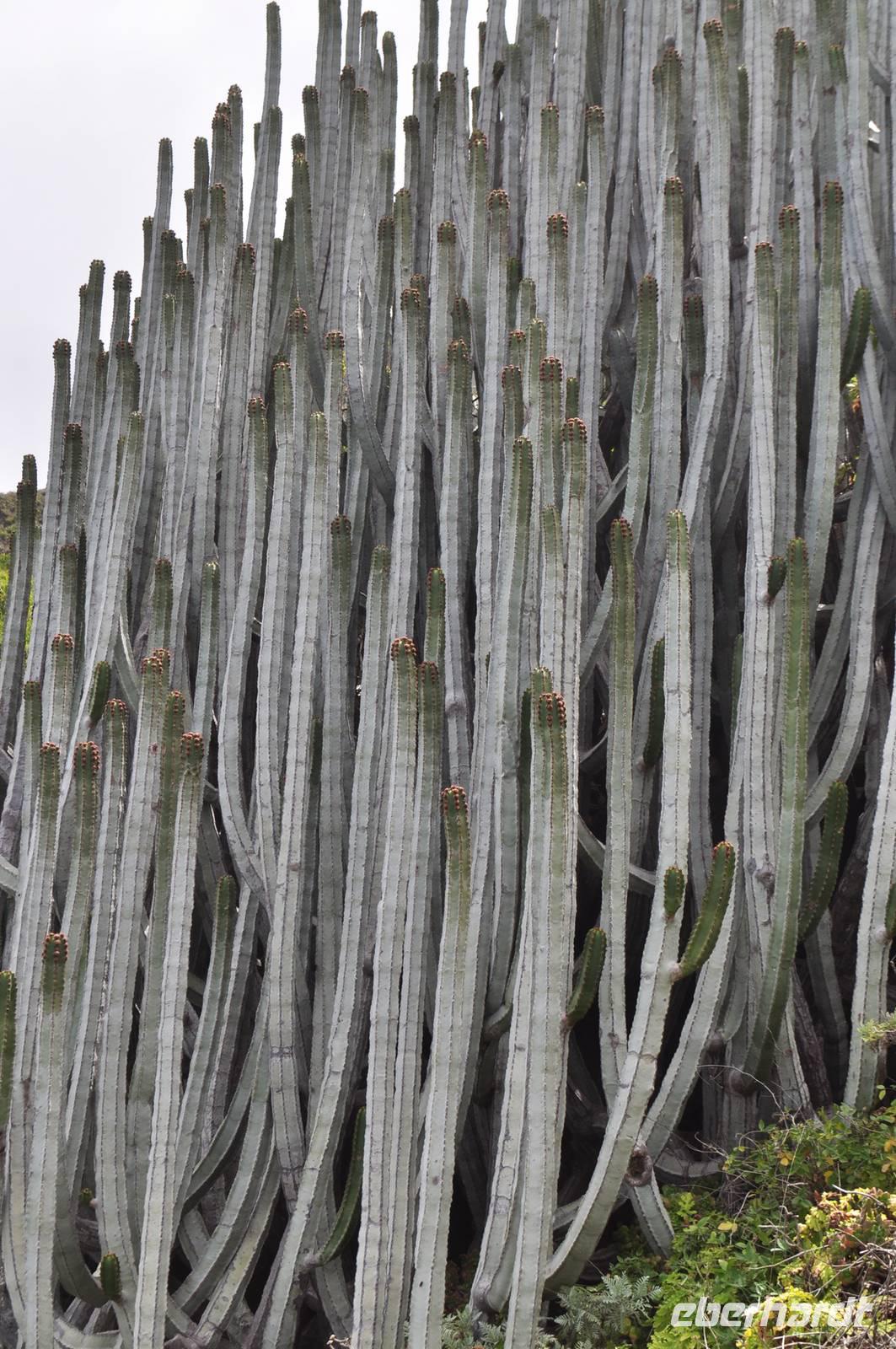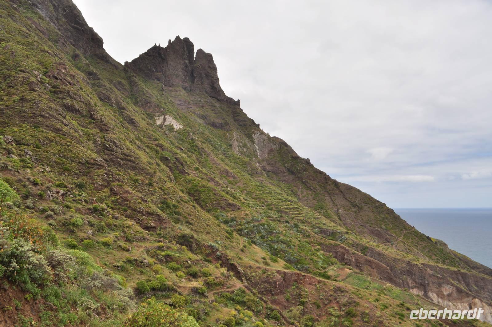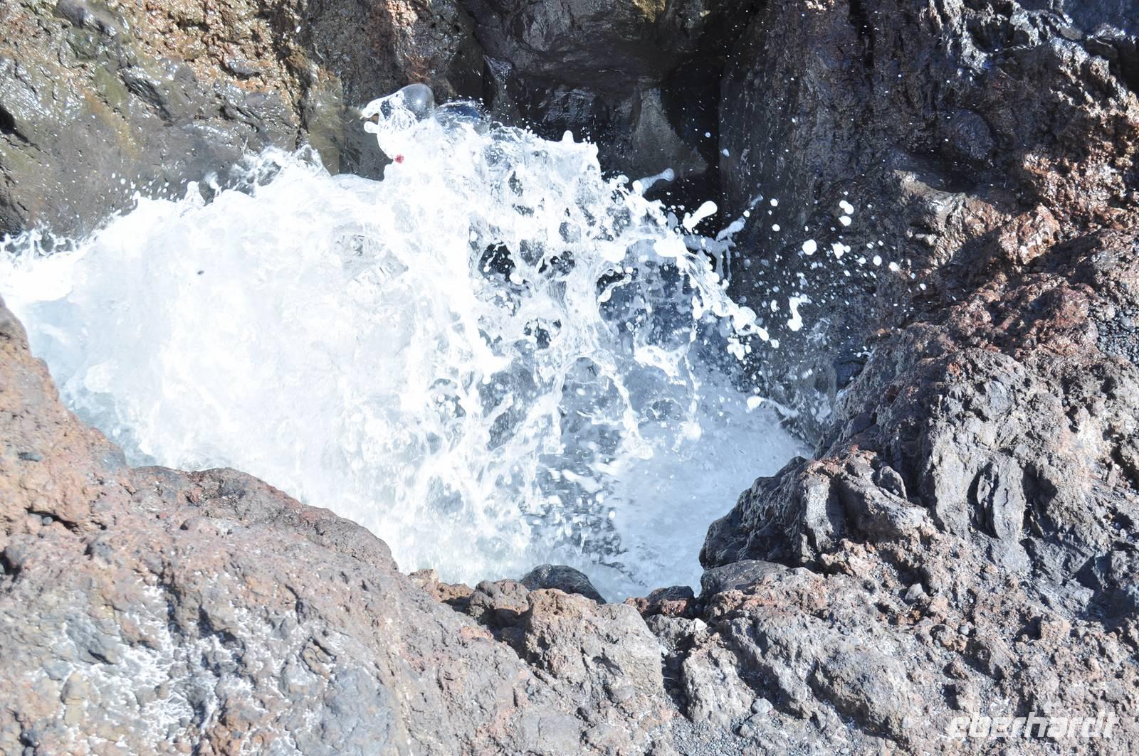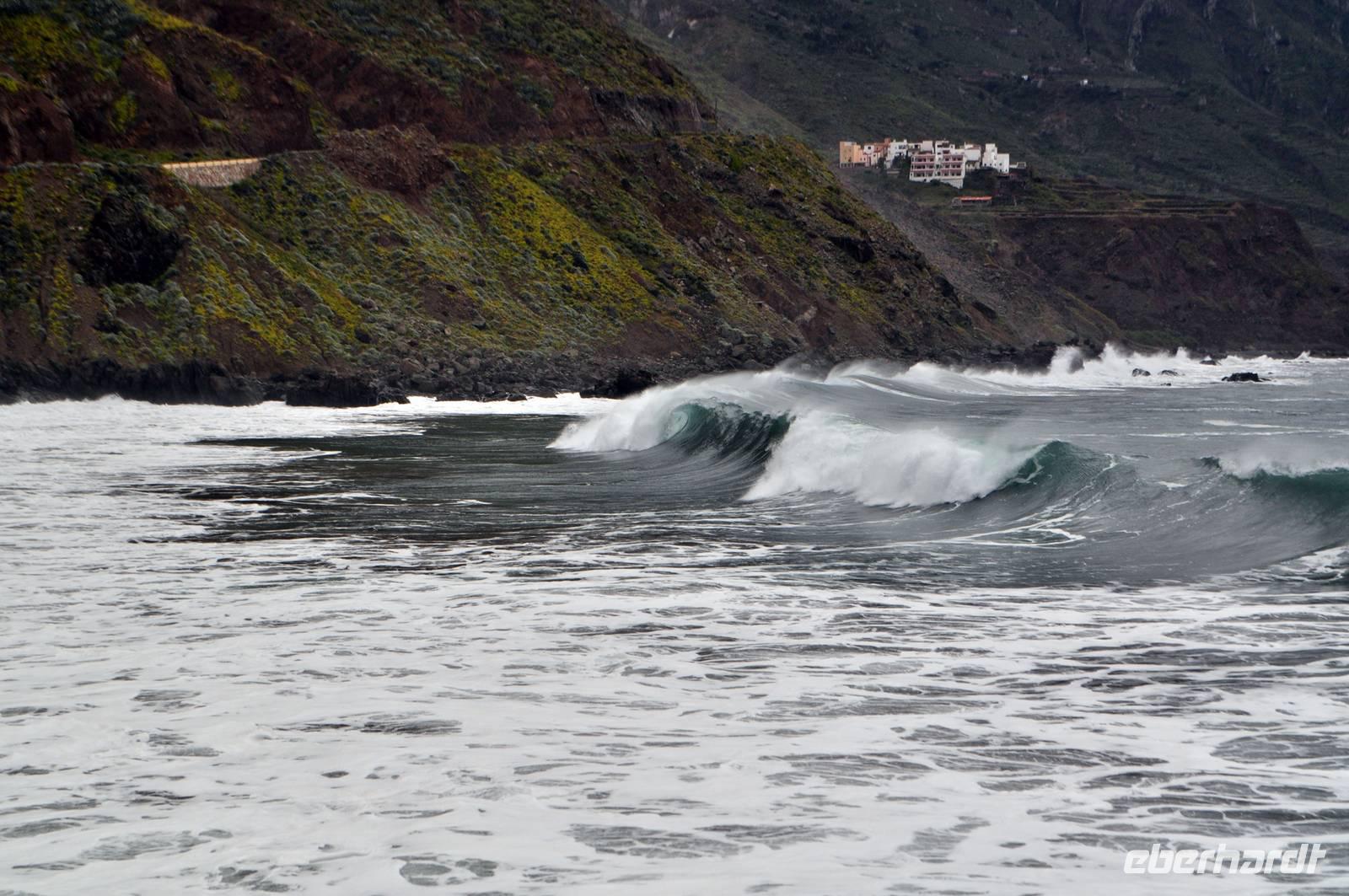 Der erste Teil des Weges endete am Atlantik. Heute gab es eine heftige Brandung mit meterhohen Wellen. Sehr spannend und respekteinflößend. Von nun wechselte die Landschaft ständig. Zunächst meinte man an den steilen Flanken Madeiras zu sein, dann an den Hängen von Lipari (Äolische Inseln) mit der typischen Macchia Vegetation, dann plötzliche bewegte man sich wieder auf einer Küstenwanderung in Cornwall. Nur bestimmte kanarische Vegetation erinnerte daran, dass man Teneriffa nie verlassen hatte. Eine wirklich wunderschöne Küstenwanderung in gut 600m Höhe.