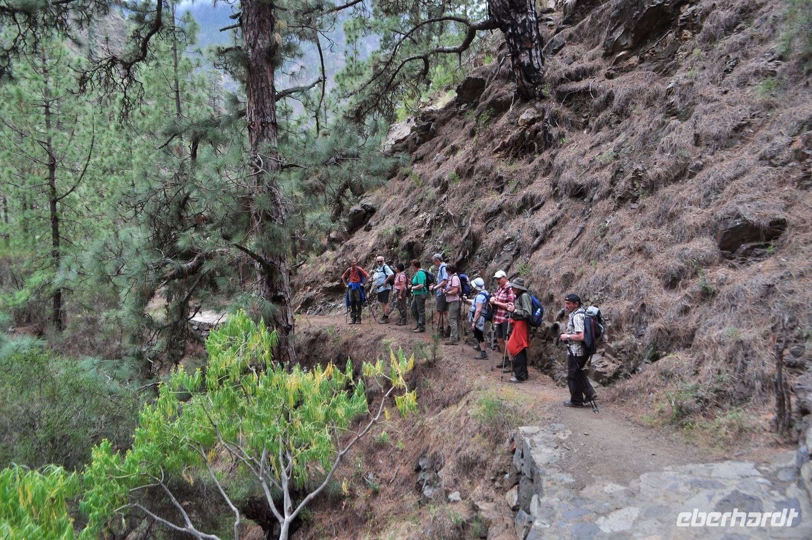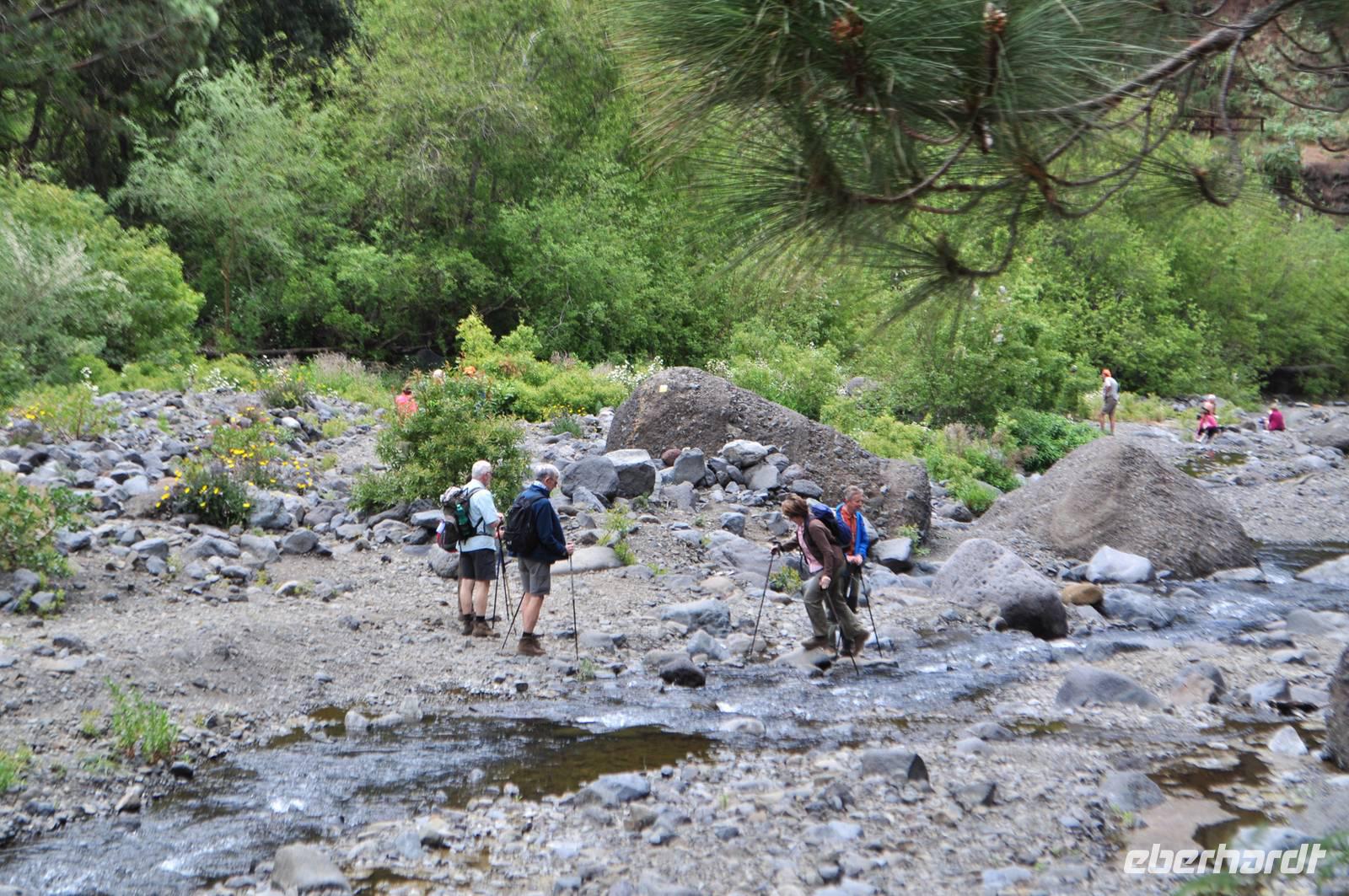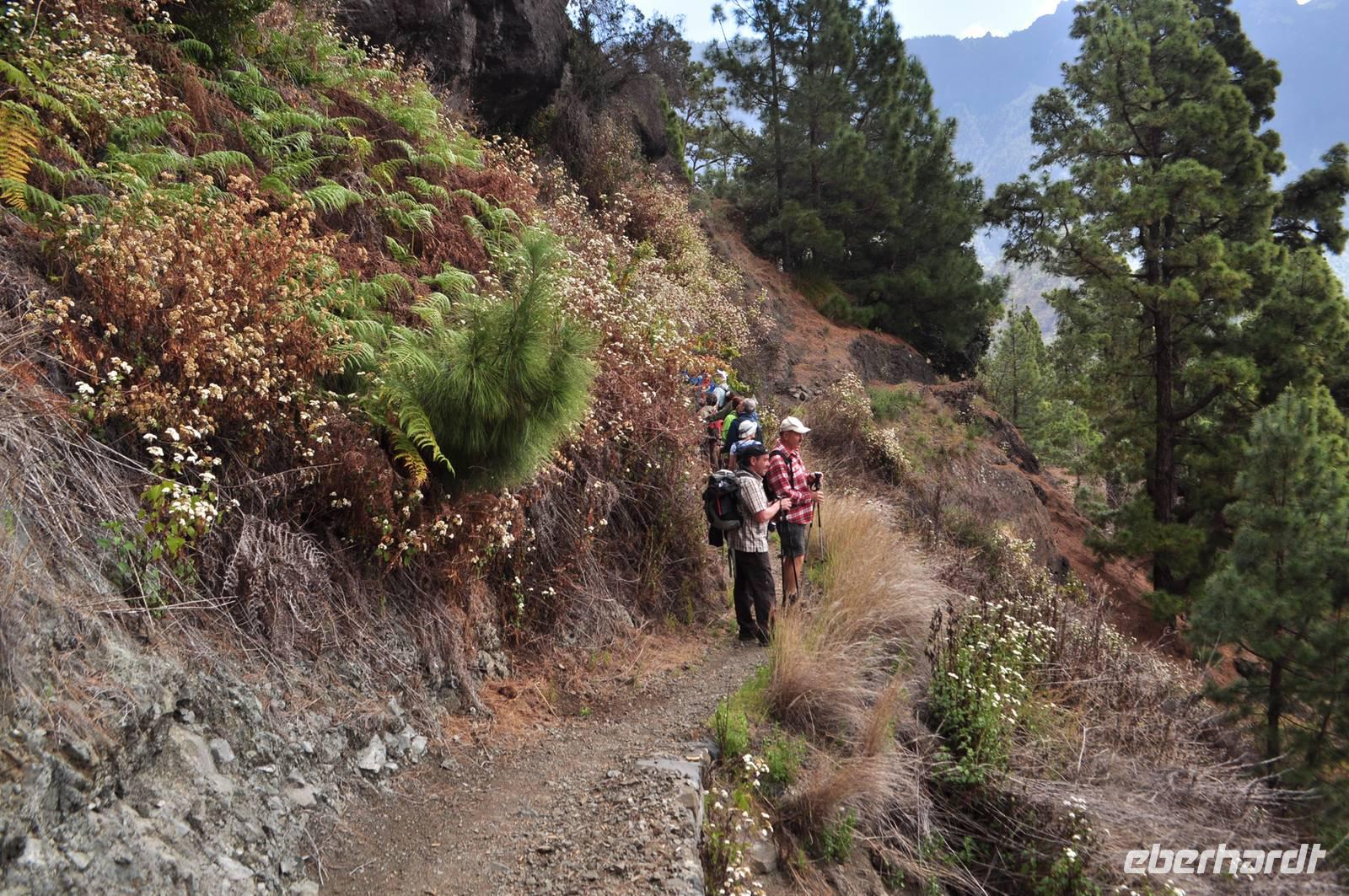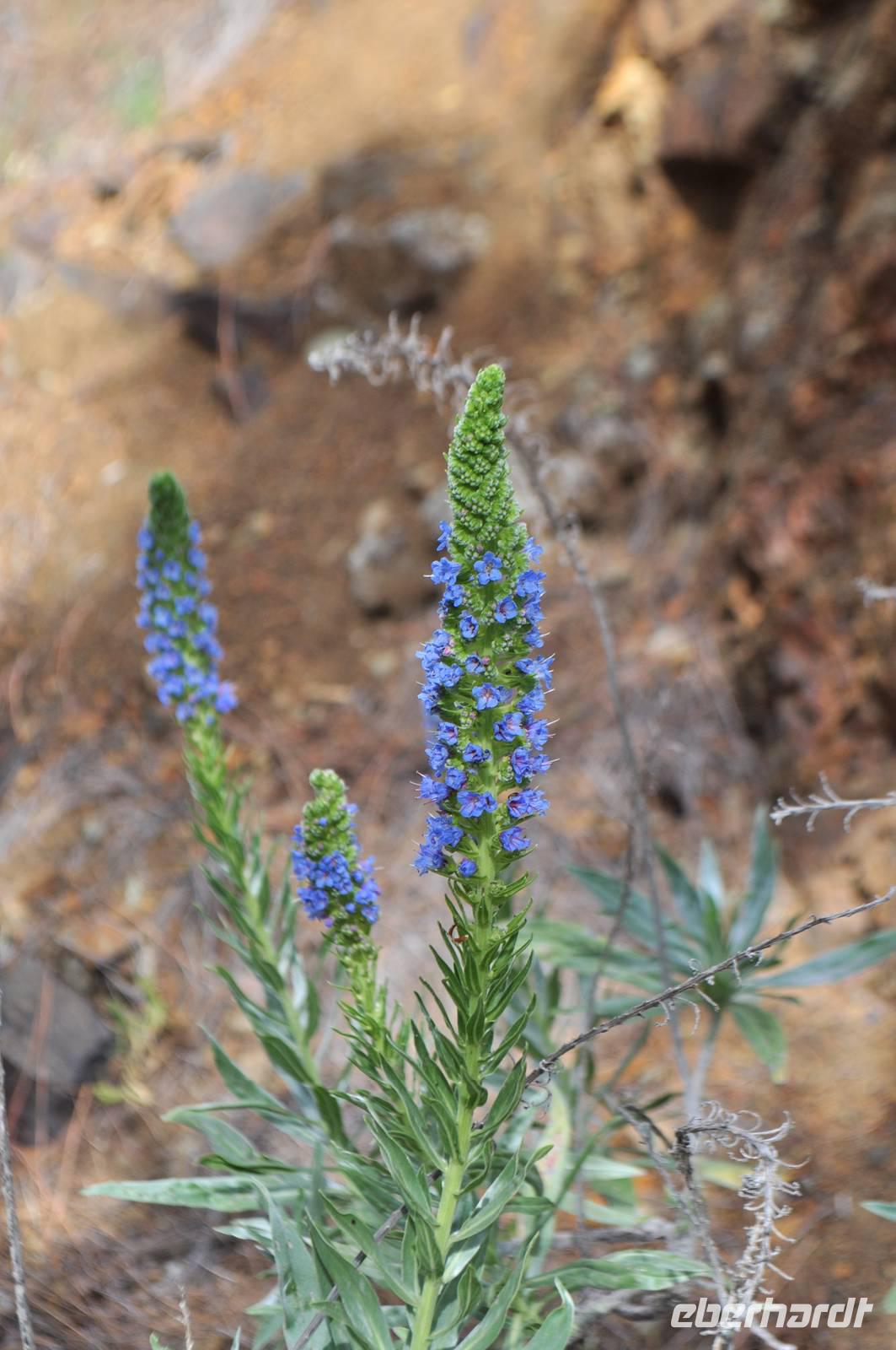 Weitere typische Pflanzen sind die Natterköpfe, die eine meterhohe kerzenartige Blüte hervorbringen. Ebenso heimisch sind viele Dickblattgewächse. Der erste Teil der Wanderung führt recht steil bergab. Der Weg läuft sich bedingt durch die Nadeln sehr weich und angenehm. Zur Mittagszeit erreichen wir die Talsohle der Caldera die Schlucht der Ängste, die Barranco de Las Angustias. Nach der Flussüberquerung (nur Steine, keine Brücke!) machen wir unsere Mittagsrast.