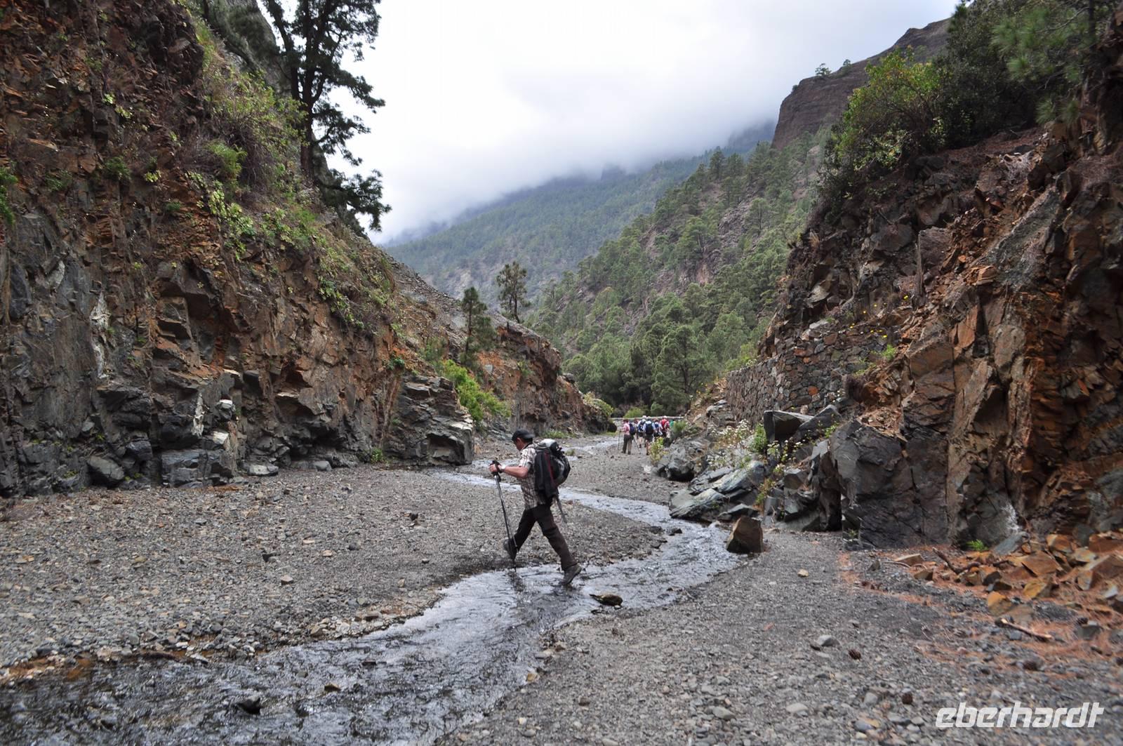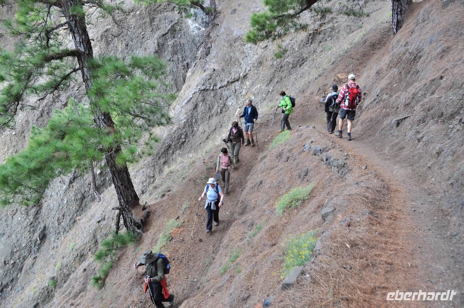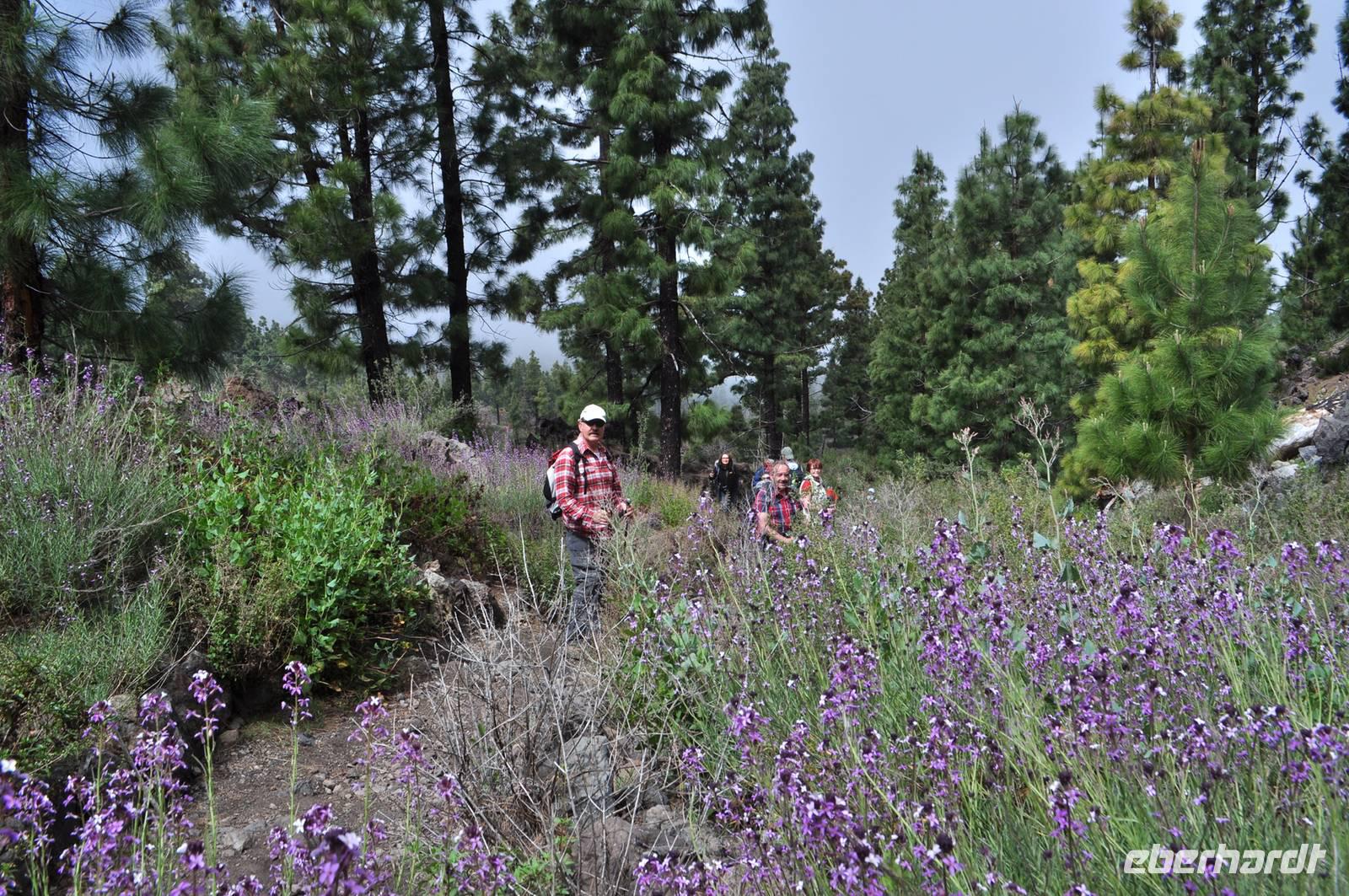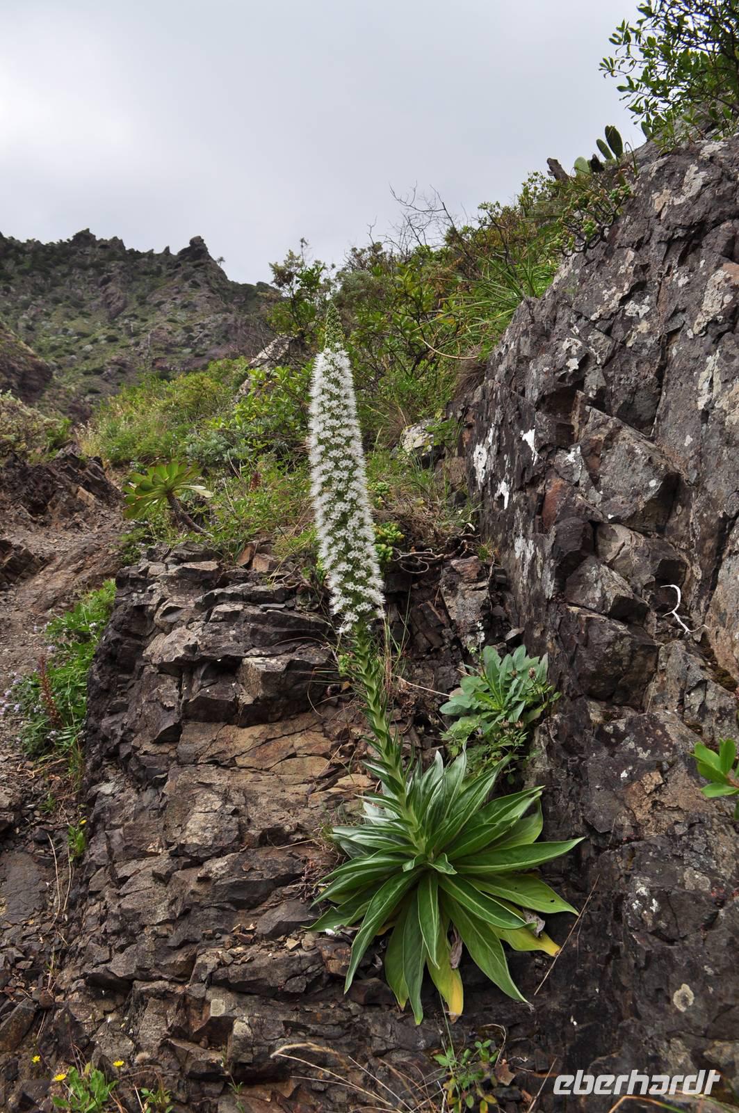 Weitere typische Pflanzen sind die Natterköpfe, die eine meterhohe kerzenartige Blüte hervorbringen. Ebenso heimisch sind viele Dickblattgewächse. Der erste Teil der Wanderung führt recht steil bergab. Der Weg läuft sich bedingt durch die Nadeln sehr weich und angenehm. Zur Mittagszeit erreichen wir die Talsohle der Caldera die Schlucht der Ängste, die Barranco de Las Angustias. Nach der Flussüberquerung (nur Steine, keine Brücke!) machen wir unsere Mittagsrast.