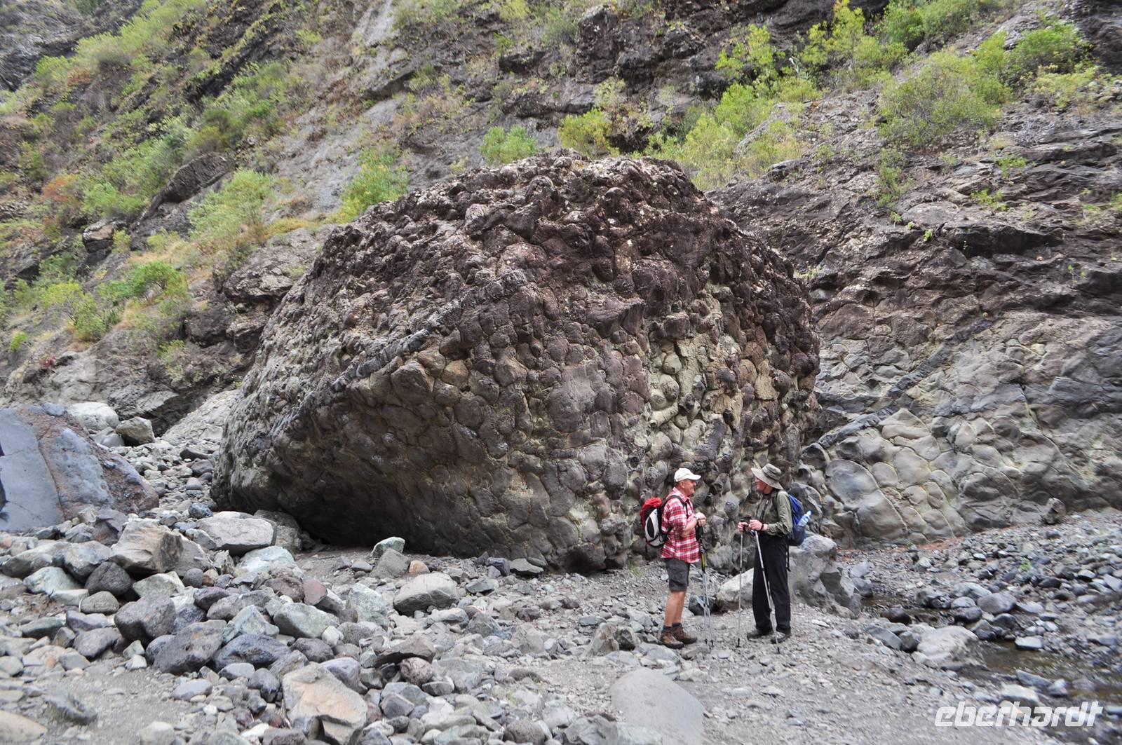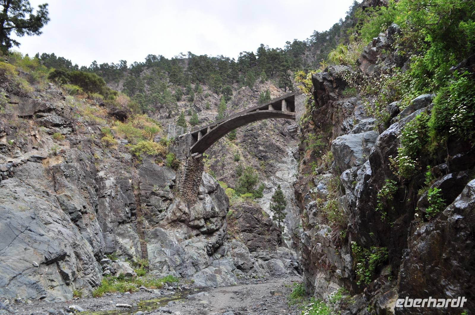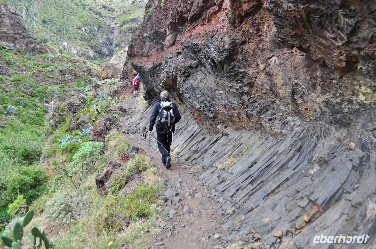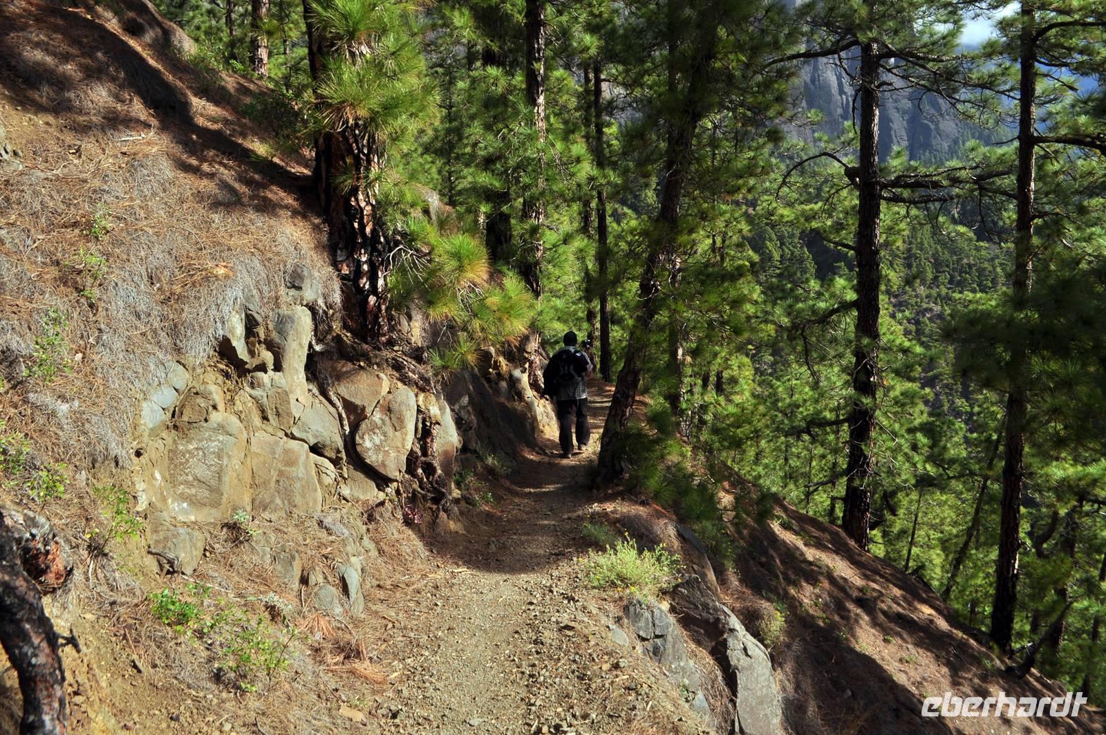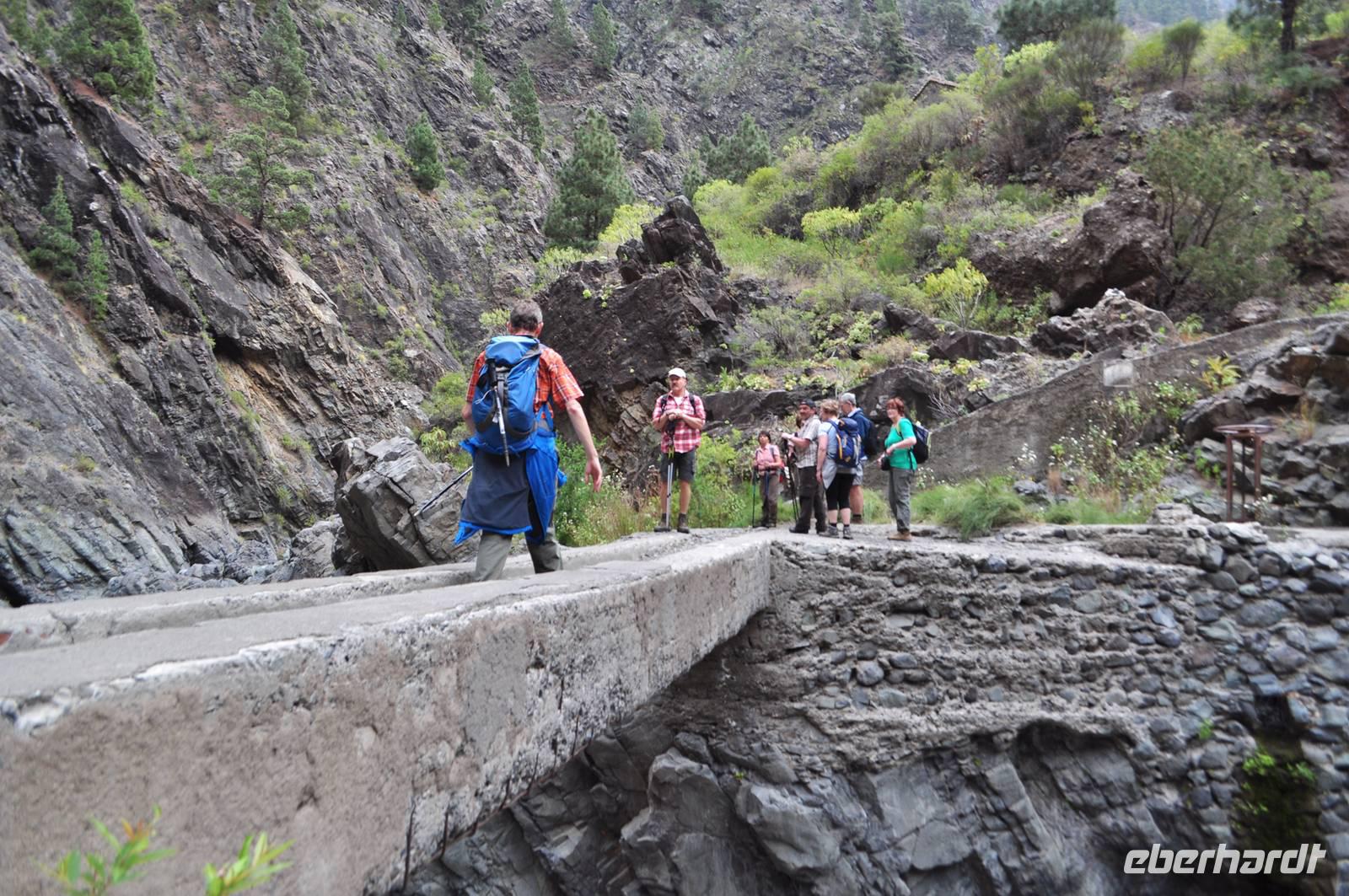 Weitere typische Pflanzen sind die Natterköpfe, die eine meterhohe kerzenartige Blüte hervorbringen. Ebenso heimisch sind viele Dickblattgewächse. Der erste Teil der Wanderung führt recht steil bergab. Der Weg läuft sich bedingt durch die Nadeln sehr weich und angenehm. Zur Mittagszeit erreichen wir die Talsohle der Caldera die Schlucht der Ängste, die Barranco de Las Angustias. Nach der Flussüberquerung (nur Steine, keine Brücke!) machen wir unsere Mittagsrast.