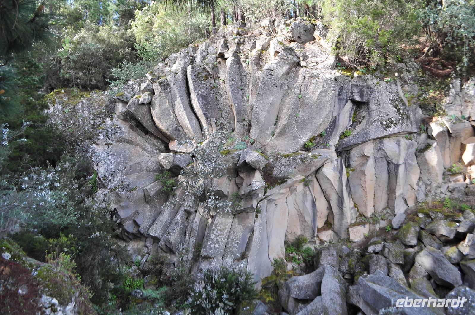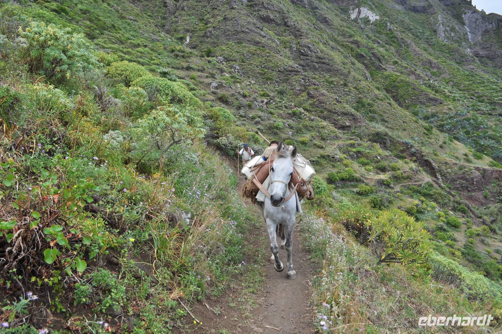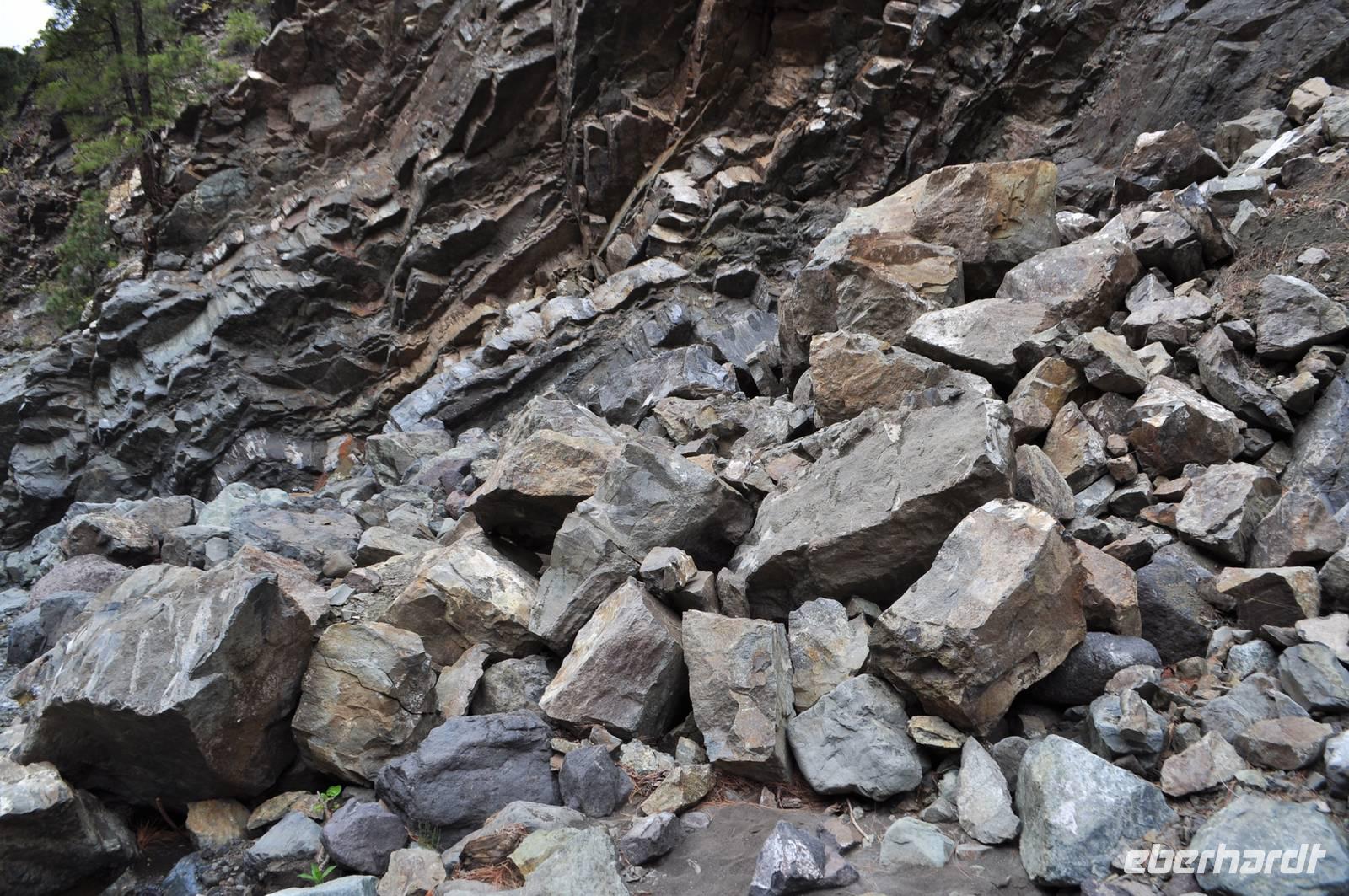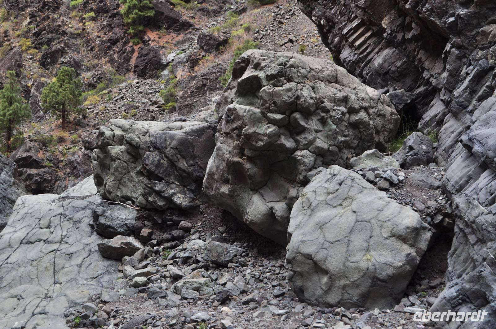 Weitere typische Pflanzen sind die Natterköpfe, die eine meterhohe kerzenartige Blüte hervorbringen. Ebenso heimisch sind viele Dickblattgewächse. Der erste Teil der Wanderung führt recht steil bergab. Der Weg läuft sich bedingt durch die Nadeln sehr weich und angenehm. Zur Mittagszeit erreichen wir die Talsohle der Caldera die Schlucht der Ängste, die Barranco de Las Angustias. Nach der Flussüberquerung (nur Steine, keine Brücke!) machen wir unsere Mittagsrast.
