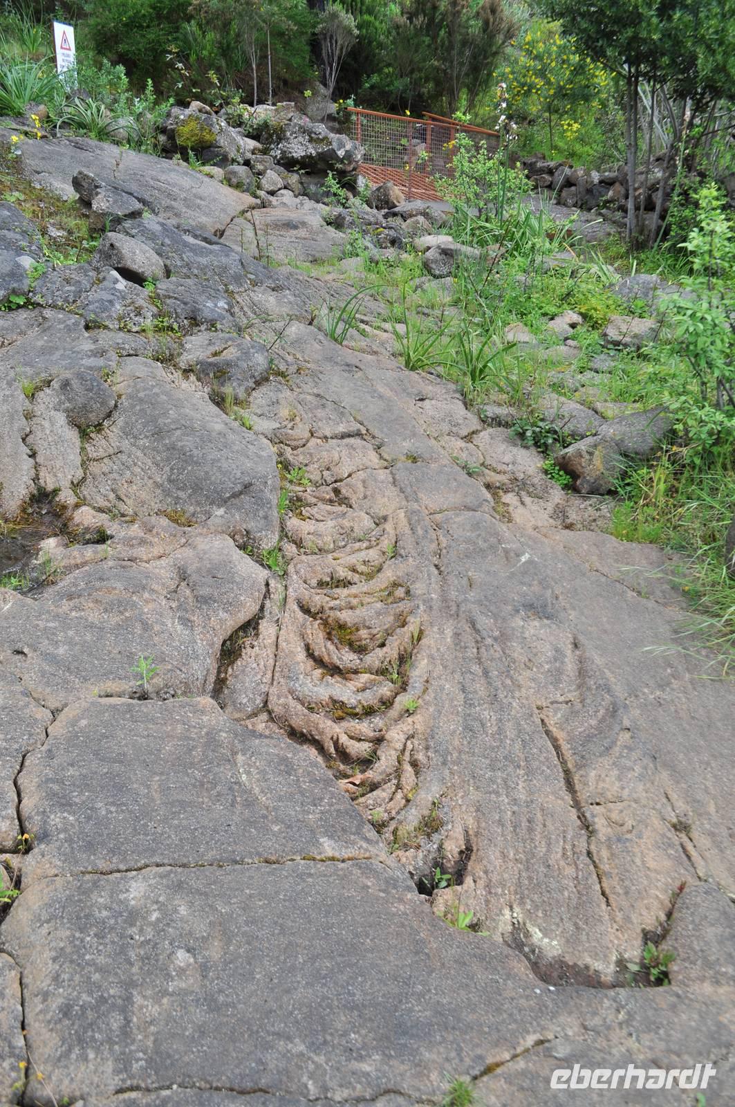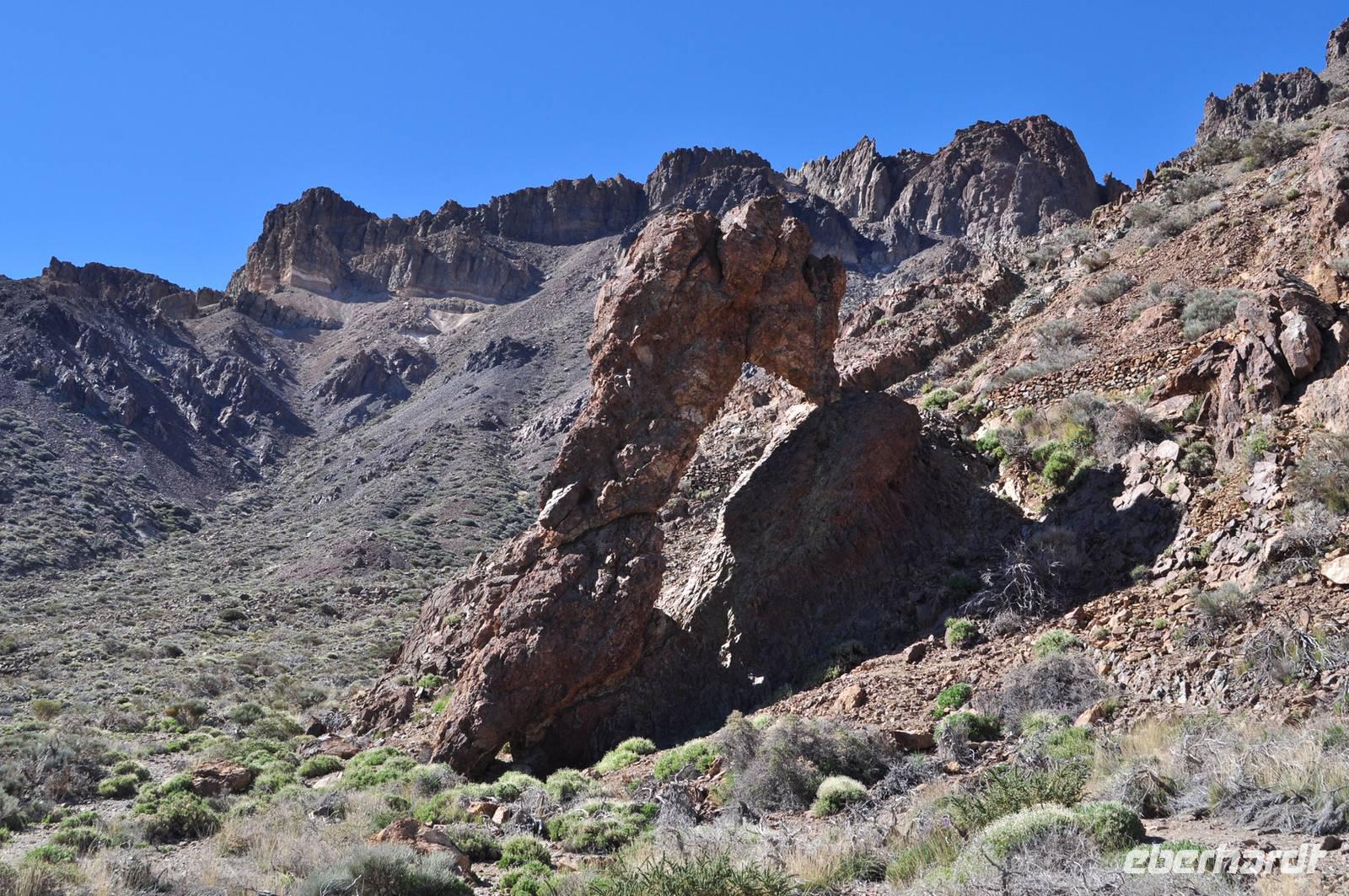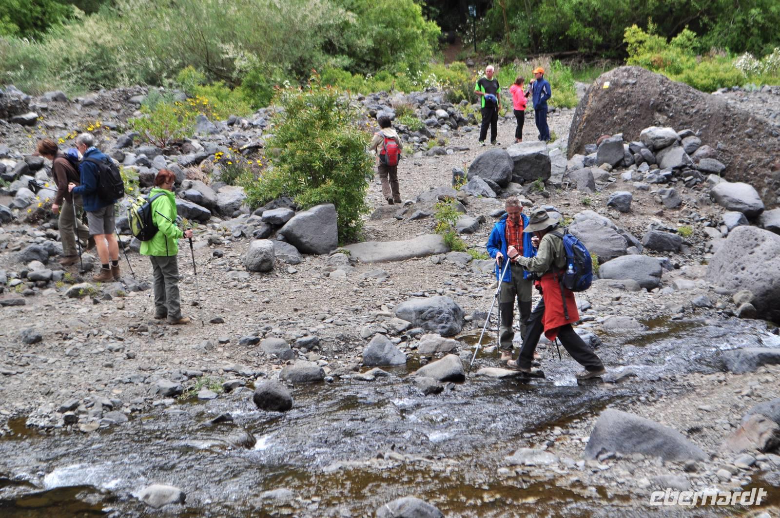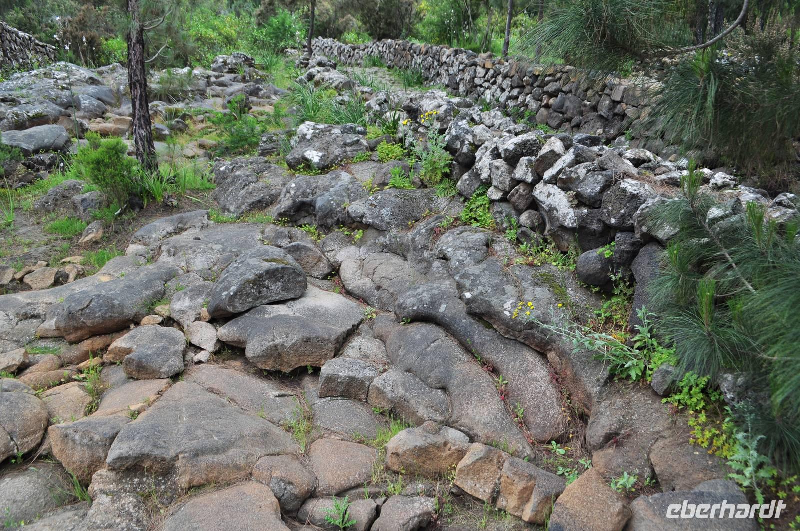 Weitere typische Pflanzen sind die Natterköpfe, die eine meterhohe kerzenartige Blüte hervorbringen. Ebenso heimisch sind viele Dickblattgewächse. Der erste Teil der Wanderung führt recht steil bergab. Der Weg läuft sich bedingt durch die Nadeln sehr weich und angenehm. Zur Mittagszeit erreichen wir die Talsohle der Caldera die Schlucht der Ängste, die Barranco de Las Angustias. Nach der Flussüberquerung (nur Steine, keine Brücke!) machen wir unsere Mittagsrast.