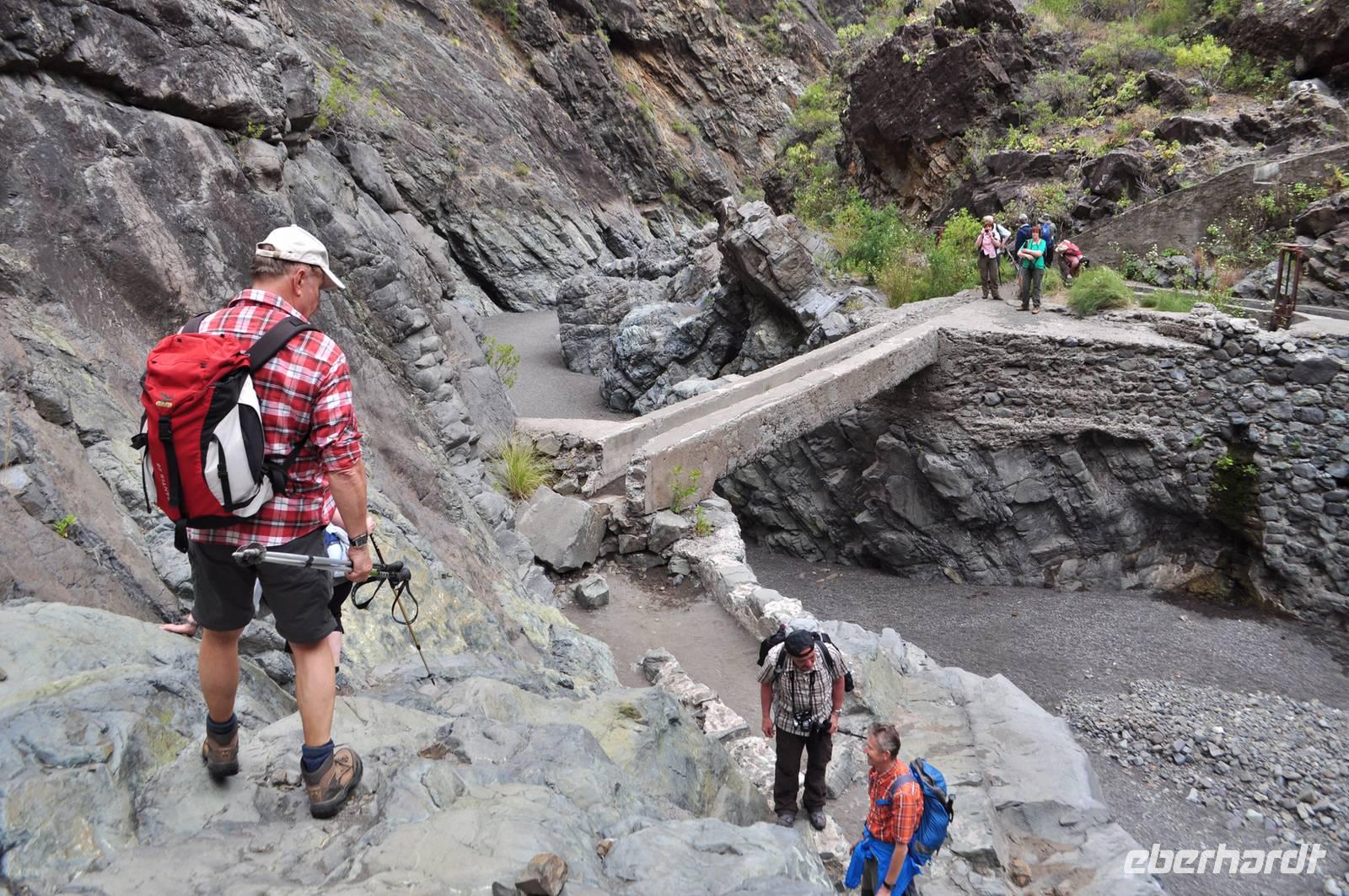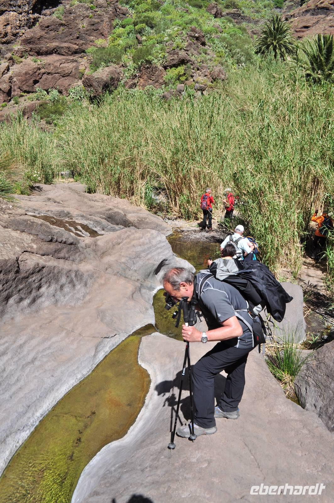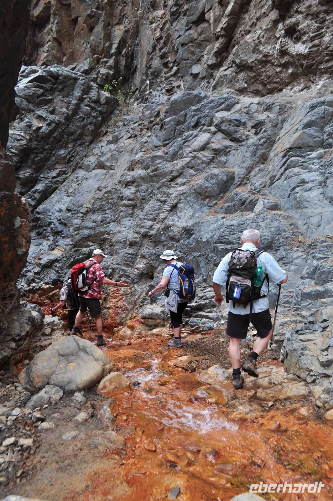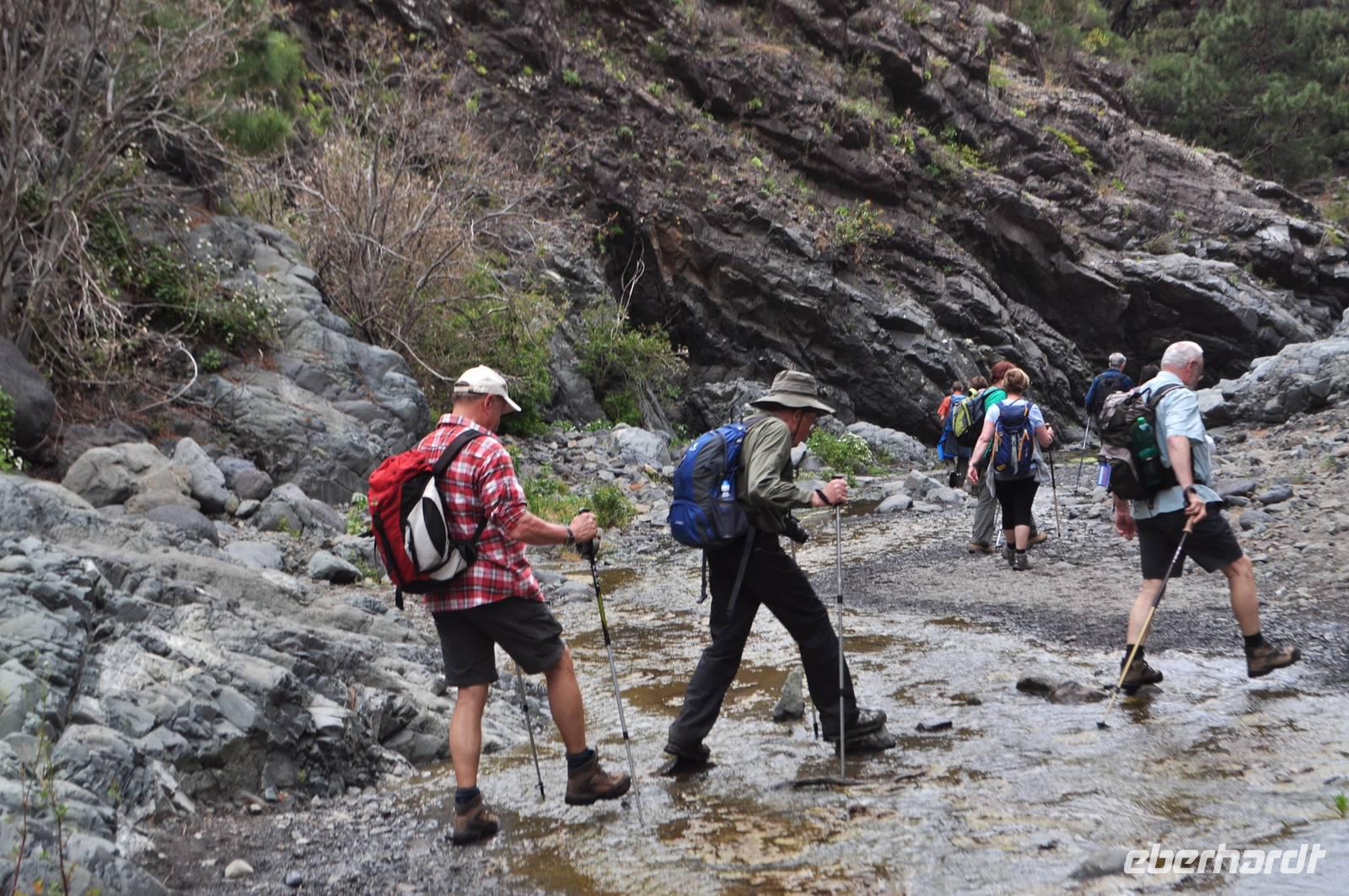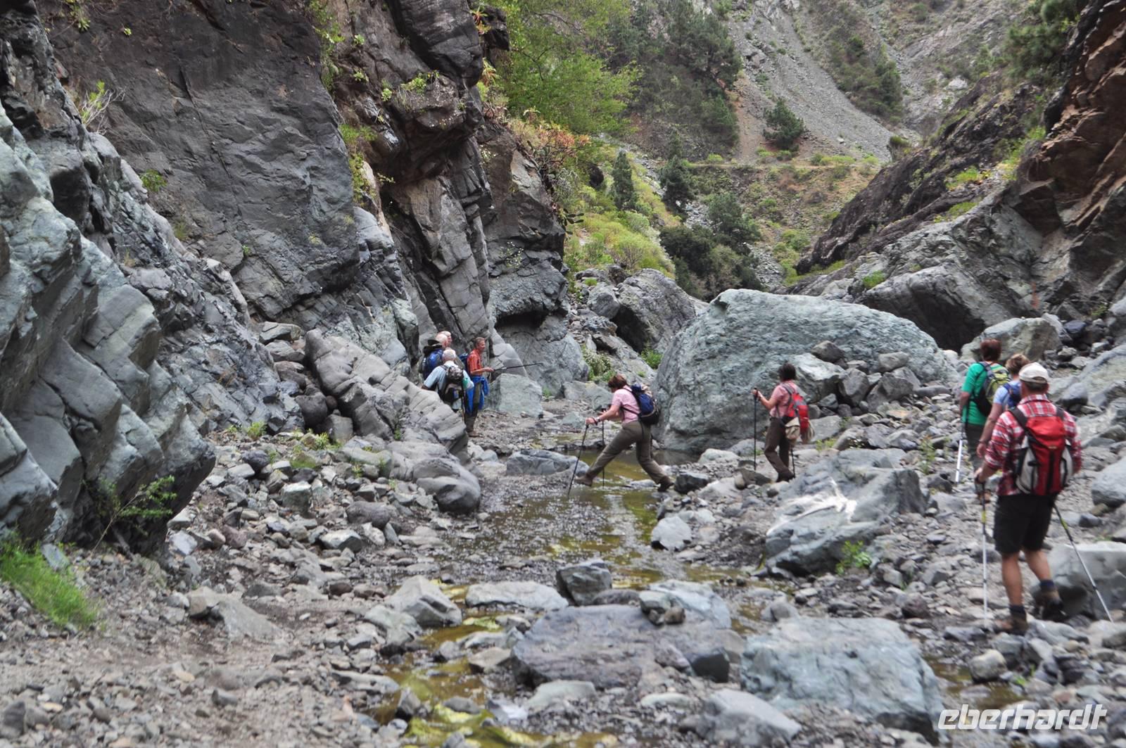 Von nun wandern wir durch das felsige und steinige Flussbett. Hohe feste Wanderschuhe möglichst wasserdicht sind sehr hilfreich. Wir müssen das fließende Gewässer mehrfach queren oder durchwaten. Die Caldera schließt sich an vielen Stellen zu einer engen Klamm, folglich müssen einige Stellen „geklettert" werden. Diese Stellen sind jedoch nie besonders hoch (max. 3-5m), Andreas hilft allen Gästen über die schwierigen Stellen hinweg und sichert alle Gäste, wo es nötig ist. Im letzten Teil weitet sich das Tal und wir wandern durch das Flussbett bestehend aus Geröll. Da das Wasser an mehreren Stellen in Kanälen zur Bewässerung der tieferliegenden Felder abgeführt wird, haben wir ständig wechselnde Wasserstände, manchmal fließt das Wasser unsichtbar durch das Geröll, manchmal als Fluss mit knie- oder hüfttiefen Stellen.