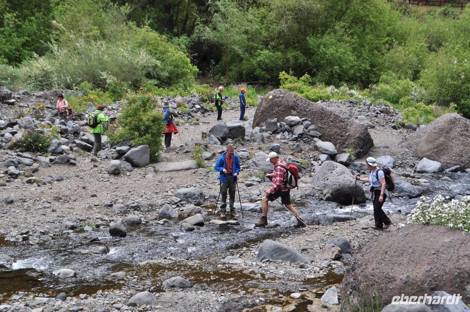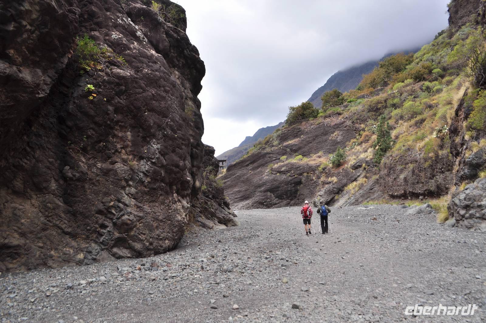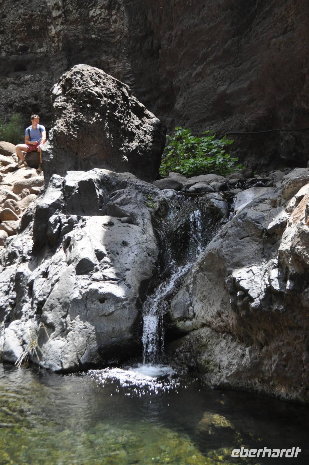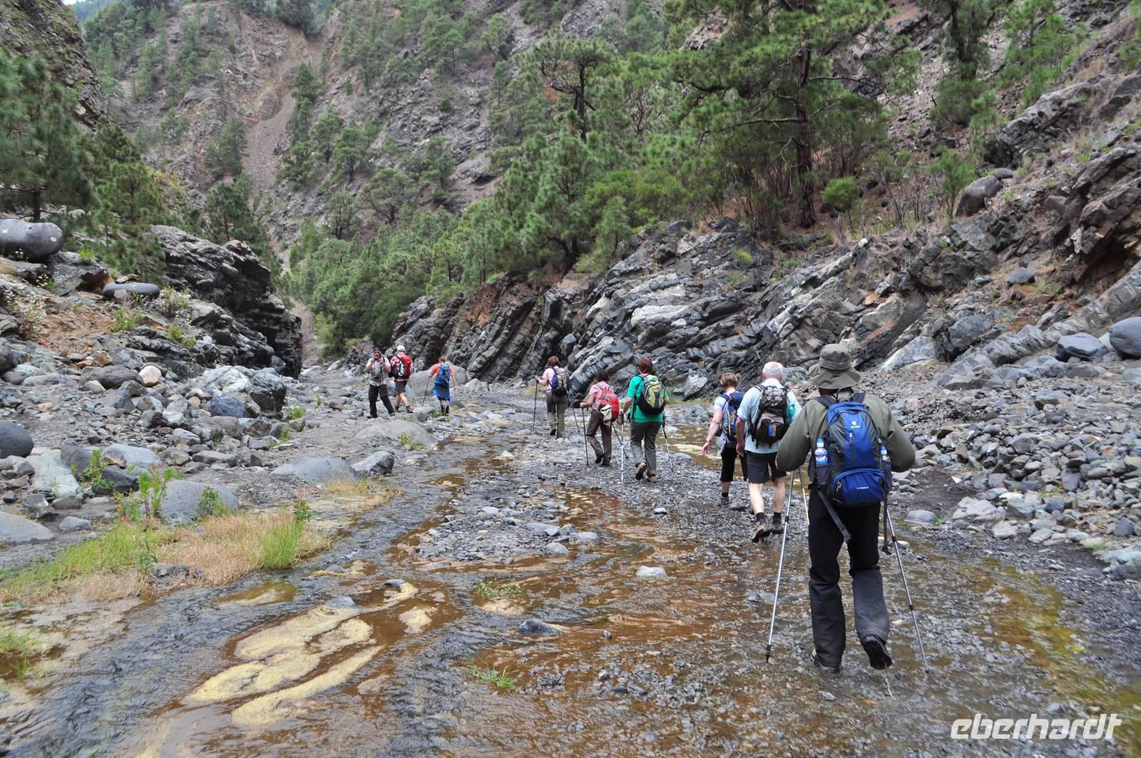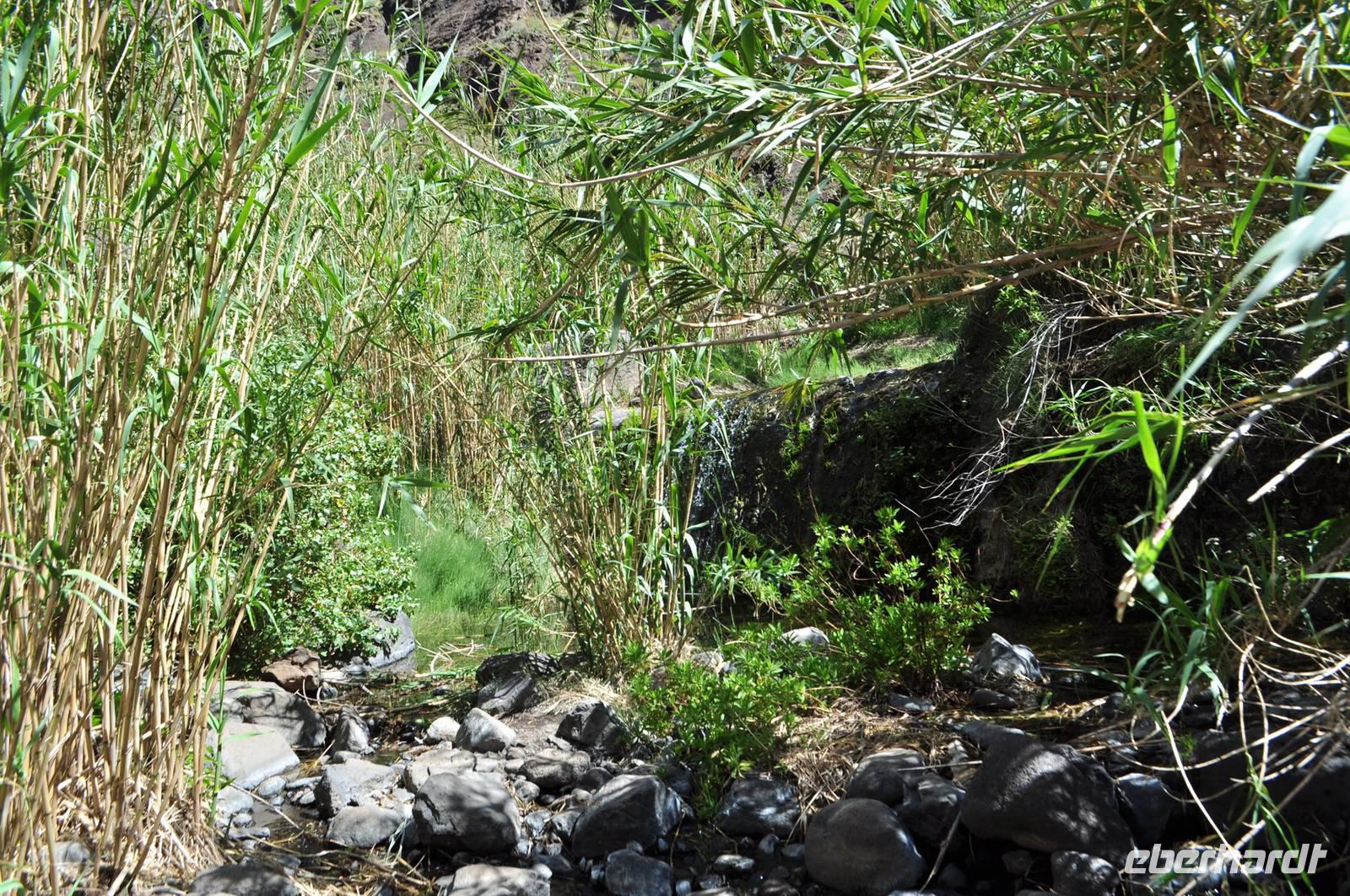 Von nun wandern wir durch das felsige und steinige Flussbett. Hohe feste Wanderschuhe möglichst wasserdicht sind sehr hilfreich. Wir müssen das fließende Gewässer mehrfach queren oder durchwaten. Die Caldera schließt sich an vielen Stellen zu einer engen Klamm, folglich müssen einige Stellen „geklettert" werden. Diese Stellen sind jedoch nie besonders hoch (max. 3-5m), Andreas hilft allen Gästen über die schwierigen Stellen hinweg und sichert alle Gäste, wo es nötig ist. Im letzten Teil weitet sich das Tal und wir wandern durch das Flussbett bestehend aus Geröll. Da das Wasser an mehreren Stellen in Kanälen zur Bewässerung der tieferliegenden Felder abgeführt wird, haben wir ständig wechselnde Wasserstände, manchmal fließt das Wasser unsichtbar durch das Geröll, manchmal als Fluss mit knie- oder hüfttiefen Stellen.