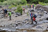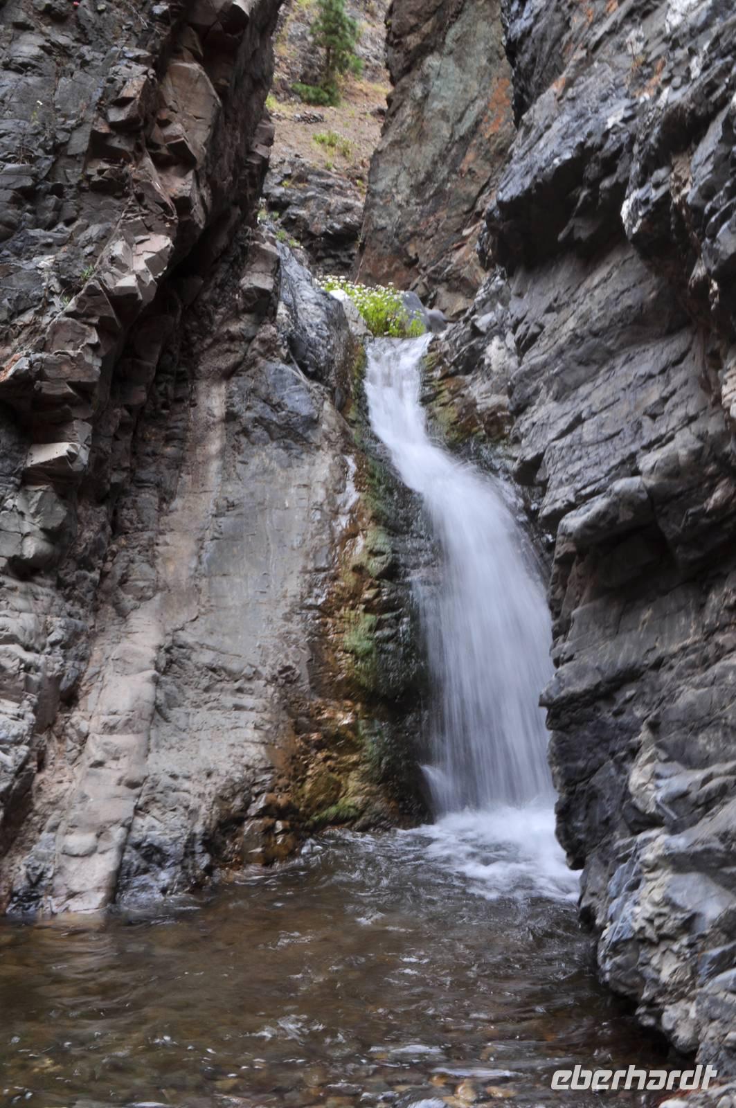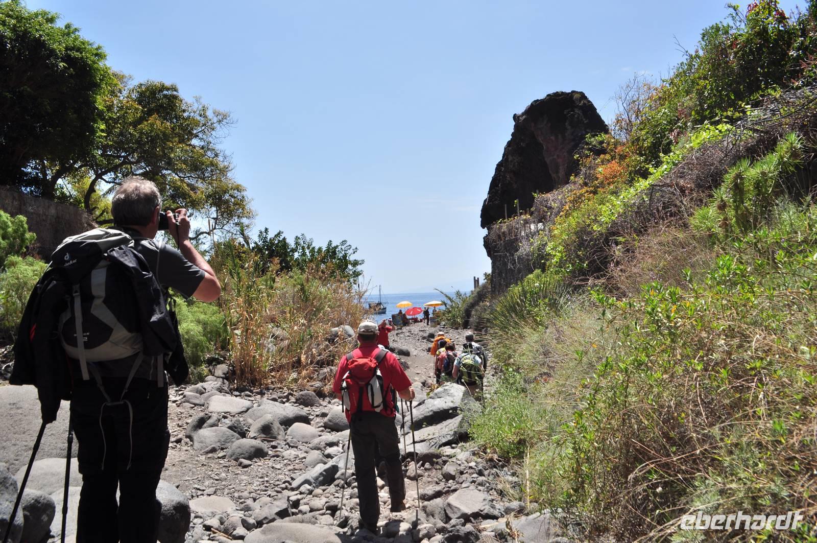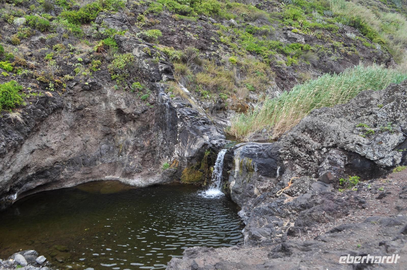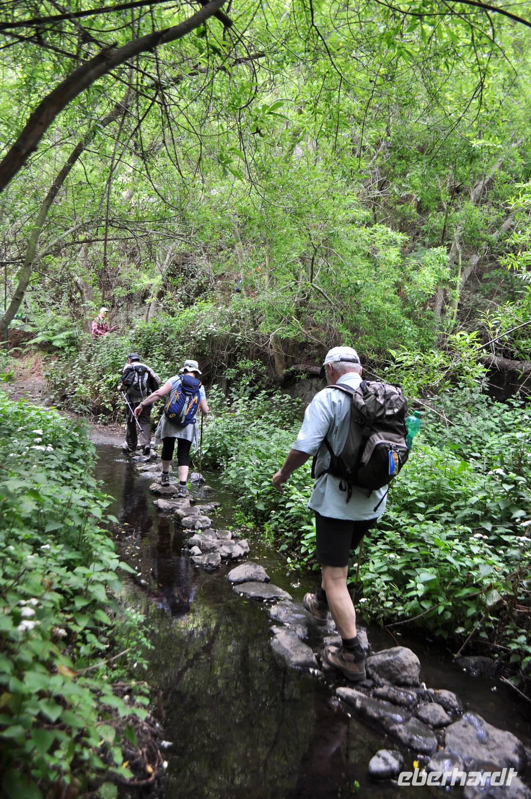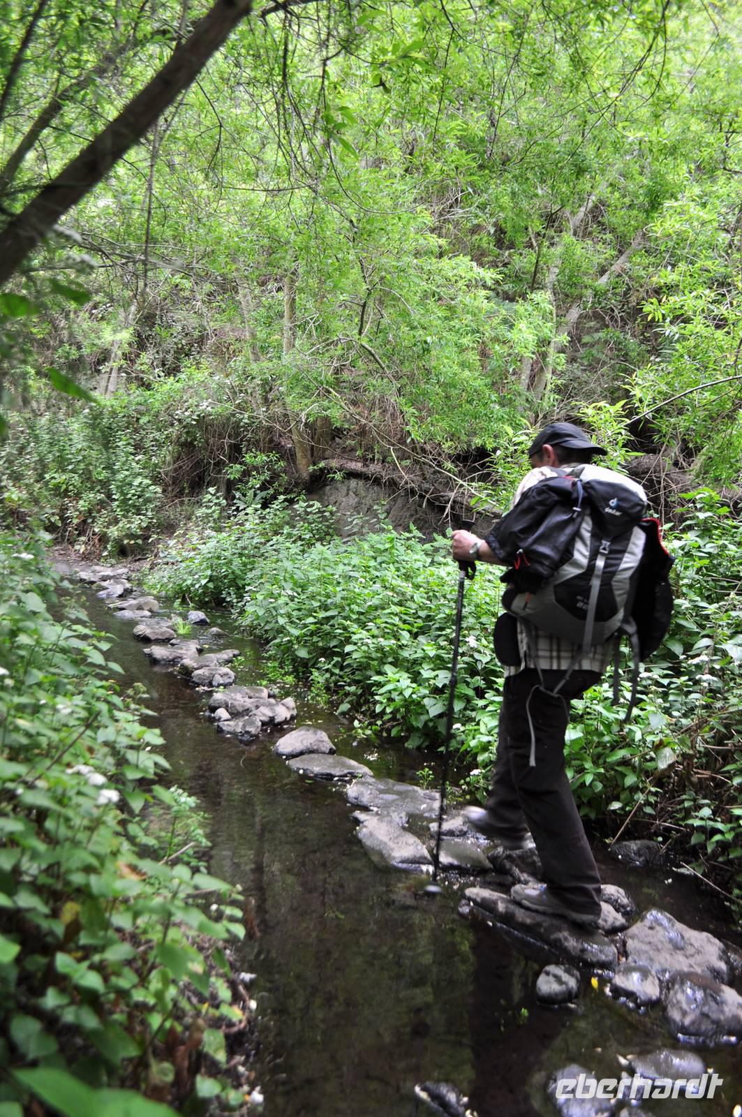 Von nun wandern wir durch das felsige und steinige Flussbett. Hohe feste Wanderschuhe möglichst wasserdicht sind sehr hilfreich. Wir müssen das fließende Gewässer mehrfach queren oder durchwaten. Die Caldera schließt sich an vielen Stellen zu einer engen Klamm, folglich müssen einige Stellen „geklettert" werden. Diese Stellen sind jedoch nie besonders hoch (max. 3-5m), Andreas hilft allen Gästen über die schwierigen Stellen hinweg und sichert alle Gäste, wo es nötig ist. Im letzten Teil weitet sich das Tal und wir wandern durch das Flussbett bestehend aus Geröll. Da das Wasser an mehreren Stellen in Kanälen zur Bewässerung der tieferliegenden Felder abgeführt wird, haben wir ständig wechselnde Wasserstände, manchmal fließt das Wasser unsichtbar durch das Geröll, manchmal als Fluss mit knie- oder hüfttiefen Stellen.