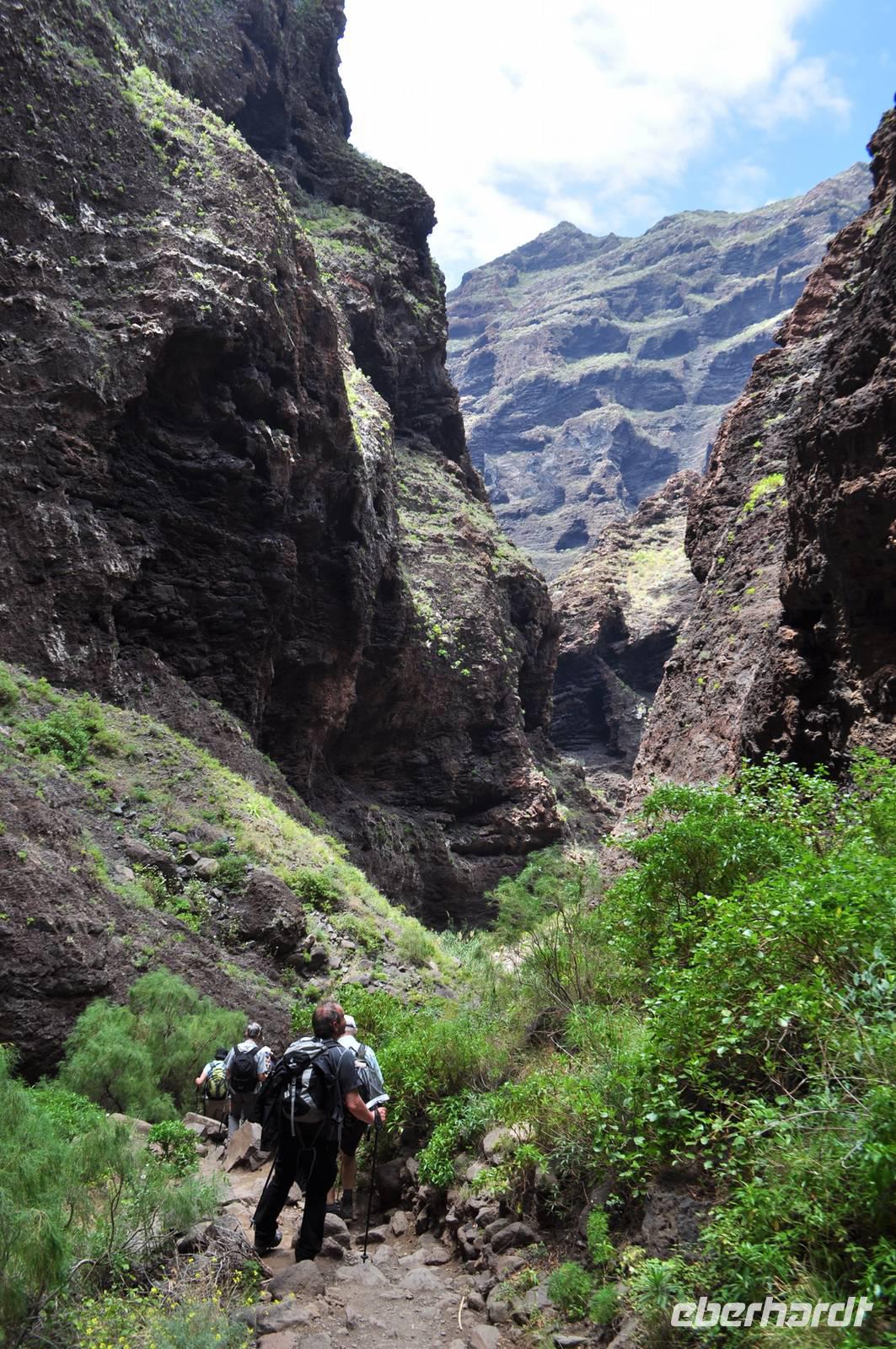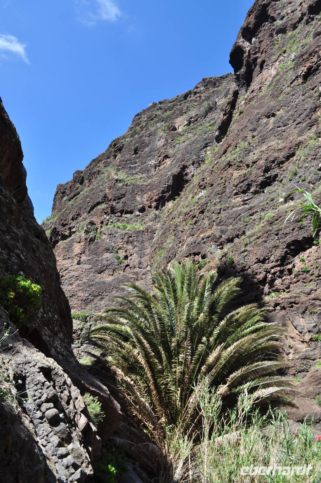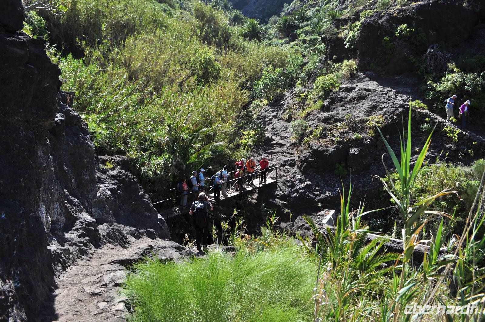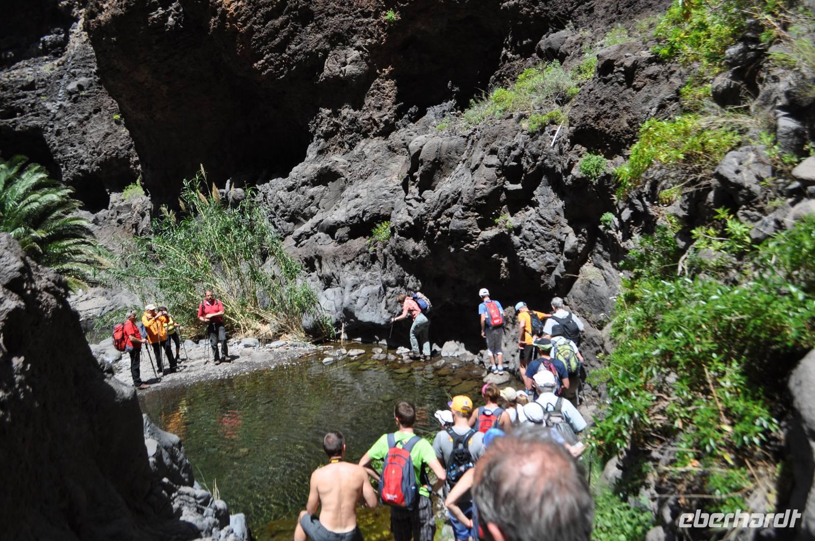 Die oben noch recht breite Schlucht schließt sich zunehmend zu einem tiefen felsigen Canyon. Wir bewegen uns zum Teil steil bergab, immer am Grund der Schlucht. Trittsicherheit ist heute wieder unbedingt nötig, gutes Schuhwerk sowieso. Auch heute müssen wir das fließende Gewässer mehrfach überwinden. Meist über Steine, selten über kleine Brücken. Es gibt einige luftig ausgesetzte Stellen, dann wieder sumpfige Teile oder Passagen über Flussgeröll. Hinter jeder Biegung erwartet uns eine neue atemberaubende Welt. Für uns ist nicht vorstellbar, wie Menschen in den senkrechten Wänden, Bewässerungssysteme angelegt hatten. Ohne den unmenschlichen Druck von Diktator Franco wäre dieser Bau sicherlich nicht möglich gewesen und hat einige Opfer gekostet. Das Schilfrohr und die vielen Dattelpalmen vermitteln stellenweise das Gefühl inmitten einer Wüstenoase zu sein, eingerahmt von den riesigen Felswänden. Othmar bringt uns diese Welt näher, er lockt endemische Vogelarten auf seine Hand oder zeigt uns die typischen Eidechsen der Inseln. Und wir lauschen dem kanarischen Laubfrosch, oder sind es doch nur Tonbänder die Othmar auf seinen vielen Wanderungen hier vielleicht versteckt hat? Später wird er uns beweisen, dass es den kleinen kanarischen Laubfrosch mit seiner kräftigen Stimme tatsächlich gibt. Othmar ist sehr umsichtig und hilft allen über die kritischen Stellen. Selbst kann man sich gut an den Zahlenschildern orientieren. Die Schlucht ist von 2 - 56 nummeriert (nur gerade Zahlen). So hat jeder selbst einen guten Überblick, was ihn noch erwartet. Ohne größere Probleme erreichen wir alle sicher den erfrischenden Atlantik. An einem Bad im blauen Nass kann uns alle nichts mehr hindern. So einladend die Angelegenheit wirkt, wärmer als 20 °C ist das Wasser ganz sicher noch nicht, wenn überhaupt. Bei aller Schönheit dieser Masca Schlucht, waren wir überrascht über die große Anzahl von Wanderern in dieser Schlucht. Wobei Wanderer der völlig falsche Ausdruck ist. Wer mit Turnschuhen oder Badeschlappen oder noch abenteuerlicherem Schuhwerk diese Wanderung angeht handelt unverantwortlich, leider blieben uns solche Anblicke an diesem Tag nicht erspart.