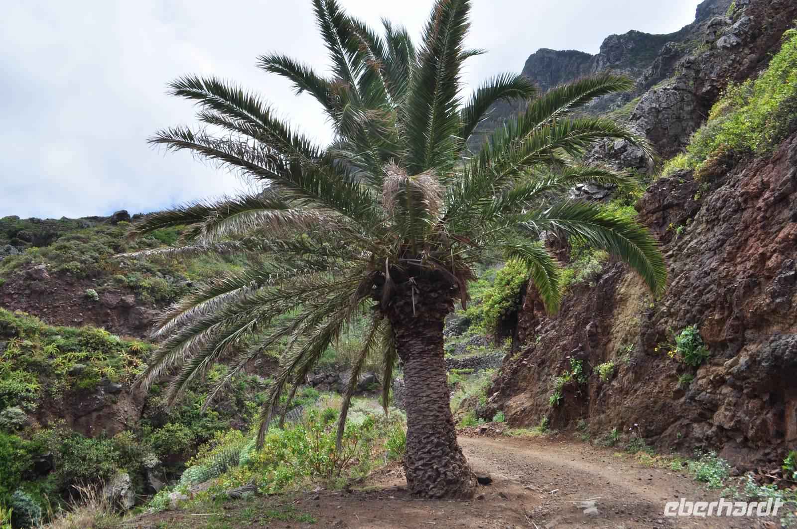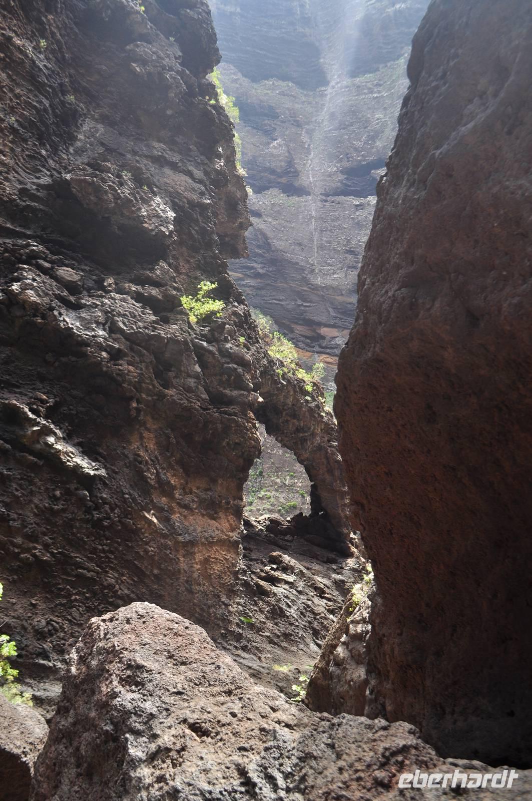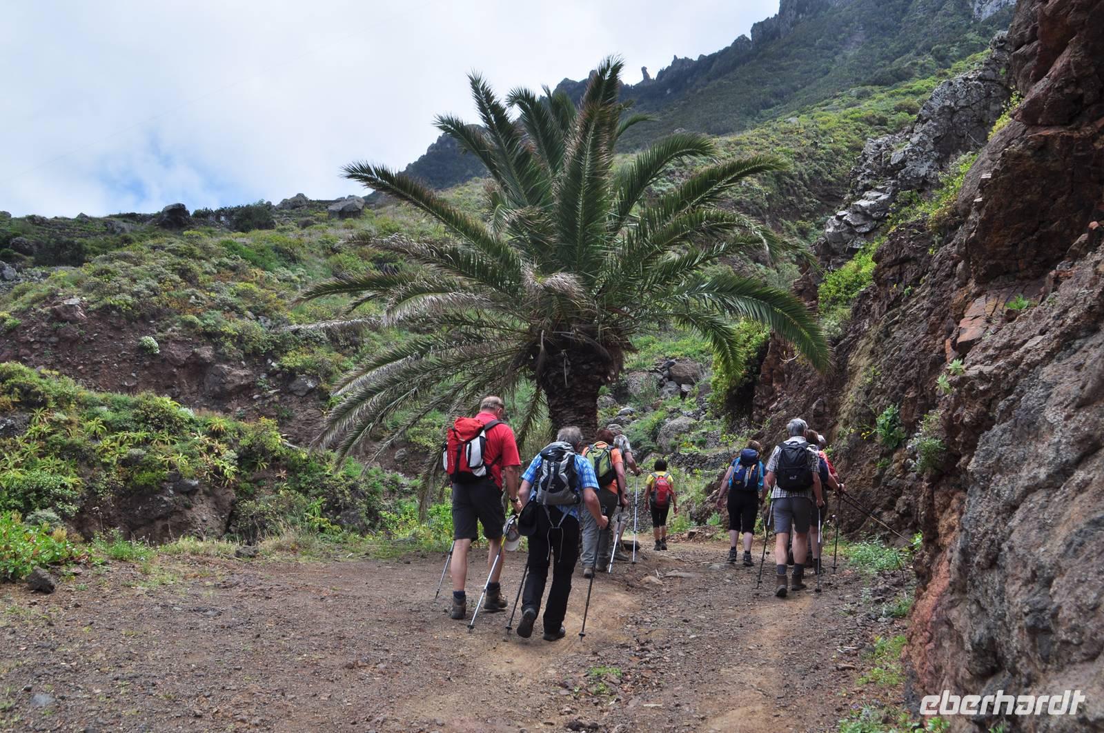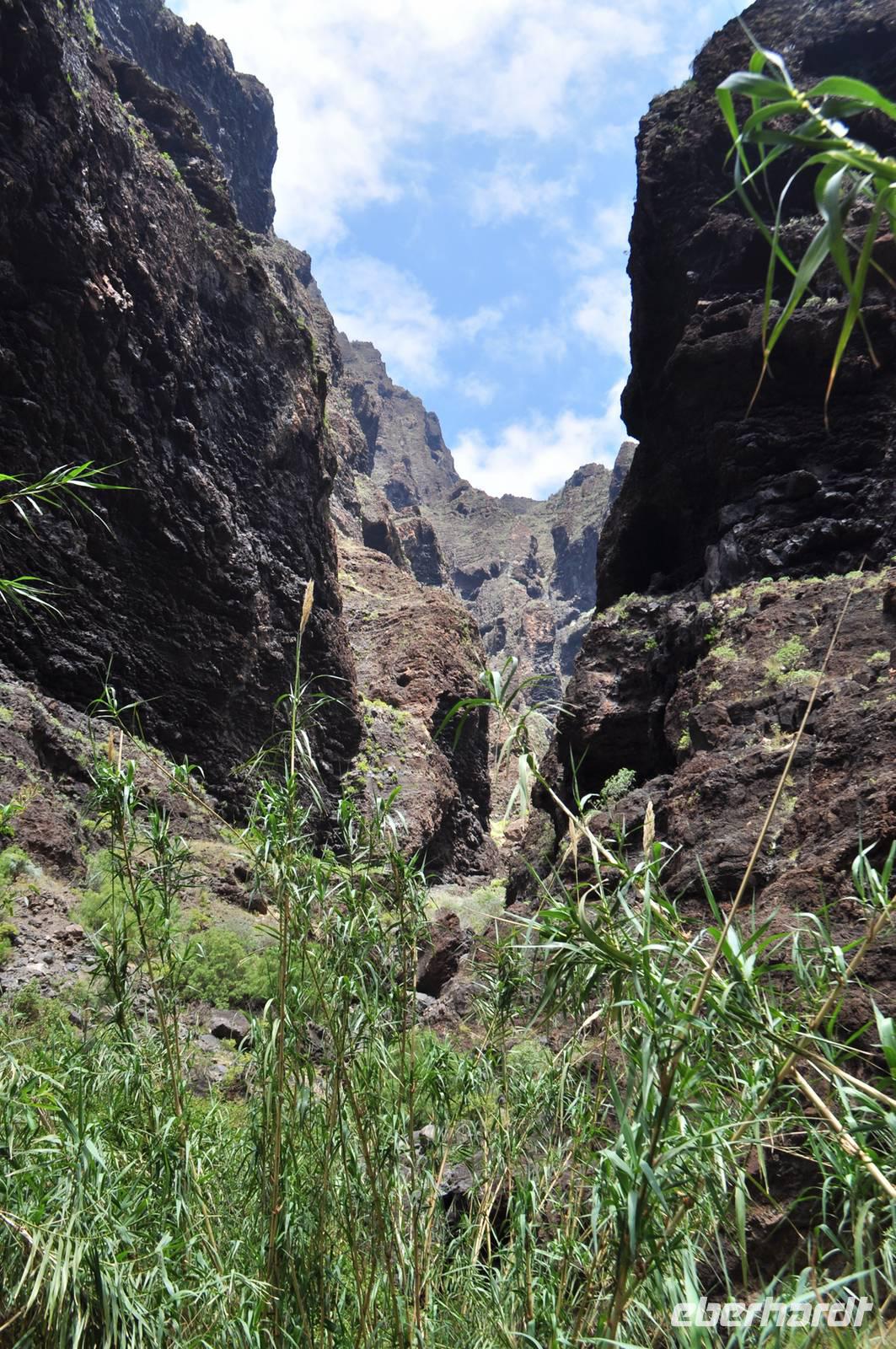 Die oben noch recht breite Schlucht schließt sich zunehmend zu einem tiefen felsigen Canyon. Wir bewegen uns zum Teil steil bergab, immer am Grund der Schlucht. Trittsicherheit ist heute wieder unbedingt nötig, gutes Schuhwerk sowieso. Auch heute müssen wir das fließende Gewässer mehrfach überwinden. Meist über Steine, selten über kleine Brücken. Es gibt einige luftig ausgesetzte Stellen, dann wieder sumpfige Teile oder Passagen über Flussgeröll. Hinter jeder Biegung erwartet uns eine neue atemberaubende Welt. Für uns ist nicht vorstellbar, wie Menschen in den senkrechten Wänden, Bewässerungssysteme angelegt hatten. Ohne den unmenschlichen Druck von Diktator Franco wäre dieser Bau sicherlich nicht möglich gewesen und hat einige Opfer gekostet. Das Schilfrohr und die vielen Dattelpalmen vermitteln stellenweise das Gefühl inmitten einer Wüstenoase zu sein, eingerahmt von den riesigen Felswänden. Othmar bringt uns diese Welt näher, er lockt endemische Vogelarten auf seine Hand oder zeigt uns die typischen Eidechsen der Inseln. Und wir lauschen dem kanarischen Laubfrosch, oder sind es doch nur Tonbänder die Othmar auf seinen vielen Wanderungen hier vielleicht versteckt hat? Später wird er uns beweisen, dass es den kleinen kanarischen Laubfrosch mit seiner kräftigen Stimme tatsächlich gibt. Othmar ist sehr umsichtig und hilft allen über die kritischen Stellen. Selbst kann man sich gut an den Zahlenschildern orientieren. Die Schlucht ist von 2 - 56 nummeriert (nur gerade Zahlen). So hat jeder selbst einen guten Überblick, was ihn noch erwartet. Ohne größere Probleme erreichen wir alle sicher den erfrischenden Atlantik. An einem Bad im blauen Nass kann uns alle nichts mehr hindern. So einladend die Angelegenheit wirkt, wärmer als 20 °C ist das Wasser ganz sicher noch nicht, wenn überhaupt. Bei aller Schönheit dieser Masca Schlucht, waren wir überrascht über die große Anzahl von Wanderern in dieser Schlucht. Wobei Wanderer der völlig falsche Ausdruck ist. Wer mit Turnschuhen oder Badeschlappen oder noch abenteuerlicherem Schuhwerk diese Wanderung angeht handelt unverantwortlich, leider blieben uns solche Anblicke an diesem Tag nicht erspart.