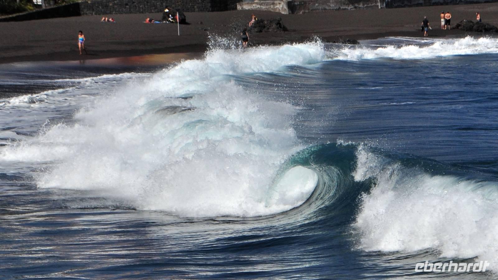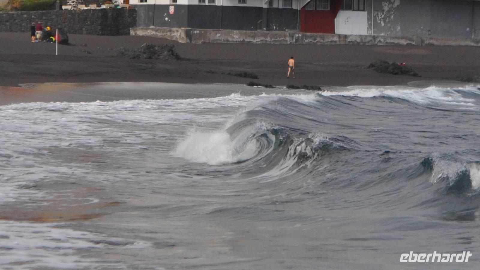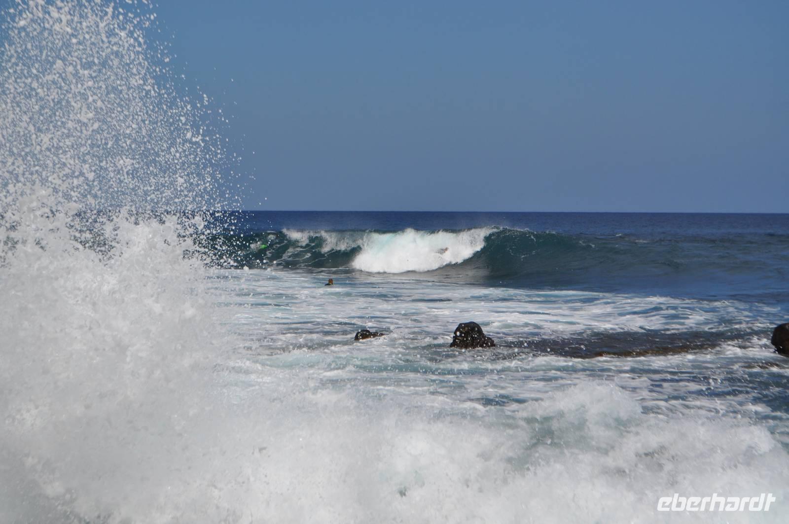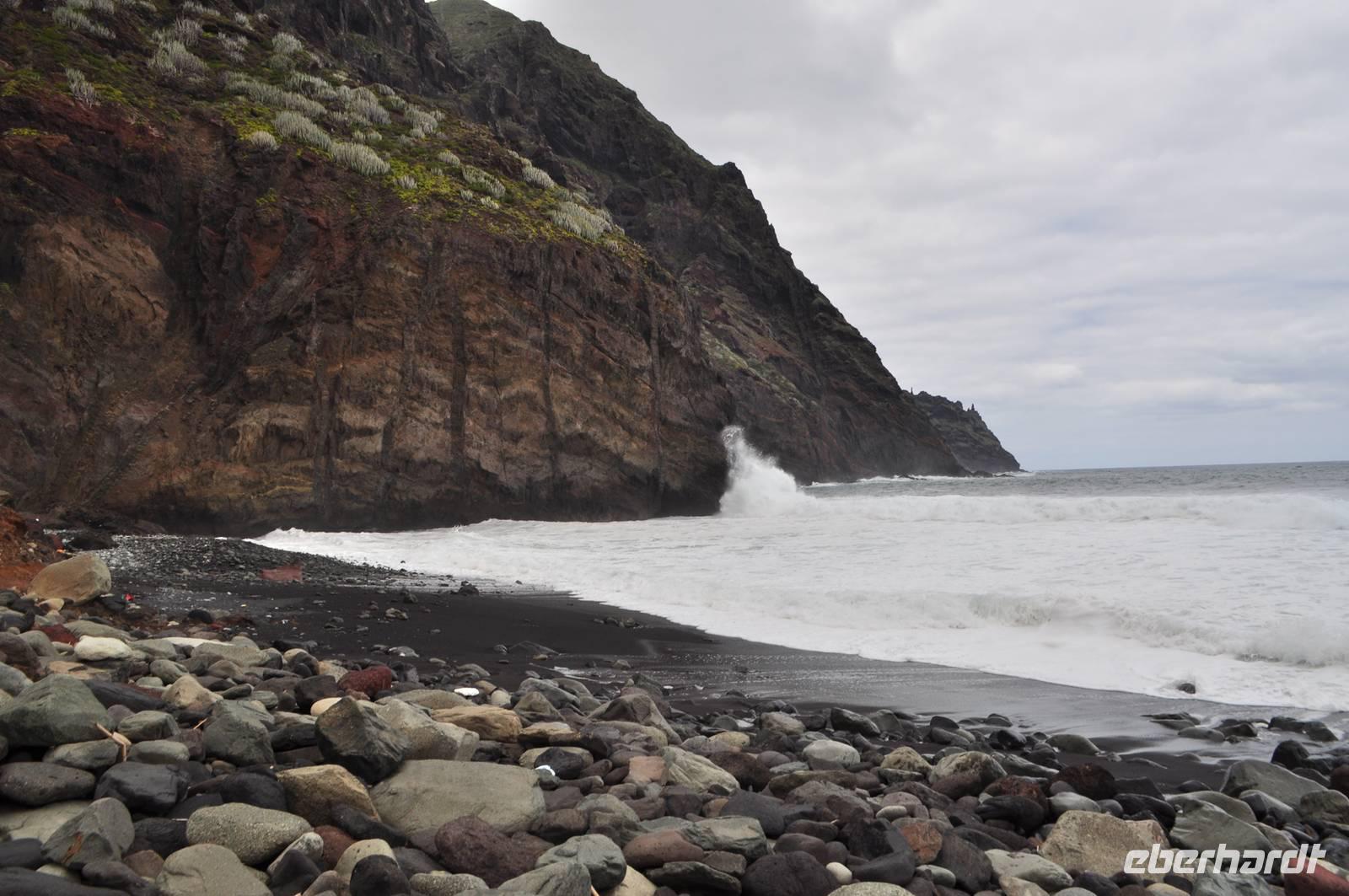 Die oben noch recht breite Schlucht schließt sich zunehmend zu einem tiefen felsigen Canyon. Wir bewegen uns zum Teil steil bergab, immer am Grund der Schlucht. Trittsicherheit ist heute wieder unbedingt nötig, gutes Schuhwerk sowieso. Auch heute müssen wir das fließende Gewässer mehrfach überwinden. Meist über Steine, selten über kleine Brücken. Es gibt einige luftig ausgesetzte Stellen, dann wieder sumpfige Teile oder Passagen über Flussgeröll. Hinter jeder Biegung erwartet uns eine neue atemberaubende Welt. Für uns ist nicht vorstellbar, wie Menschen in den senkrechten Wänden, Bewässerungssysteme angelegt hatten. Ohne den unmenschlichen Druck von Diktator Franco wäre dieser Bau sicherlich nicht möglich gewesen und hat einige Opfer gekostet. Das Schilfrohr und die vielen Dattelpalmen vermitteln stellenweise das Gefühl inmitten einer Wüstenoase zu sein, eingerahmt von den riesigen Felswänden. Othmar bringt uns diese Welt näher, er lockt endemische Vogelarten auf seine Hand oder zeigt uns die typischen Eidechsen der Inseln. Und wir lauschen dem kanarischen Laubfrosch, oder sind es doch nur Tonbänder die Othmar auf seinen vielen Wanderungen hier vielleicht versteckt hat? Später wird er uns beweisen, dass es den kleinen kanarischen Laubfrosch mit seiner kräftigen Stimme tatsächlich gibt. Othmar ist sehr umsichtig und hilft allen über die kritischen Stellen. Selbst kann man sich gut an den Zahlenschildern orientieren. Die Schlucht ist von 2 - 56 nummeriert (nur gerade Zahlen). So hat jeder selbst einen guten Überblick, was ihn noch erwartet. Ohne größere Probleme erreichen wir alle sicher den erfrischenden Atlantik. An einem Bad im blauen Nass kann uns alle nichts mehr hindern. So einladend die Angelegenheit wirkt, wärmer als 20 °C ist das Wasser ganz sicher noch nicht, wenn überhaupt. Bei aller Schönheit dieser Masca Schlucht, waren wir überrascht über die große Anzahl von Wanderern in dieser Schlucht. Wobei Wanderer der völlig falsche Ausdruck ist. Wer mit Turnschuhen oder Badeschlappen oder noch abenteuerlicherem Schuhwerk diese Wanderung angeht handelt unverantwortlich, leider blieben uns solche Anblicke an diesem Tag nicht erspart.