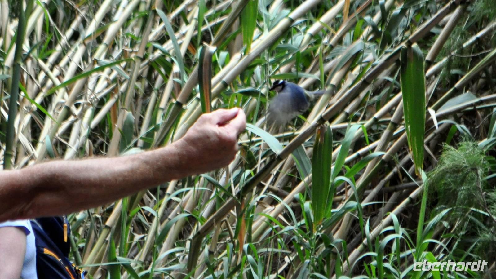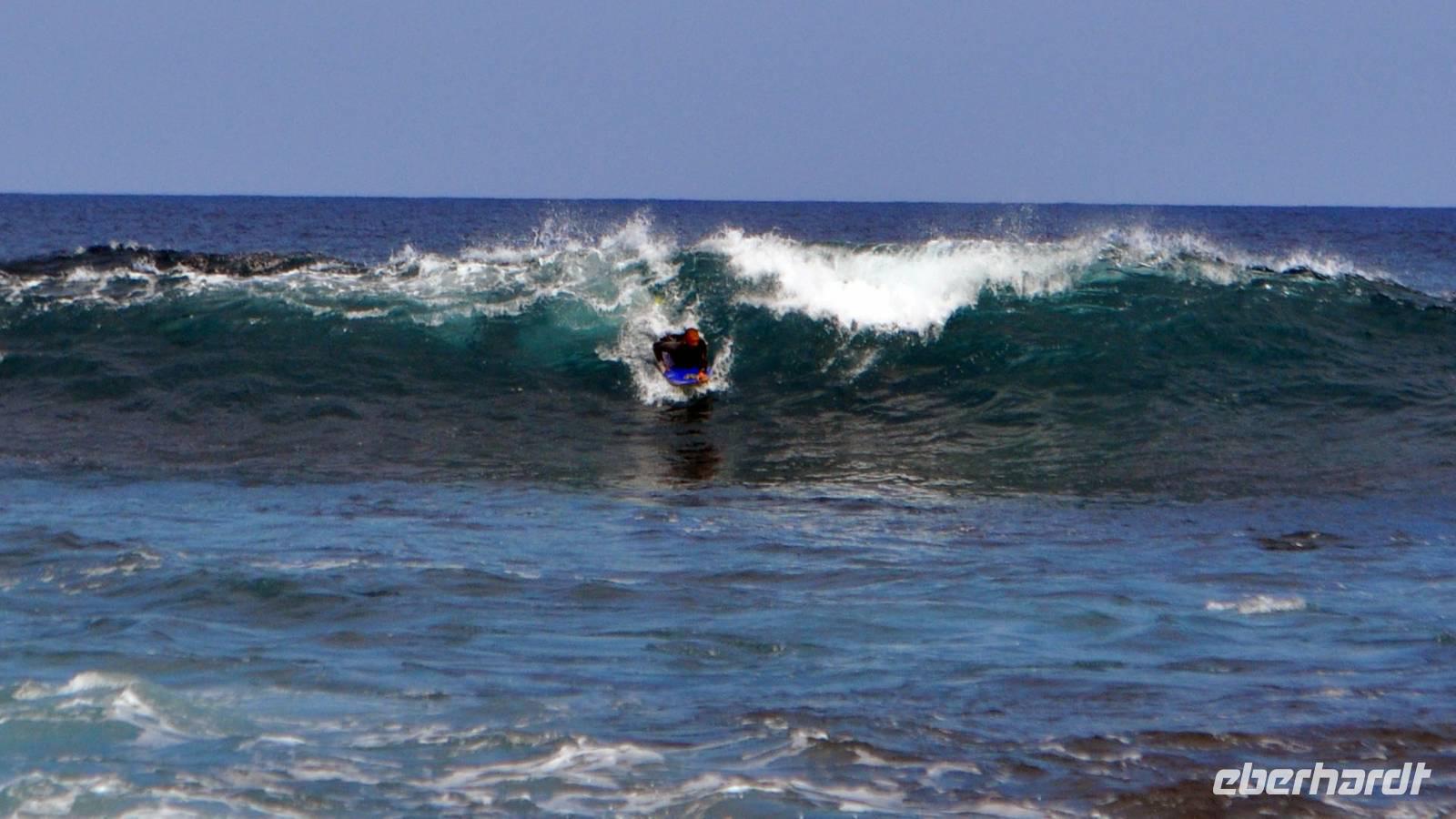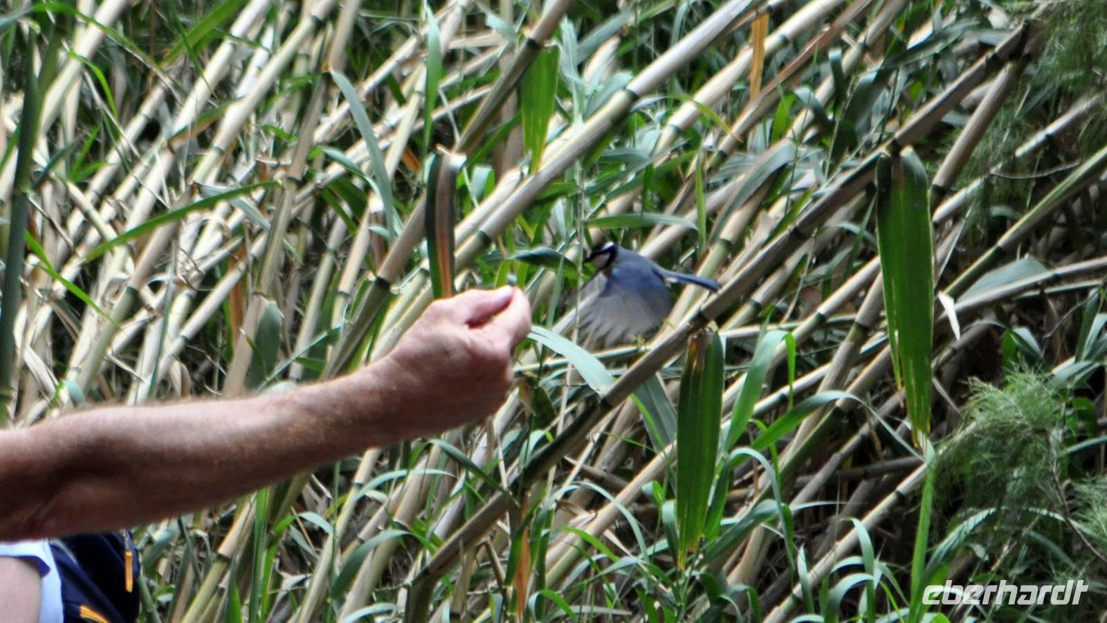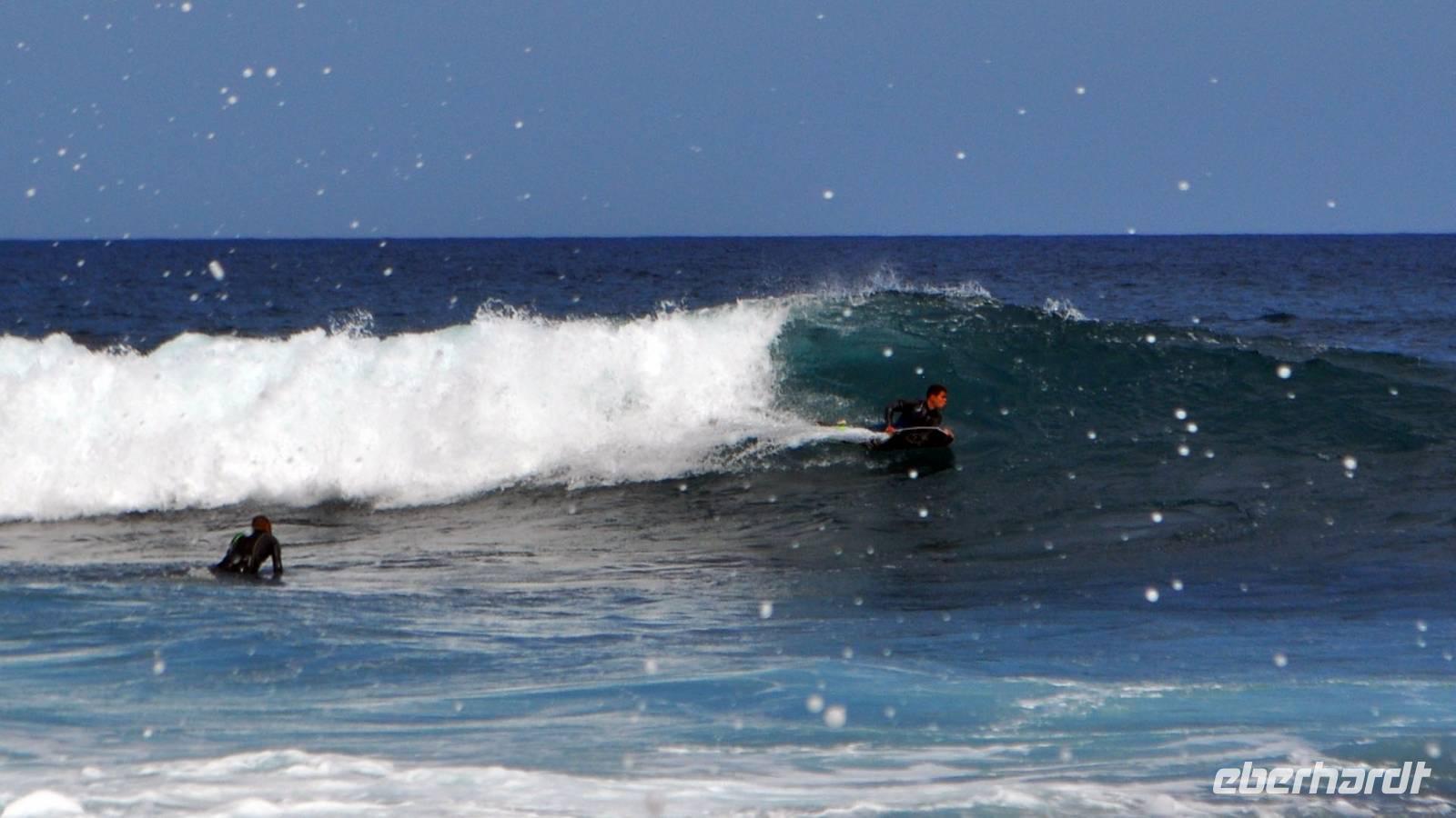 Die oben noch recht breite Schlucht schließt sich zunehmend zu einem tiefen felsigen Canyon. Wir bewegen uns zum Teil steil bergab, immer am Grund der Schlucht. Trittsicherheit ist heute wieder unbedingt nötig, gutes Schuhwerk sowieso. Auch heute müssen wir das fließende Gewässer mehrfach überwinden. Meist über Steine, selten über kleine Brücken. Es gibt einige luftig ausgesetzte Stellen, dann wieder sumpfige Teile oder Passagen über Flussgeröll. Hinter jeder Biegung erwartet uns eine neue atemberaubende Welt. Für uns ist nicht vorstellbar, wie Menschen in den senkrechten Wänden, Bewässerungssysteme angelegt hatten. Ohne den unmenschlichen Druck von Diktator Franco wäre dieser Bau sicherlich nicht möglich gewesen und hat einige Opfer gekostet. Das Schilfrohr und die vielen Dattelpalmen vermitteln stellenweise das Gefühl inmitten einer Wüstenoase zu sein, eingerahmt von den riesigen Felswänden. Othmar bringt uns diese Welt näher, er lockt endemische Vogelarten auf seine Hand oder zeigt uns die typischen Eidechsen der Inseln. Und wir lauschen dem kanarischen Laubfrosch, oder sind es doch nur Tonbänder die Othmar auf seinen vielen Wanderungen hier vielleicht versteckt hat? Später wird er uns beweisen, dass es den kleinen kanarischen Laubfrosch mit seiner kräftigen Stimme tatsächlich gibt. Othmar ist sehr umsichtig und hilft allen über die kritischen Stellen. Selbst kann man sich gut an den Zahlenschildern orientieren. Die Schlucht ist von 2 - 56 nummeriert (nur gerade Zahlen). So hat jeder selbst einen guten Überblick, was ihn noch erwartet. Ohne größere Probleme erreichen wir alle sicher den erfrischenden Atlantik. An einem Bad im blauen Nass kann uns alle nichts mehr hindern. So einladend die Angelegenheit wirkt, wärmer als 20 °C ist das Wasser ganz sicher noch nicht, wenn überhaupt. Bei aller Schönheit dieser Masca Schlucht, waren wir überrascht über die große Anzahl von Wanderern in dieser Schlucht. Wobei Wanderer der völlig falsche Ausdruck ist. Wer mit Turnschuhen oder Badeschlappen oder noch abenteuerlicherem Schuhwerk diese Wanderung angeht handelt unverantwortlich, leider blieben uns solche Anblicke an diesem Tag nicht erspart.