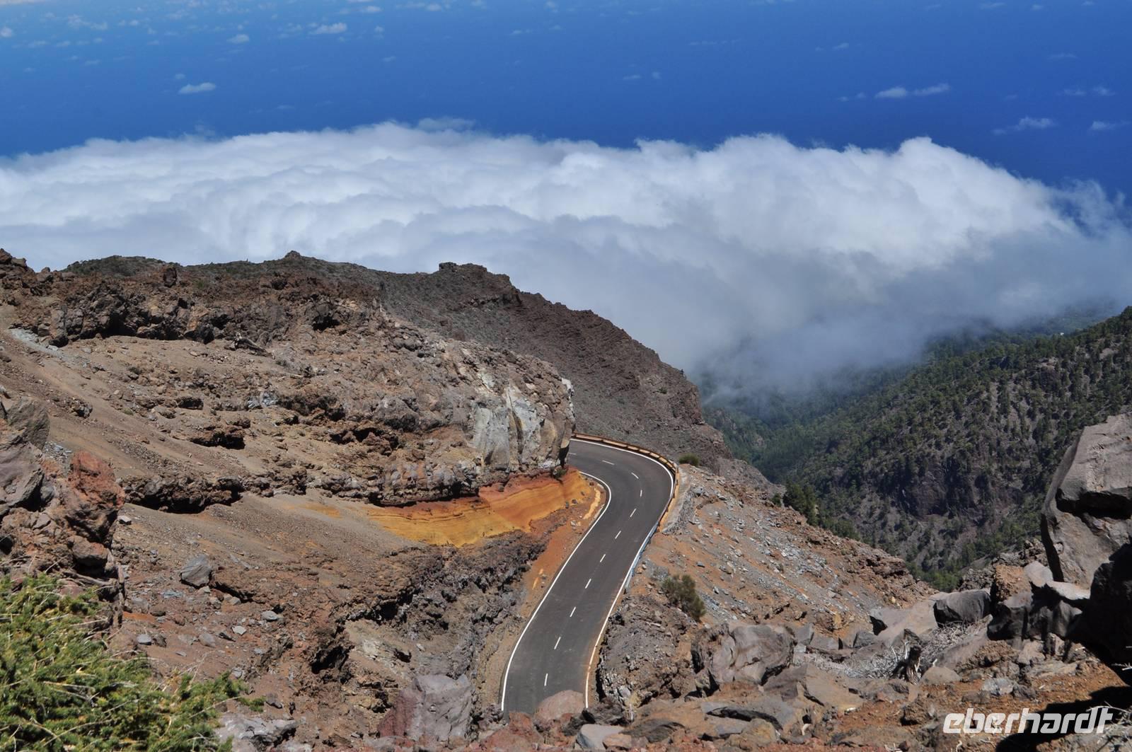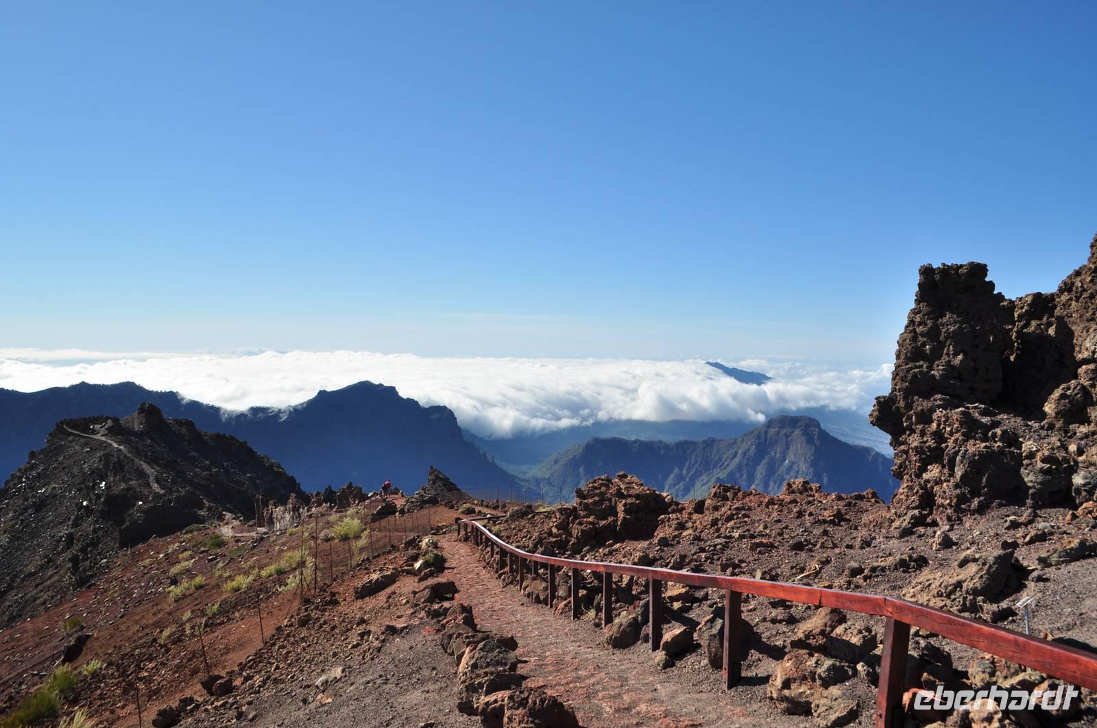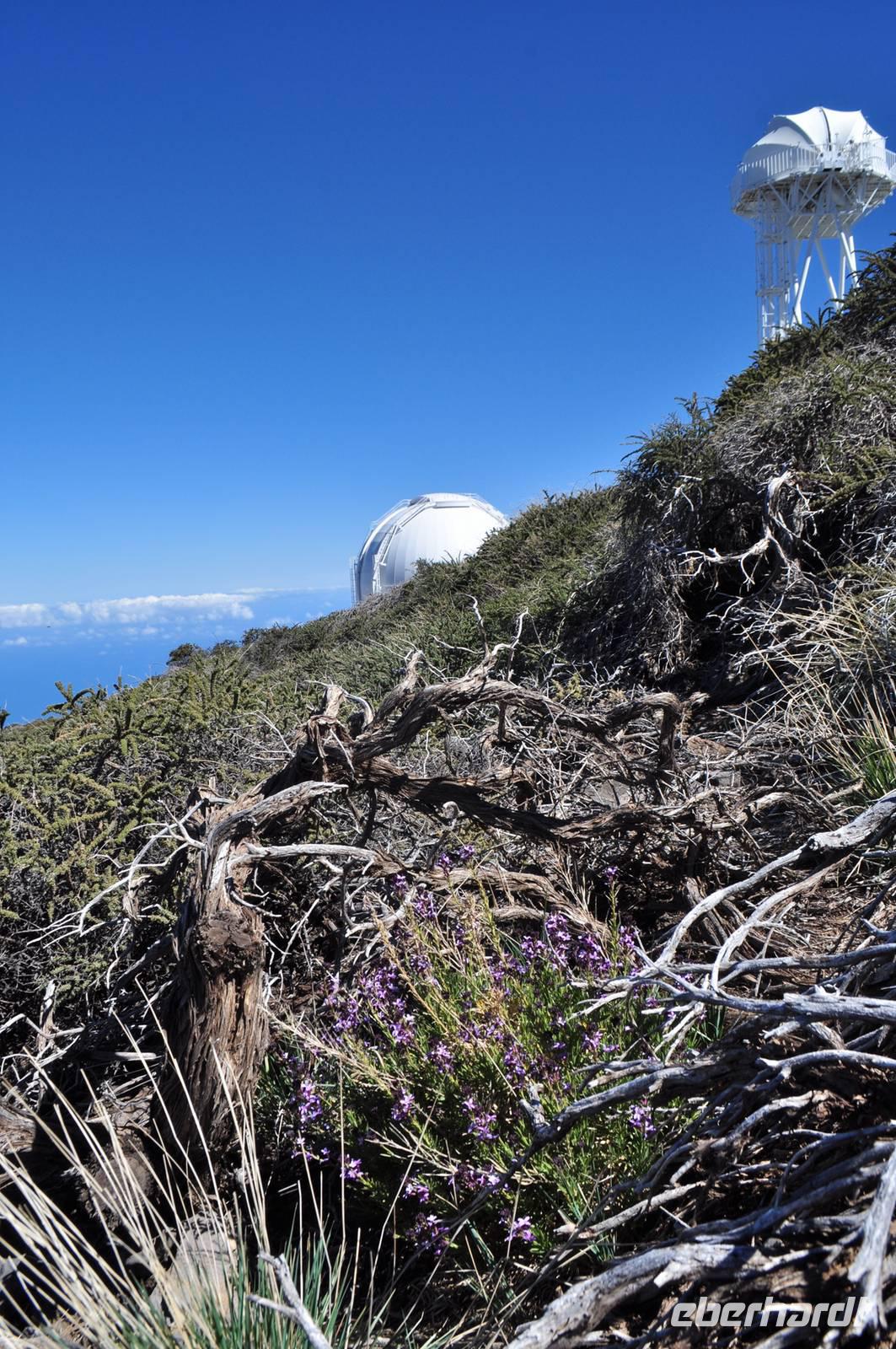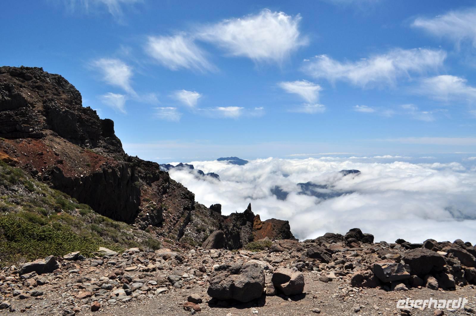 La Palmas, am Rande der berühmten Caldera de Taburiente. Dieser Berg ist einer der wichtigsten Stützpunkte für die internationale Weltraumforschung. Der klare Himmel, wenig beeinflusst durch atmosphärische Verzerrung und Lichtverschmutzung zählt er zu den idealsten Orten auf der Welt für Sternbeobachtungen. Viele renommierte Institute betreiben dort oben eine Reihe von Observatorien. Die Institute befinden sich buchstäblich über den Wolken. Auch wir erleben das Phänomen des „Passats". Die Passatwolken liegen in einer Höhe von 1.600 - 2.000m somit unter uns. Vom Roque de los Muchachos wandern wir entlang des Caldera Randes zum Pico de la Cruz