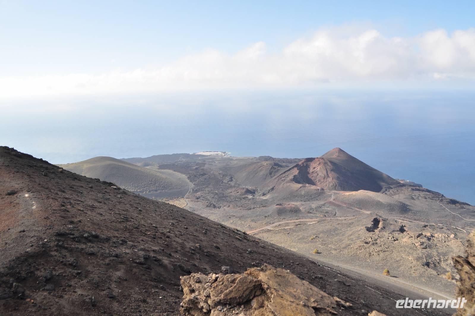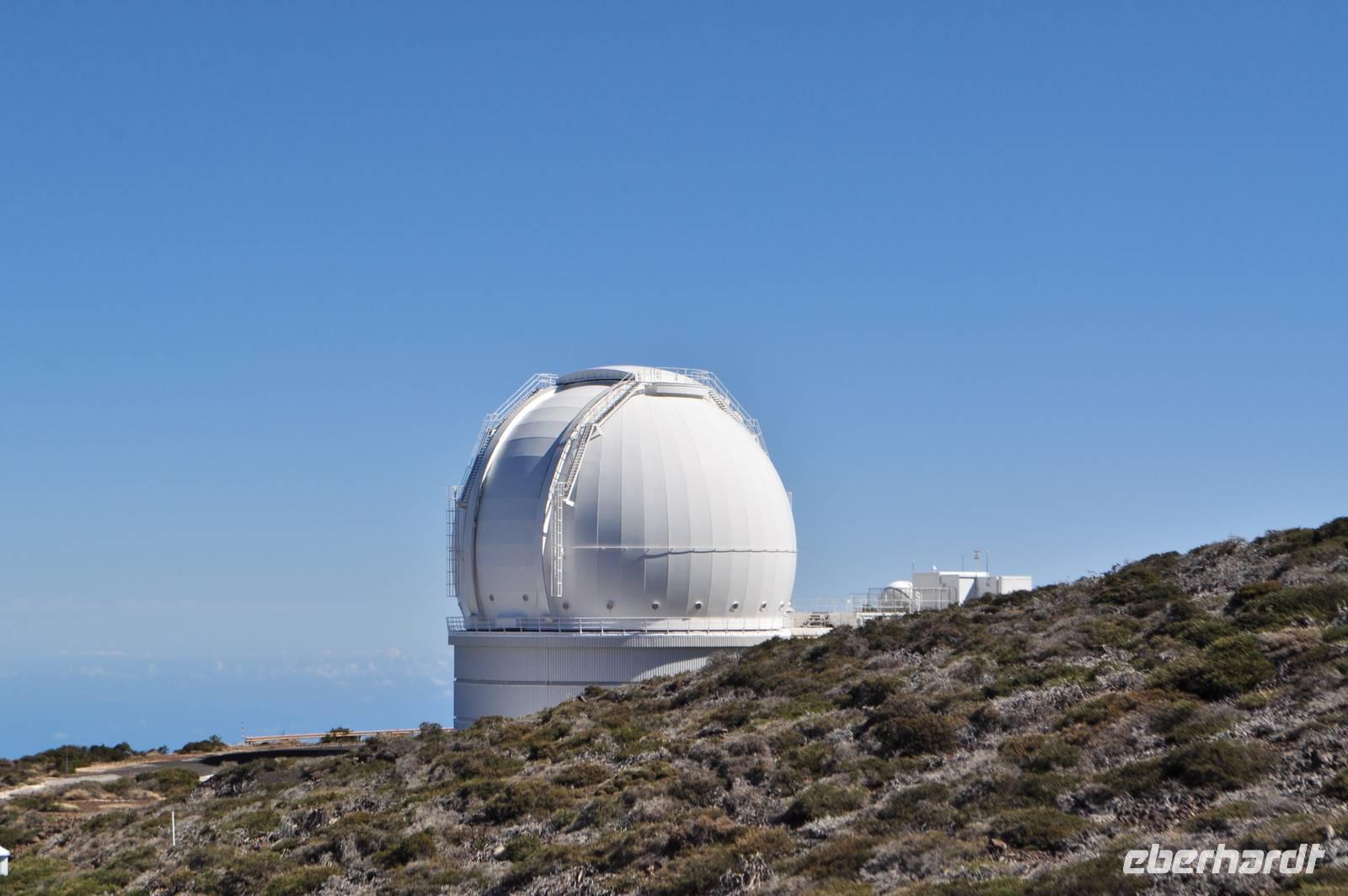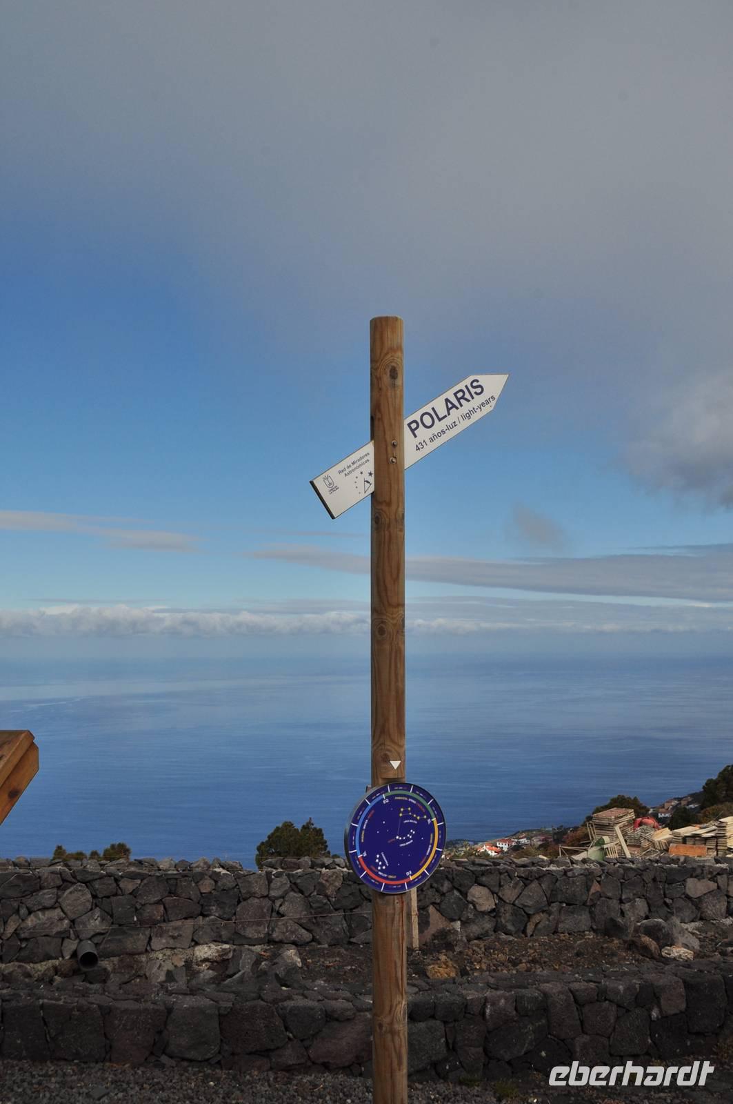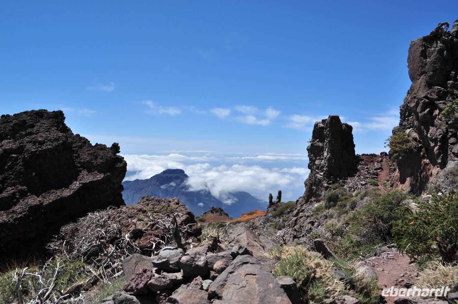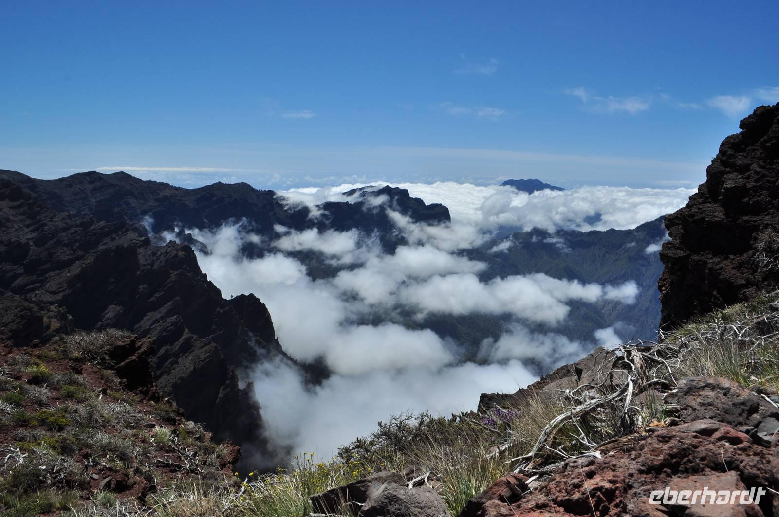 La Palmas, am Rande der berühmten Caldera de Taburiente. Dieser Berg ist einer der wichtigsten Stützpunkte für die internationale Weltraumforschung. Der klare Himmel, wenig beeinflusst durch atmosphärische Verzerrung und Lichtverschmutzung zählt er zu den idealsten Orten auf der Welt für Sternbeobachtungen. Viele renommierte Institute betreiben dort oben eine Reihe von Observatorien. Die Institute befinden sich buchstäblich über den Wolken. Auch wir erleben das Phänomen des „Passats". Die Passatwolken liegen in einer Höhe von 1.600 - 2.000m somit unter uns. Vom Roque de los Muchachos wandern wir entlang des Caldera Randes zum Pico de la Cruz