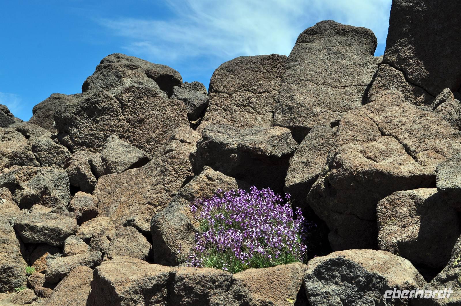 Wir machen einen Fotostopp an der Basalt-Margerite. Eine mehrere Meter große Felsformation in besagter Blütenform. Weiter geht es durch die Passatwolkendecke hinauf in die Caldera. Uns wird klar, welche Herausforderung wir mit dem Aufstieg zum Gipfel des Pico del Teide, dem höchsten Berg und Vulkans von Spanien, angenommen haben.
