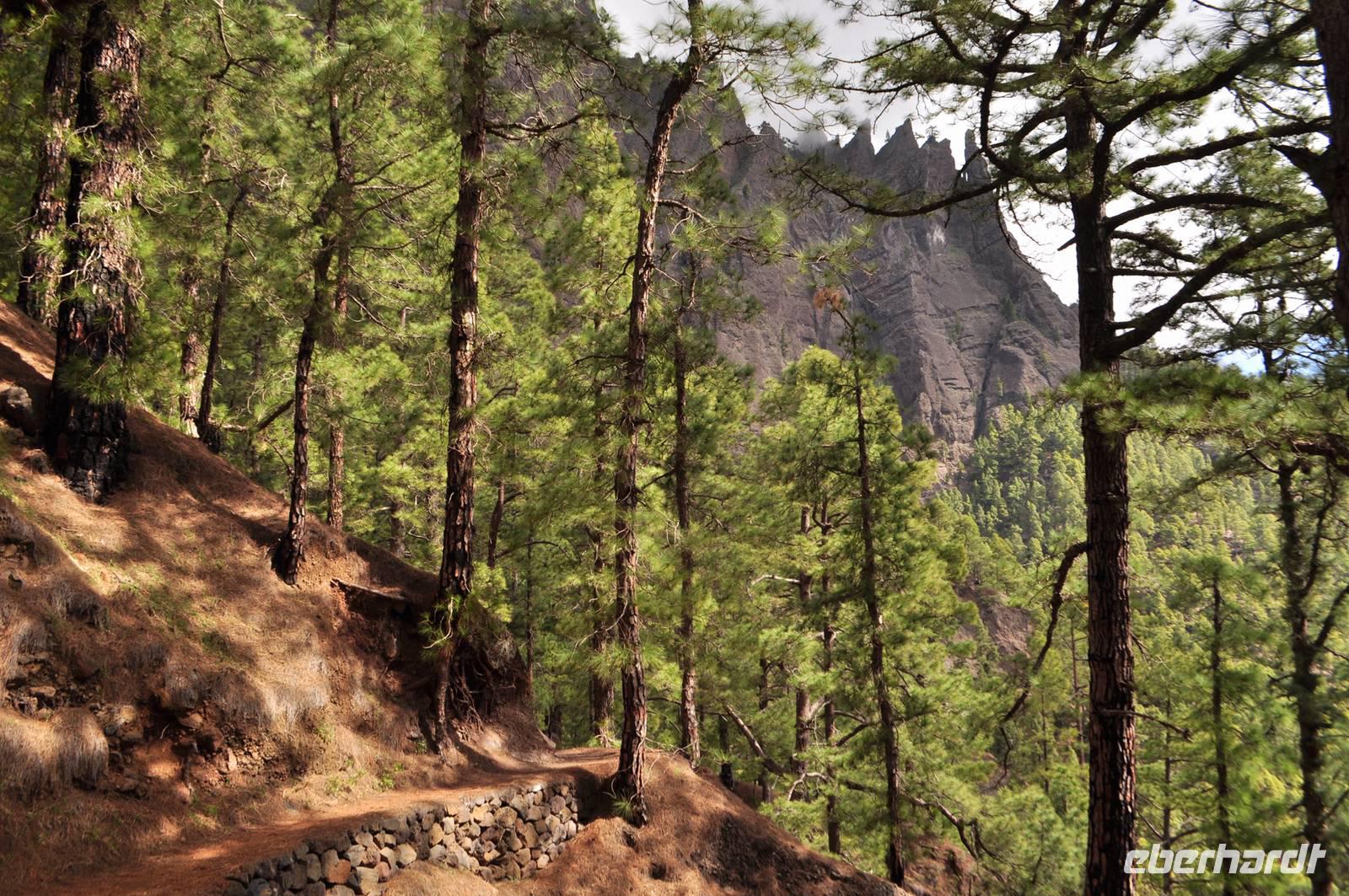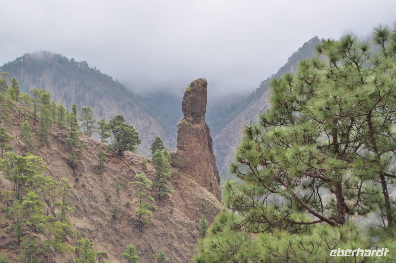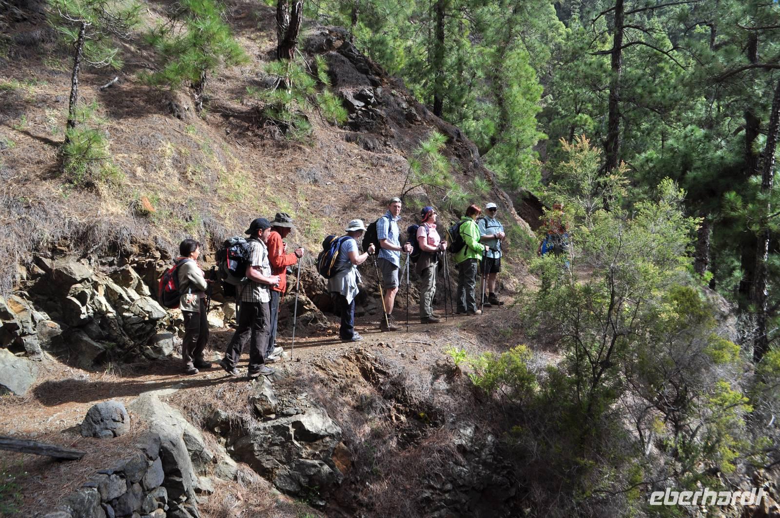 In Tazacorte biegen wir in den Nationalpark Caldera di Taburiente ab. In engen Serpentinen, die nur Kleinbusse befahren können schrauben wir uns den Berg hinauf zum Nationalparkeingang. Dort werden wir registriert. Im Notfall z. B. bei plötzlichem Wetterumschwung ist der Verwaltung bekannt, wer im Park unterwegs ist und kann ggf. Hilfe schicken. Vom Eingang geht es wieder in Serpentinen hinunter zur Talsohle der Schlucht der Ängste. Unser Bus durchfährt das trockene Flussbett, bevor er sich auf der anderen Flussseite wieder in Serpentinen bis auf ca. 1.300m hinauf schraubt. Am Endpunkt der „Straße" beginnt unsere Wanderung in die Caldera. Es geht durch dichten kanarischen Pinienwald. Der ganze Wald duftet angenehm nach Pinie. Die kanarische Pinie ist auf den Kanaren endemisch und zeichnet sich durch ihre Feuerresistenz aus. Auch auf den Inseln kommt es regelmäßig zu Waldbränden. Die herumliegenden Nadeln entzünden sich wie Benzin. Im Falle eines Brandes rast eine Feuerwalze in hoher Geschwindigkeit die Hänge hinauf. Die Bäume verkohlen, verbrennen aber nicht. Der Clou ist die Borke, sie ist so beschaffen, dass die Flammen dem Baum nichts anhaben können. Außerdem besitzt der Baum „ruhende Knospen", dabei handelt es sich um in der Borke versteckte Astansätze. Nach einem Brand wachsen aus Ihnen bereits nach wenigen Monaten neue Äste mit neuem Grün.