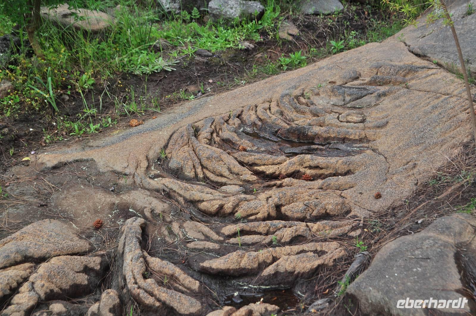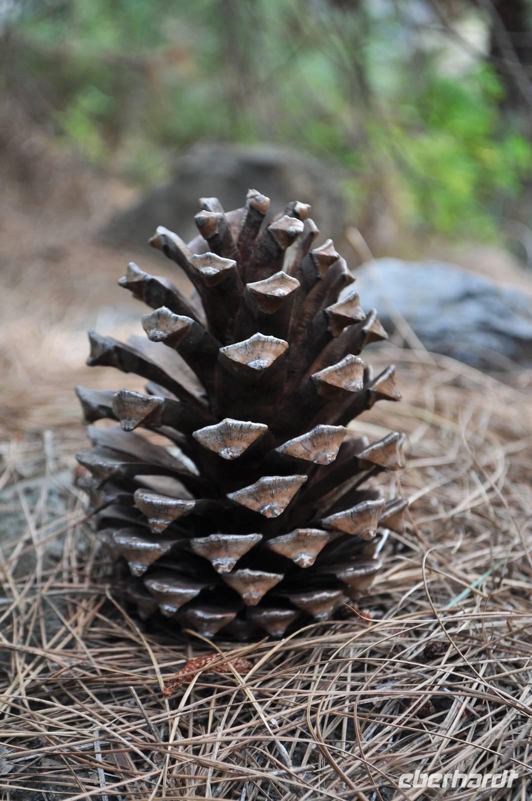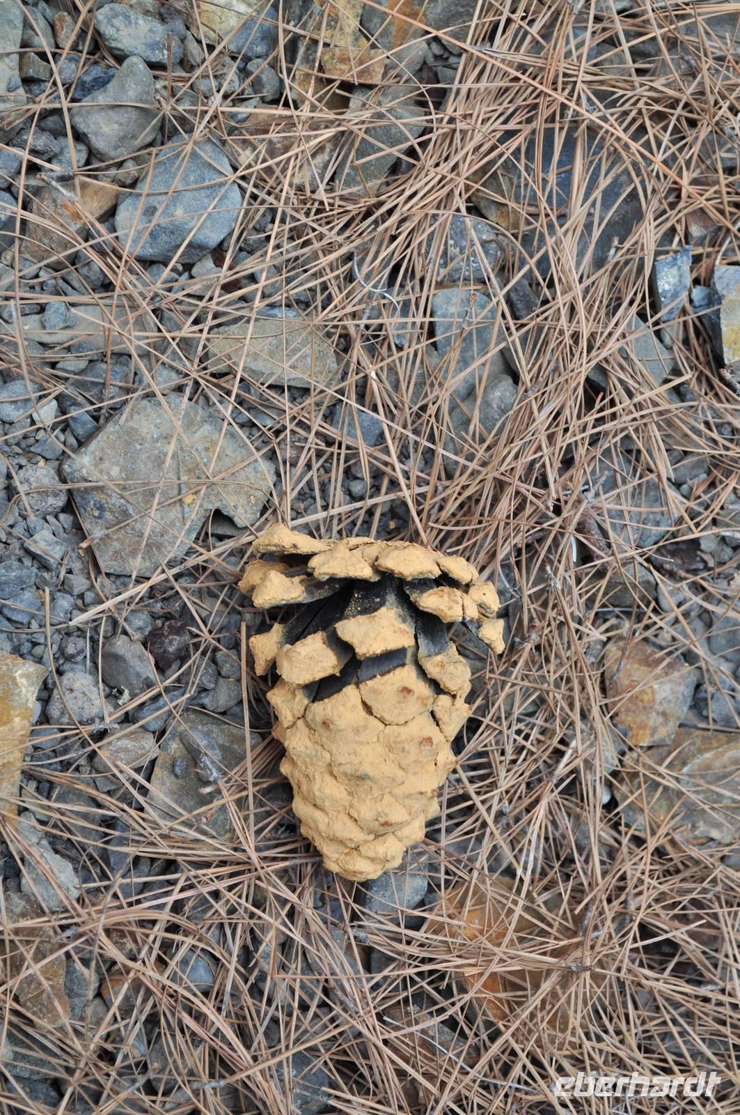 In Tazacorte biegen wir in den Nationalpark Caldera di Taburiente ab. In engen Serpentinen, die nur Kleinbusse befahren können schrauben wir uns den Berg hinauf zum Nationalparkeingang. Dort werden wir registriert. Im Notfall z. B. bei plötzlichem Wetterumschwung ist der Verwaltung bekannt, wer im Park unterwegs ist und kann ggf. Hilfe schicken. Vom Eingang geht es wieder in Serpentinen hinunter zur Talsohle der Schlucht der Ängste. Unser Bus durchfährt das trockene Flussbett, bevor er sich auf der anderen Flussseite wieder in Serpentinen bis auf ca. 1.300m hinauf schraubt. Am Endpunkt der „Straße" beginnt unsere Wanderung in die Caldera. Es geht durch dichten kanarischen Pinienwald. Der ganze Wald duftet angenehm nach Pinie. Die kanarische Pinie ist auf den Kanaren endemisch und zeichnet sich durch ihre Feuerresistenz aus. Auch auf den Inseln kommt es regelmäßig zu Waldbränden. Die herumliegenden Nadeln entzünden sich wie Benzin. Im Falle eines Brandes rast eine Feuerwalze in hoher Geschwindigkeit die Hänge hinauf. Die Bäume verkohlen, verbrennen aber nicht. Der Clou ist die Borke, sie ist so beschaffen, dass die Flammen dem Baum nichts anhaben können. Außerdem besitzt der Baum „ruhende Knospen", dabei handelt es sich um in der Borke versteckte Astansätze. Nach einem Brand wachsen aus Ihnen bereits nach wenigen Monaten neue Äste mit neuem Grün.