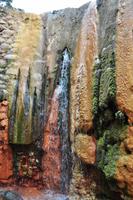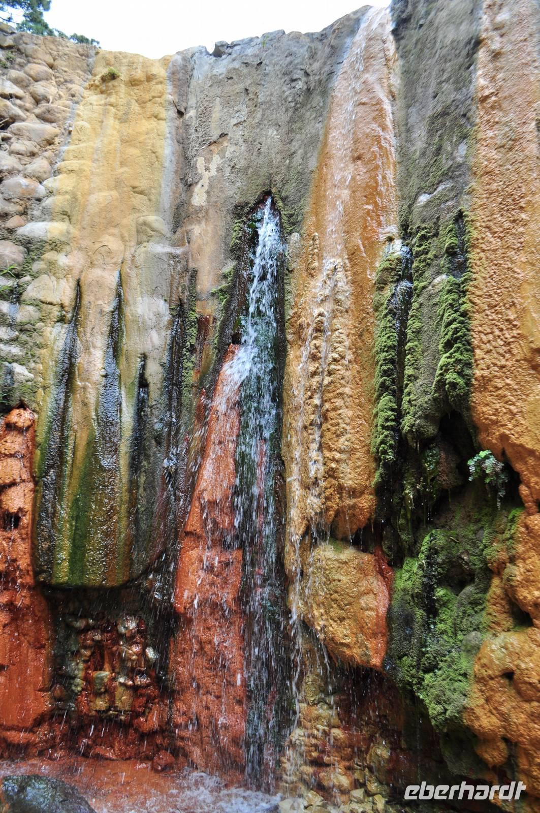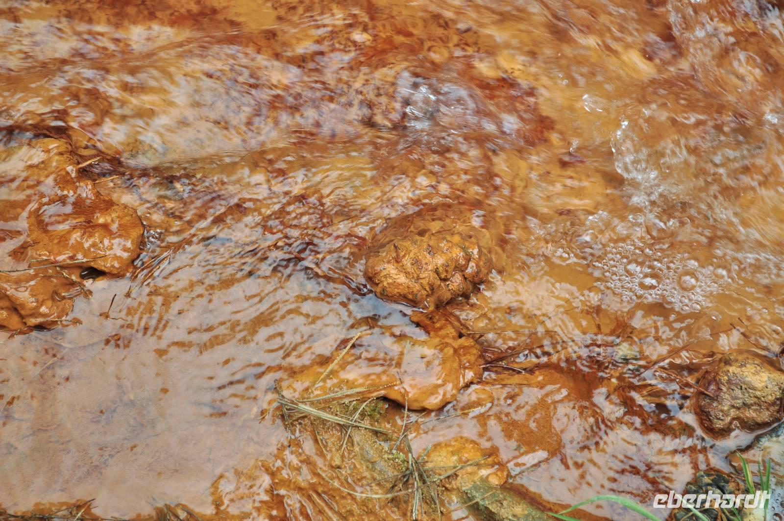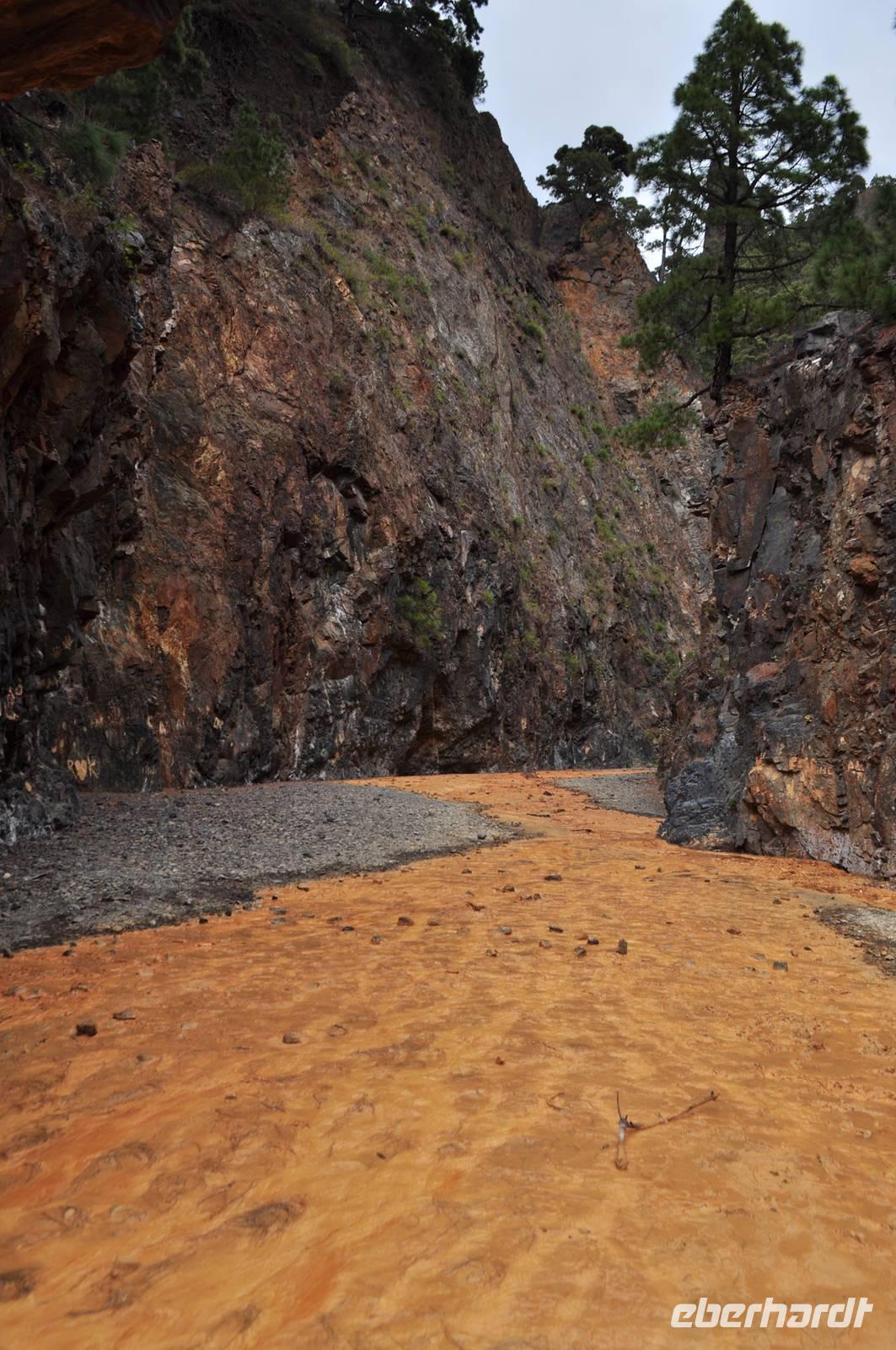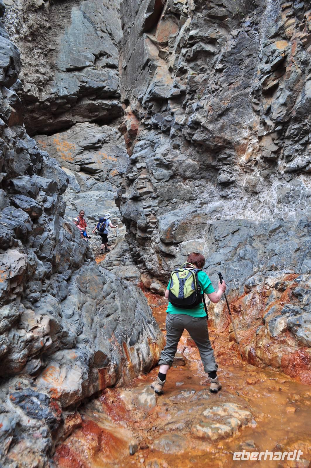 Nun beginnt der anspruchsvollere Teil des Weges. Zunächst gibt es noch einen Anstieg, dann geht es steil bergab, allerdings auf befestigten Wegen. Am Flussbett angekommen, machen wir einen Abstecher in eine enge Klamm. Das gesamte Flussbett ist von einer leuchtend rostroten Masse überzogen. Es ist tatsächlich Eisenoxid, im Volksmund auch als Rost bezeichnet. Der Fluss ist so stark angereichert, dass er sich überall als schlammiger Überzug ablagern kann. Am Ende der Klamm befindet sich ein kleiner Wasserfall, in Kombination mit farbigen Algen und Bakterien ergibt sich ein wunderschönes Farbenspiel mit der Bezeichnung „Cascada de Colores".