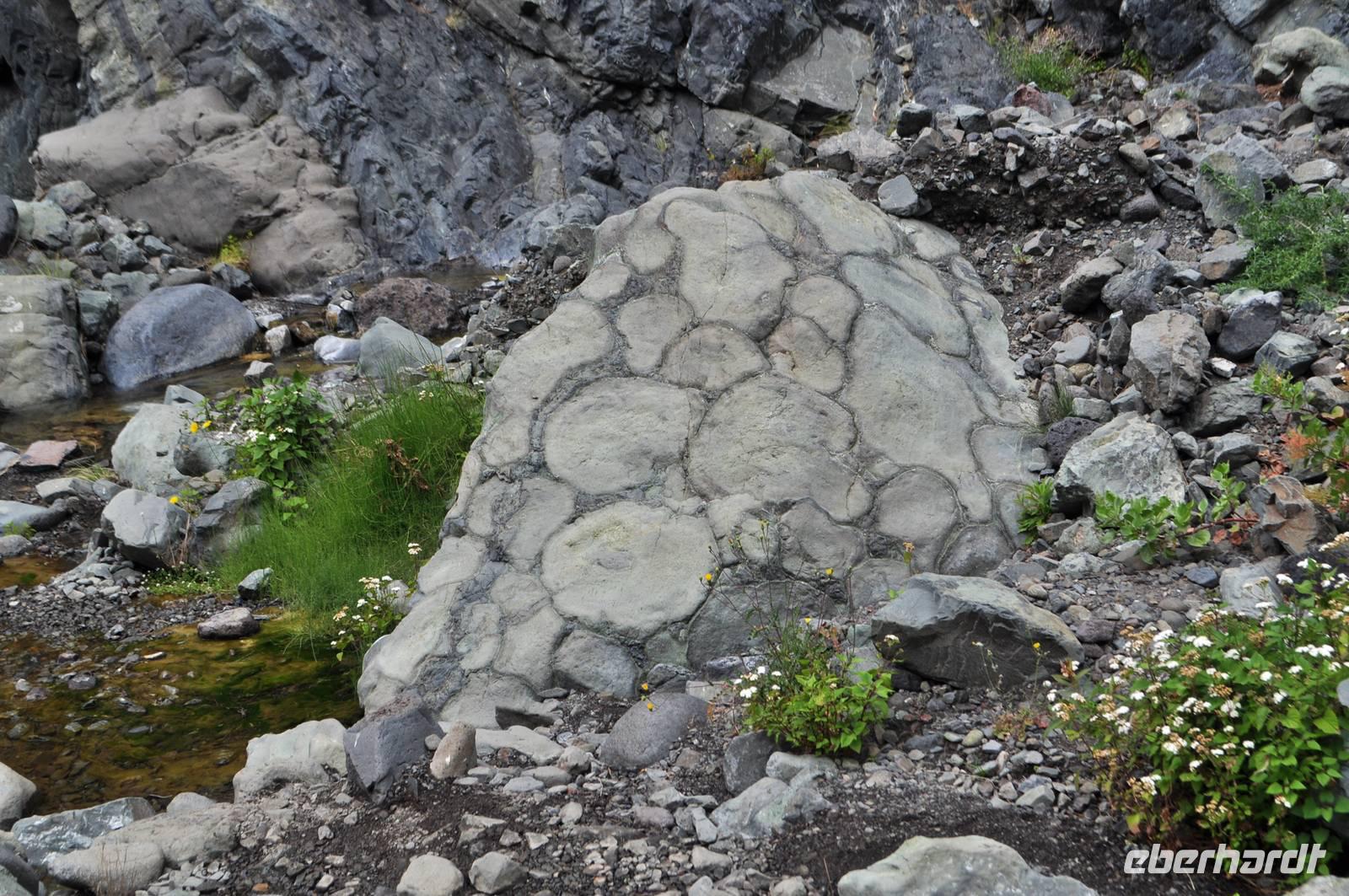 Zunächst führte der Weg im Wesentlichen bergab durch eine tiefe aber breite canyonartige Landschaft, geprägt von unterschiedlichsten Basaltformationen und einem mäandrierenden Fluss.