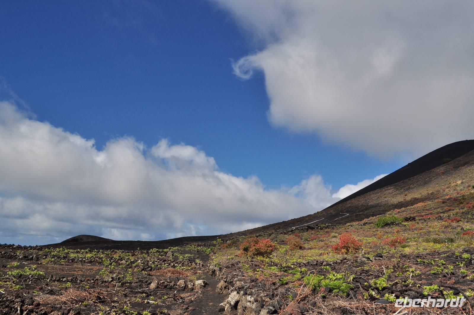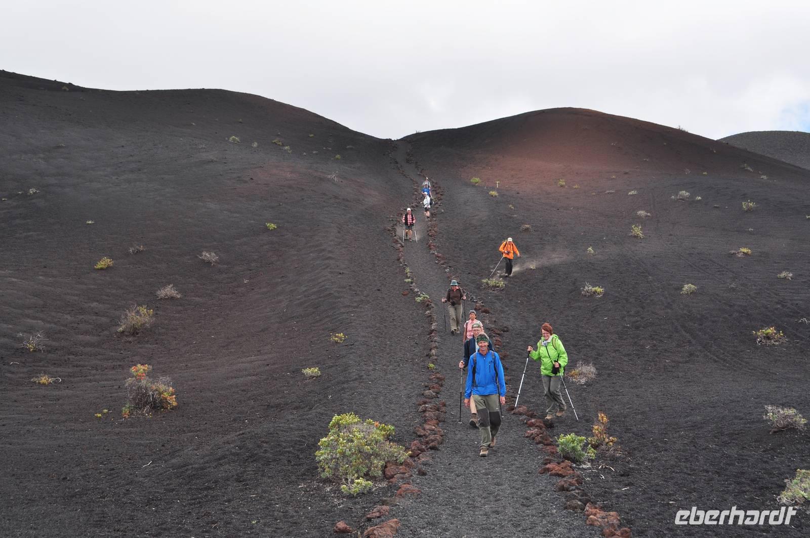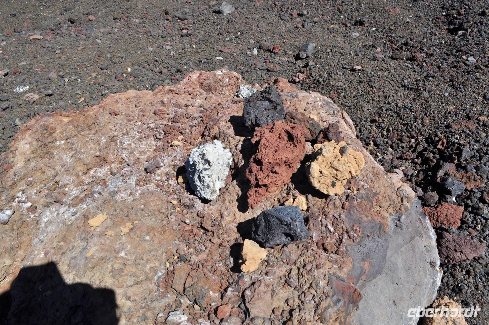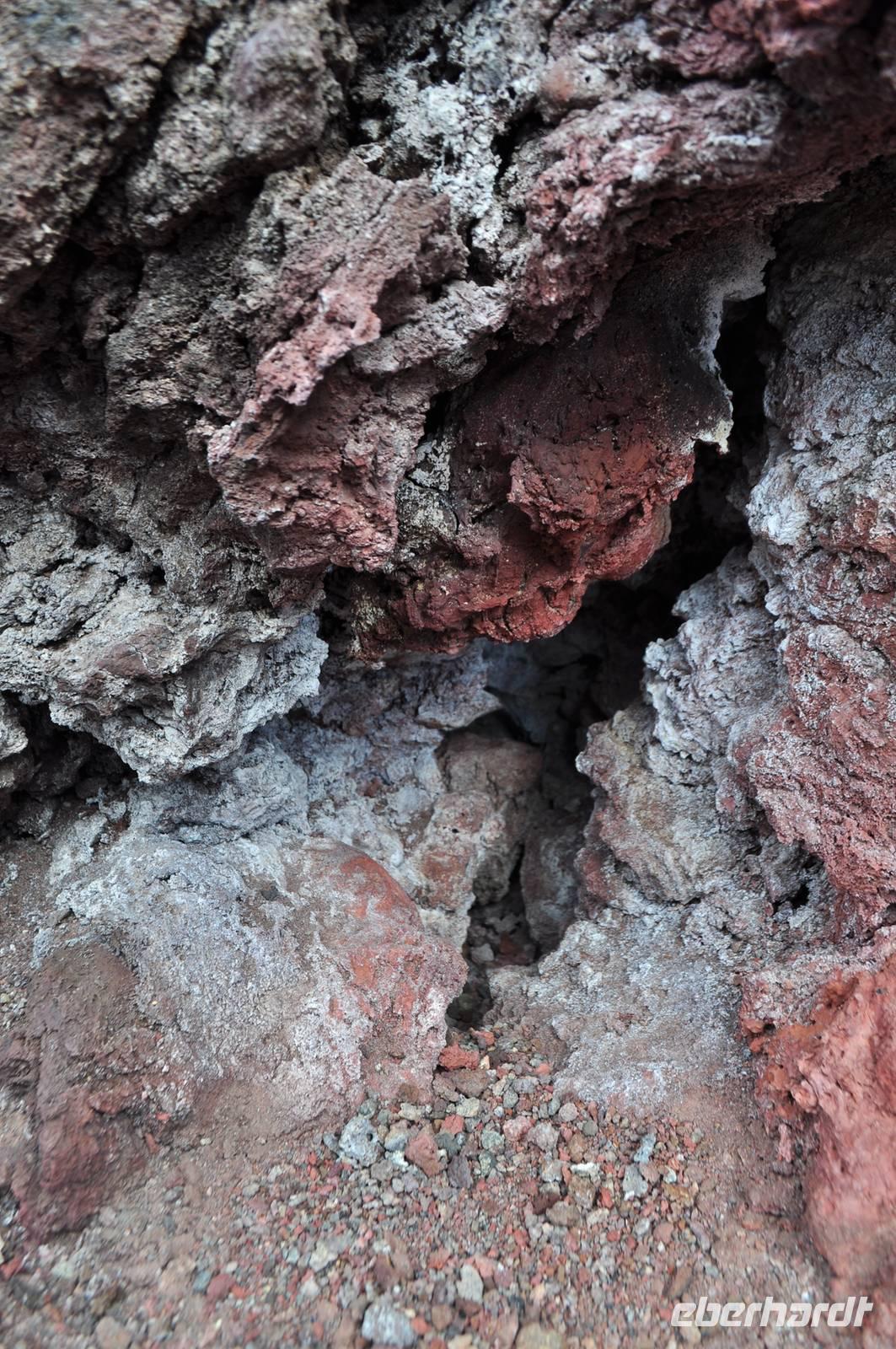 Irgendwann erreichten mich die ersten Schwefelgerüche, Banausen sprechen von „stinkenden faulen Eiern", zugegebenermaßen ist der Vergleich nicht ganz von der Hand zu weisen. Für einen erfahrenen Vulkangänger bedeutet es aber, man nähert sich dem Zentrum. Zuletzt schnupperte ich diesen Geruch auf Vulcano auf unserer Wanderreise „Ätna und die Äolischen Inseln", in abgeschwächter Form auch am Teneguia im Süden der Insel La Palma. Hier nun wieder sehr deutlich.