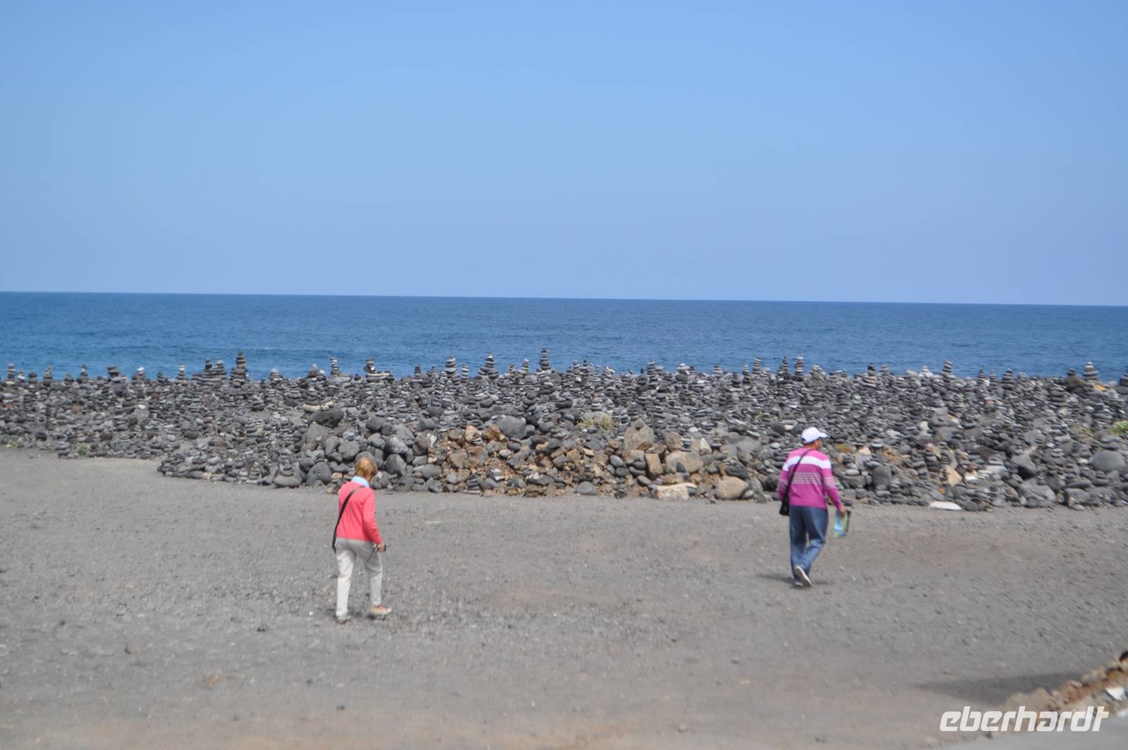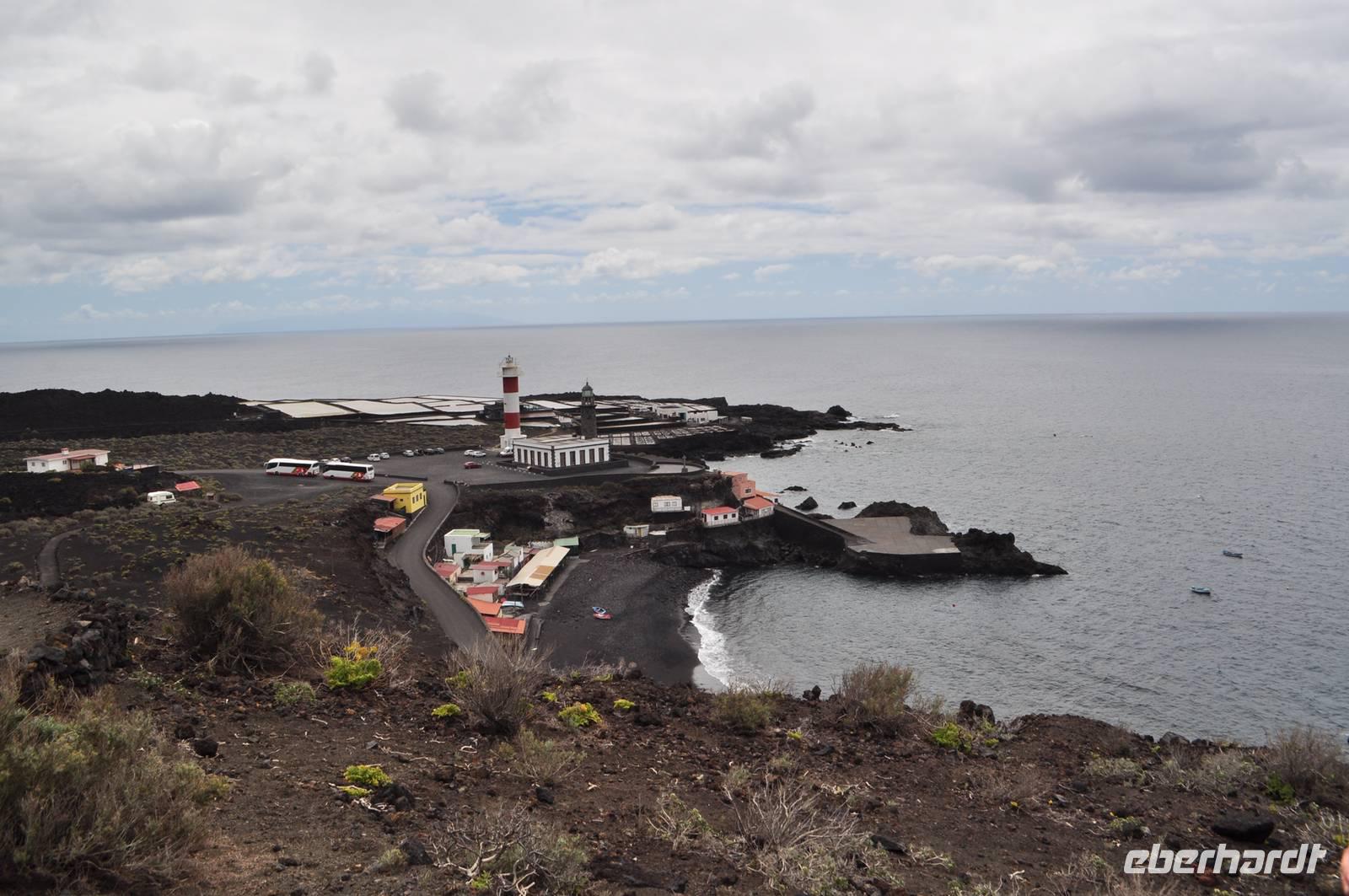 Zu Beginn der Wanderung laufen wir auf dem Kraterrand des San Antonio. Wir genießen den Blick in Richtung El Hierro. Danach steigen wir ab zum Teneguia. Der Weg führt erst durch Aschefelder, dann durch Aa-Lava-Felder. Wir sehen und spüren, dass der Vulkan noch aktiv ist. Aus Spalten dringt heißer Dampf an die Oberfläche. Vorbei an verschiedenen Lava-Feldern steigen wir bis zu den Salinas de Fuencaliente ab. Hier an der südlichsten Spitze der Insel La Palma befinden sich Leuchttürme und Salinen, in denen noch heute in Handarbeit Meersalz gewonnen wird. Dieses hervorragend schmeckende Meersalz kann in Cent-Beträgen erworben werden. Müde Wanderer versorgen sich an der Bar mit Tapas und Drinks.
